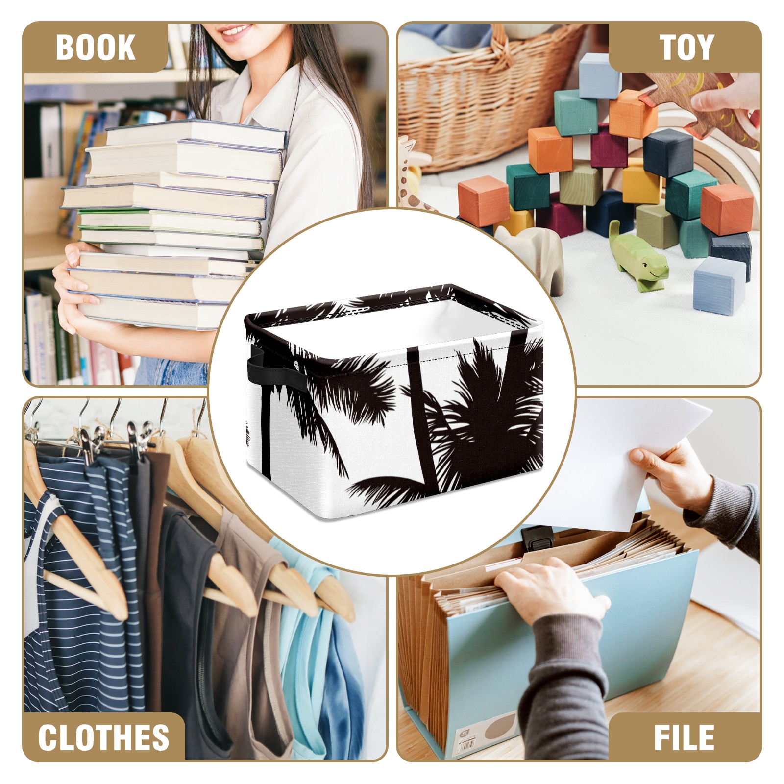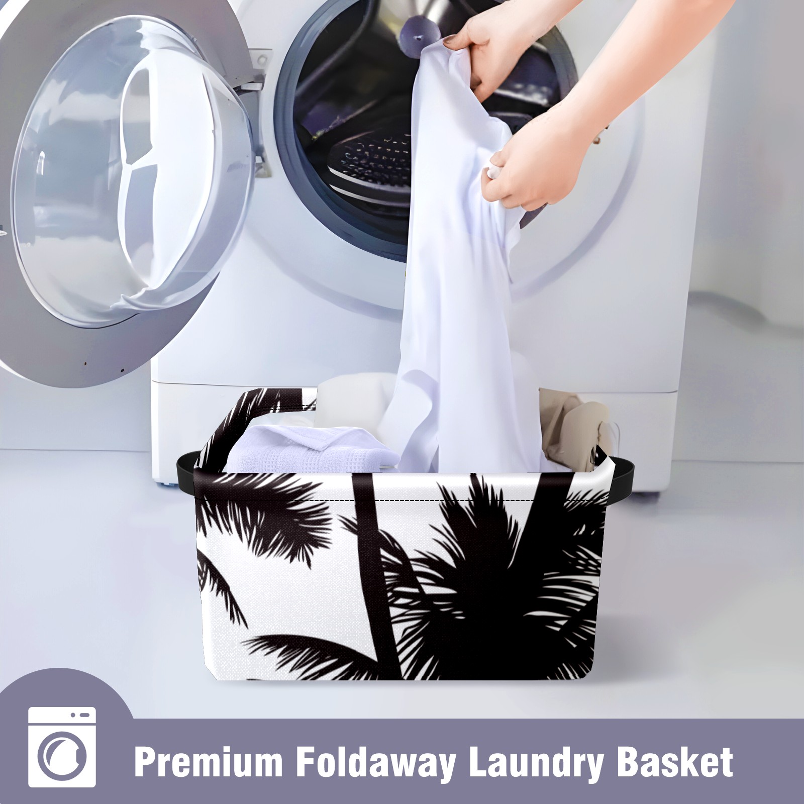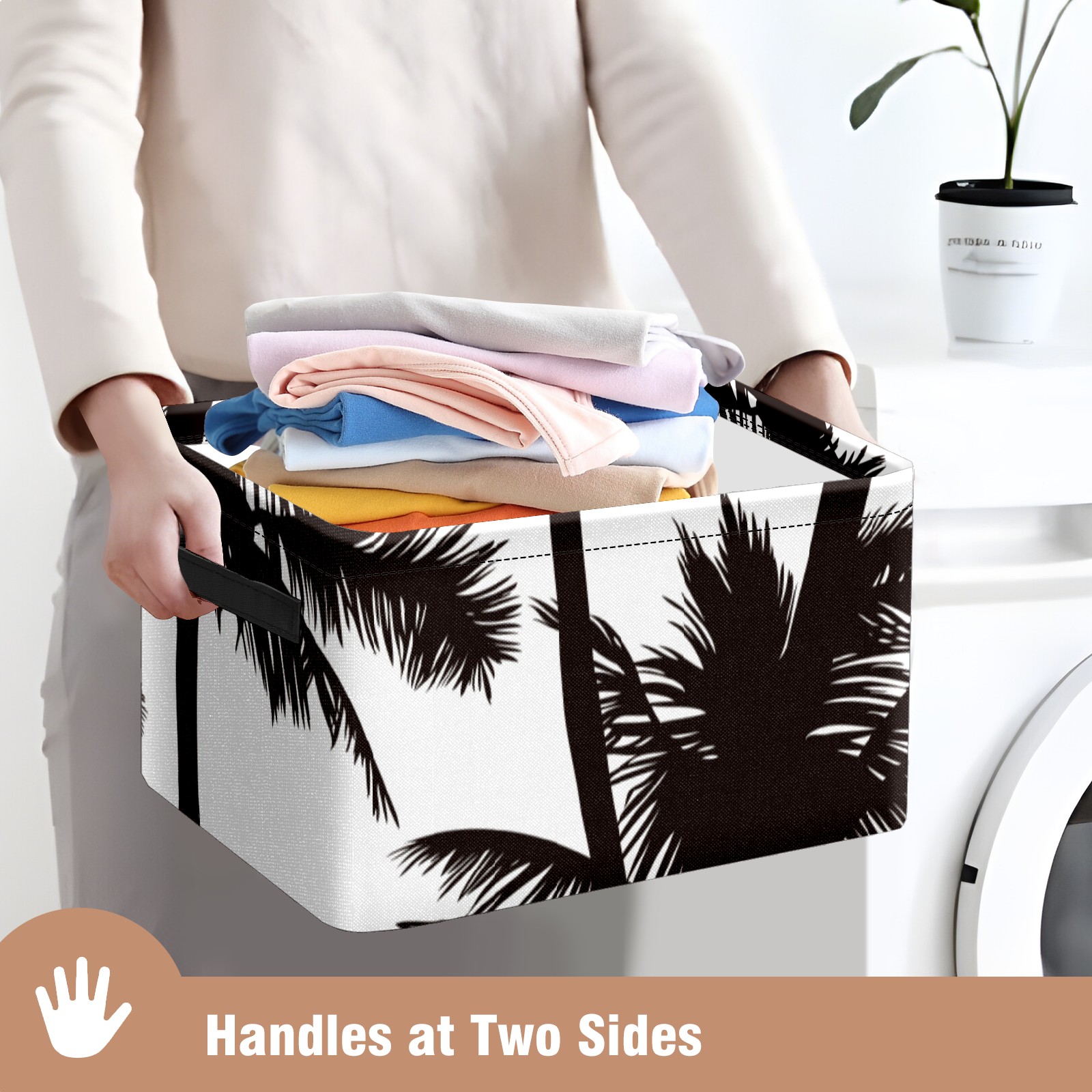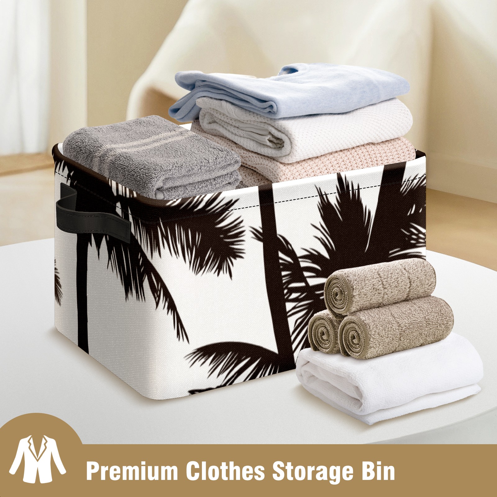 Collapsible 600D Oxford Storage Basket with Tropical Black White Palm Tree - Metal Frame 10"x14"x8" Reinforced Handles, Multi-Purpose Organizer