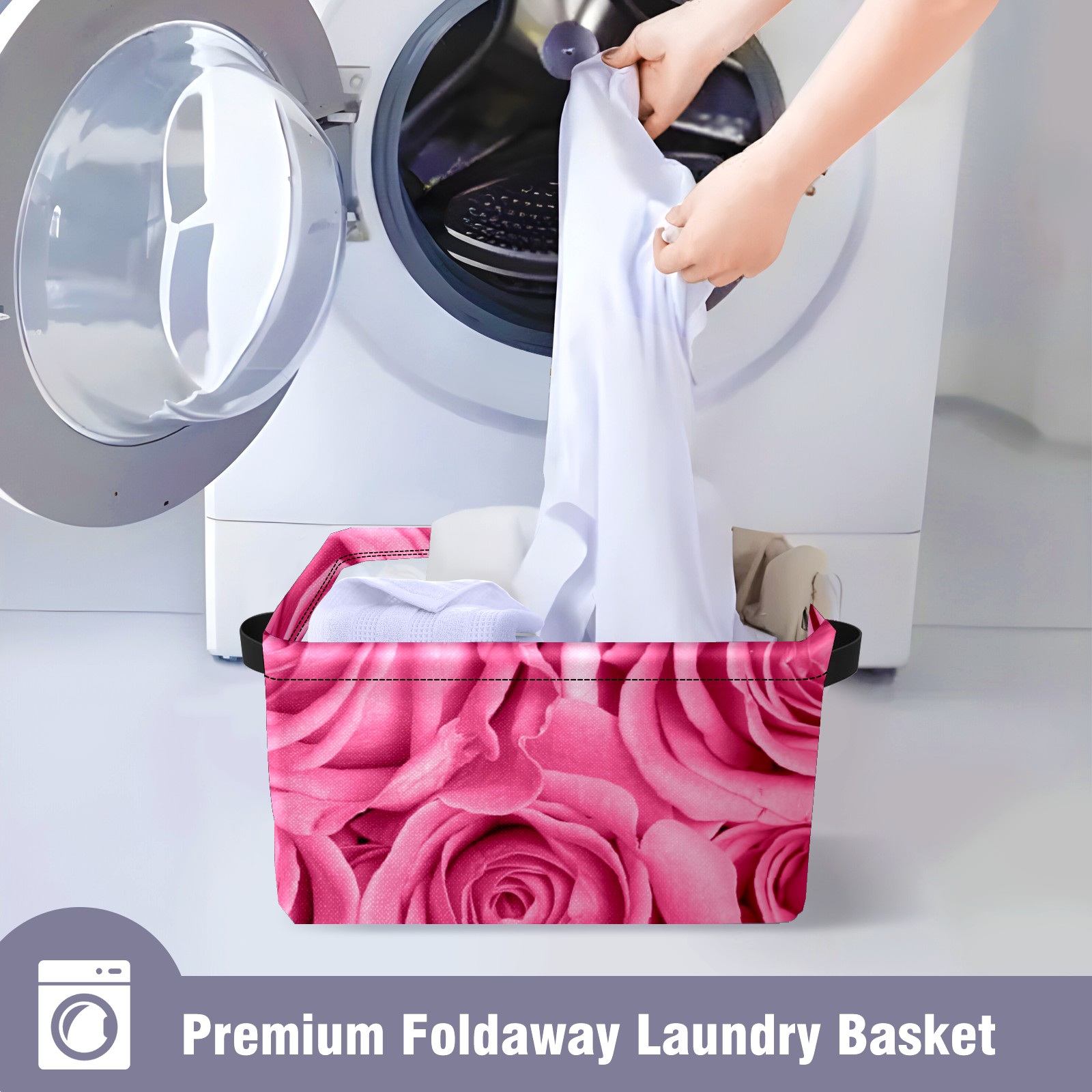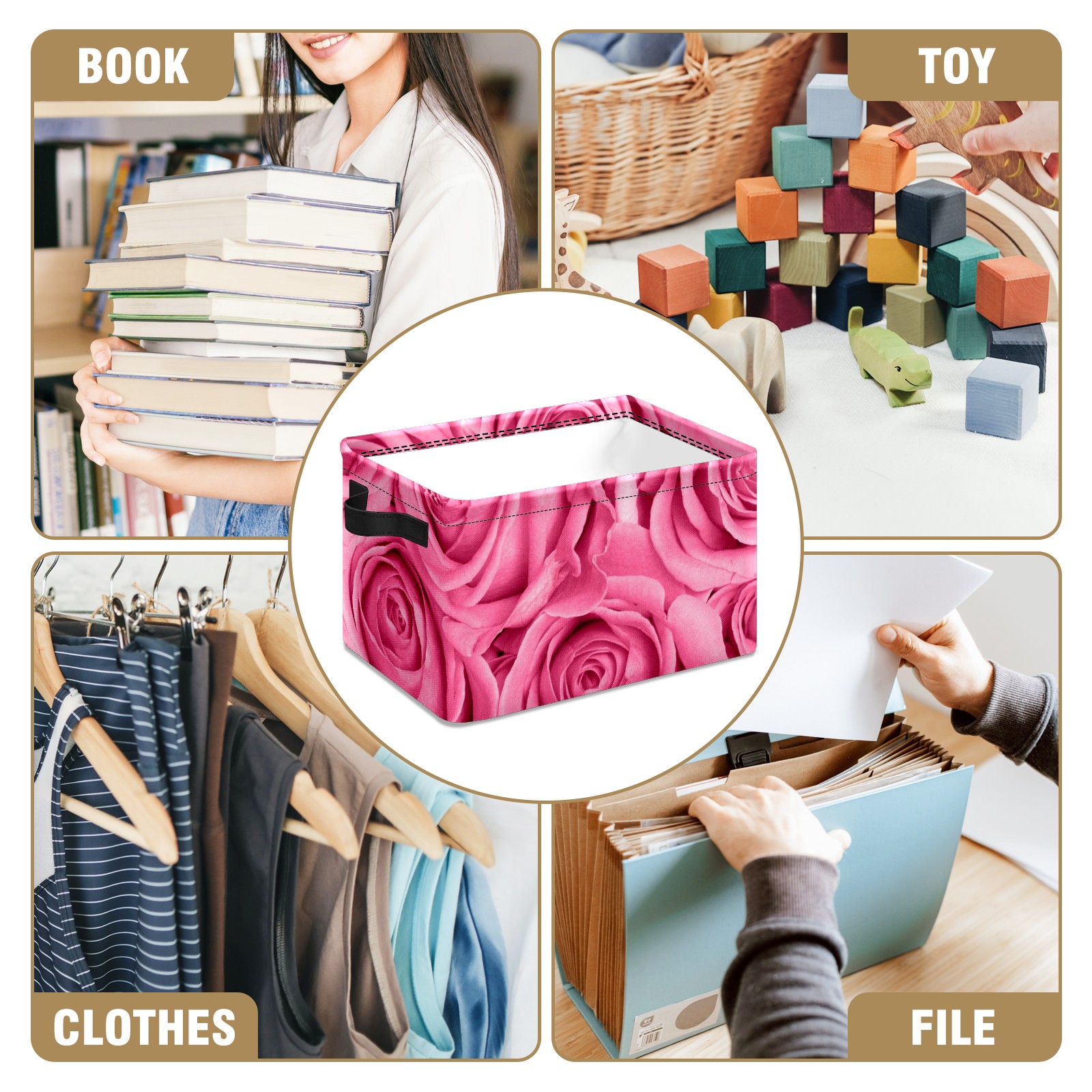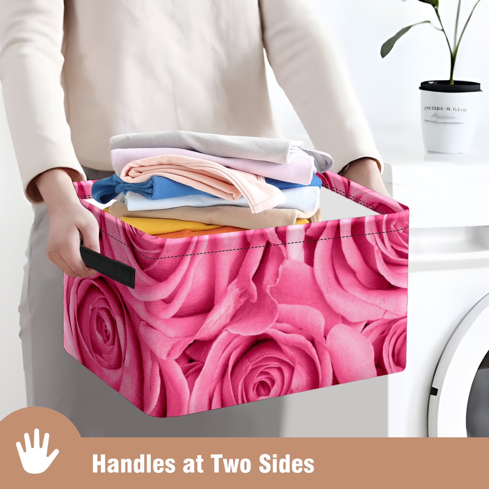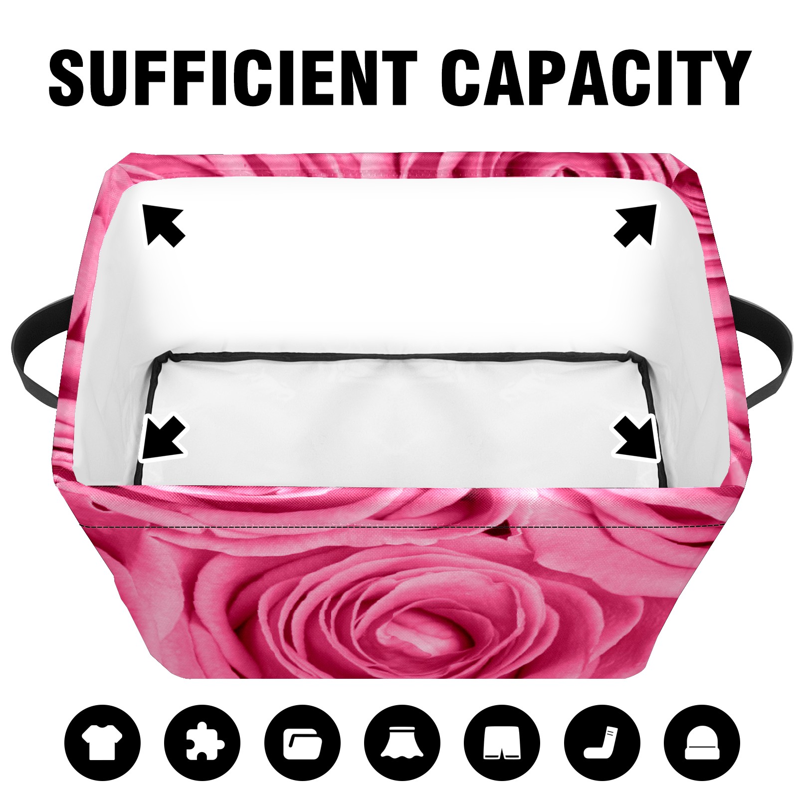 Collapsible 600D Oxford Storage Basket with Pink Rose Love - Metal Frame 10"x14"x8" Reinforced Handles, Multi-Purpose Organizer