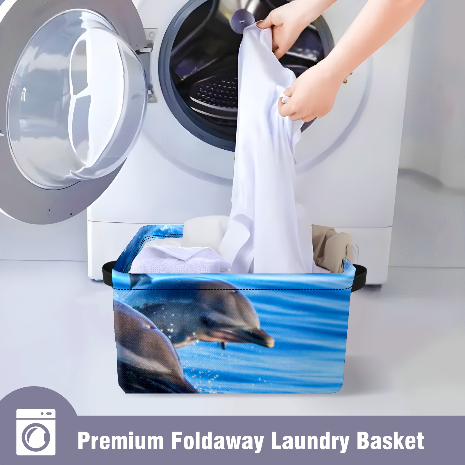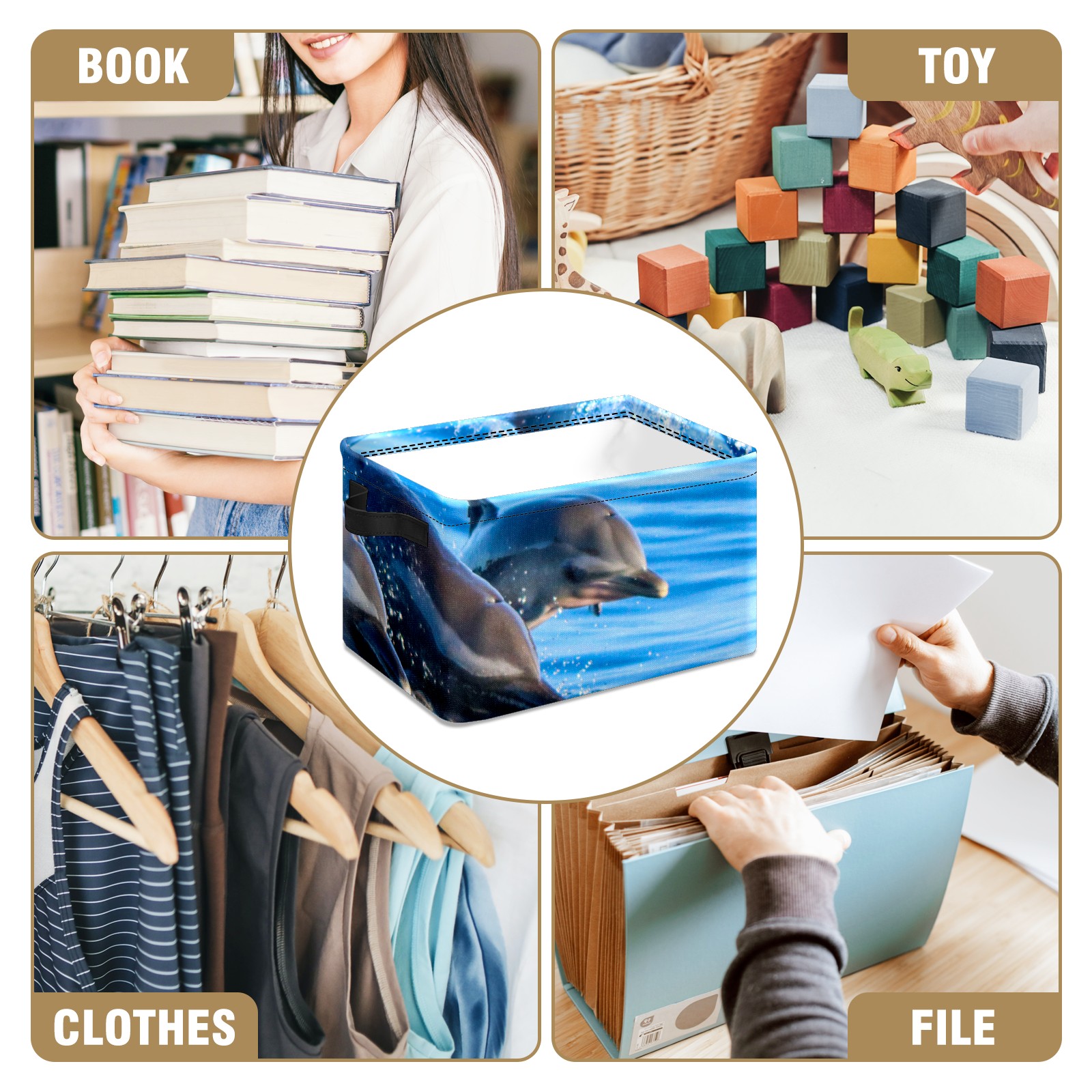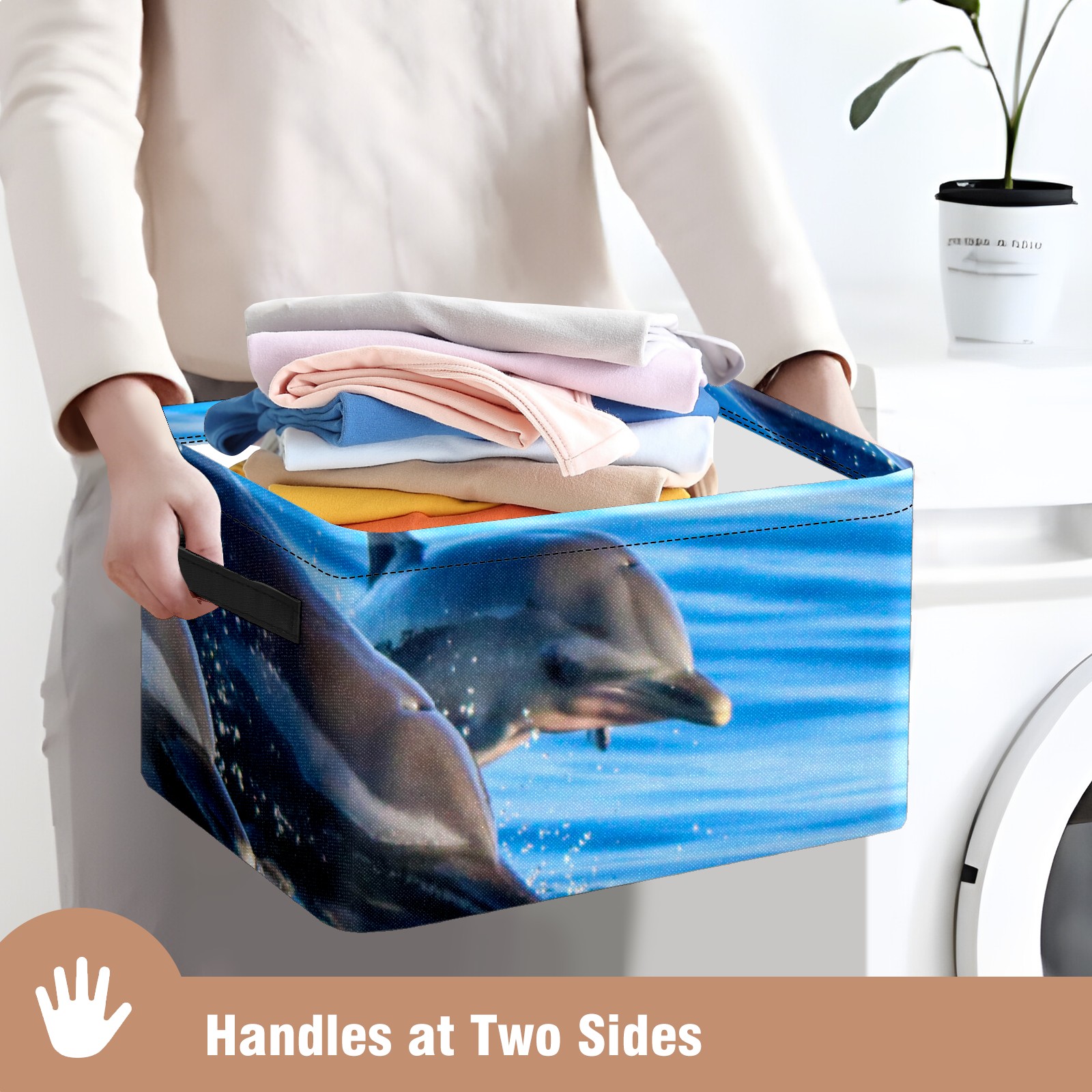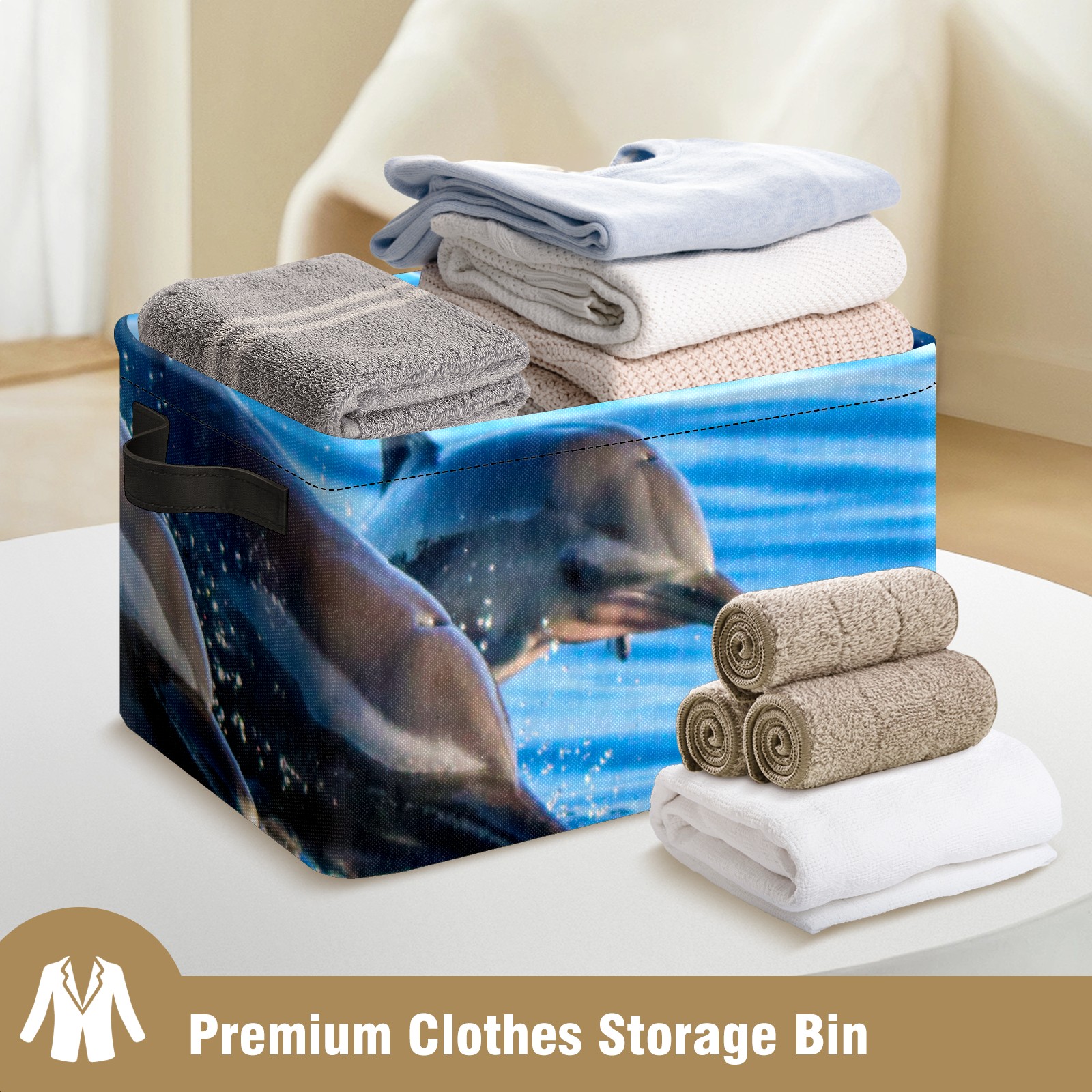 Collapsible 600D Oxford Storage Basket with Lovely Dolphin Swimming - Metal Frame 10"x14"x8" Reinforced Handles, Multi-Purpose Organizer