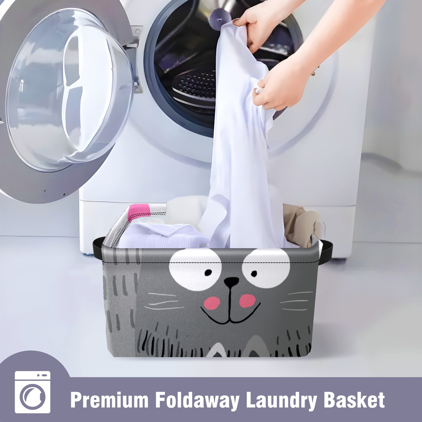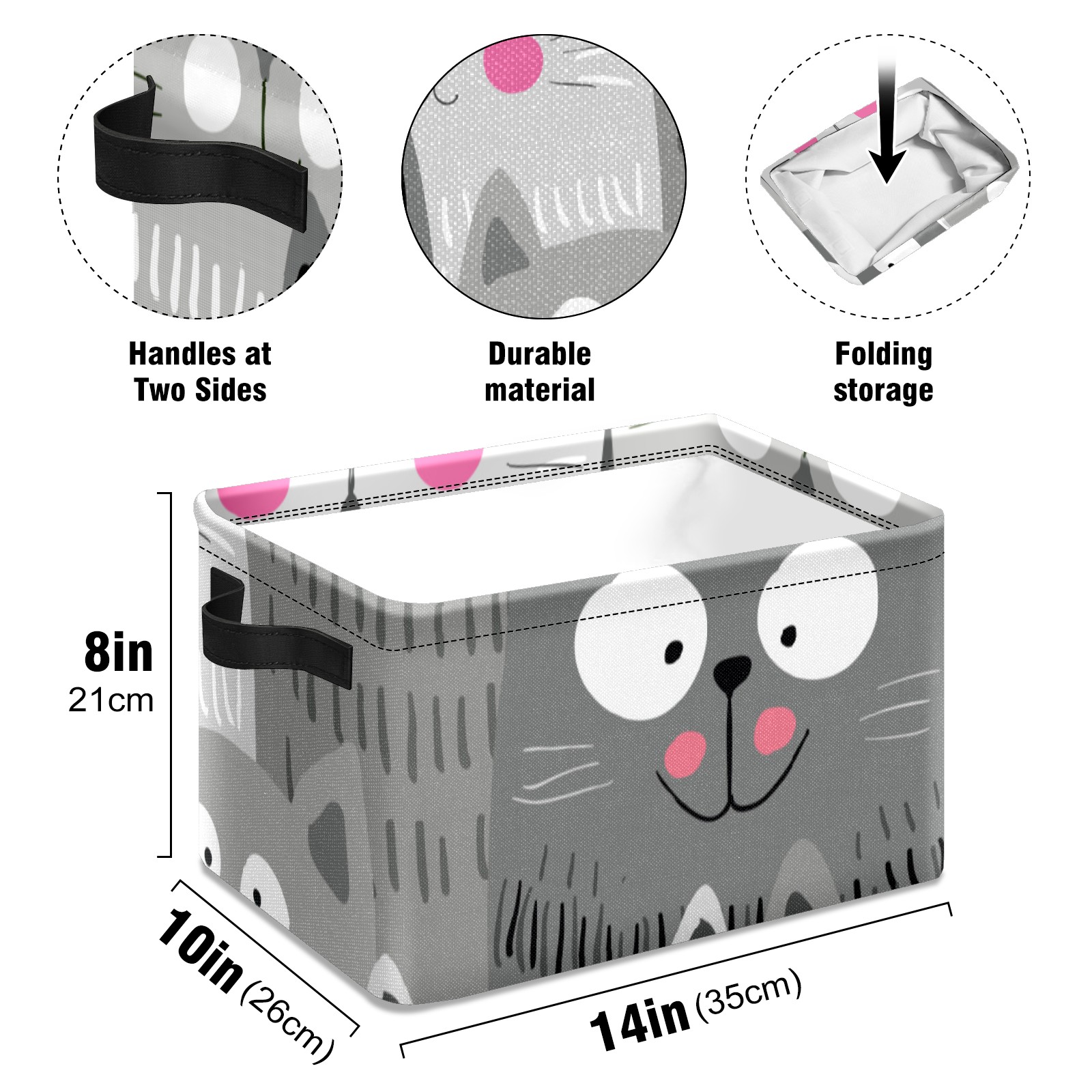 Collapsible 600D Oxford Storage Basket with Cute Funny Cats Kitty Grey - Metal Frame 10"x14"x8" Reinforced Handles, Multi-Purpose Organizer