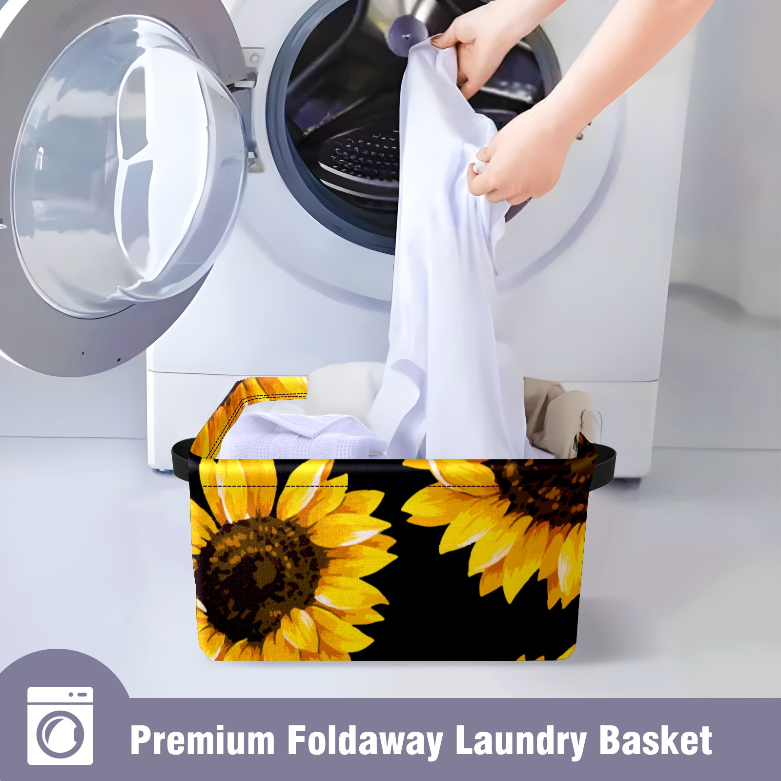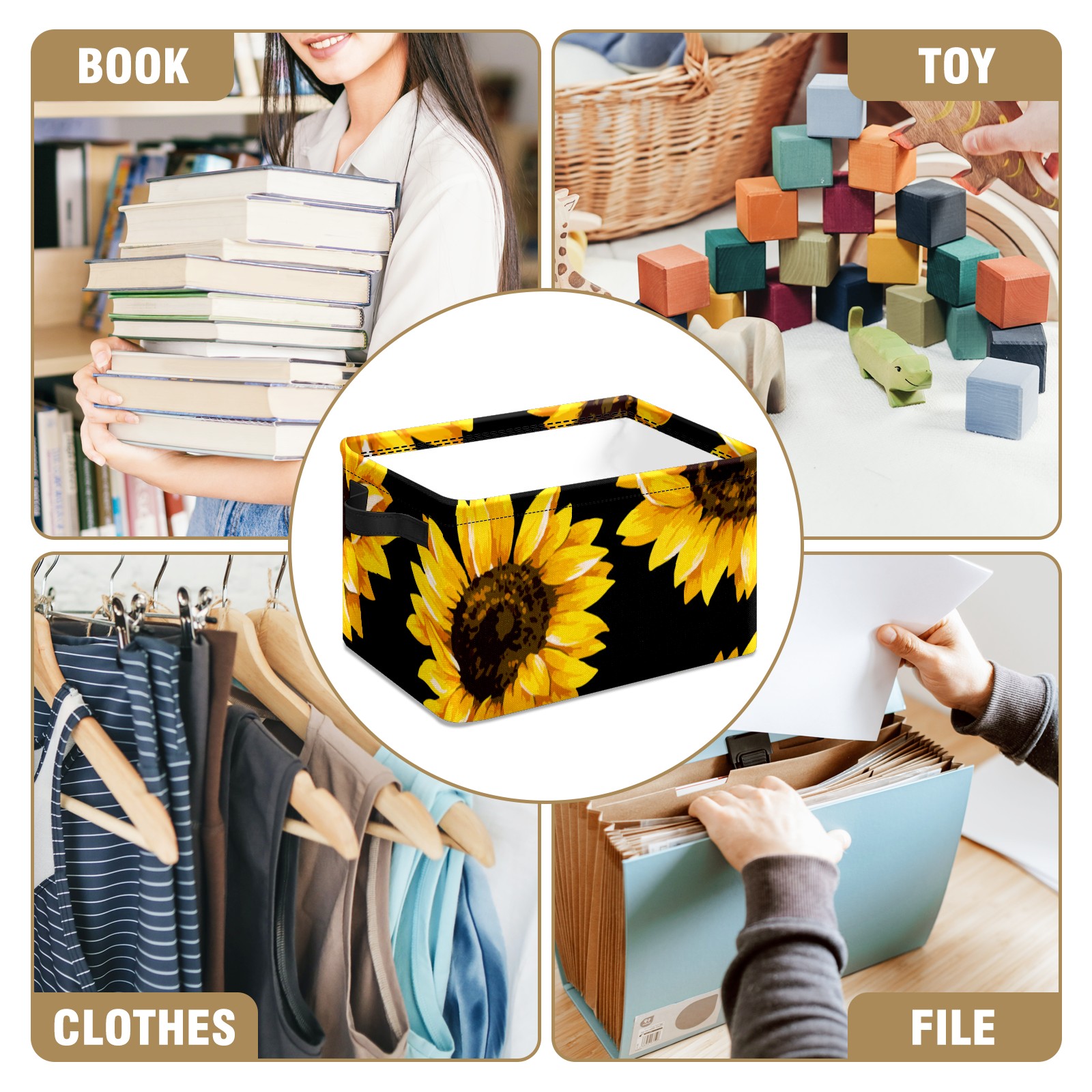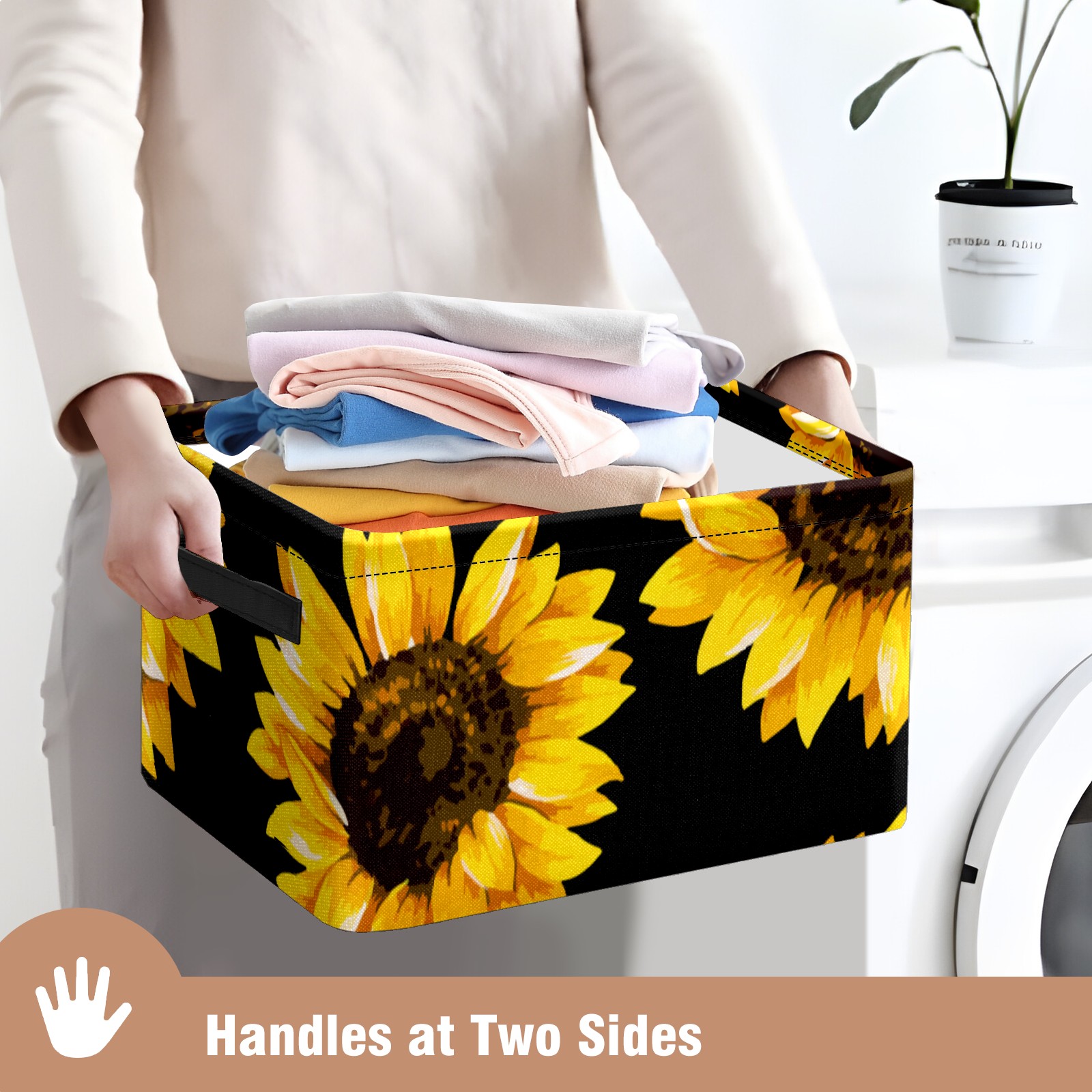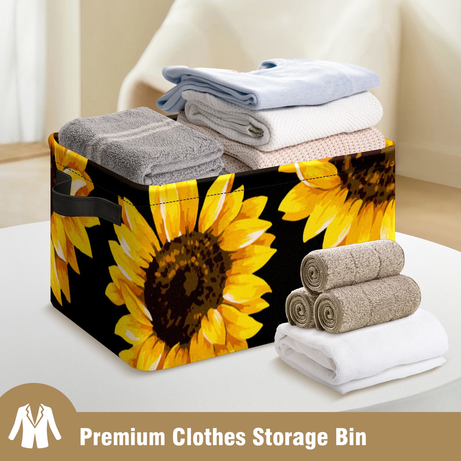 Collapsible 600D Oxford Storage Basket with Yellow Blooming Sunflowers Black - Metal Frame 10"x14"x8" Reinforced Handles, Multi-Purpose Organizer