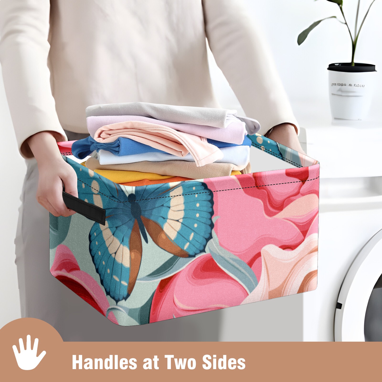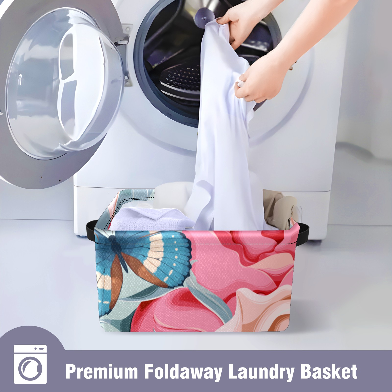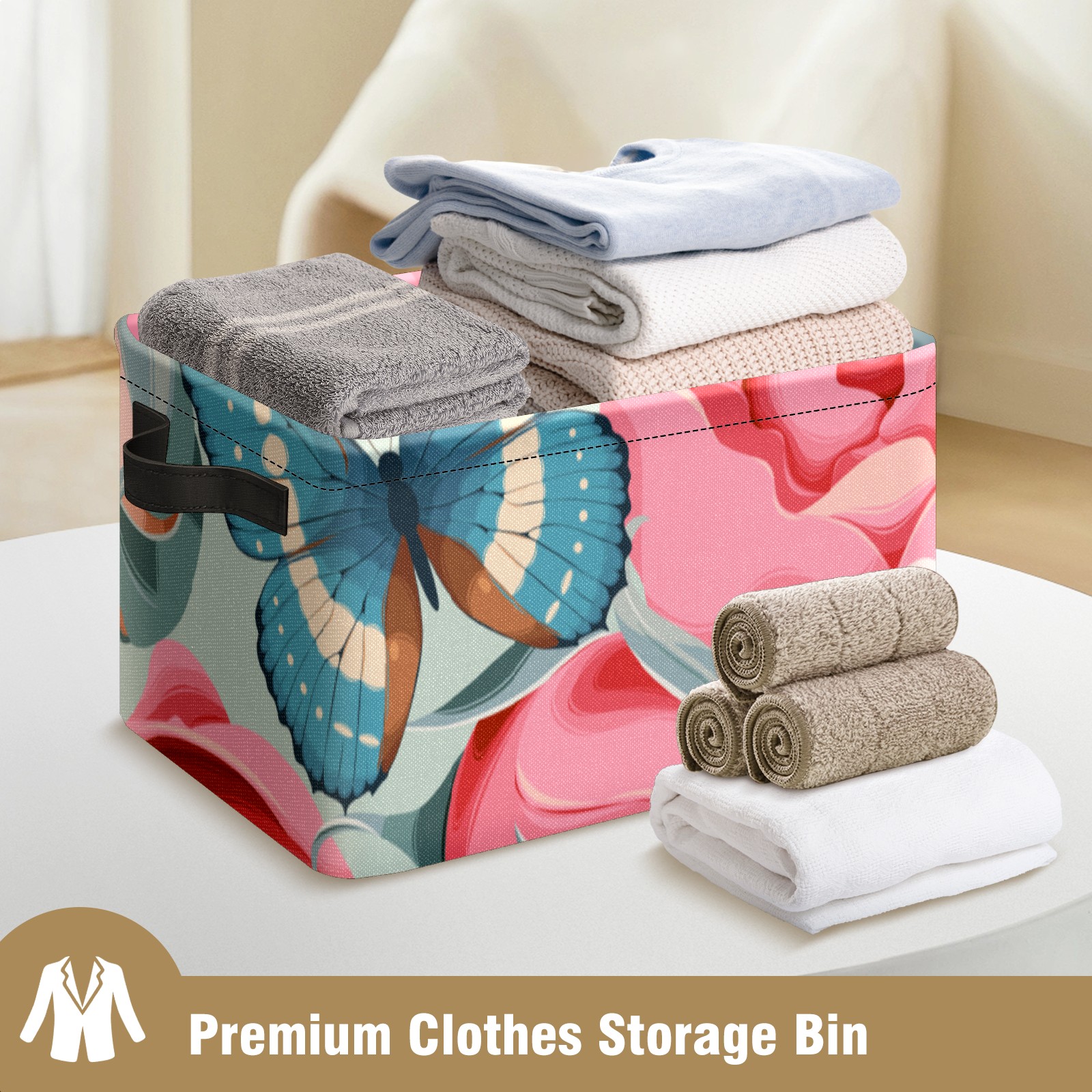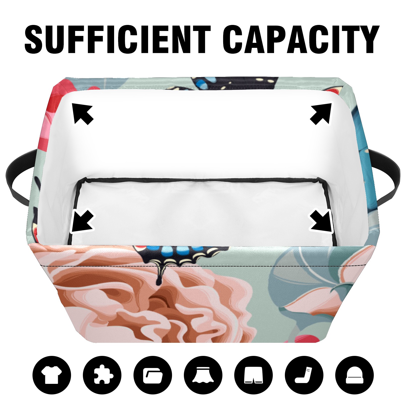 Collapsible 600D Oxford Storage Basket with Rose Butterfly Print - Metal Frame 10"x14"x8" Reinforced Handles, Multi-Purpose Organizer