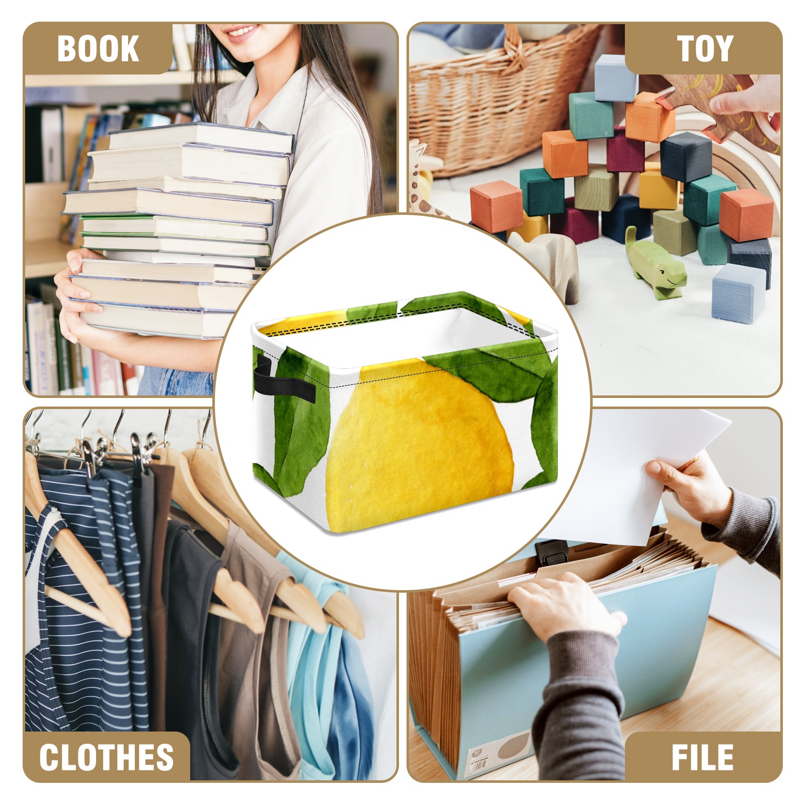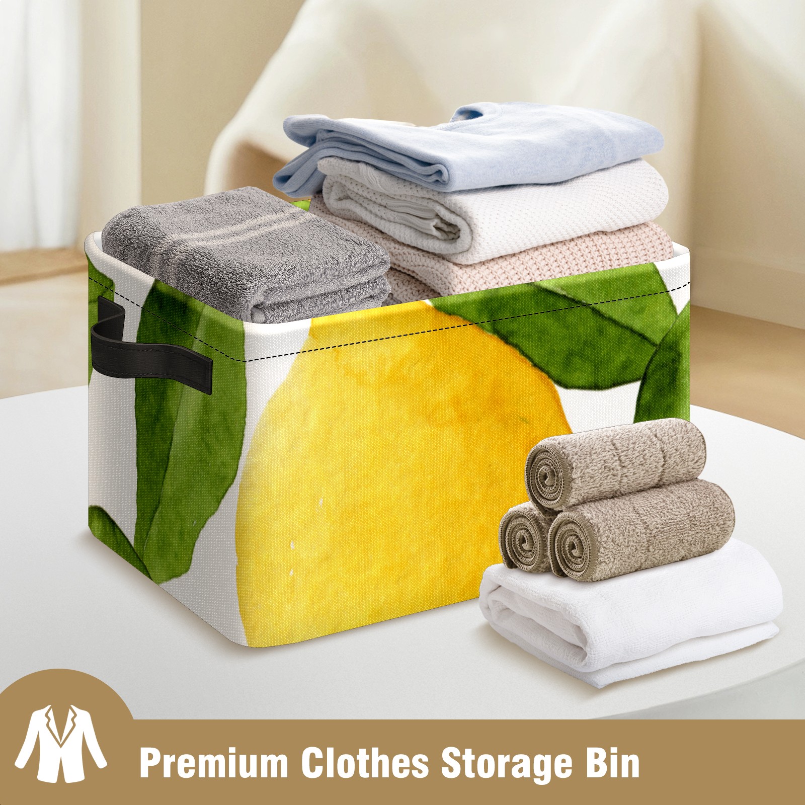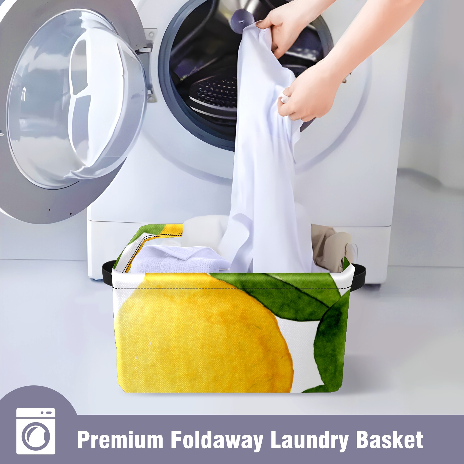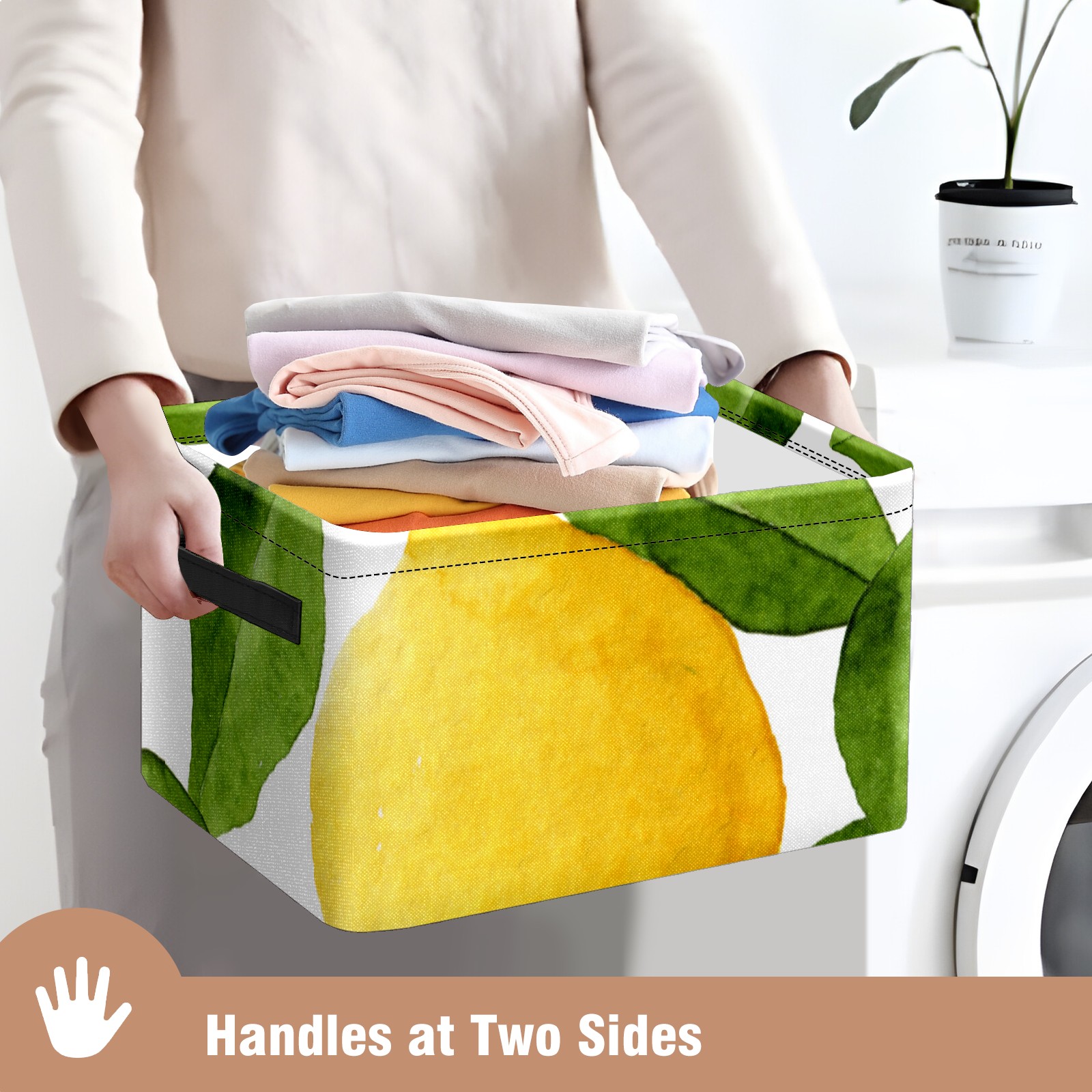 Collapsible 600D Oxford Storage Basket with Watercolor Lemon Fruit - Metal Frame 10"x14"x8" Reinforced Handles, Multi-Purpose Organizer