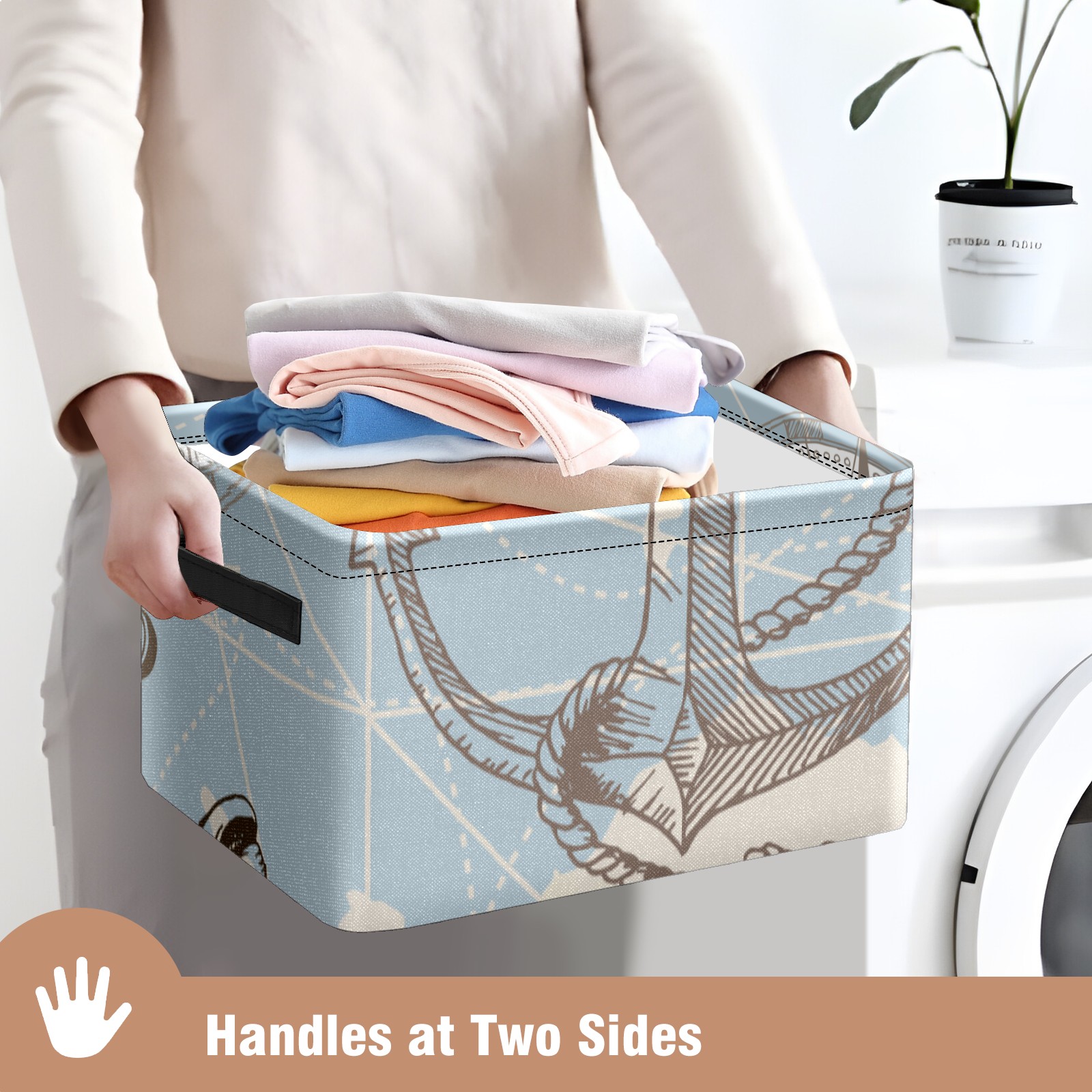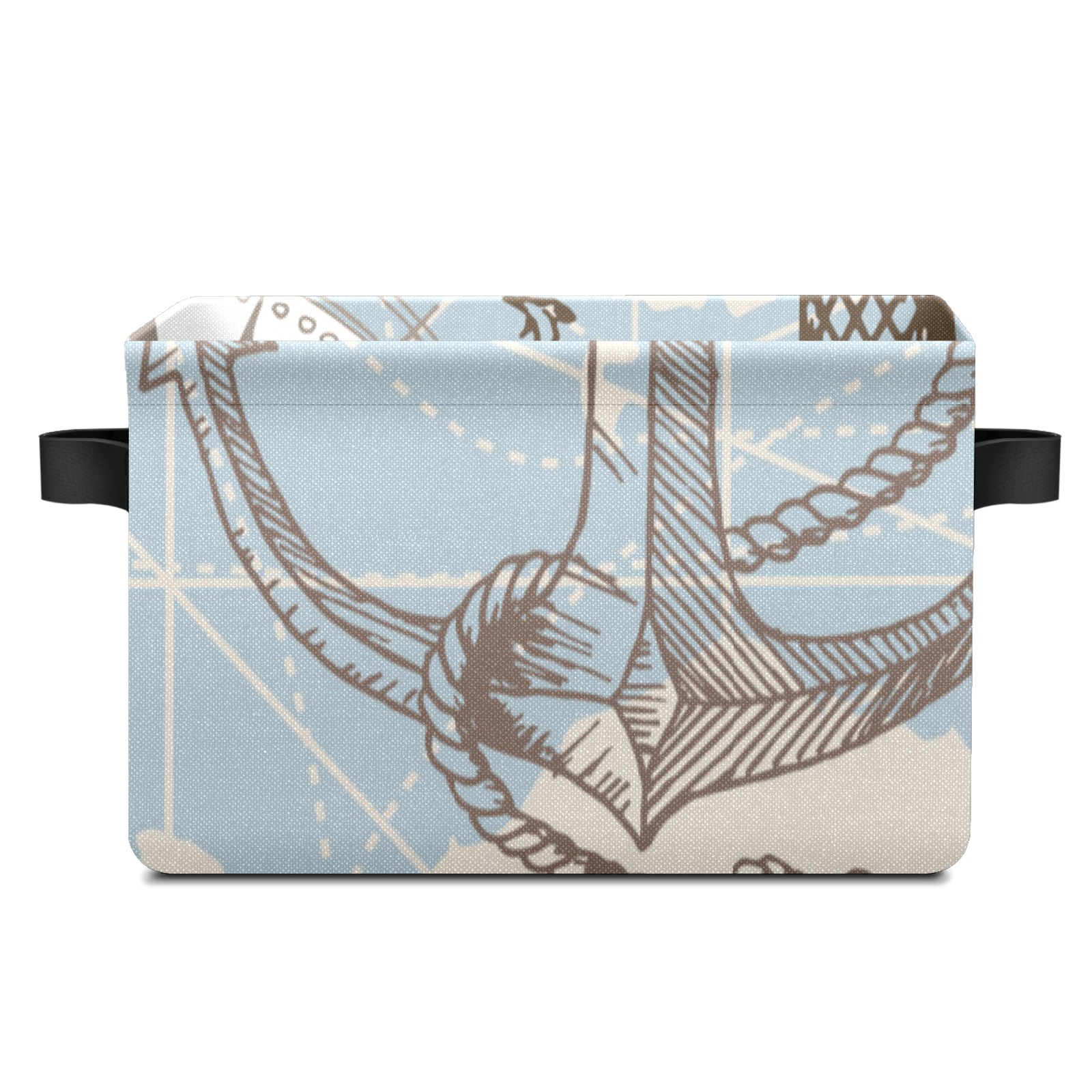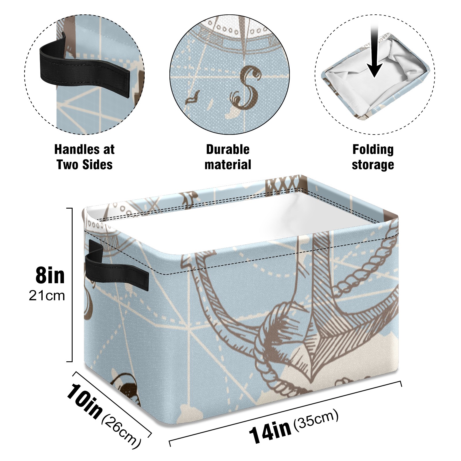 Collapsible 600D Oxford Storage Basket with Vintage Nautical Map Anchor - Metal Frame 10"x14"x8" Reinforced Handles, Multi-Purpose Organizer