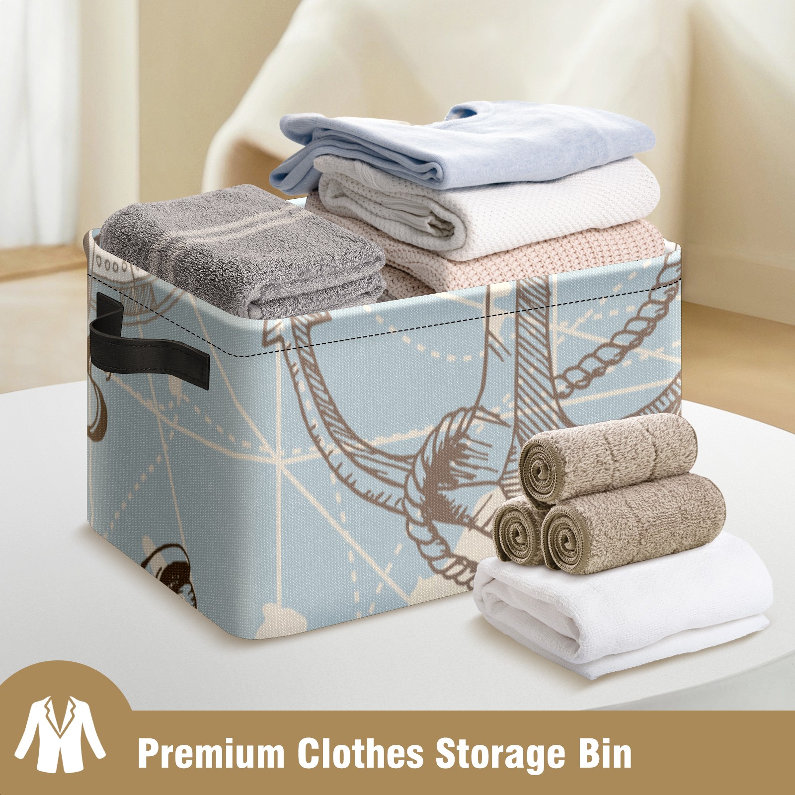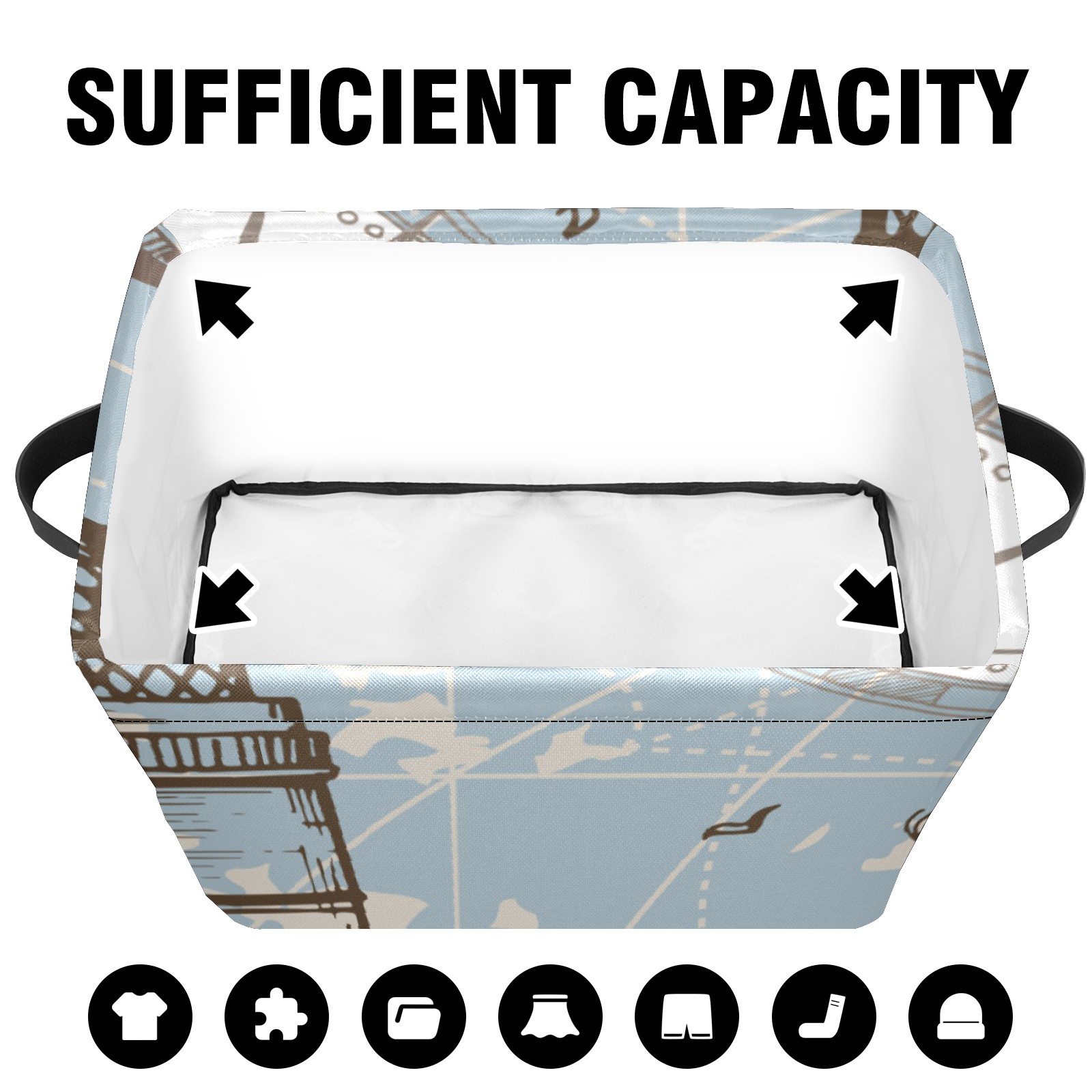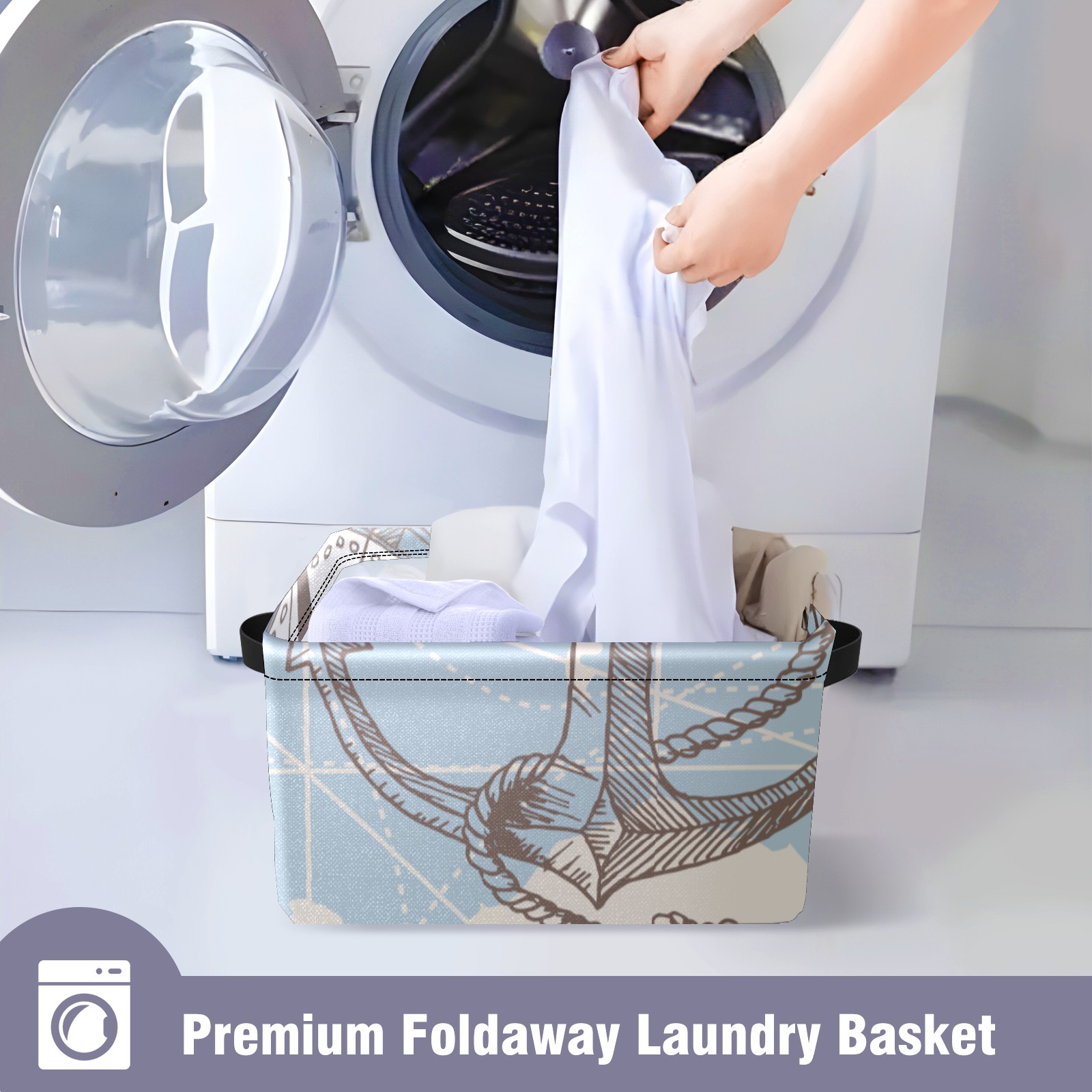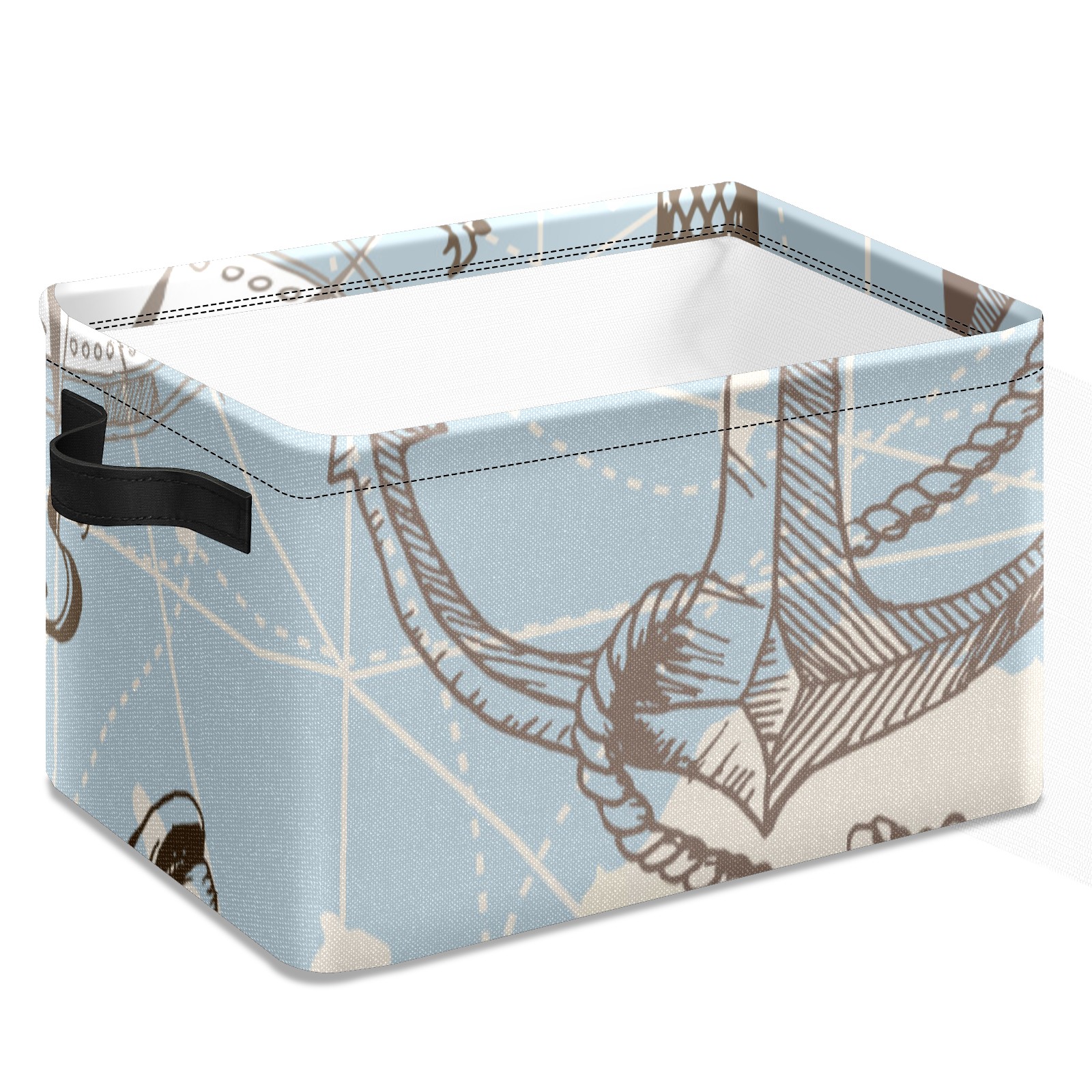 Collapsible 600D Oxford Storage Basket with Vintage Nautical Map Anchor - Metal Frame 10"x14"x8" Reinforced Handles, Multi-Purpose Organizer