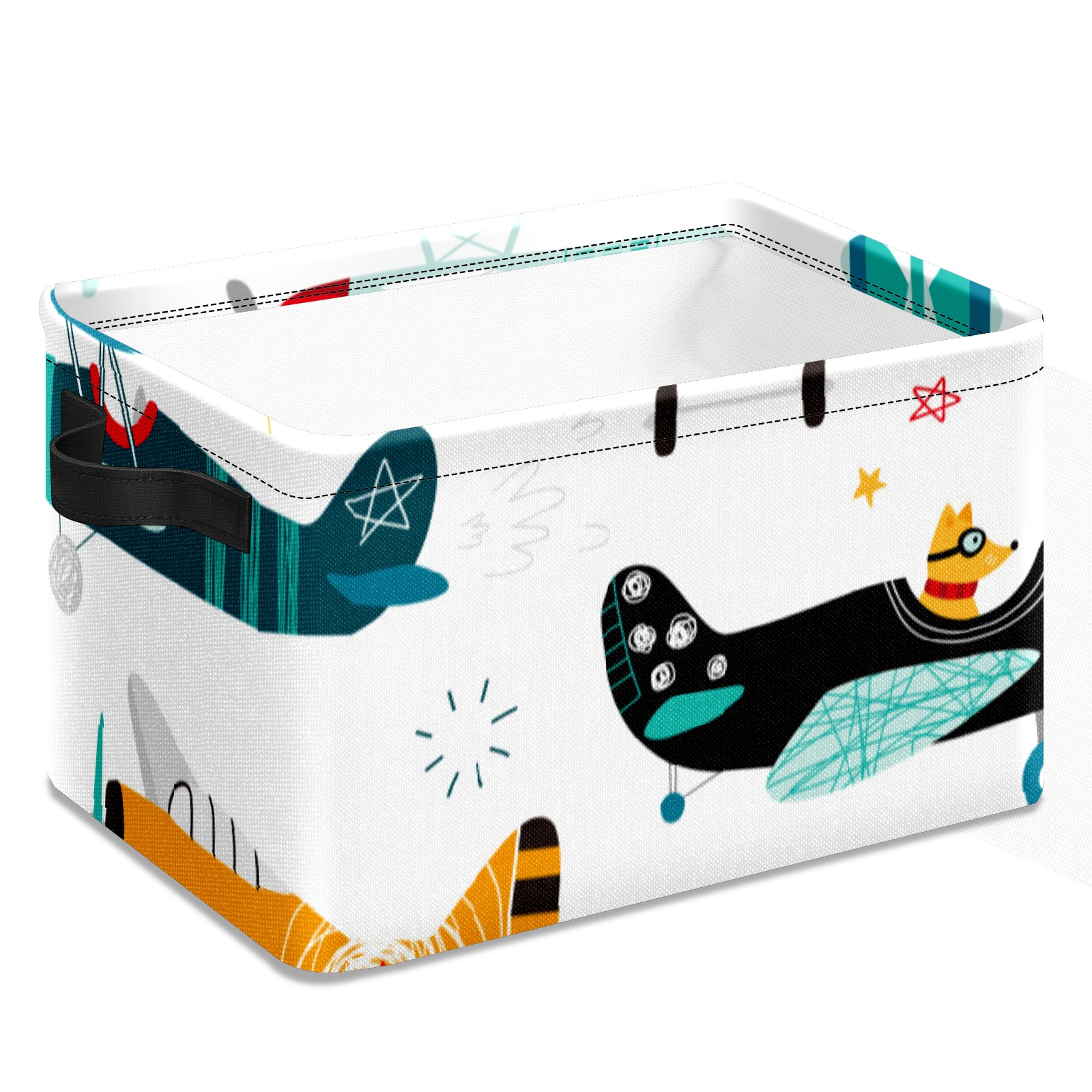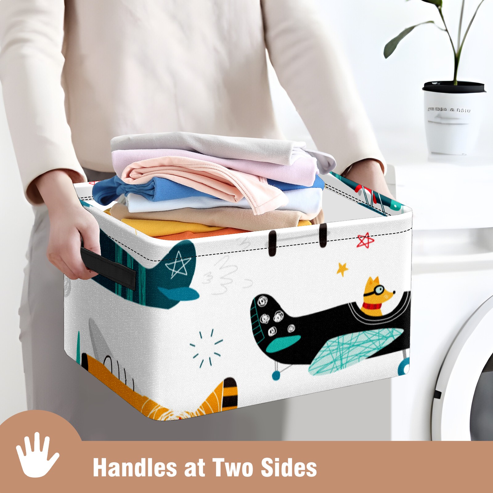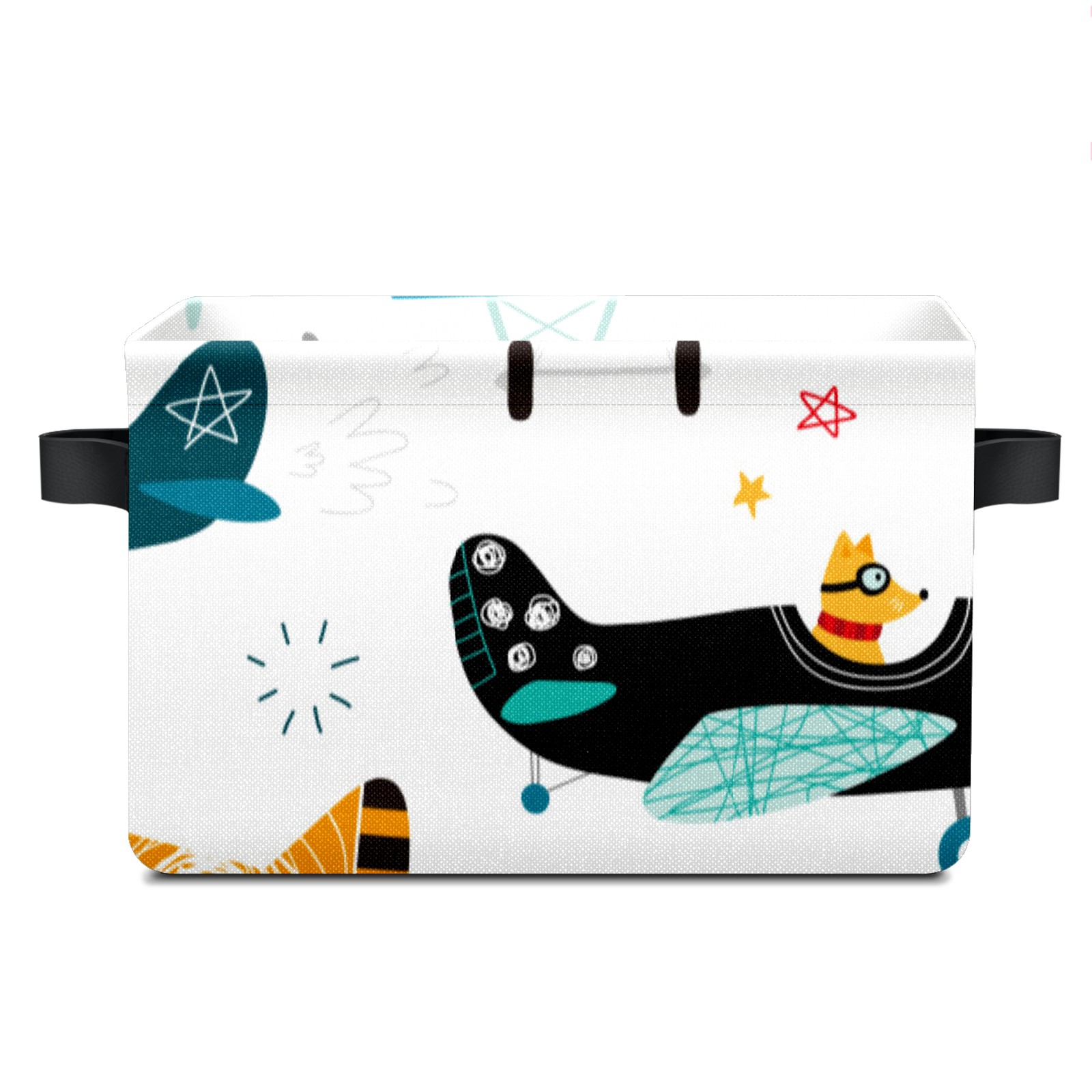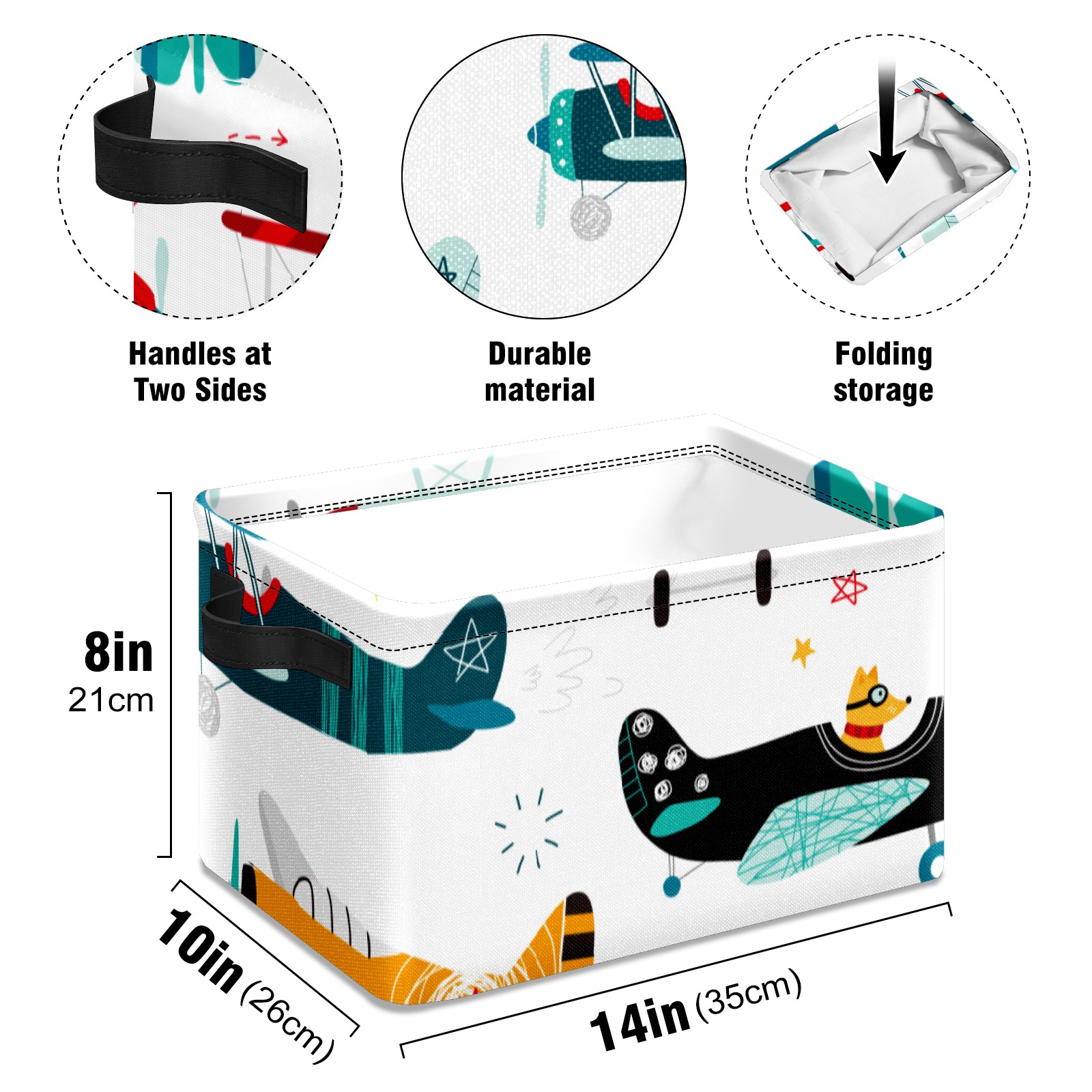 Collapsible 600D Oxford Storage Basket with Cartoon Airplane Helicopter - Metal Frame 10"x14"x8" Reinforced Handles, Multi-Purpose Organizer