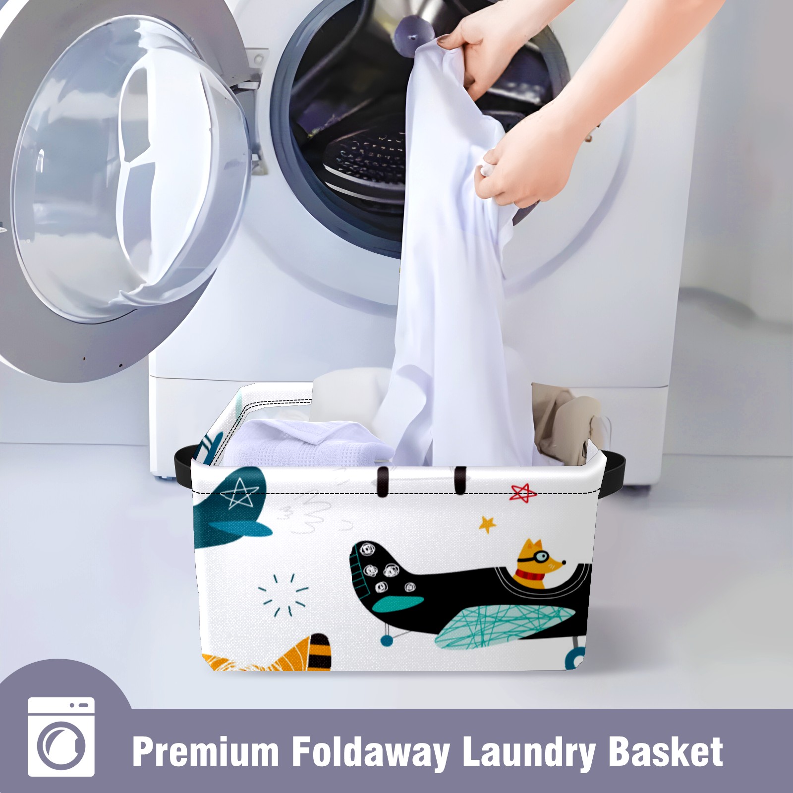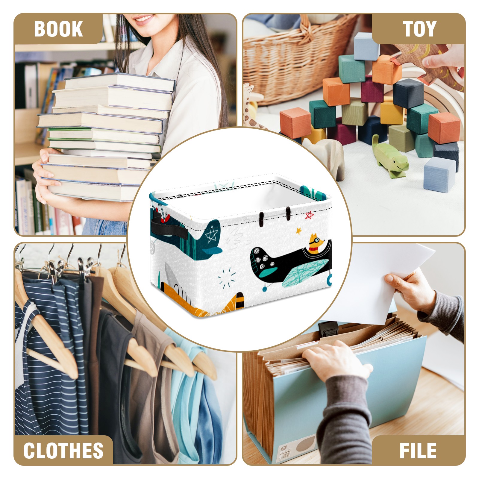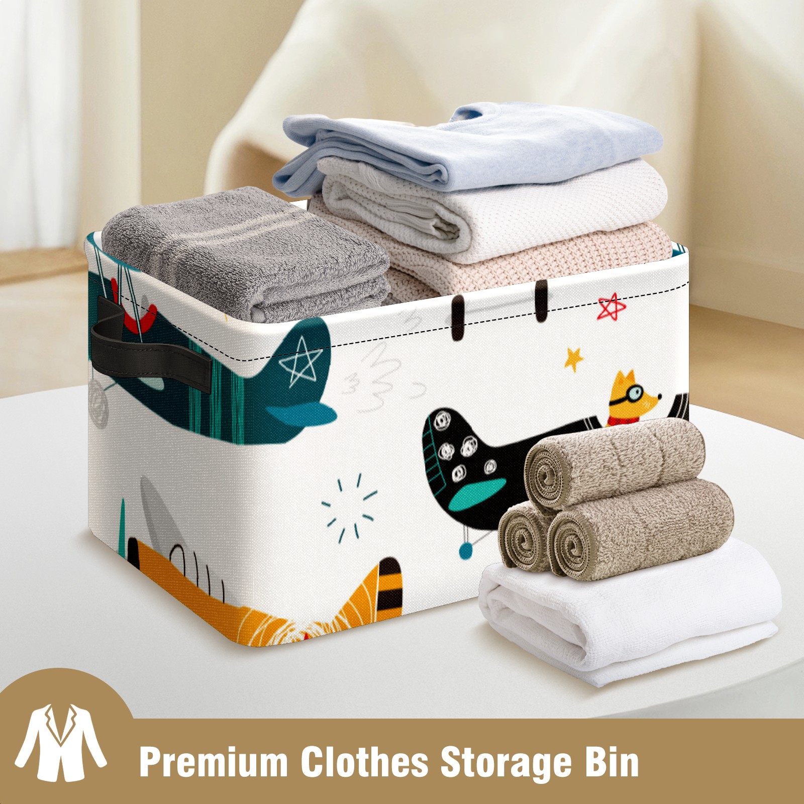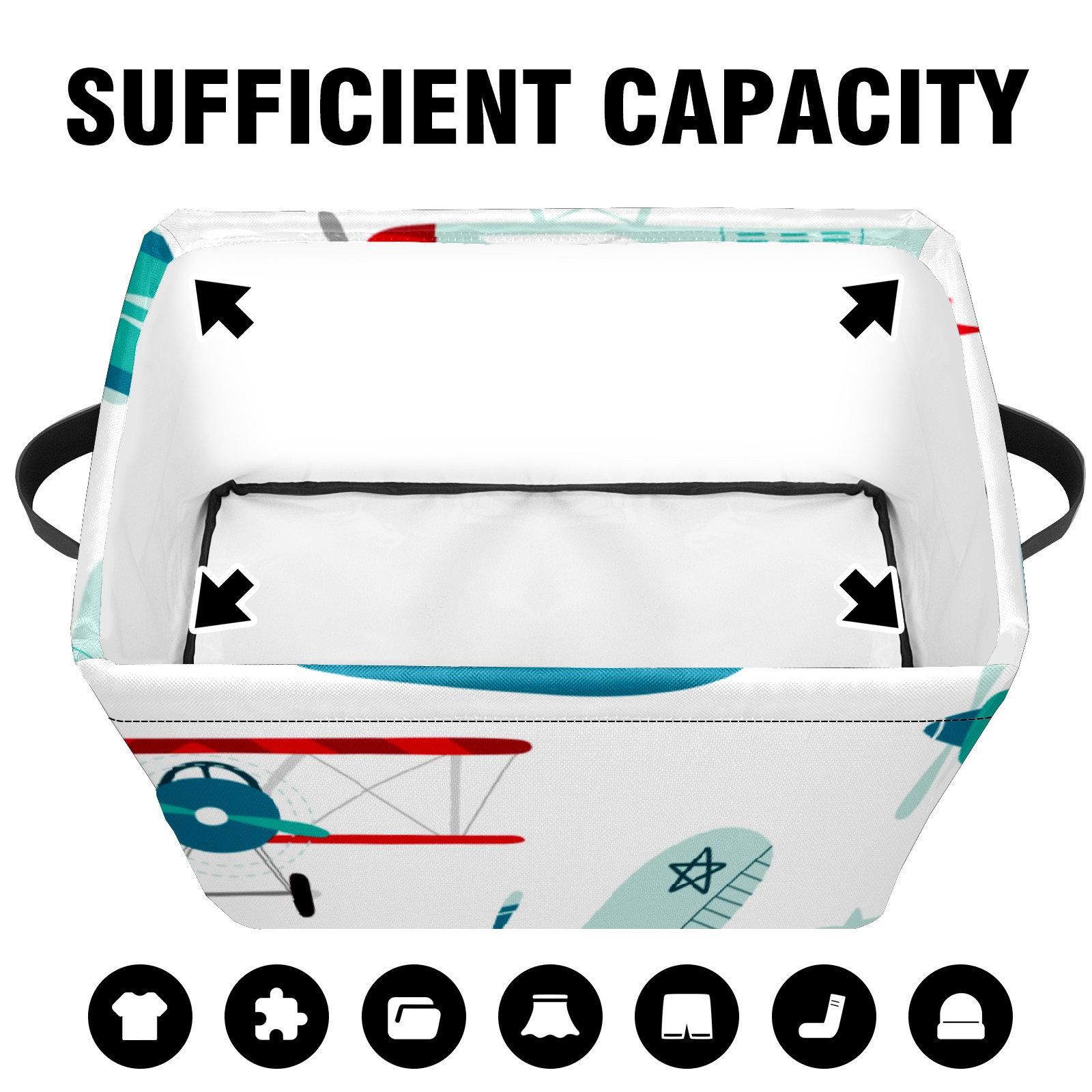 Collapsible 600D Oxford Storage Basket with Cartoon Airplane Helicopter - Metal Frame 10"x14"x8" Reinforced Handles, Multi-Purpose Organizer