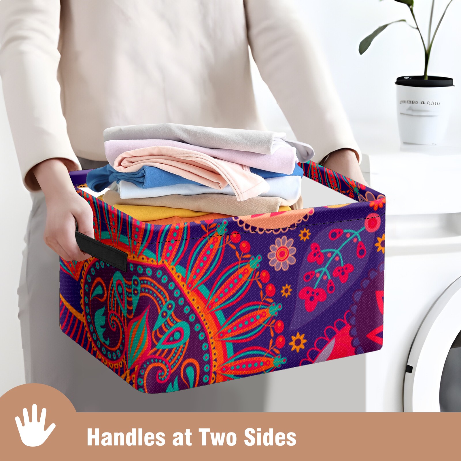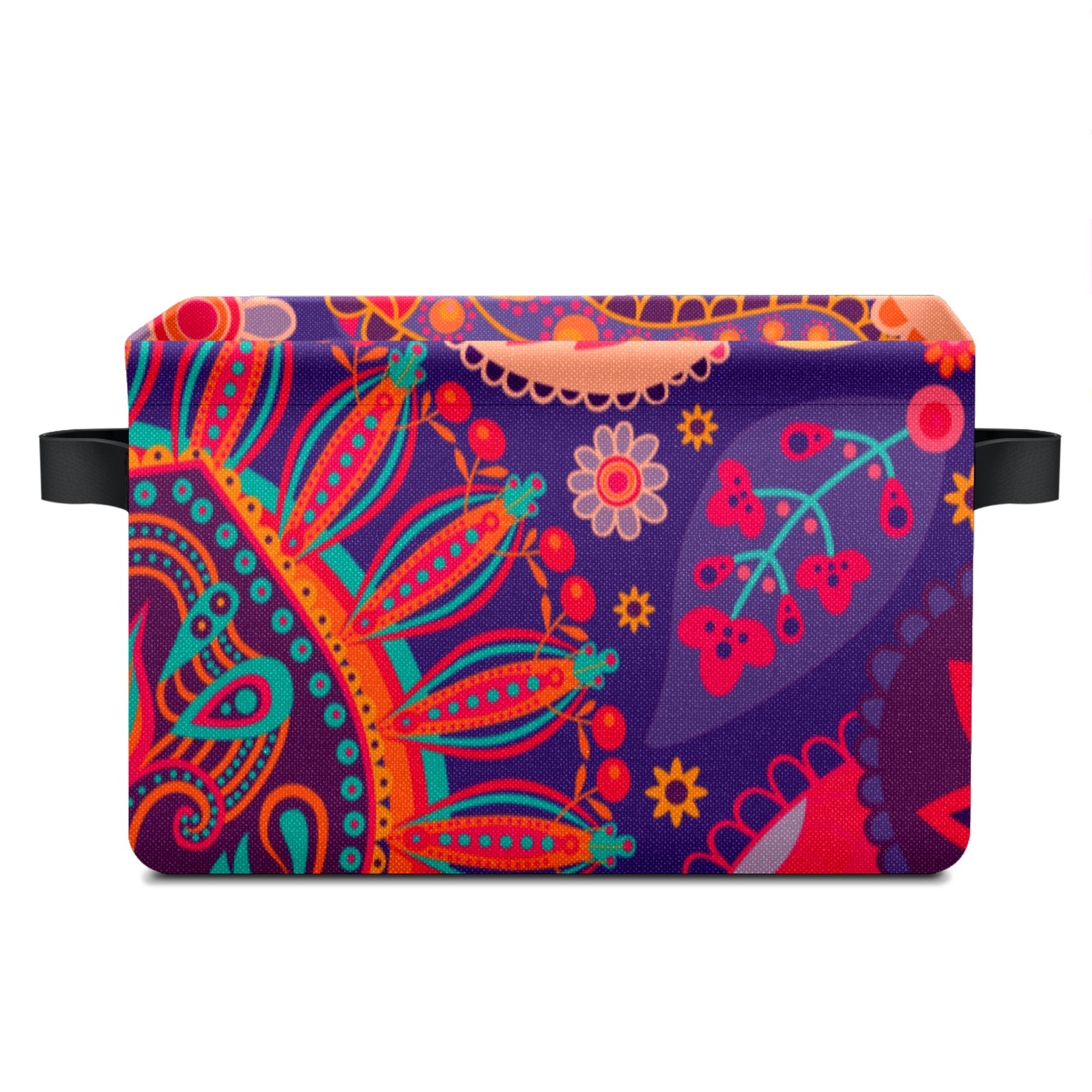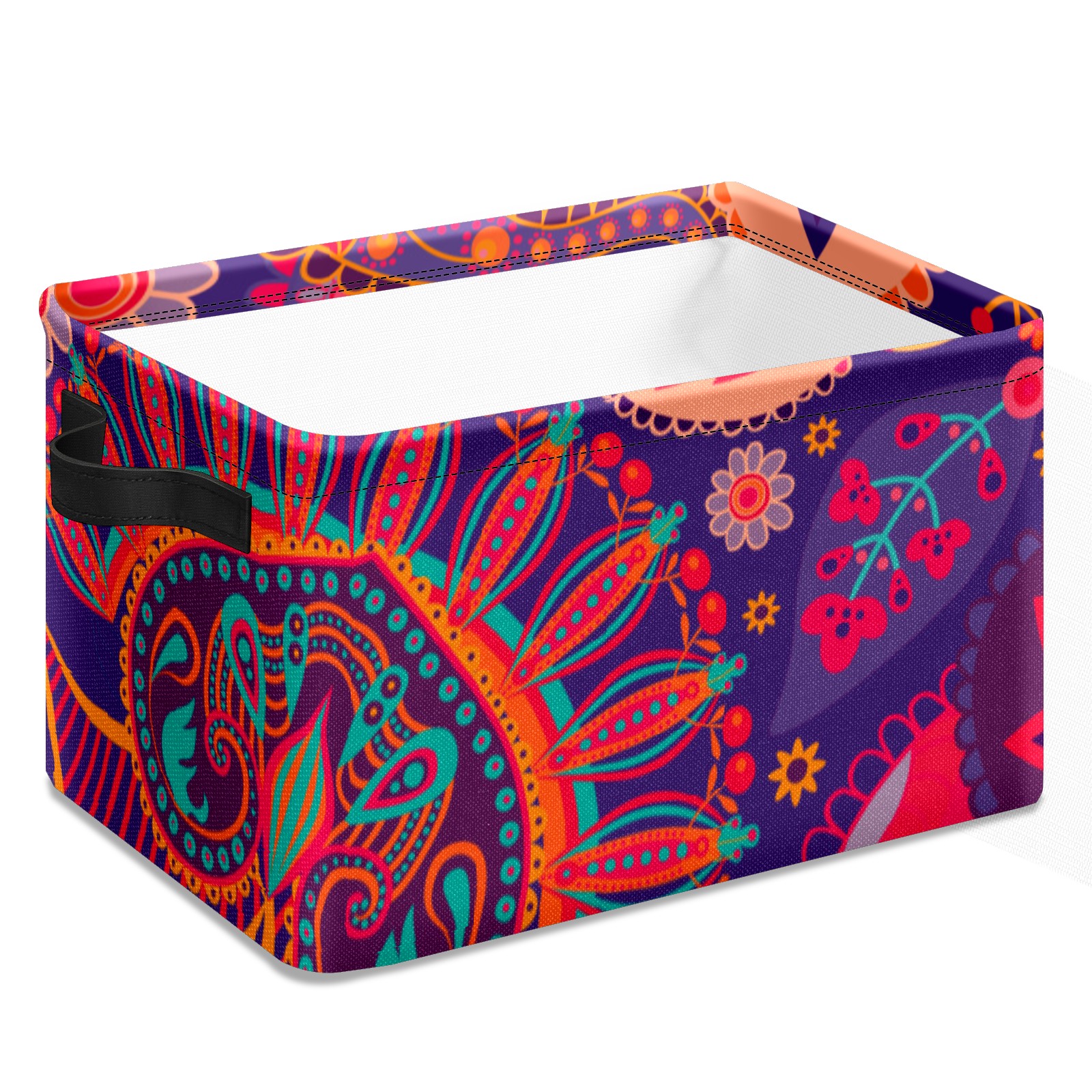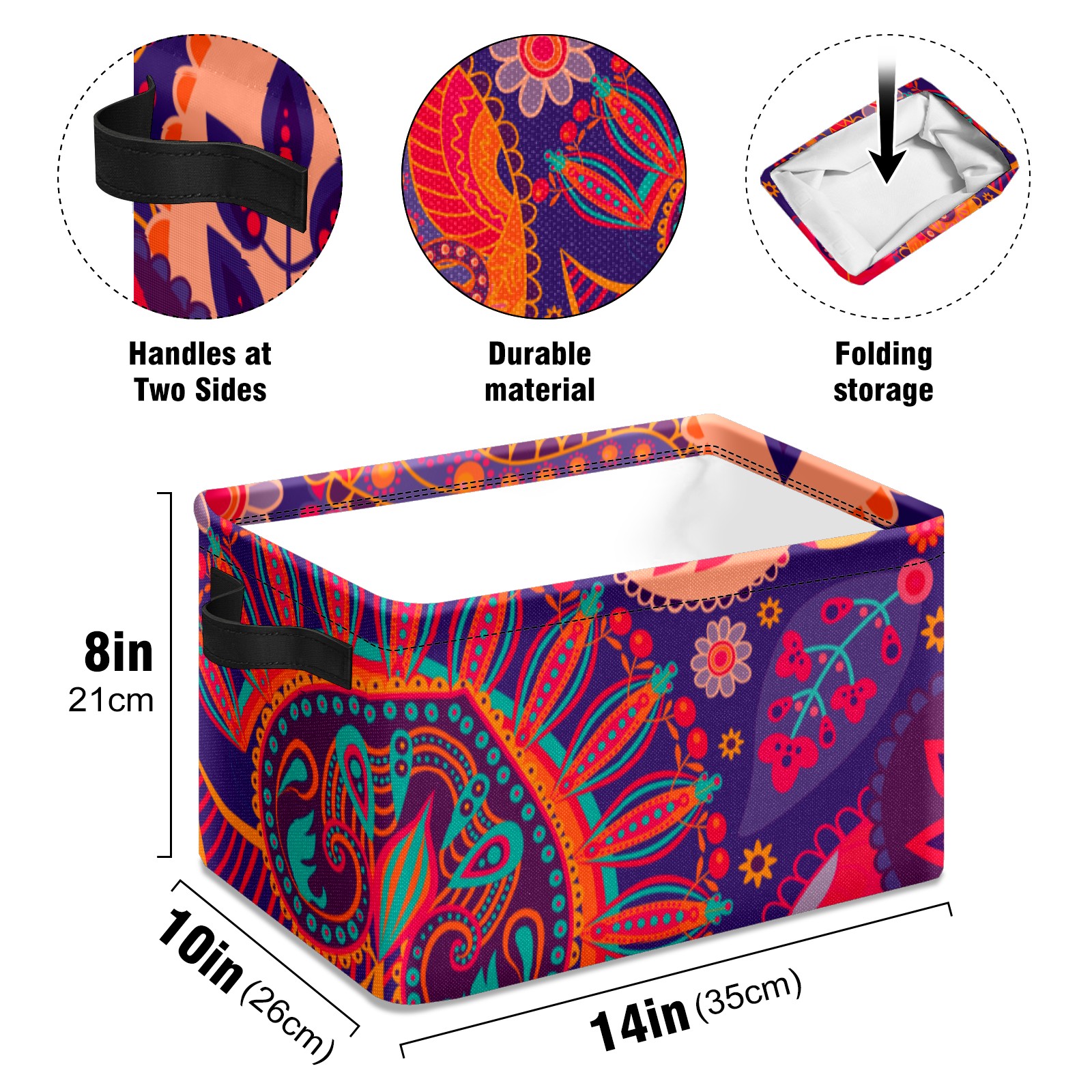 Collapsible 600D Oxford Storage Basket with Paisley Floral Colorful Ethnic Print - Metal Frame 10"x14"x8" Reinforced Handles, Multi-Purpose Organizer