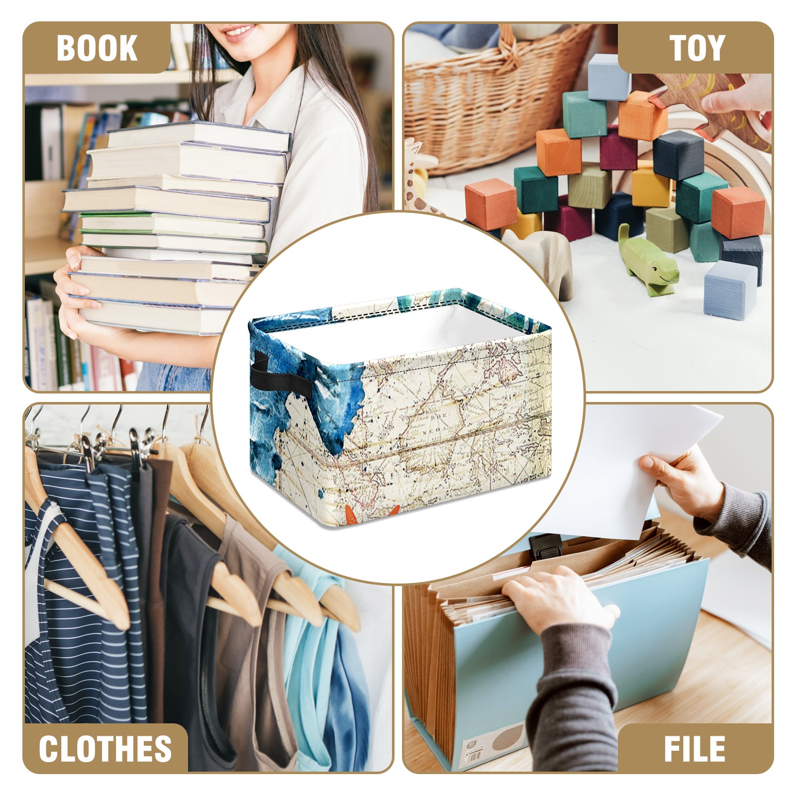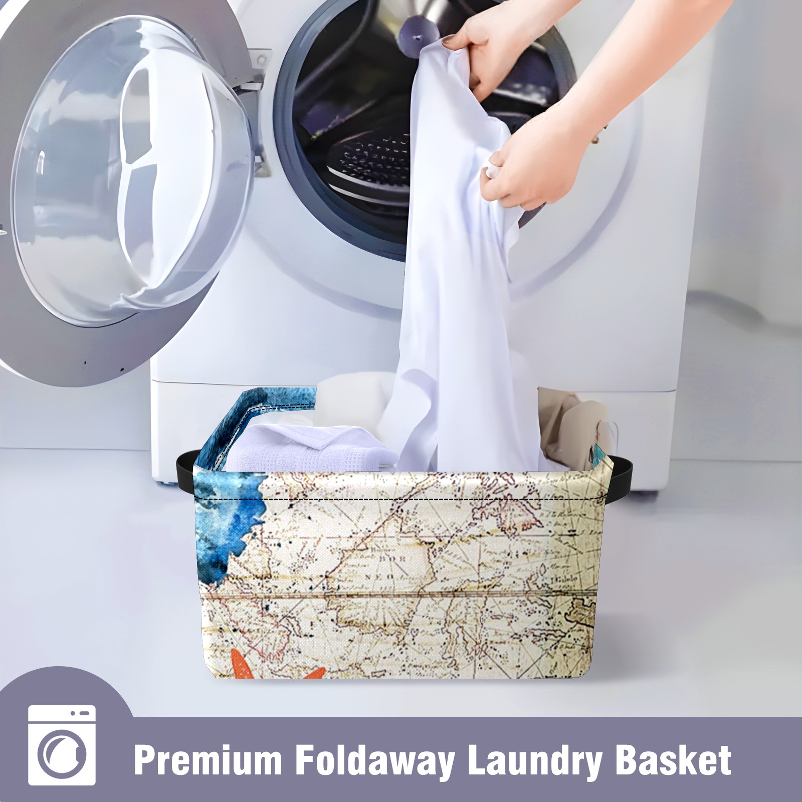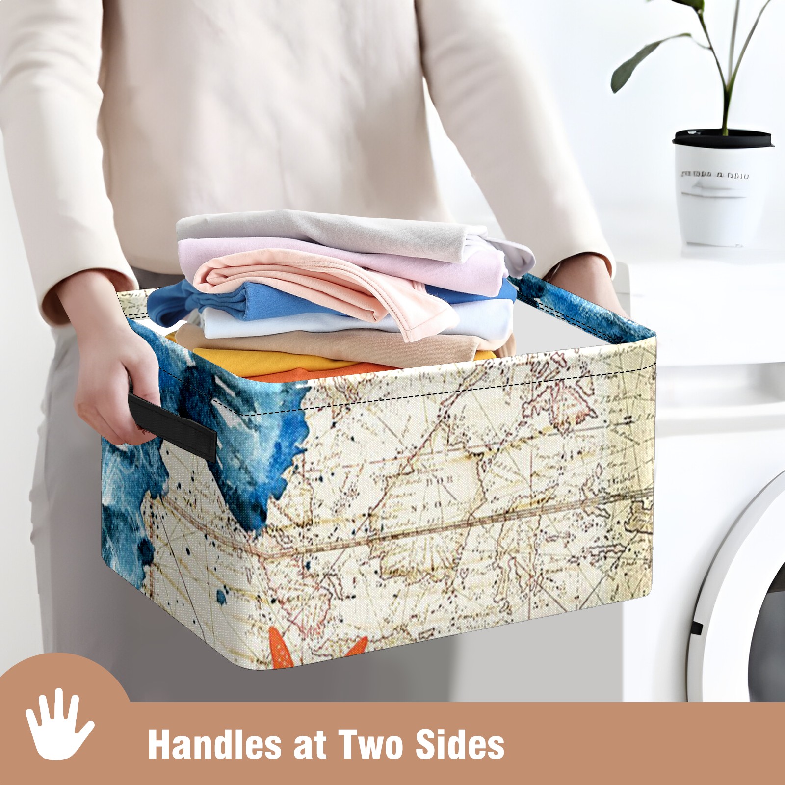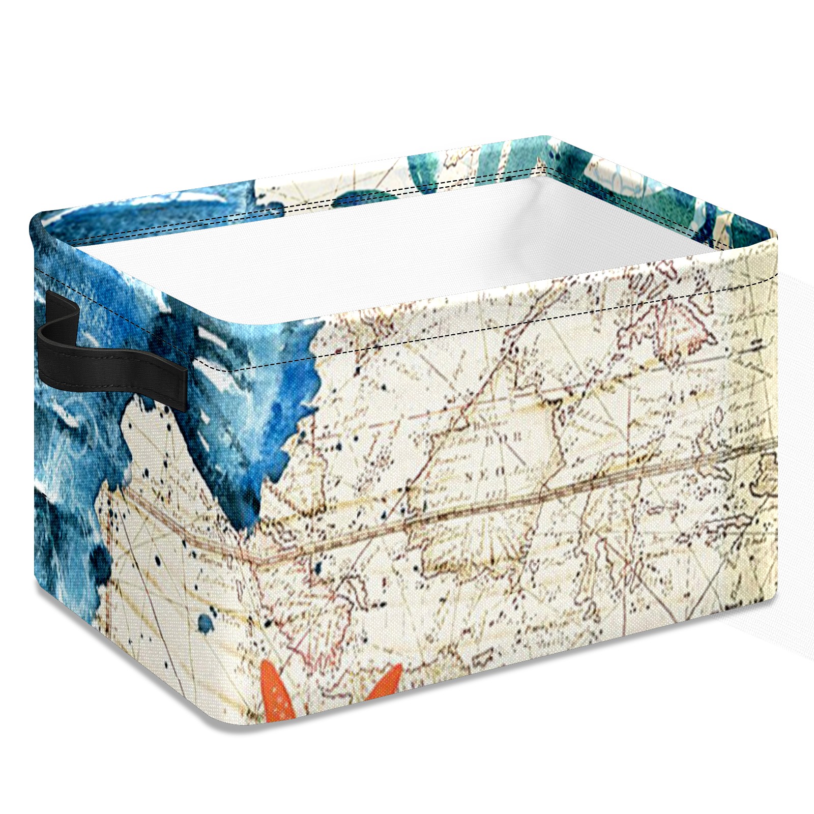 Collapsible 600D Oxford Storage Basket with Blue Seahorse Nautical Map - Metal Frame 10"x14"x8" Reinforced Handles, Multi-Purpose Organizer