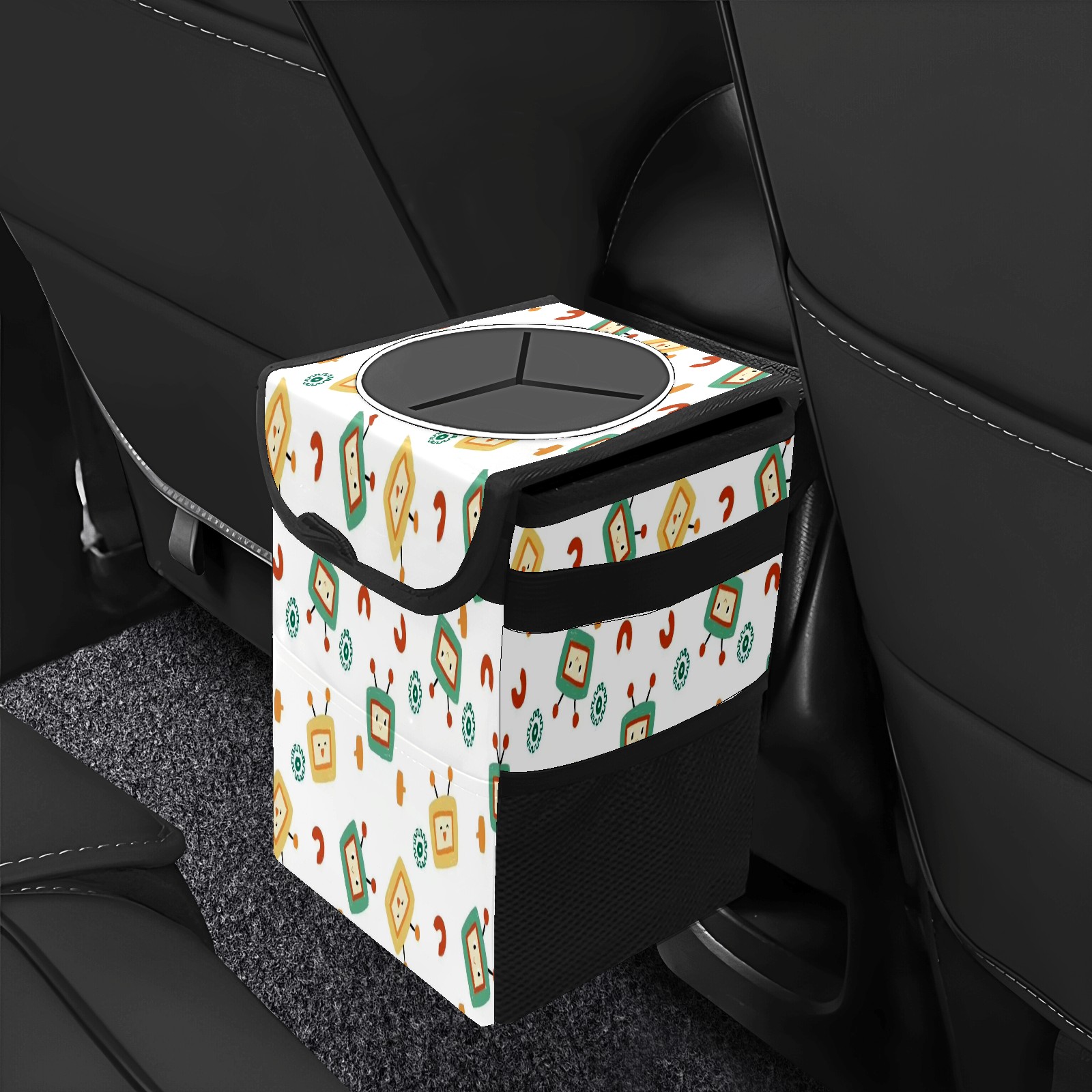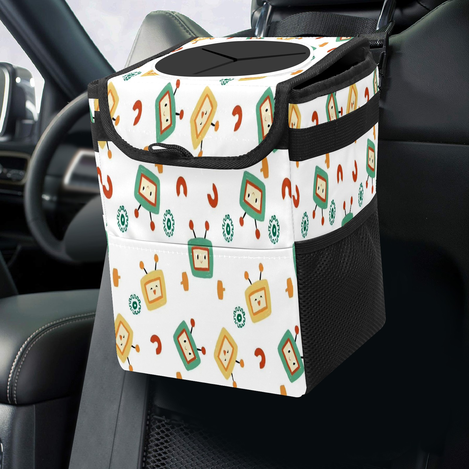 • Эта многофункциональная автомобильная мусорная корзина отличается стильным принтом, сочетающим в себе практичность и эстетику. Изготовленная из высококачественной саржевой ткани с плетеными ремнями, она прочная, долговечная и износостойкая. Размеры корзины составляют 24×17×16 см (9,5×6,7×6,3 дюйма). Верхнее отверстие имеет прорезиненное покрытие для удобной утилизации мусора; боковые сетчатые карманы и передний карман обеспечивают удобное хранение закусок, телефонов и других мелких предметов.