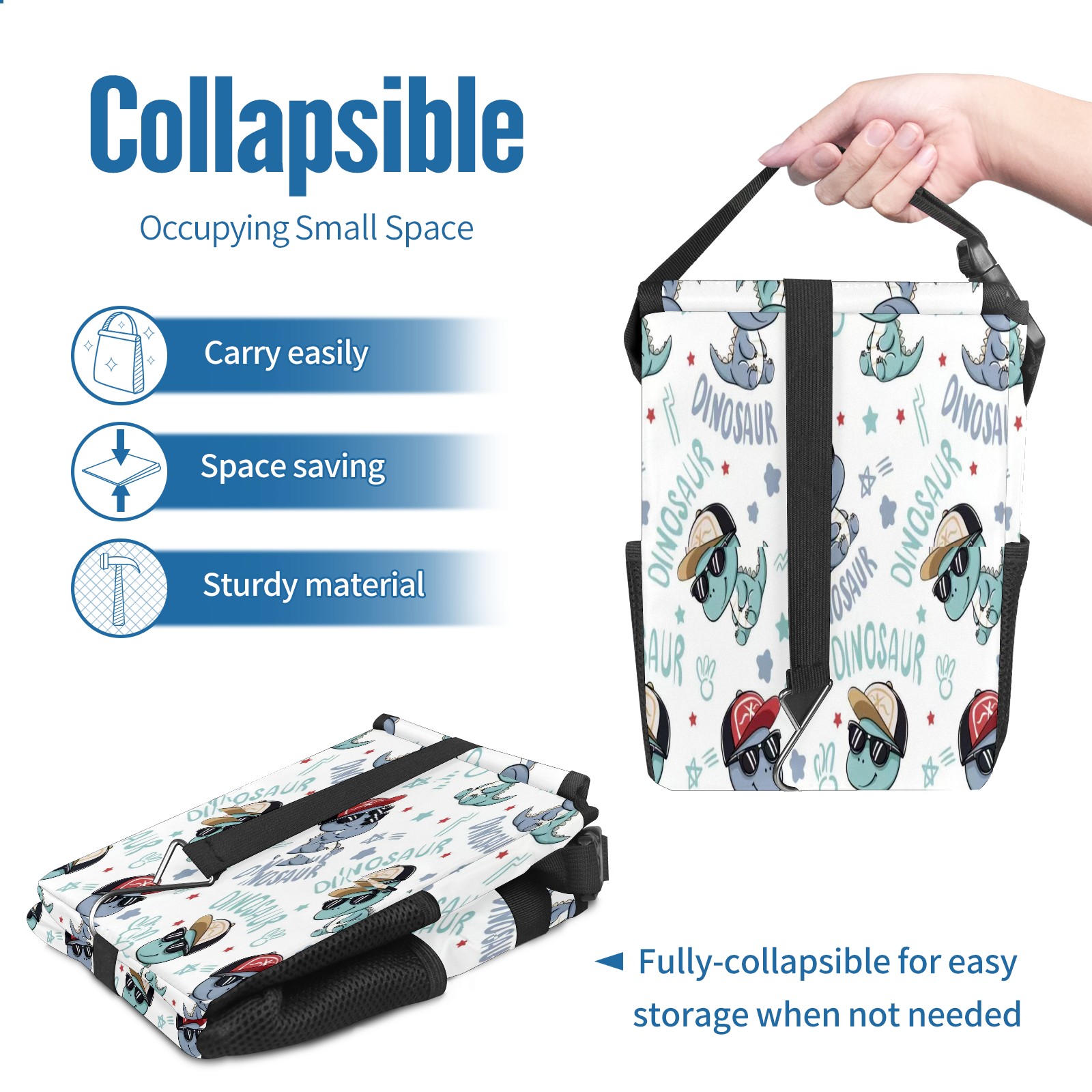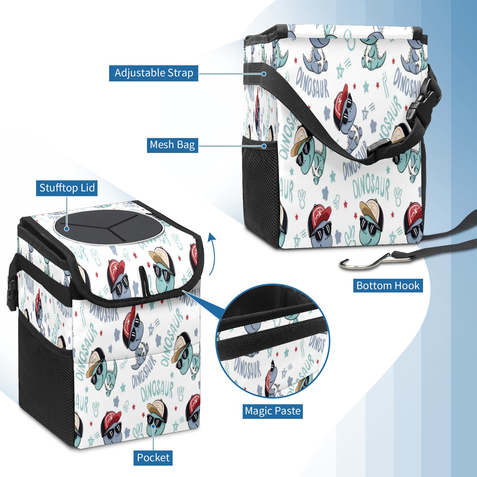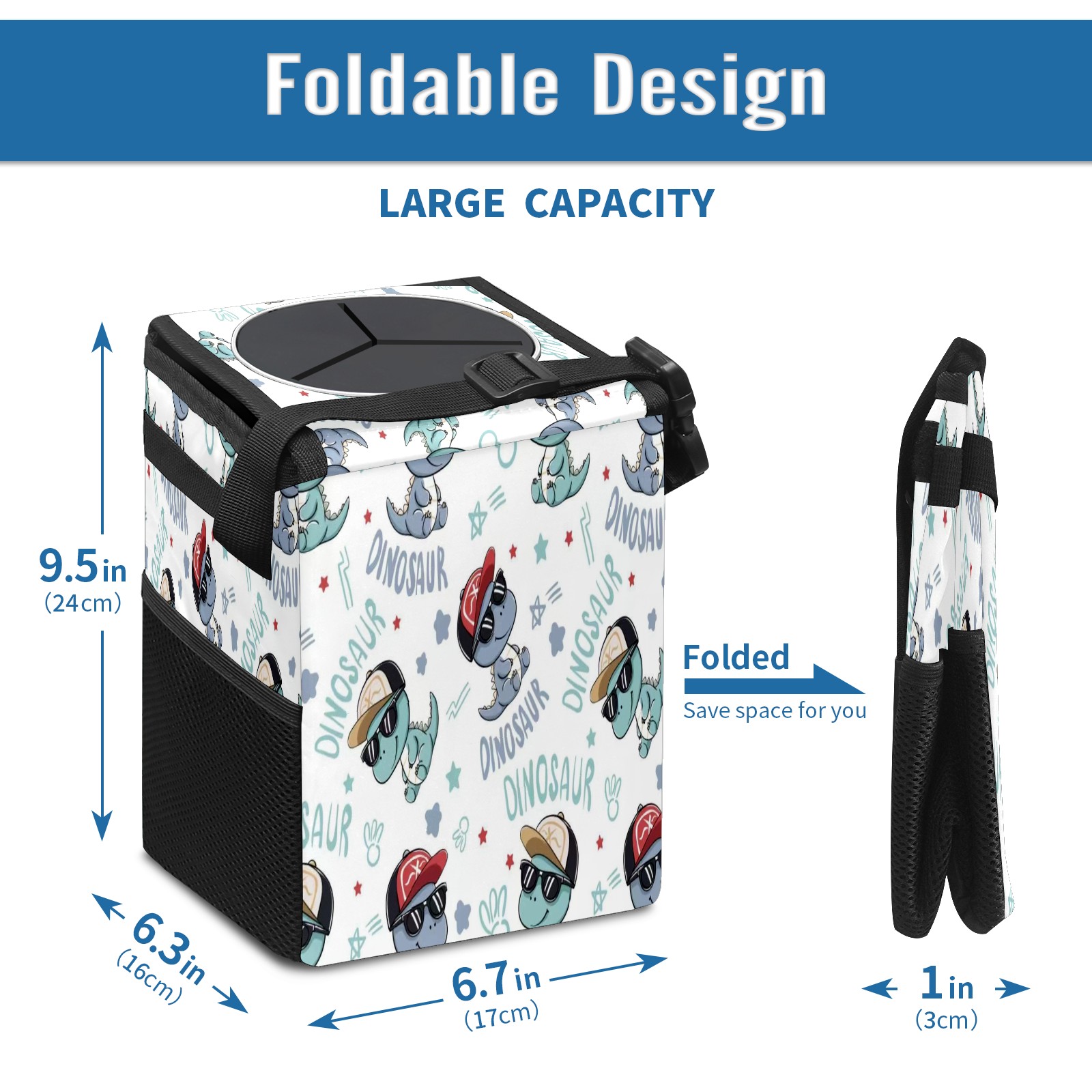 • Эта многофункциональная автомобильная мусорная корзина отличается стильным принтом, сочетающим в себе практичность и эстетику. Изготовленная из высококачественной саржевой ткани с плетеными ремнями, она прочная, долговечная и износостойкая. Размеры корзины составляют 24×17×16 см (9,5×6,7×6,3 дюйма). Верхнее отверстие имеет прорезиненное покрытие для удобной утилизации мусора; боковые сетчатые карманы и передний карман обеспечивают удобное хранение закусок, телефонов и других мелких предметов.