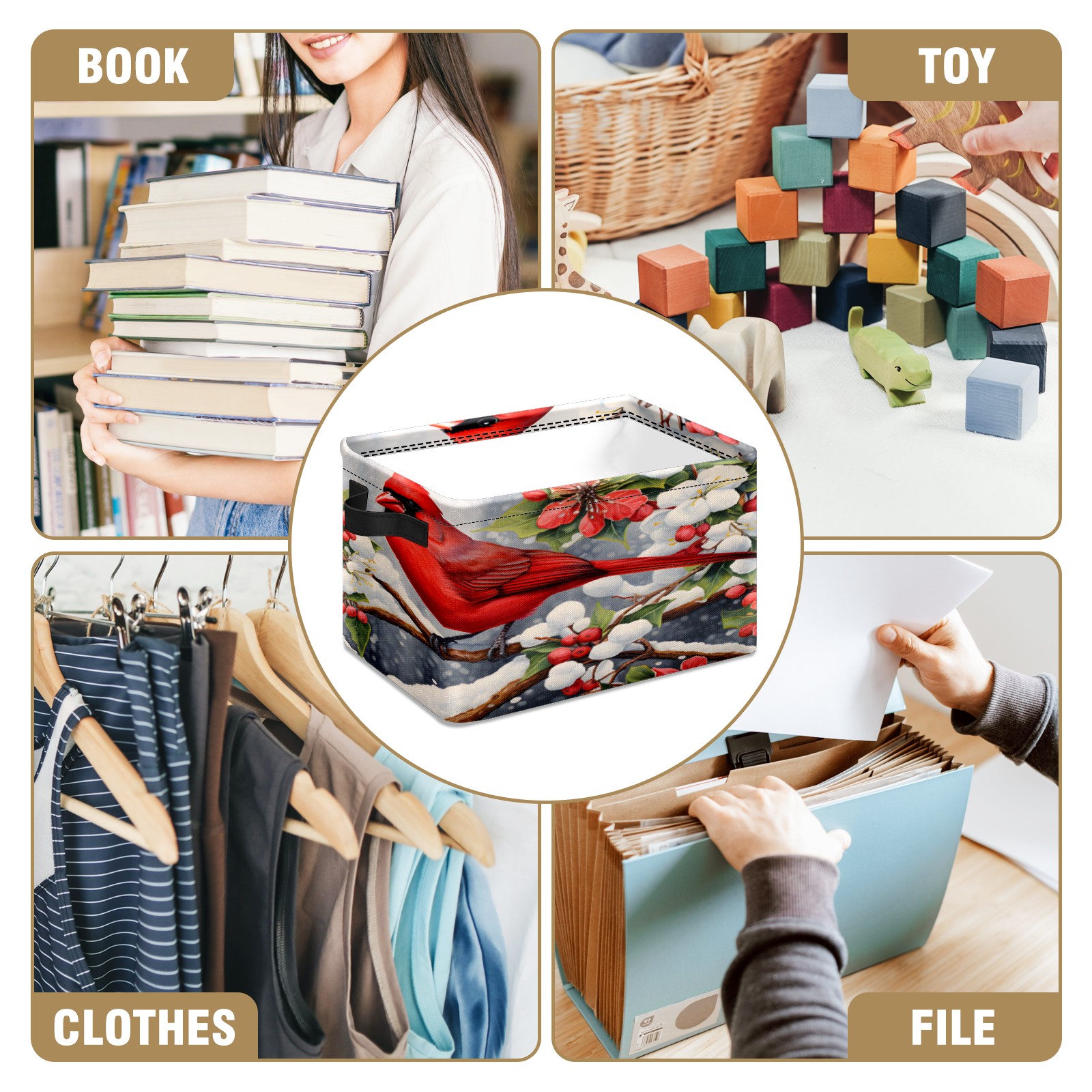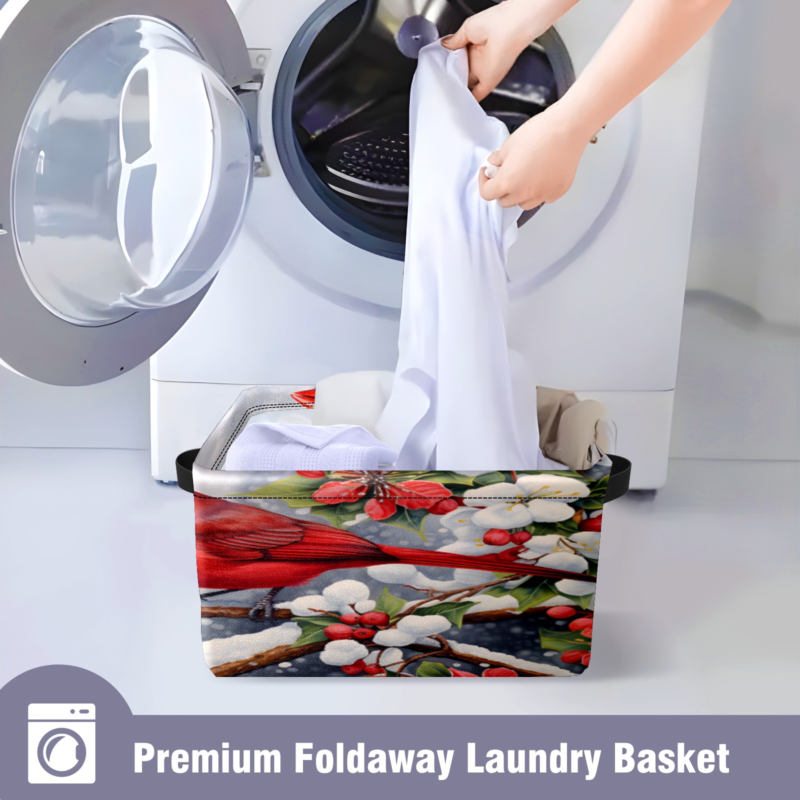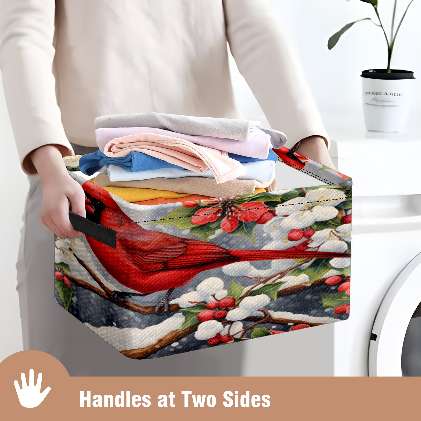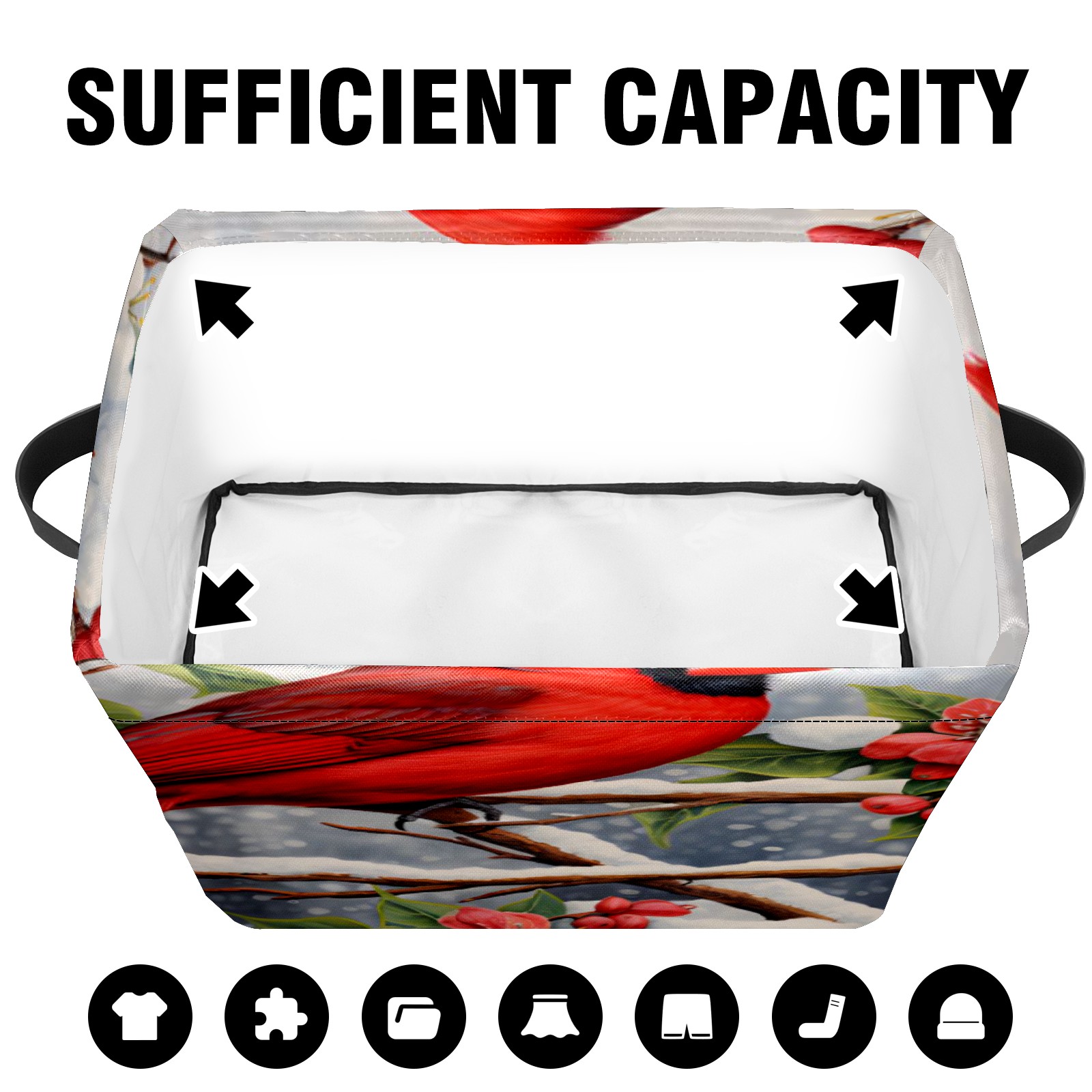 Collapsible 600D Oxford Storage Basket with Christmas Cardinal - Metal Frame 10"x14"x8" Reinforced Handles, Multi-Purpose Organizer