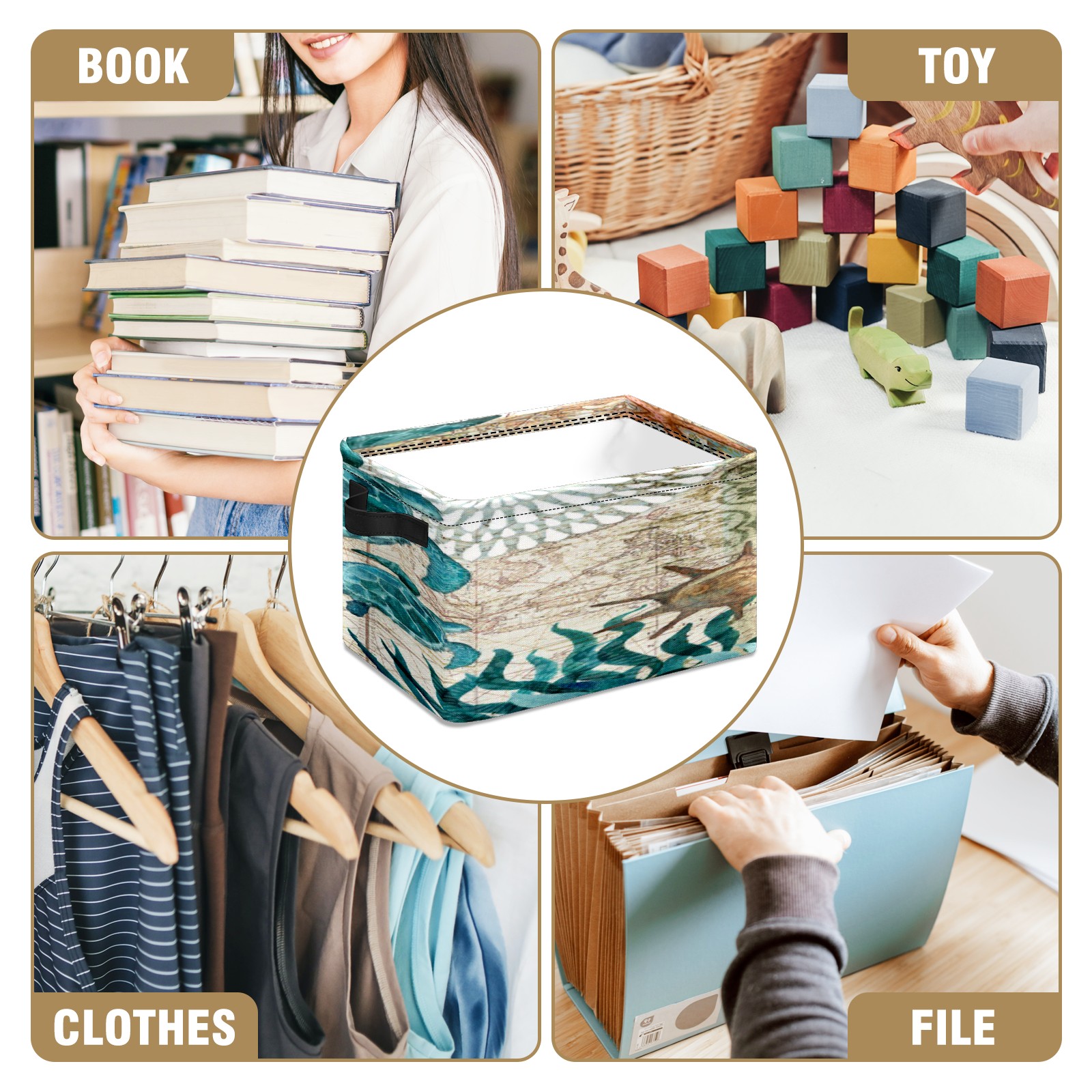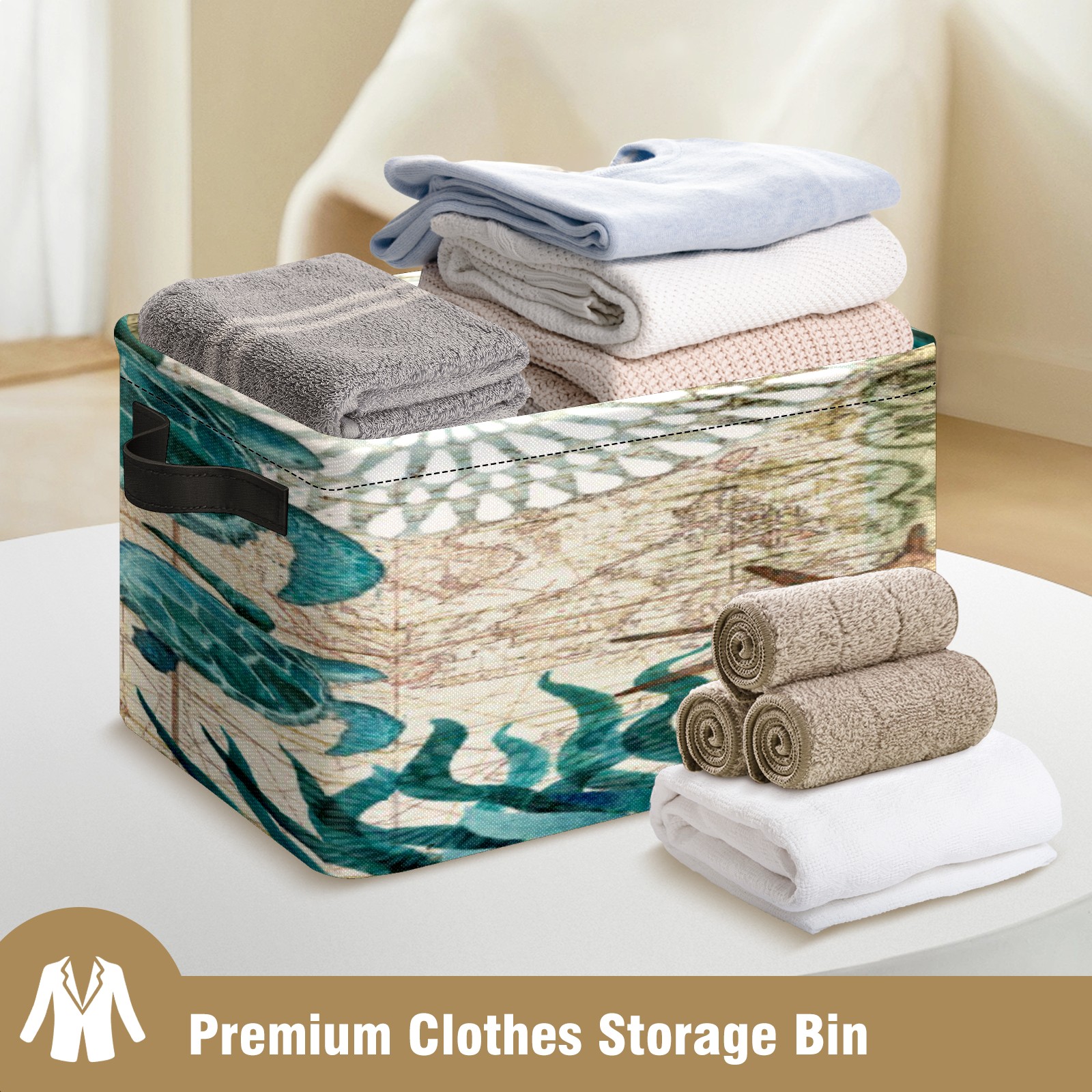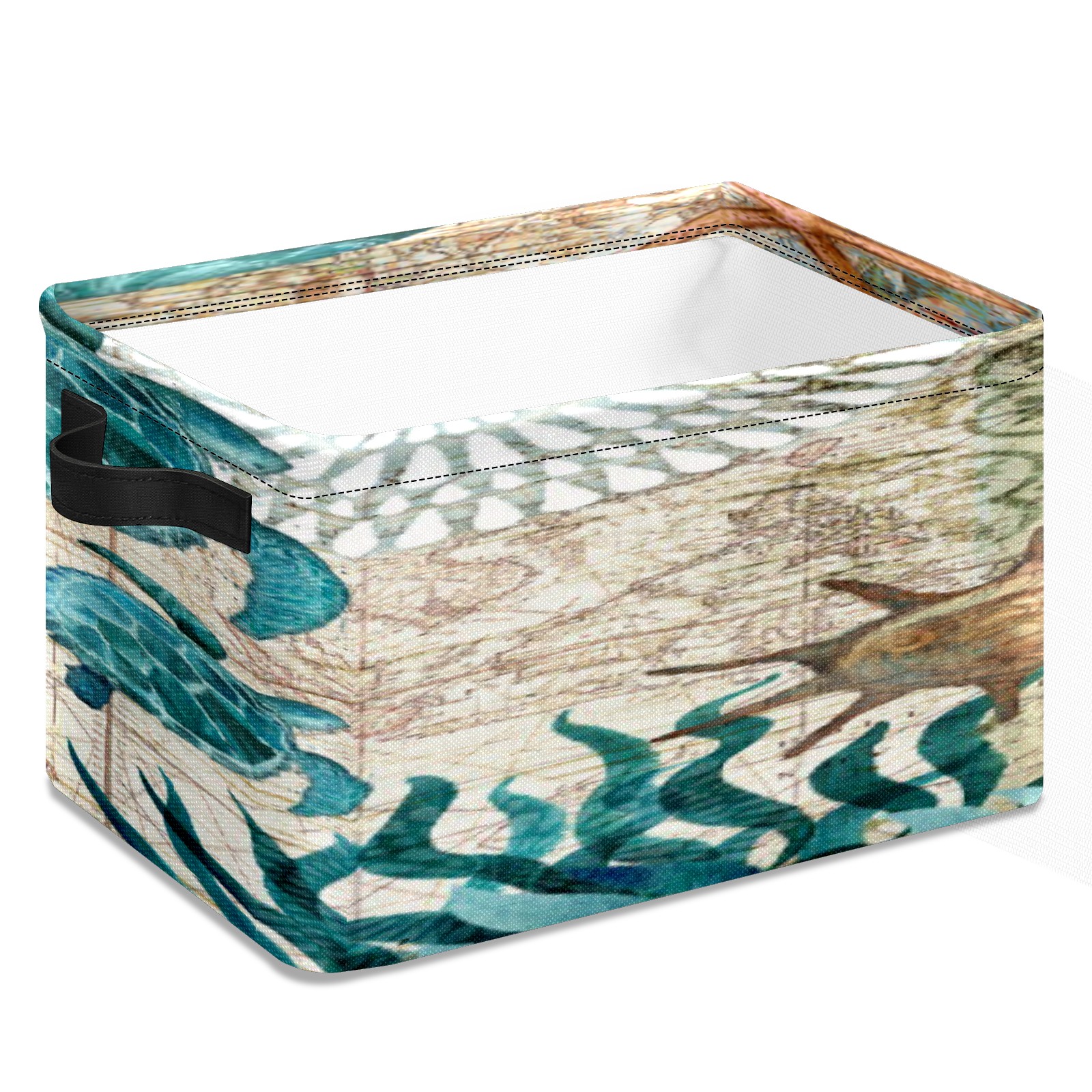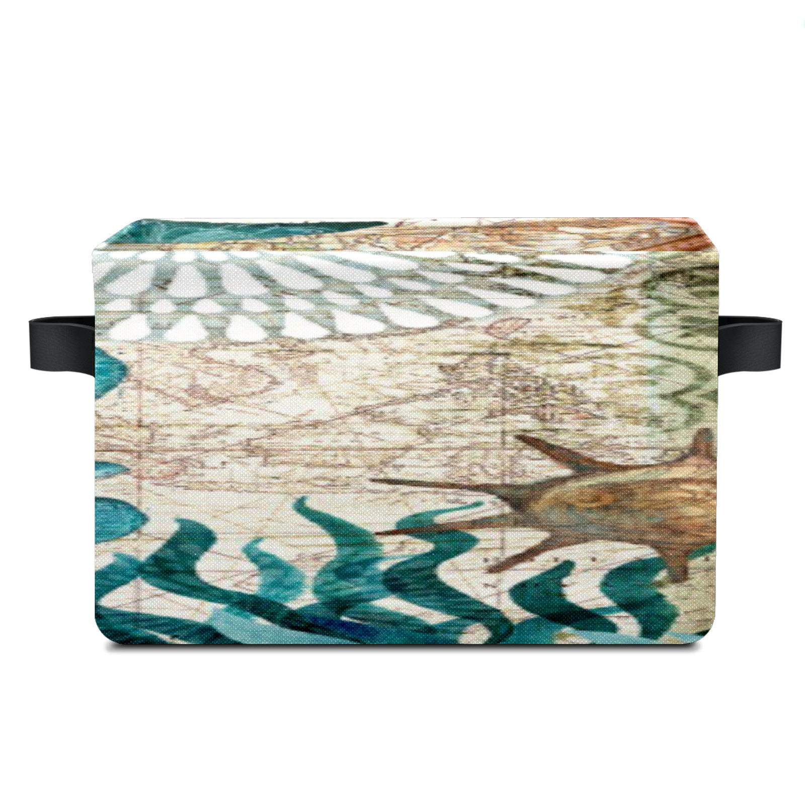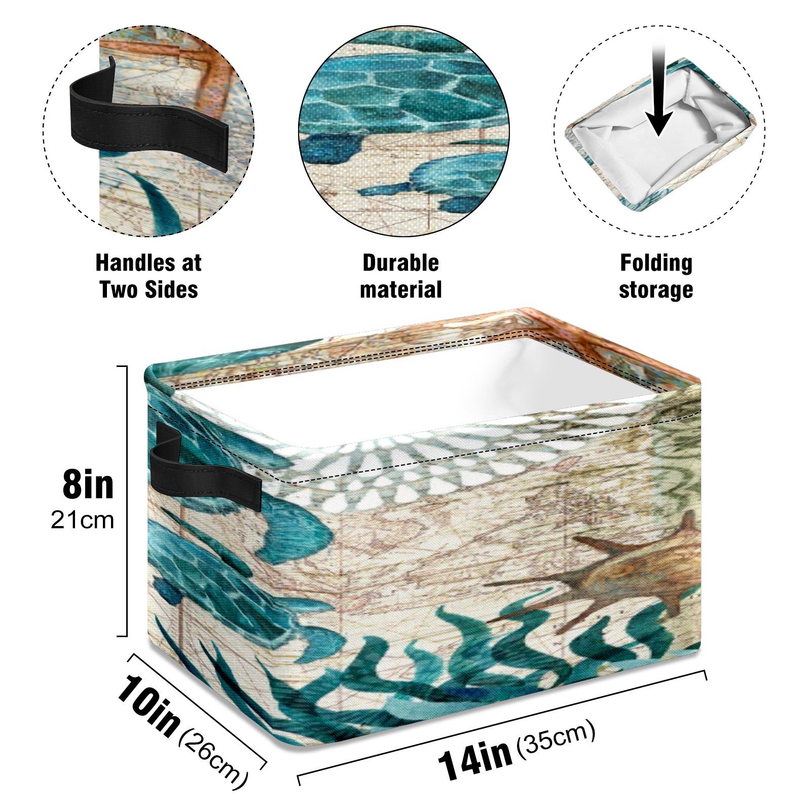 Collapsible 600D Oxford Storage Basket with Vintage Vautical Sea Turtle (1) - Metal Frame 10"x14"x8" Reinforced Handles, Multi-Purpose Organizer