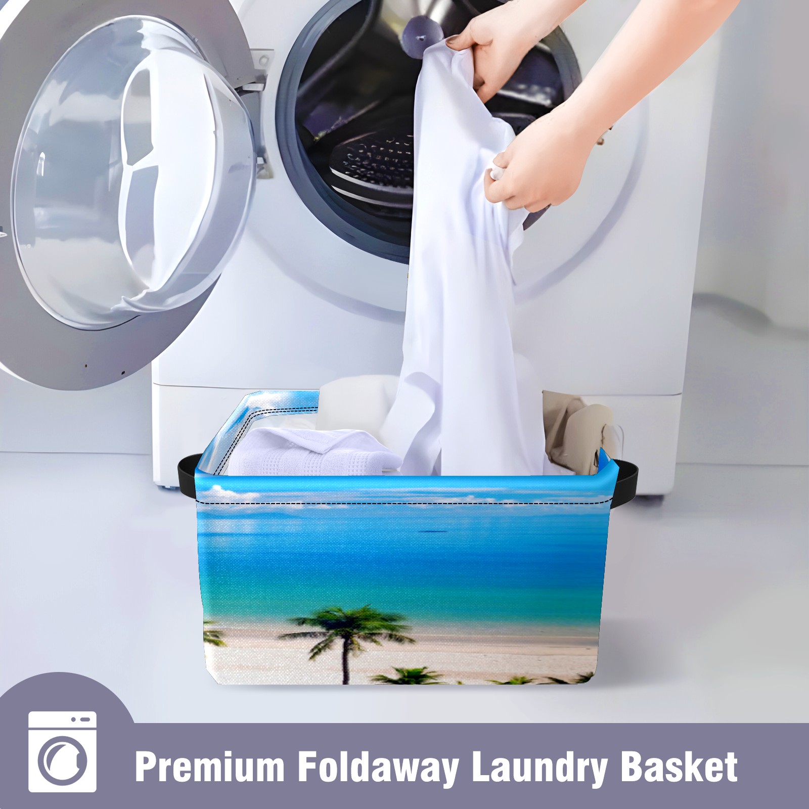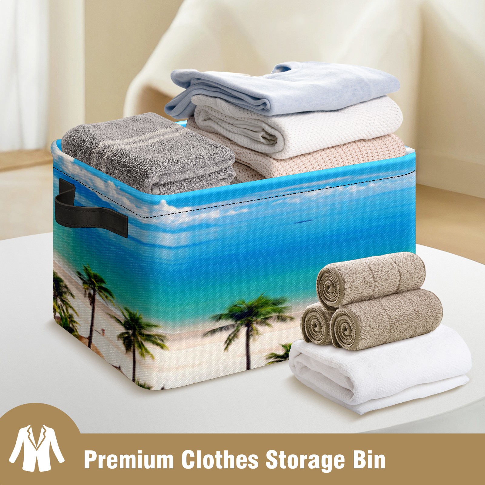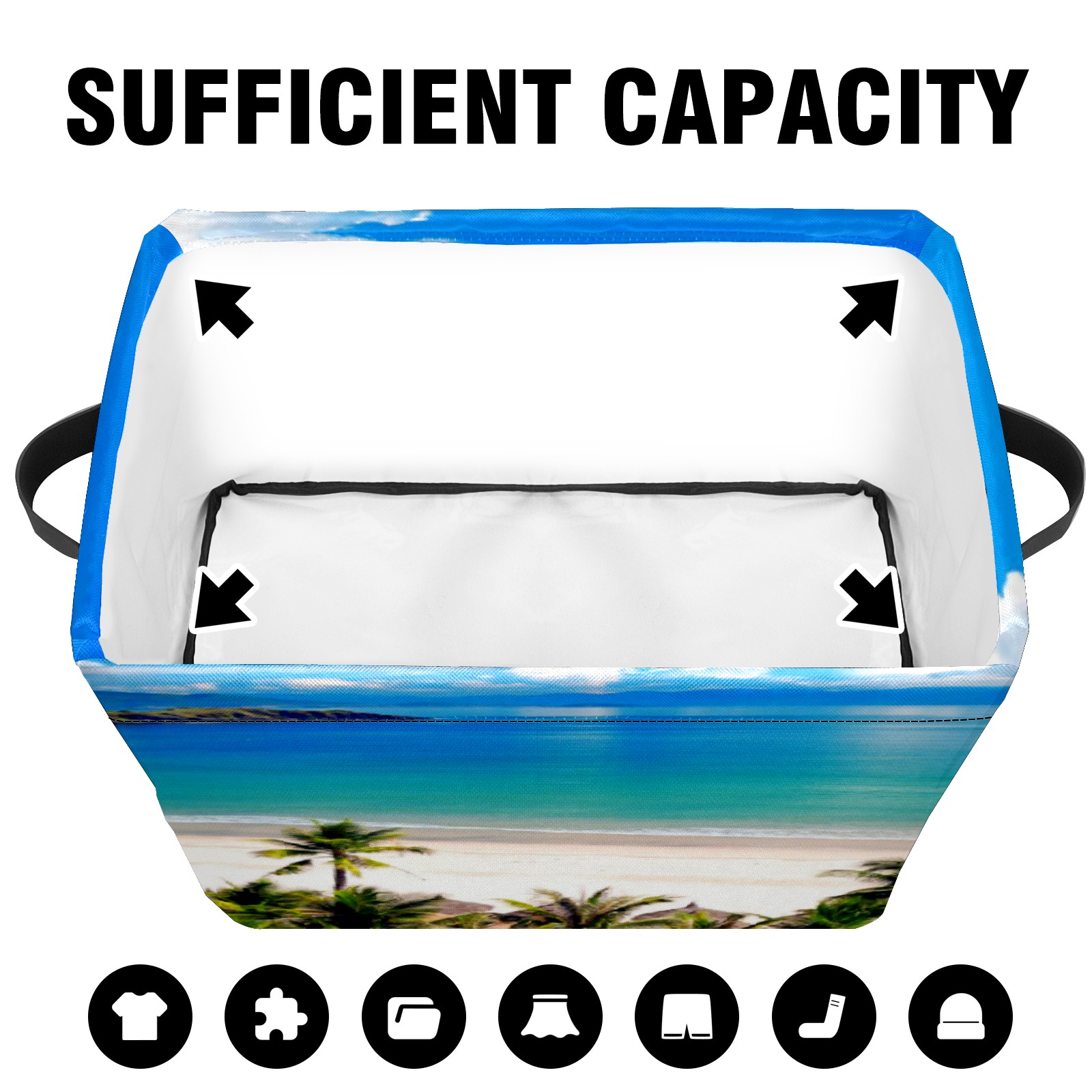 Collapsible 600D Oxford Storage Basket with Tropical Beach Blue Sea - Metal Frame 10"x14"x8" Reinforced Handles, Multi-Purpose Organizer