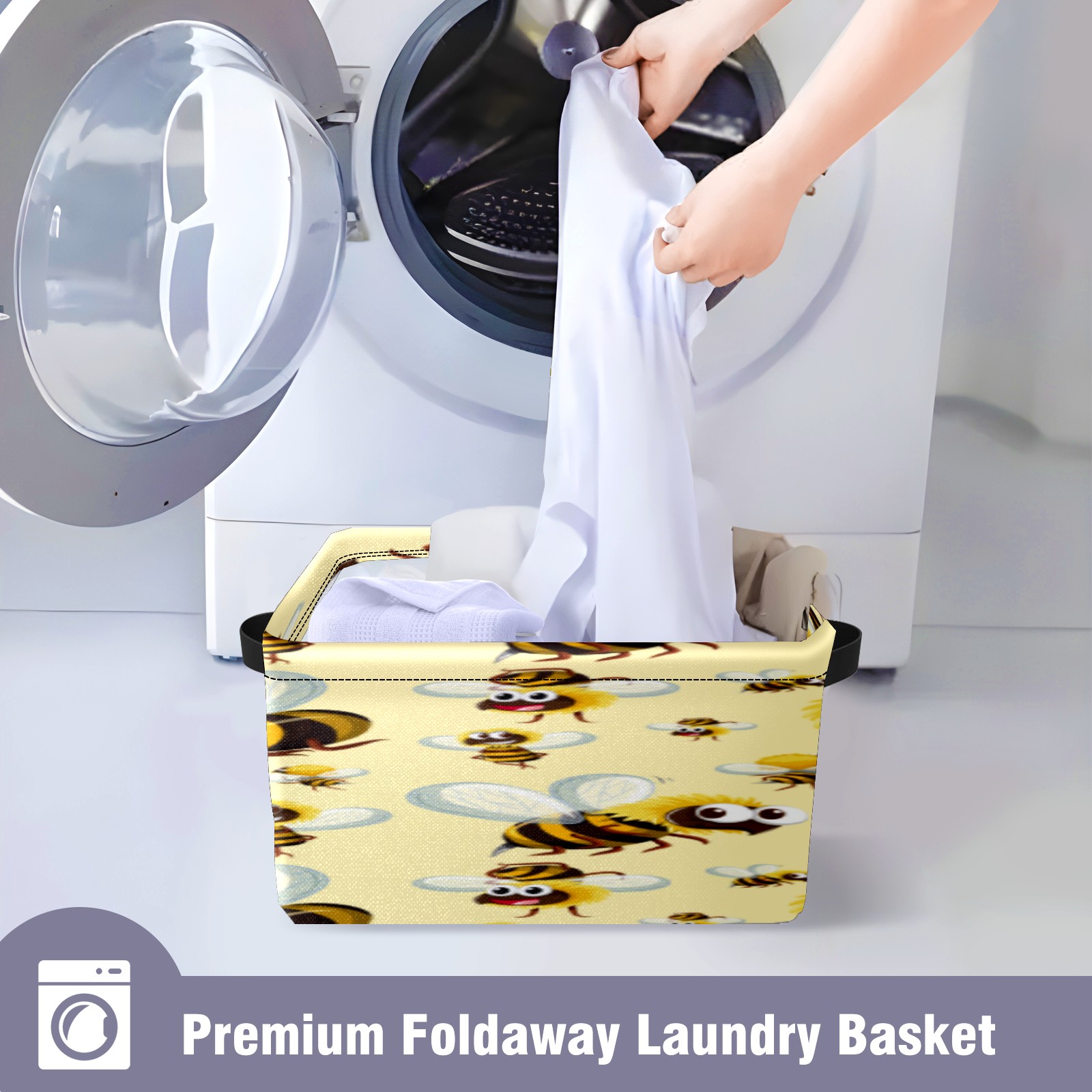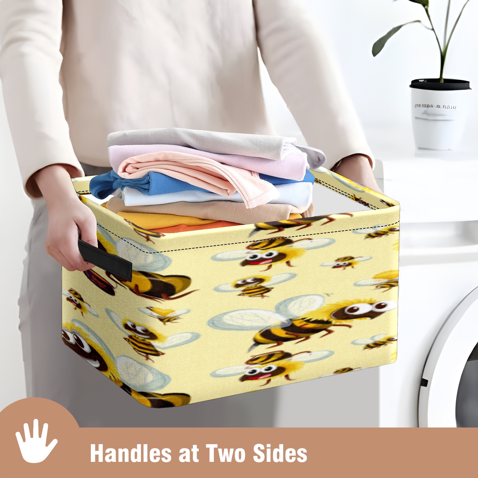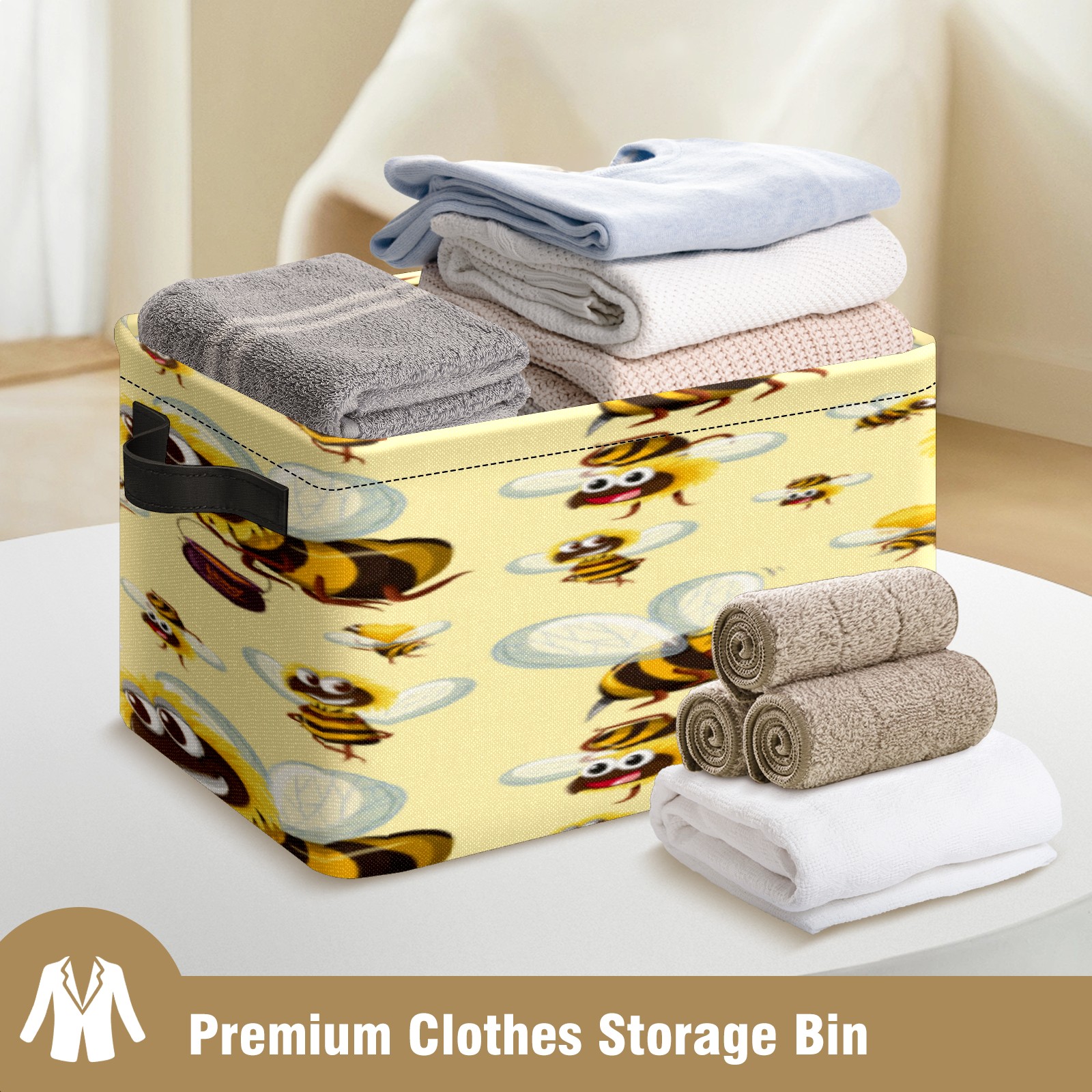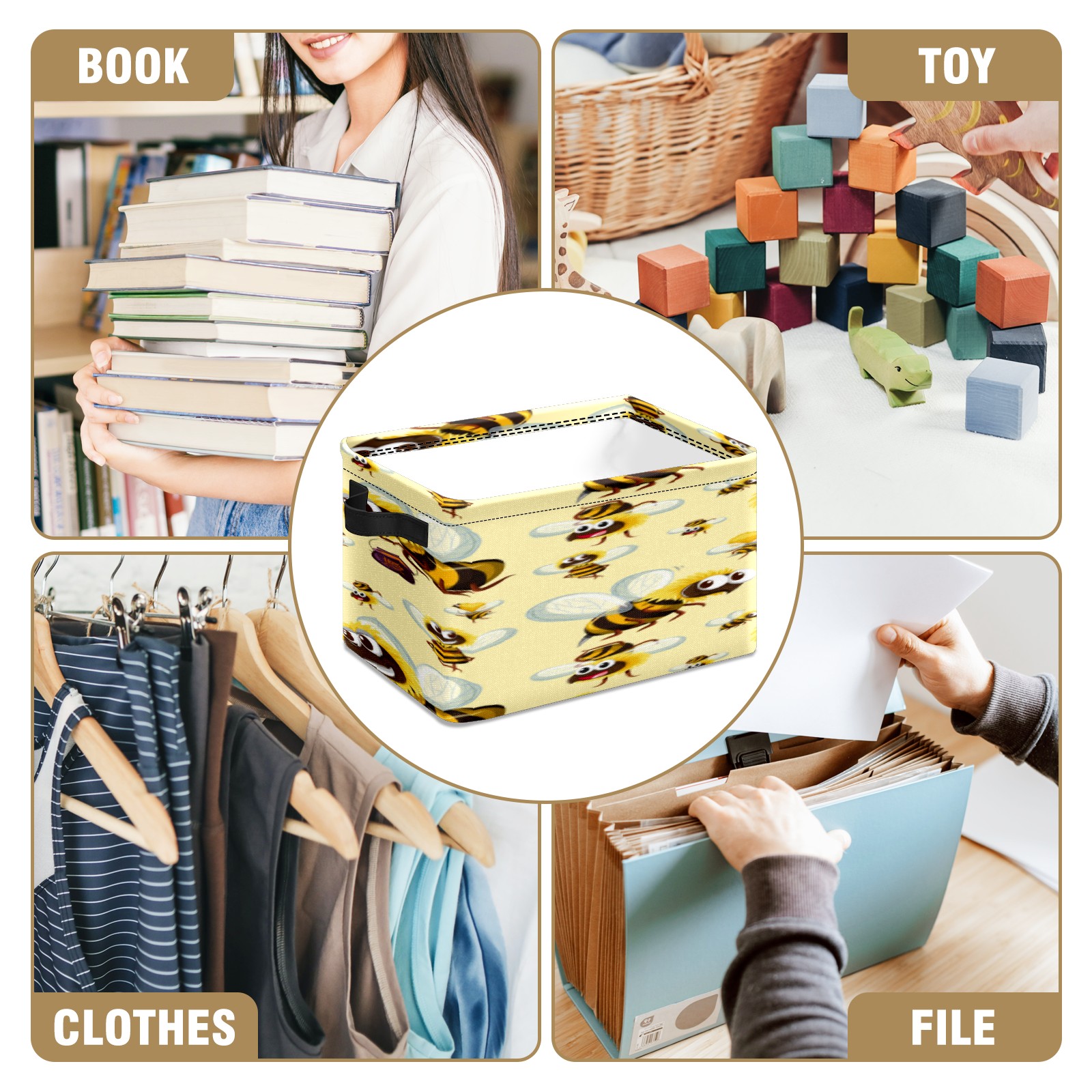 Collapsible 600D Oxford Storage Basket with Busy Funny Big Head Yellow Bees - Metal Frame 10"x14"x8" Reinforced Handles, Multi-Purpose Organizer