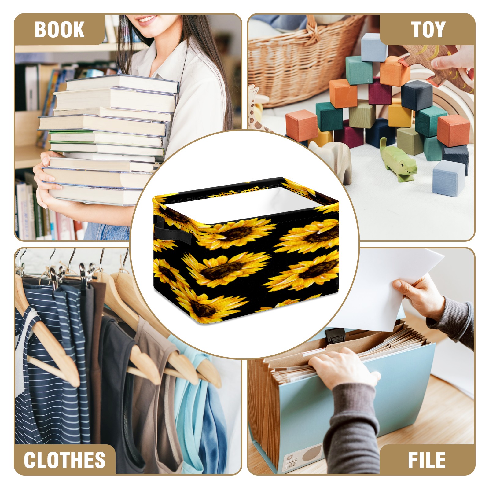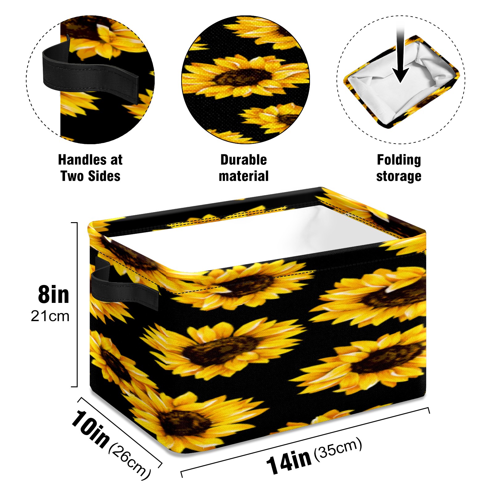 Collapsible 600D Oxford Storage Basket with Yellow Sunflower Pattern - Metal Frame 10"x14"x8" Reinforced Handles, Multi-Purpose Organizer