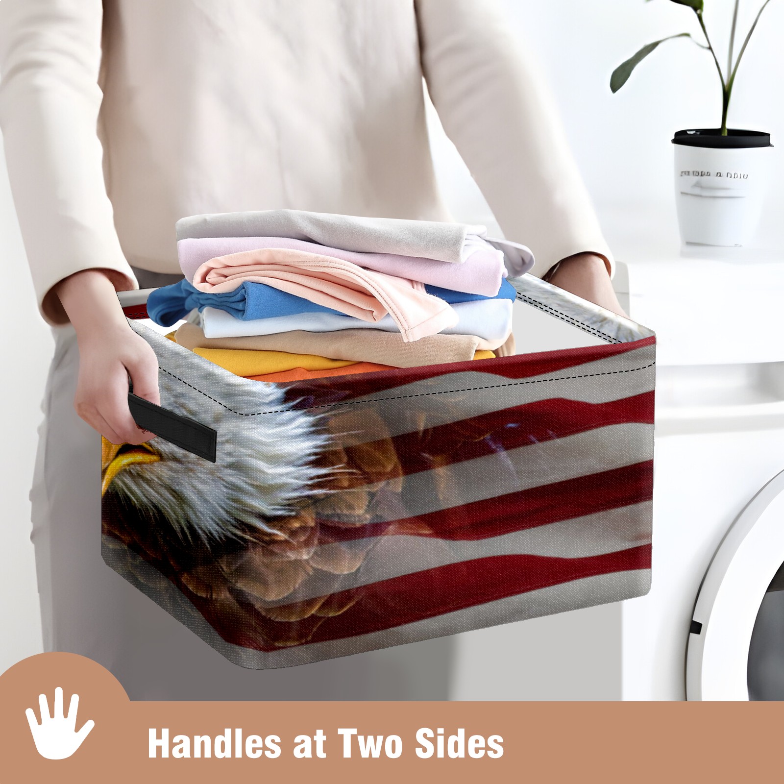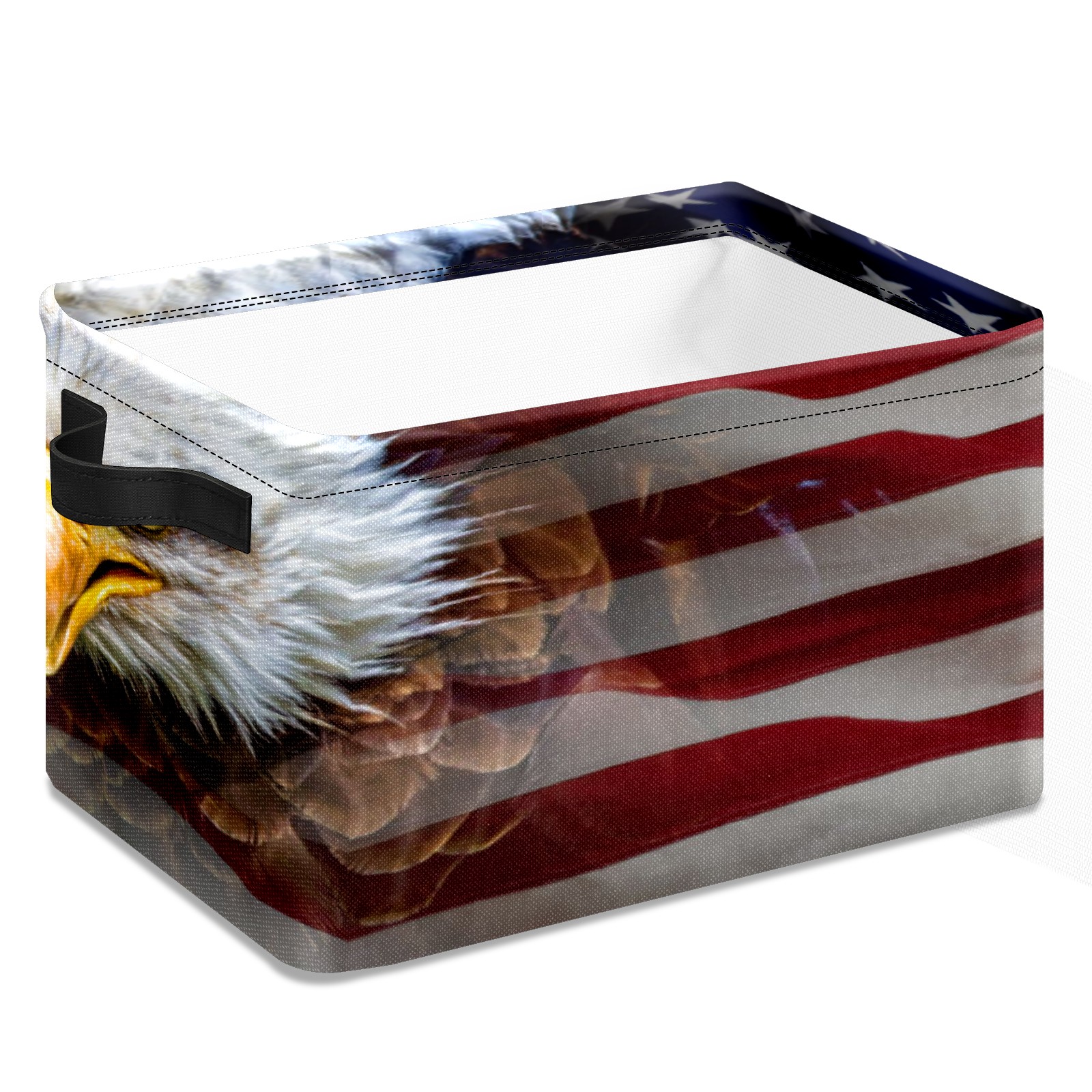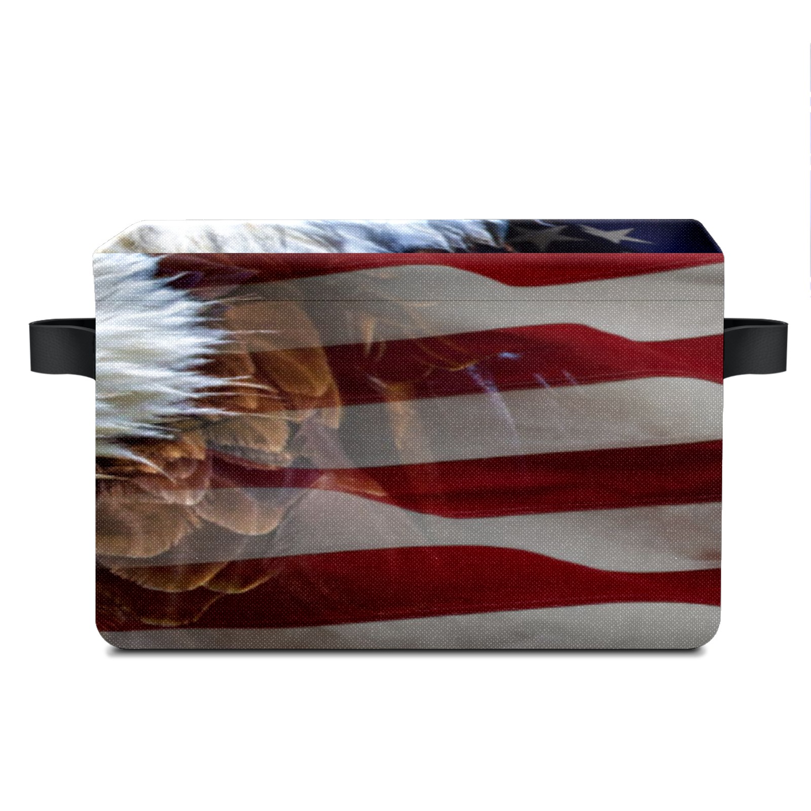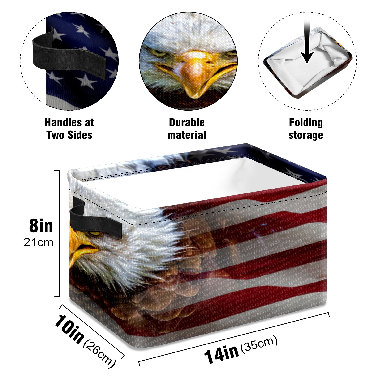 Collapsible 600D Oxford Storage Basket with American Flag Eagle - Metal Frame 10"x14"x8" Reinforced Handles, Multi-Purpose Organizer