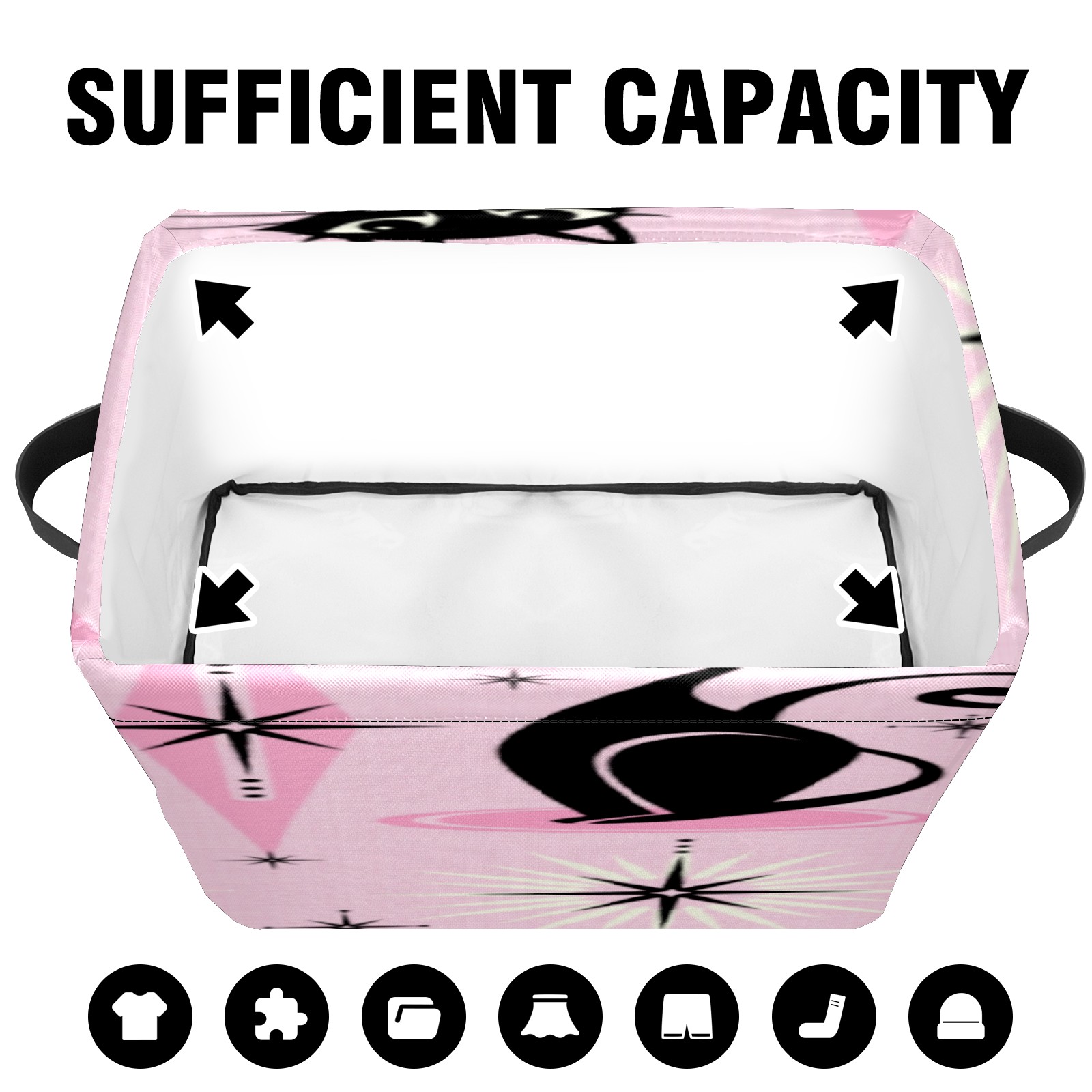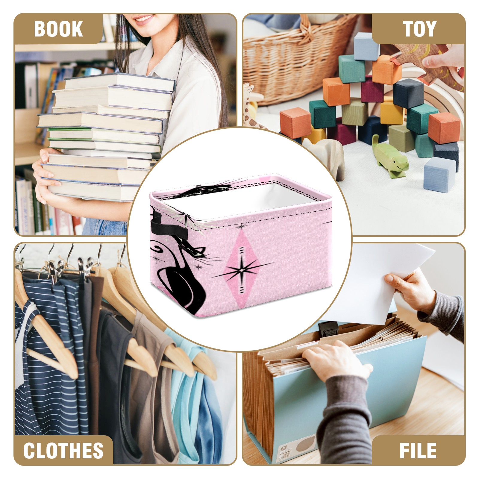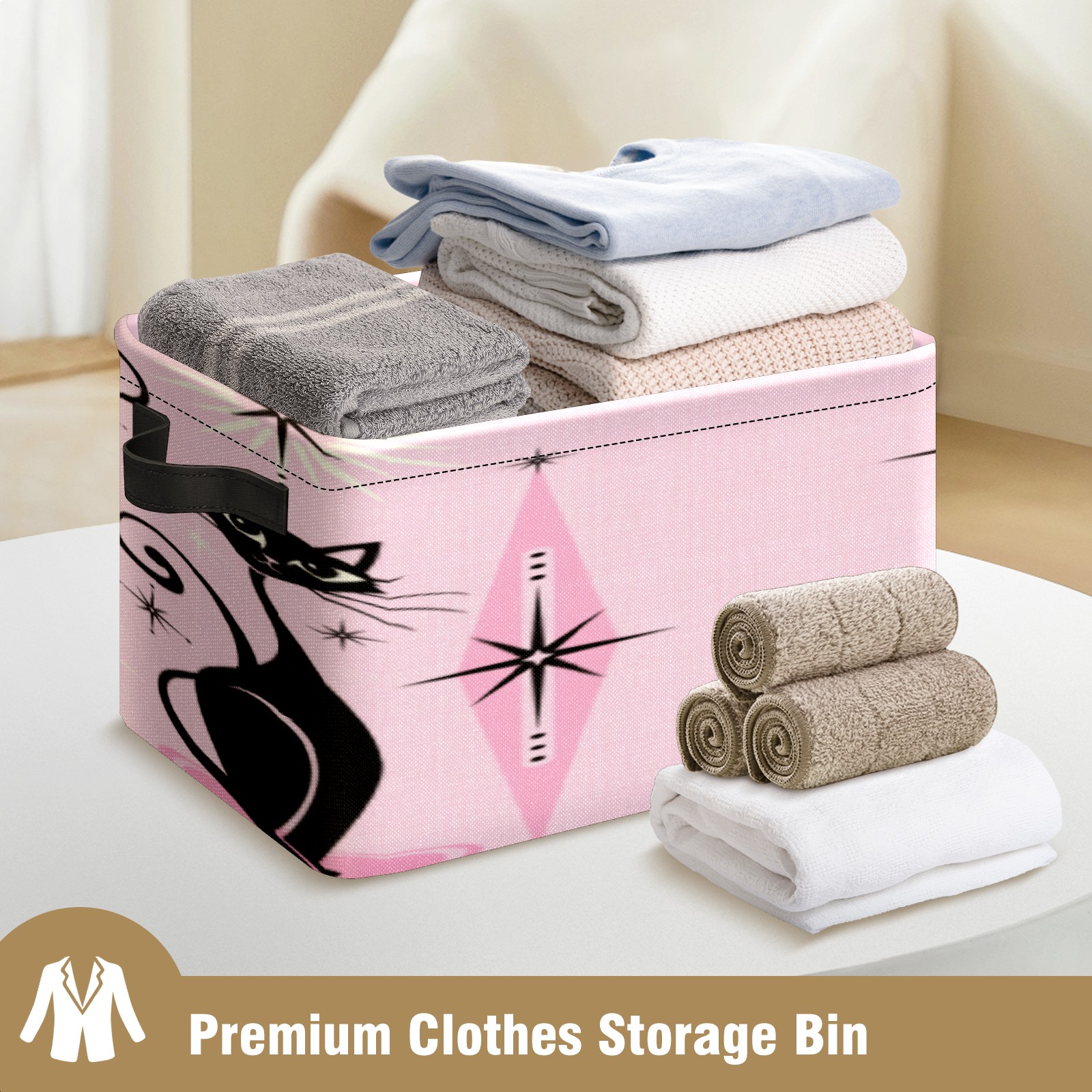 Collapsible 600D Oxford Storage Basket with Pink Romance Mid Century Meow Retro Atomic Cats - Metal Frame 10"x14"x8" Reinforced Handles, Multi-Purpose Organizer