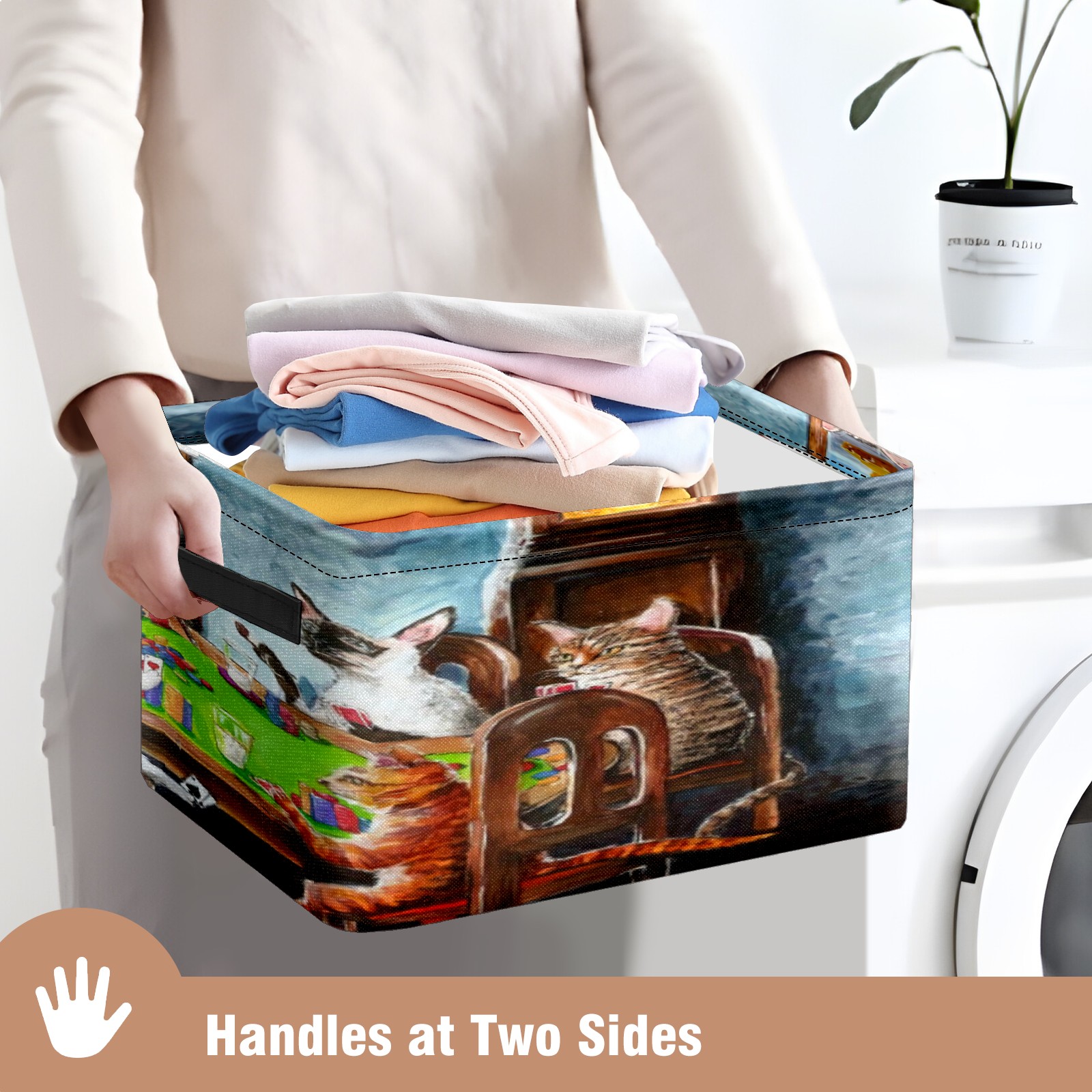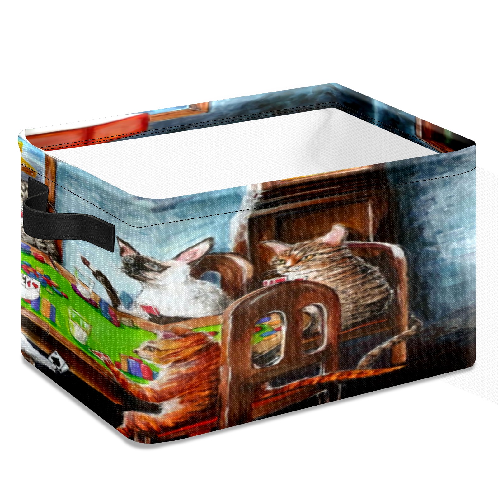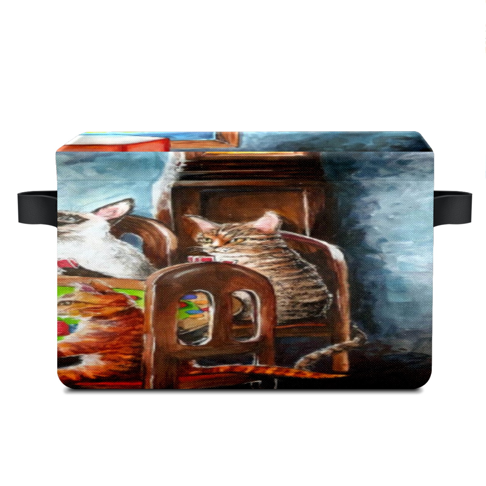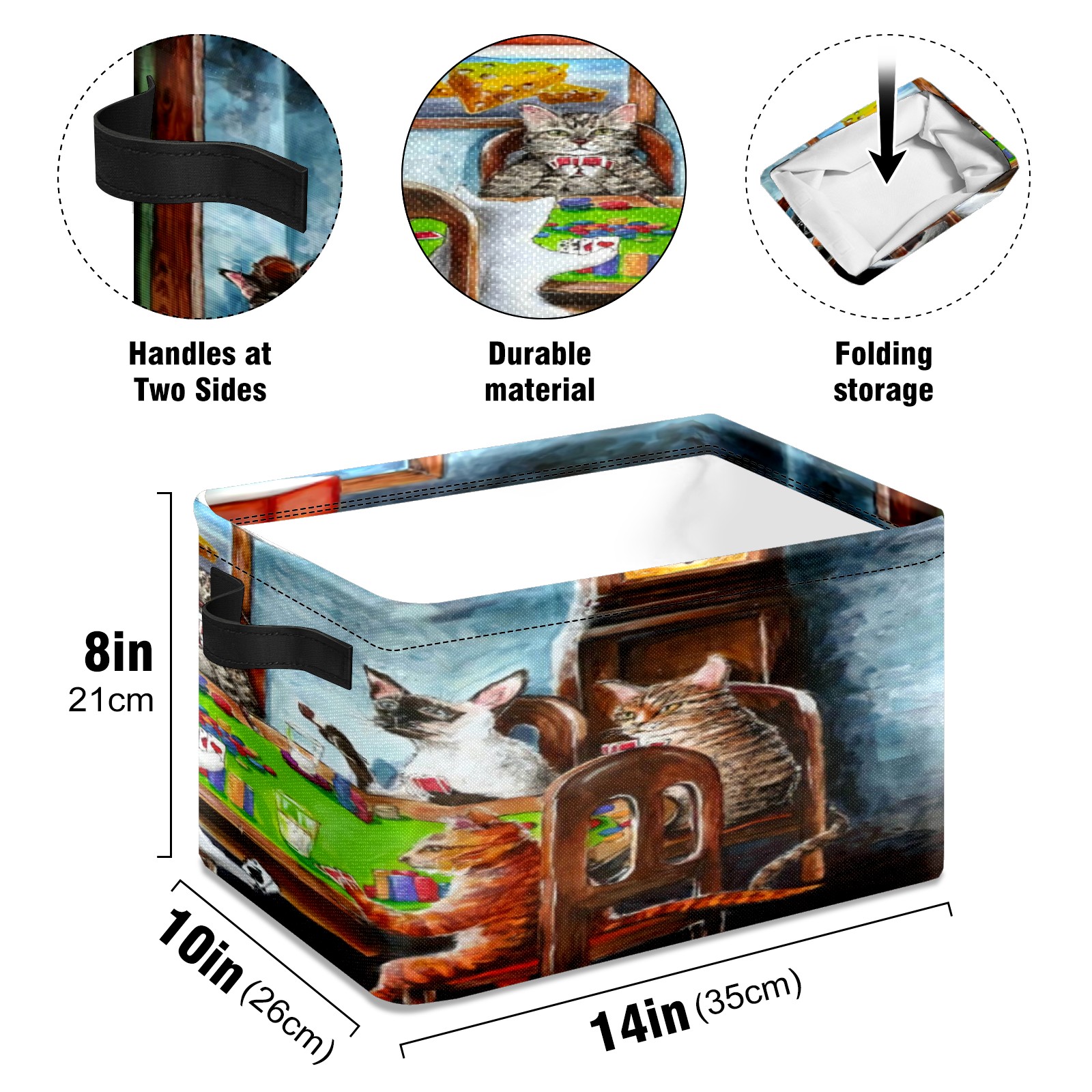 Collapsible 600D Oxford Storage Basket with Cat Playing Poker - Metal Frame 10"x14"x8" Reinforced Handles, Multi-Purpose Organizer