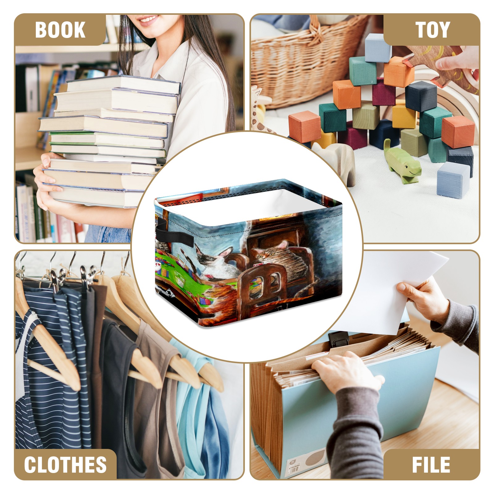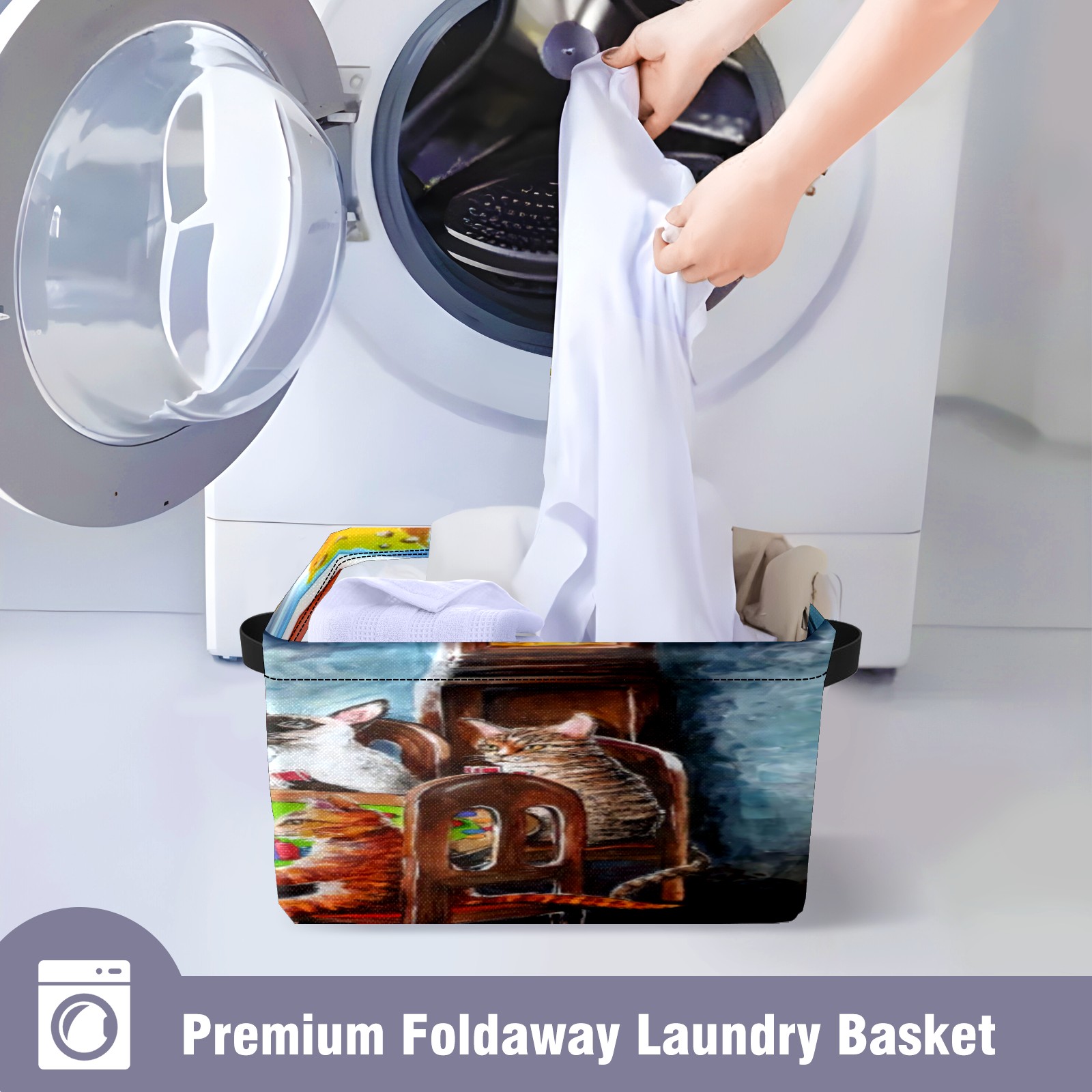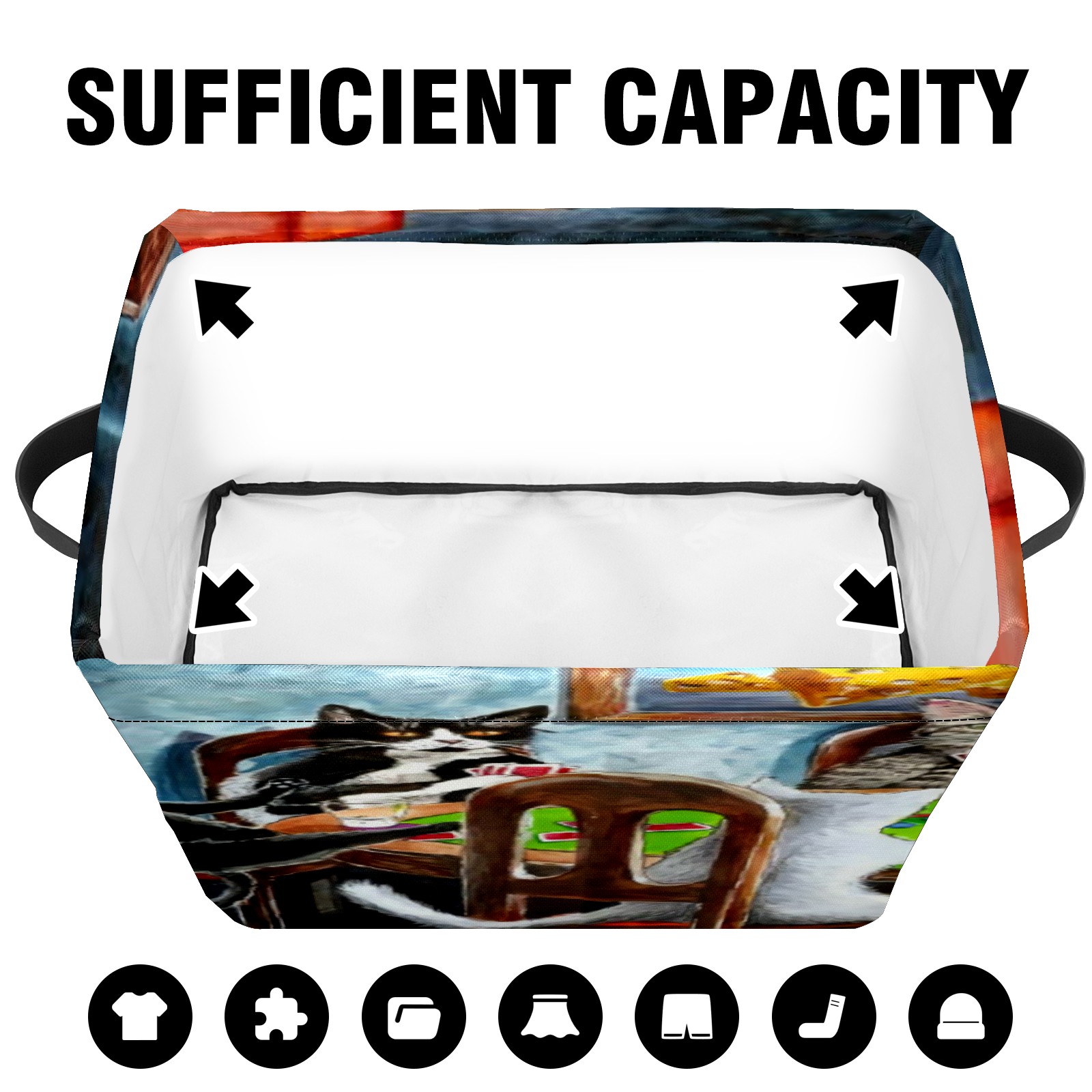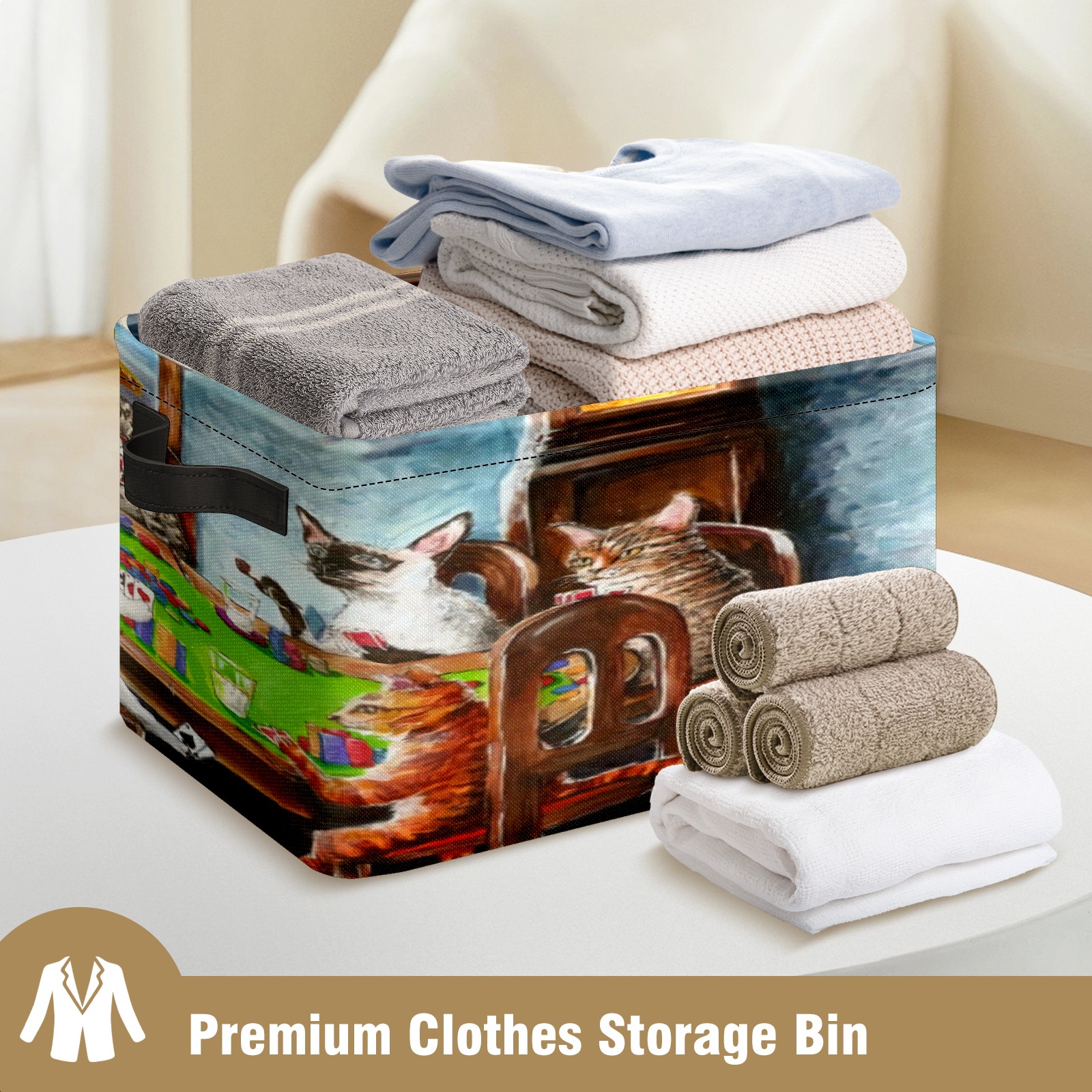 Collapsible 600D Oxford Storage Basket with Cat Playing Poker - Metal Frame 10"x14"x8" Reinforced Handles, Multi-Purpose Organizer