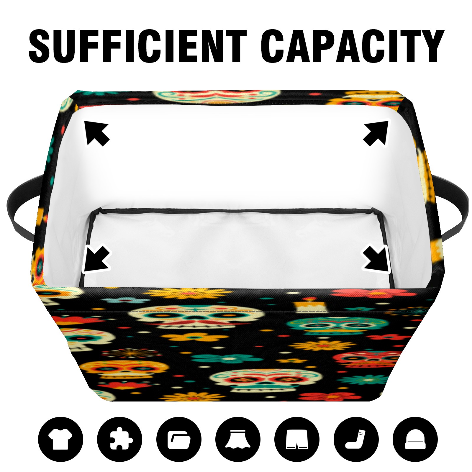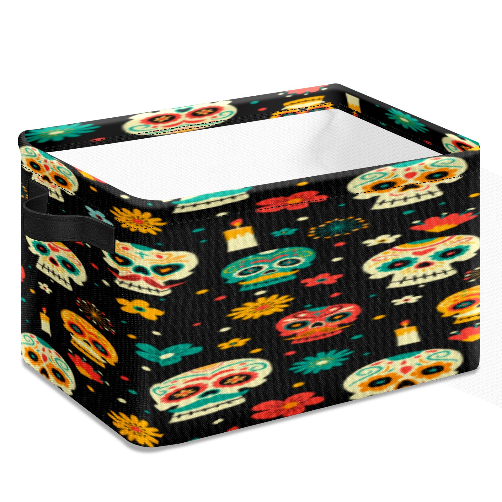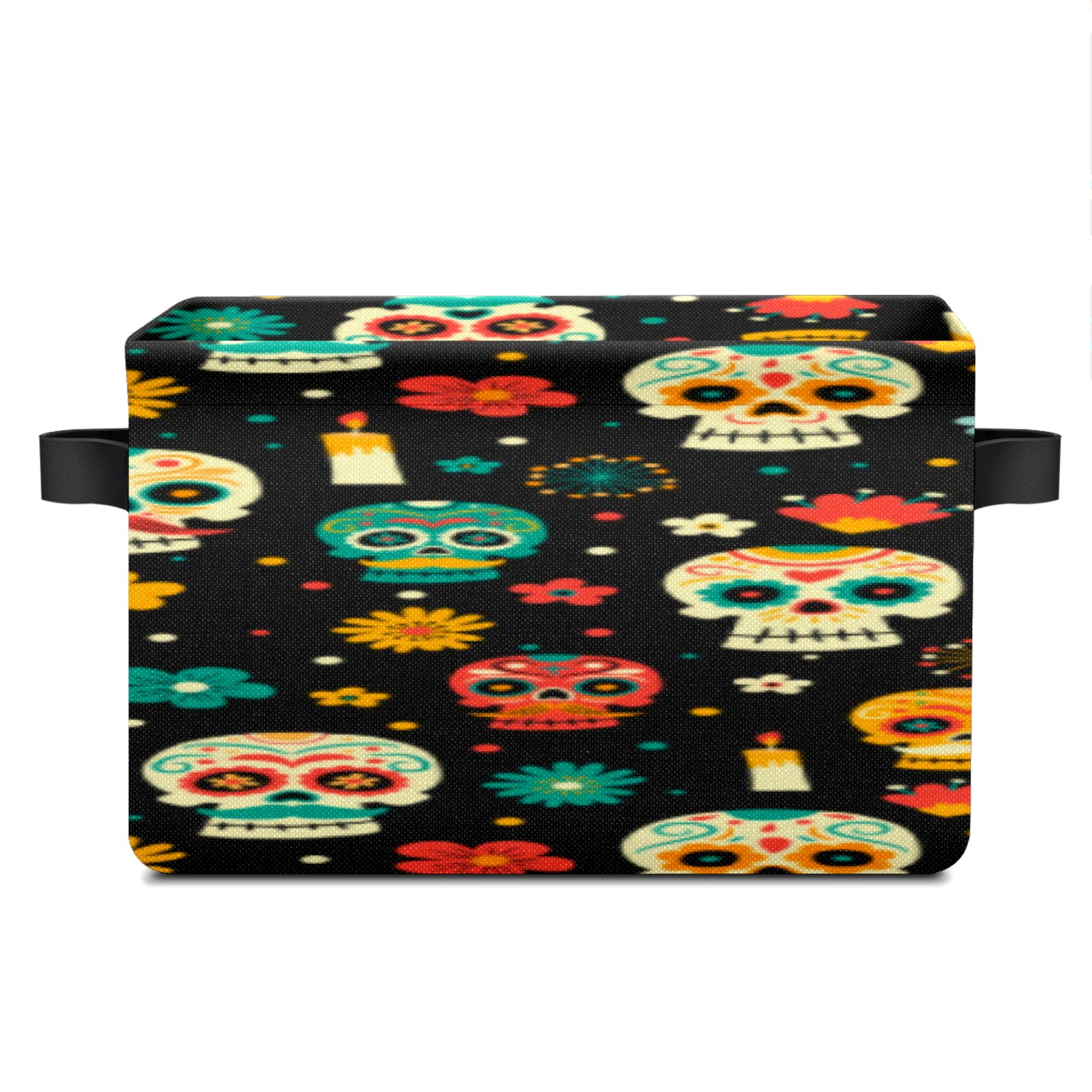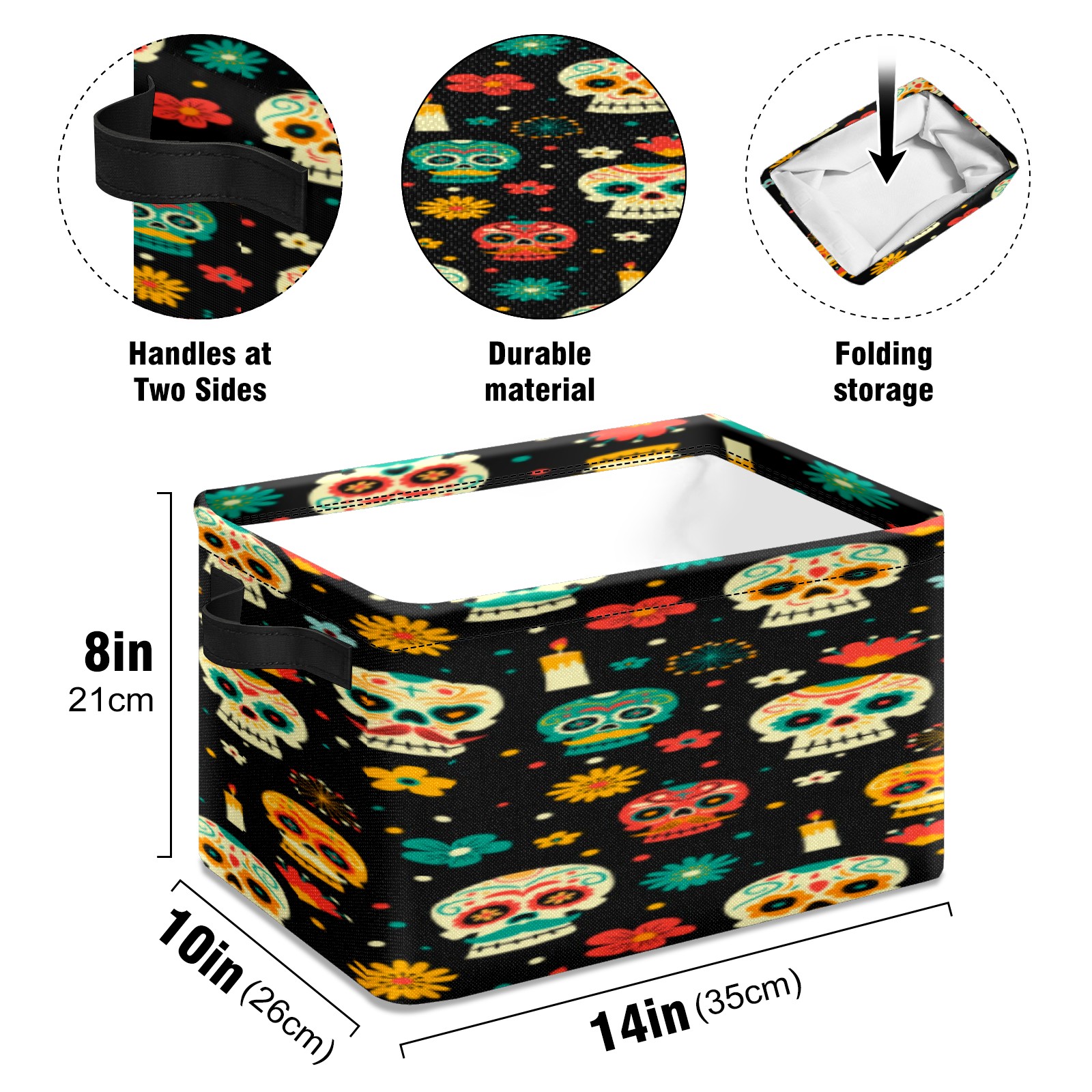 Collapsible 600D Oxford Storage Basket with Sugar Skulls - Metal Frame 10"x14"x8" Reinforced Handles, Multi-Purpose Organizer