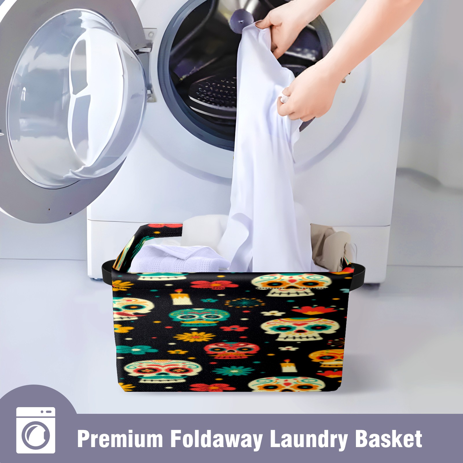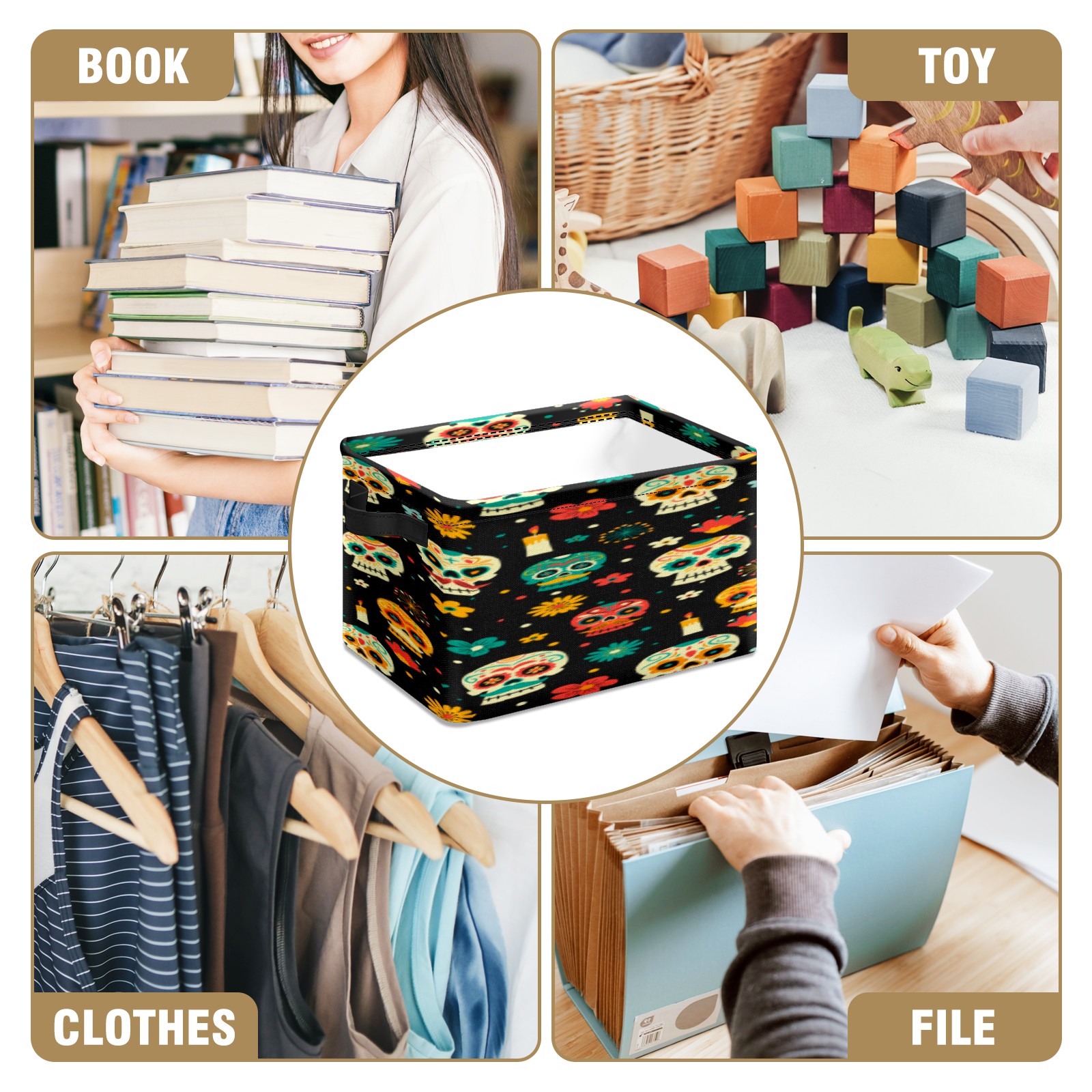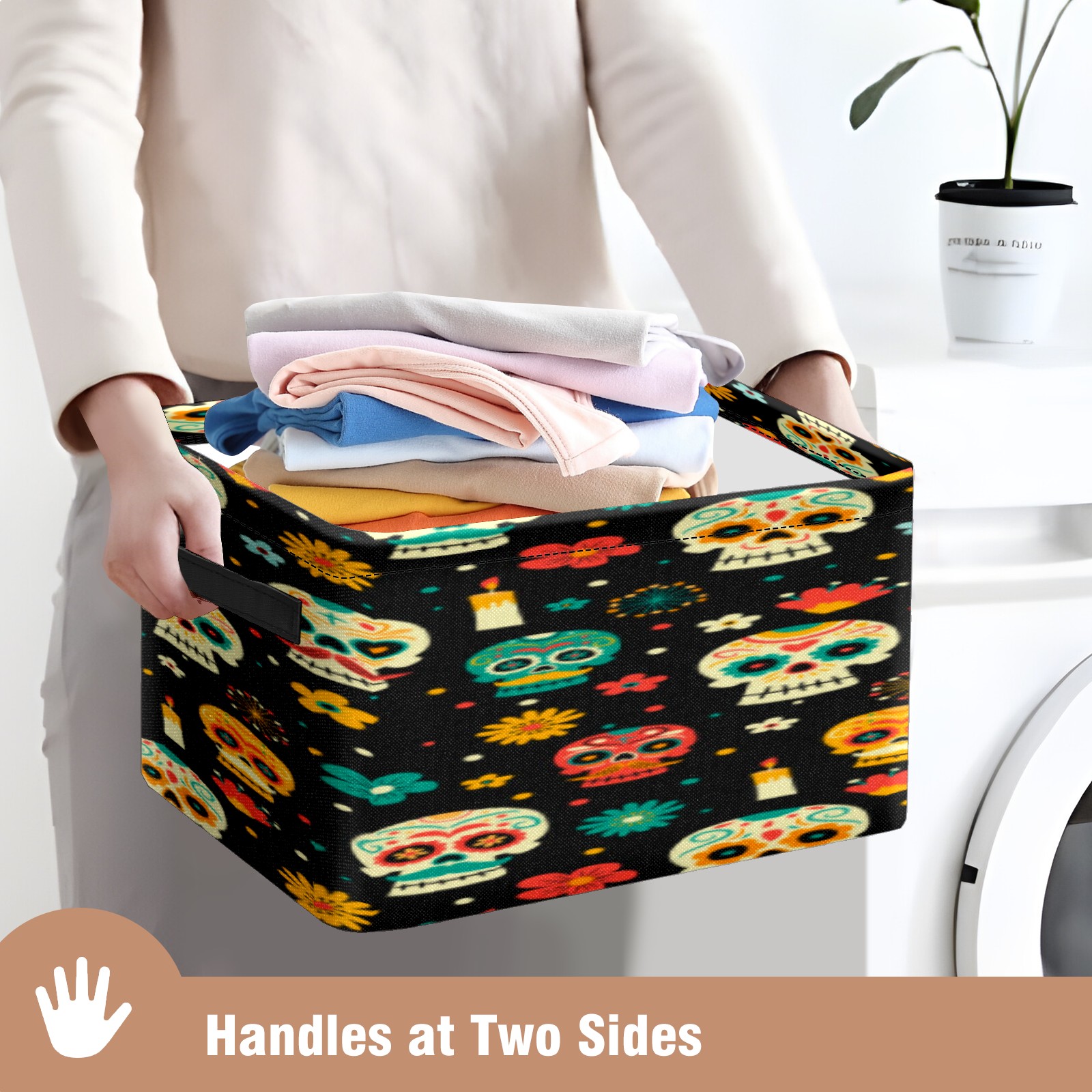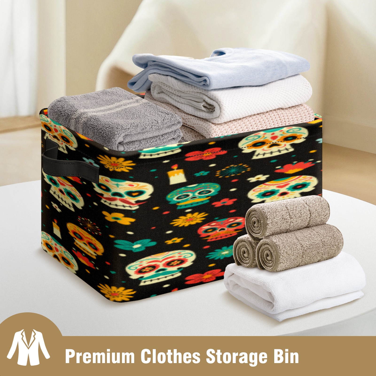 Collapsible 600D Oxford Storage Basket with Sugar Skulls - Metal Frame 10"x14"x8" Reinforced Handles, Multi-Purpose Organizer