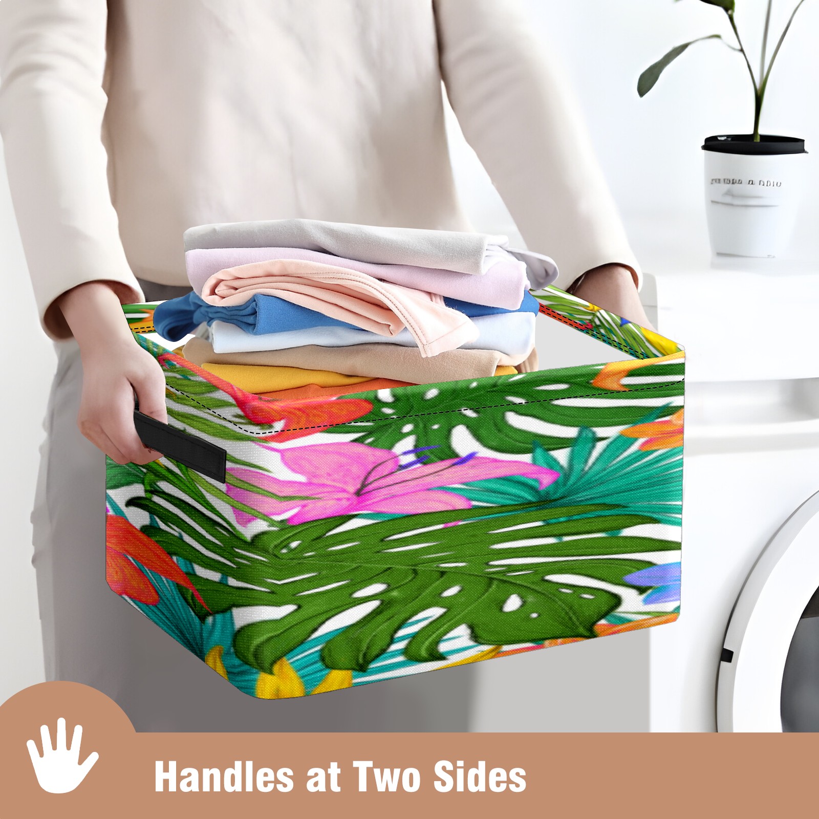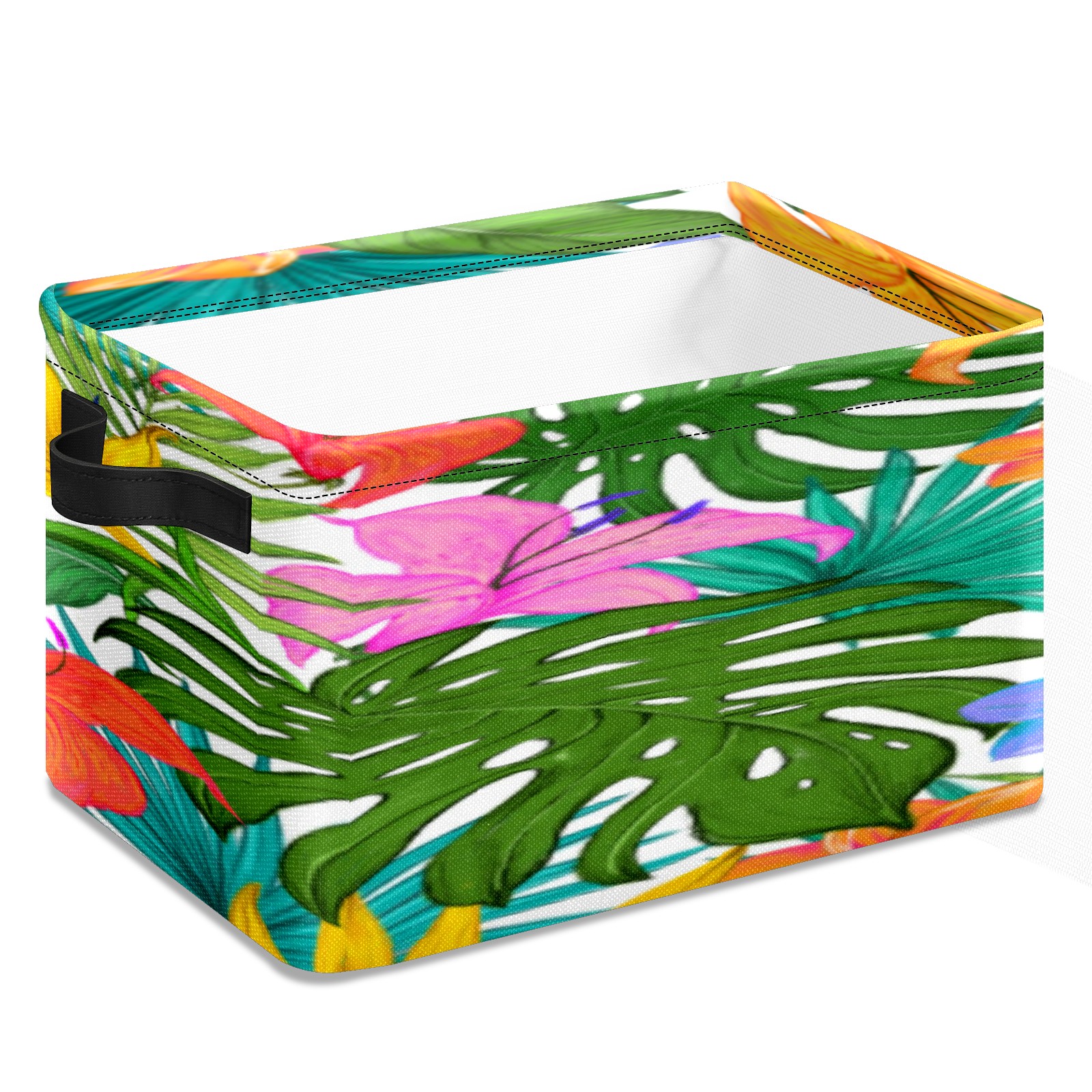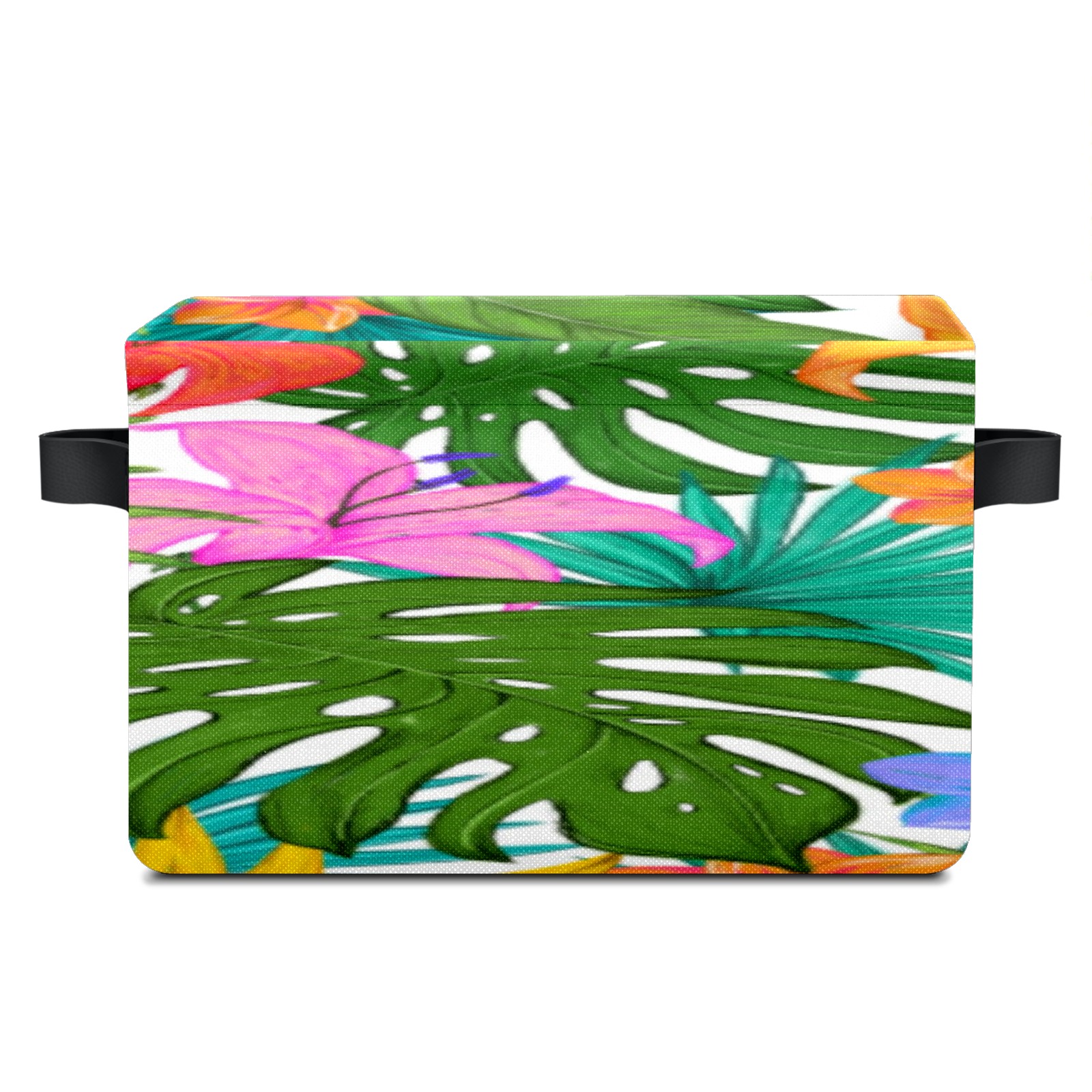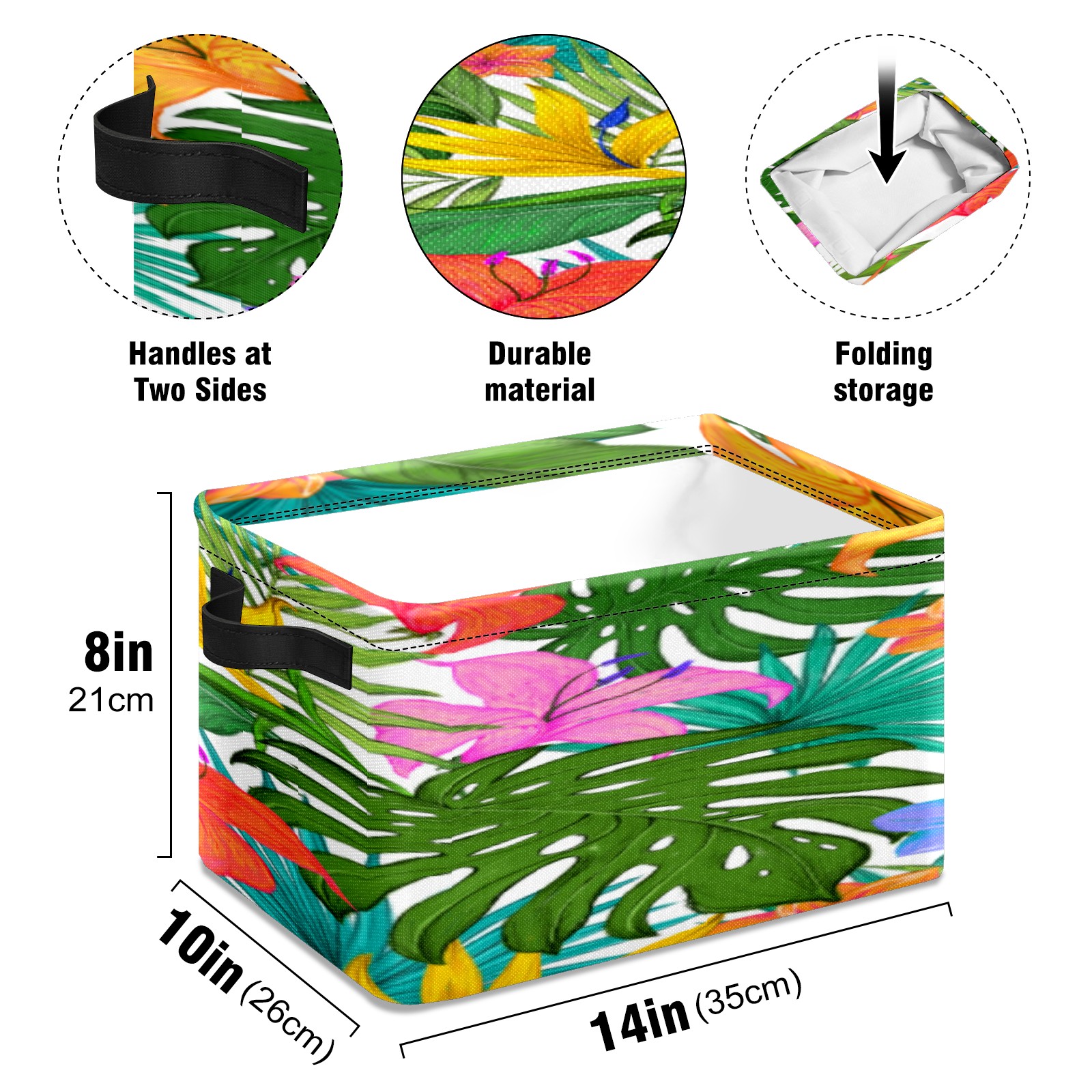 Collapsible 600D Oxford Storage Basket with Tropical Leaves Flower - Metal Frame 10"x14"x8" Reinforced Handles, Multi-Purpose Organizer
