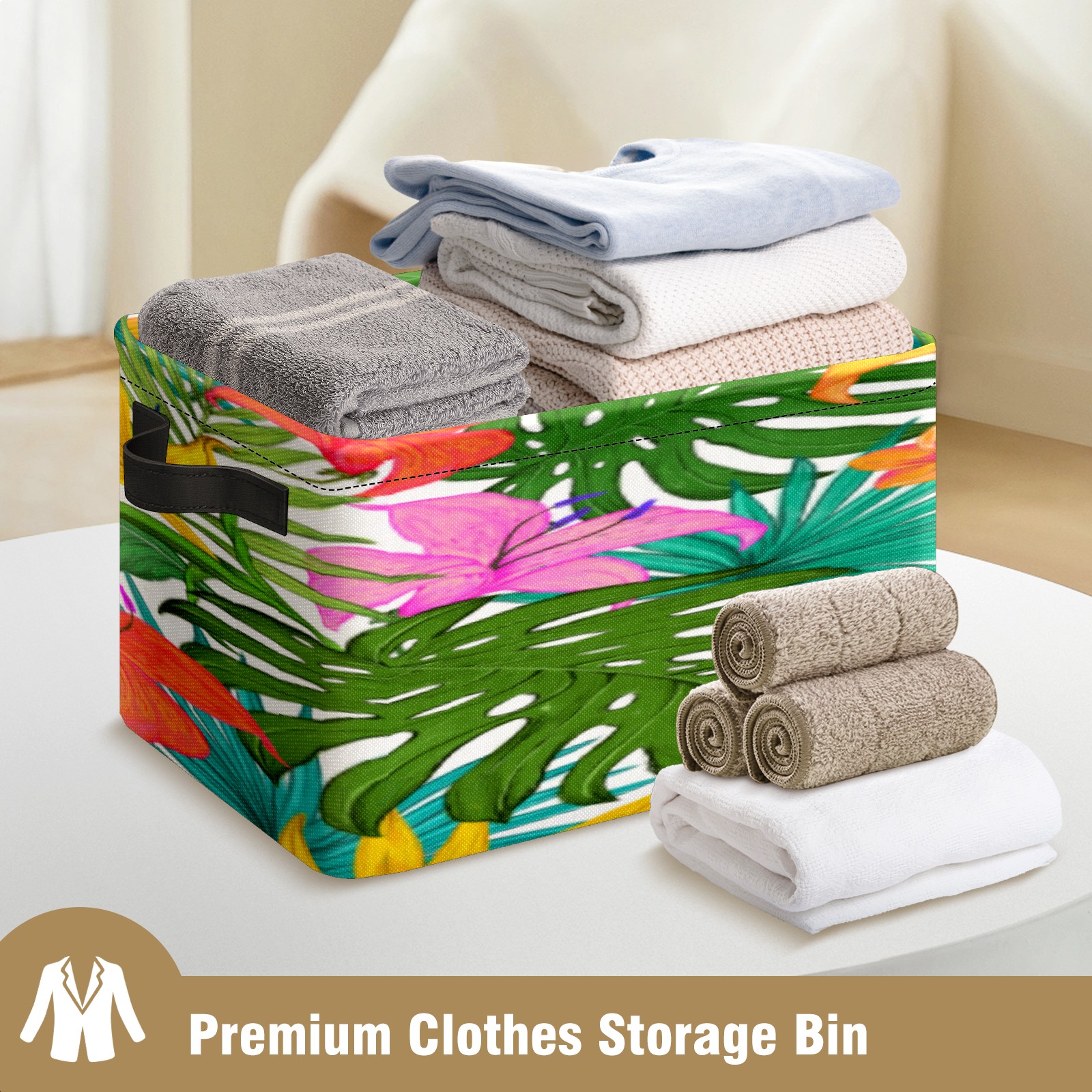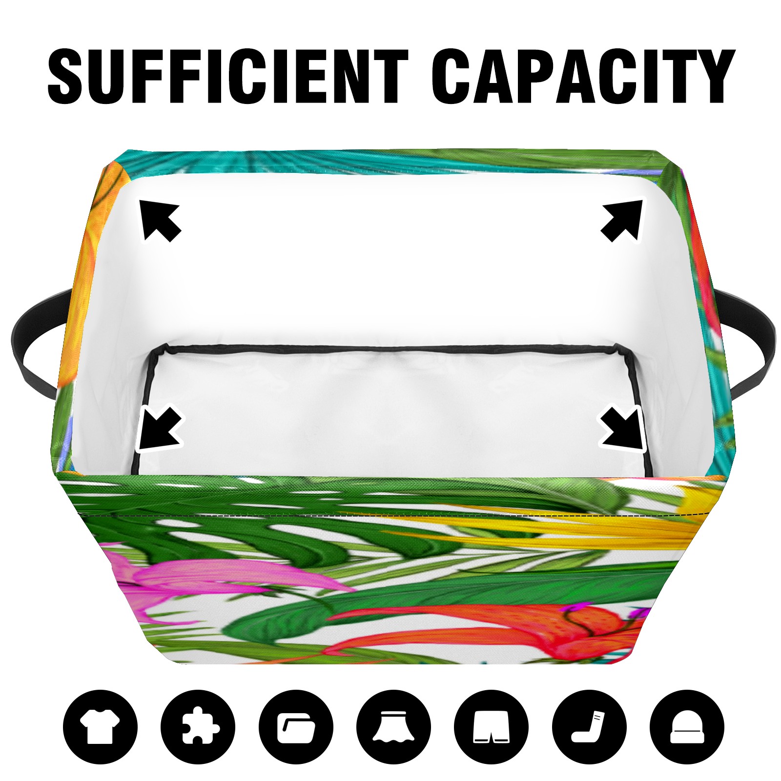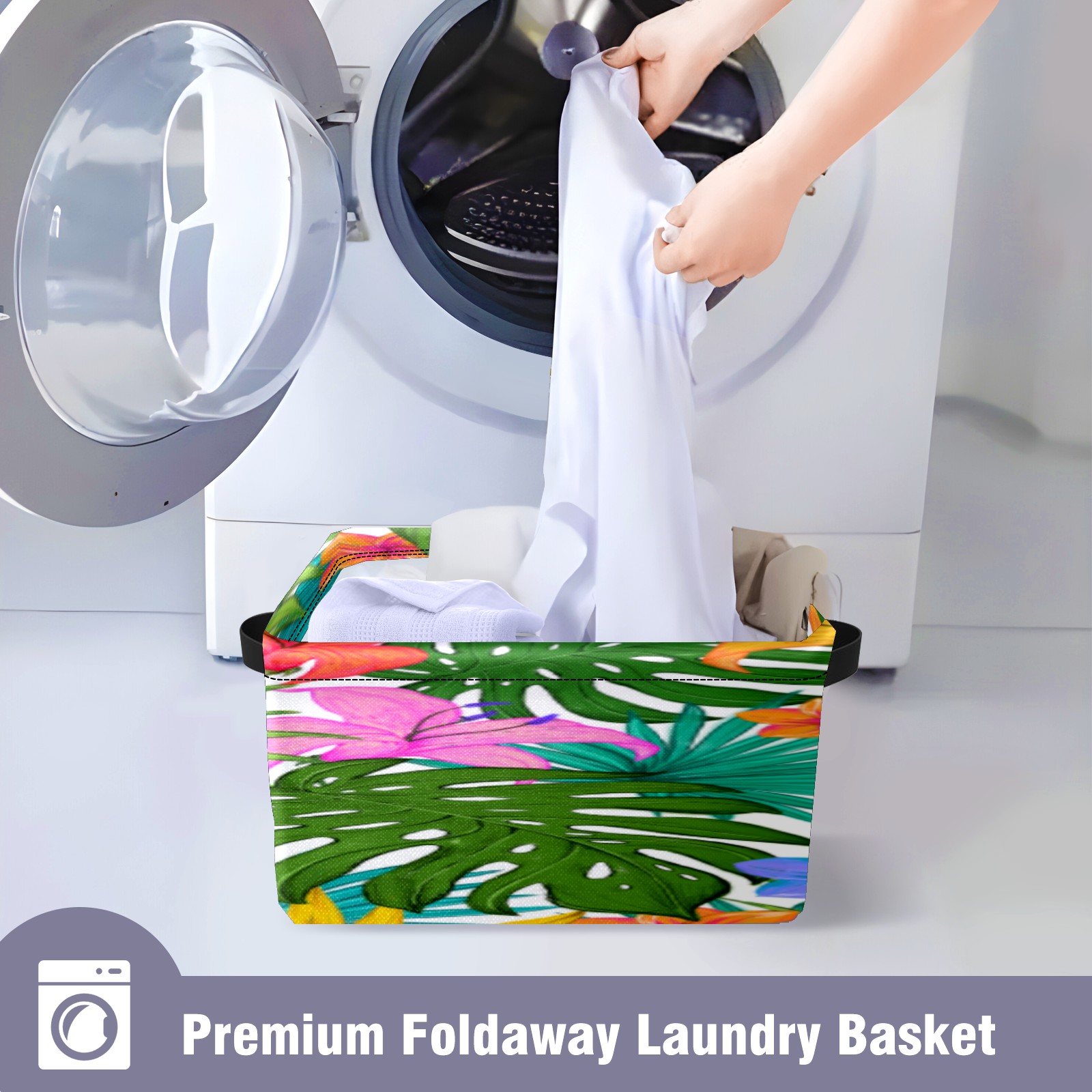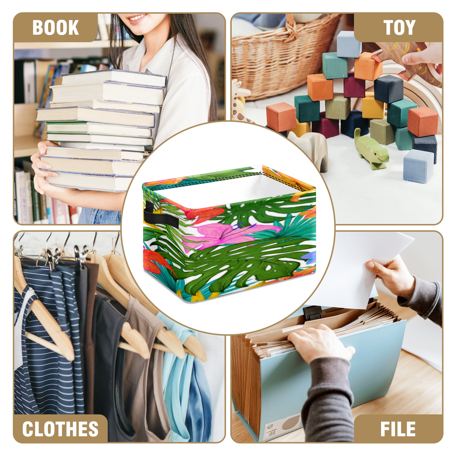 Collapsible 600D Oxford Storage Basket with Tropical Leaves Flower - Metal Frame 10"x14"x8" Reinforced Handles, Multi-Purpose Organizer