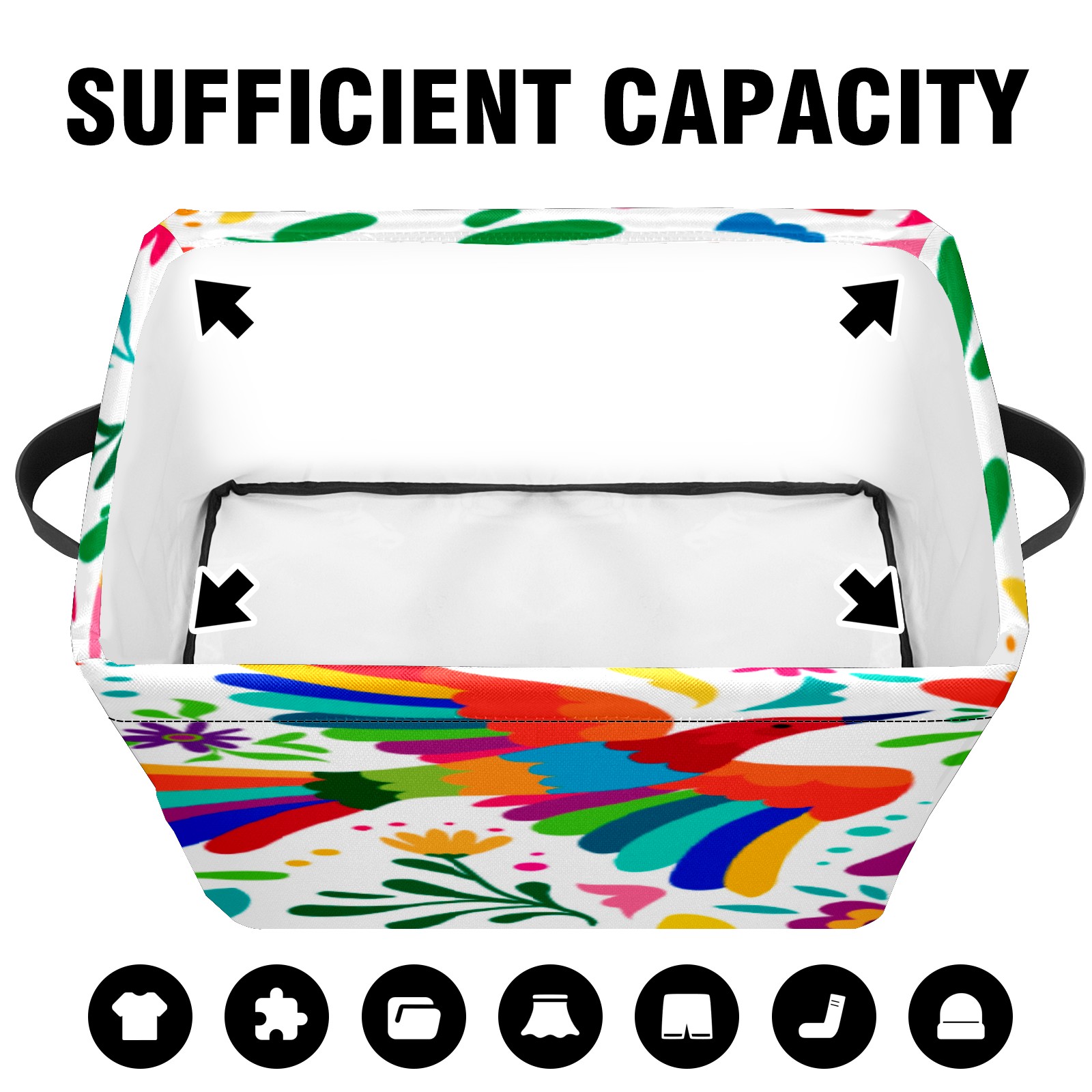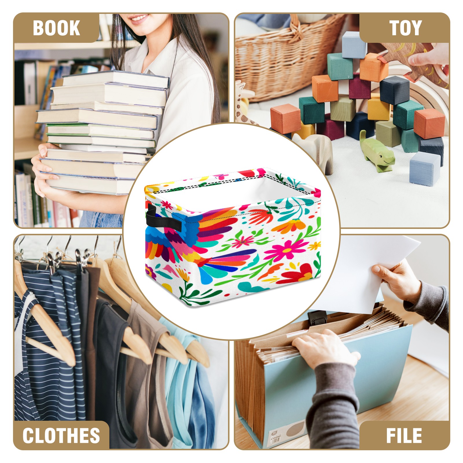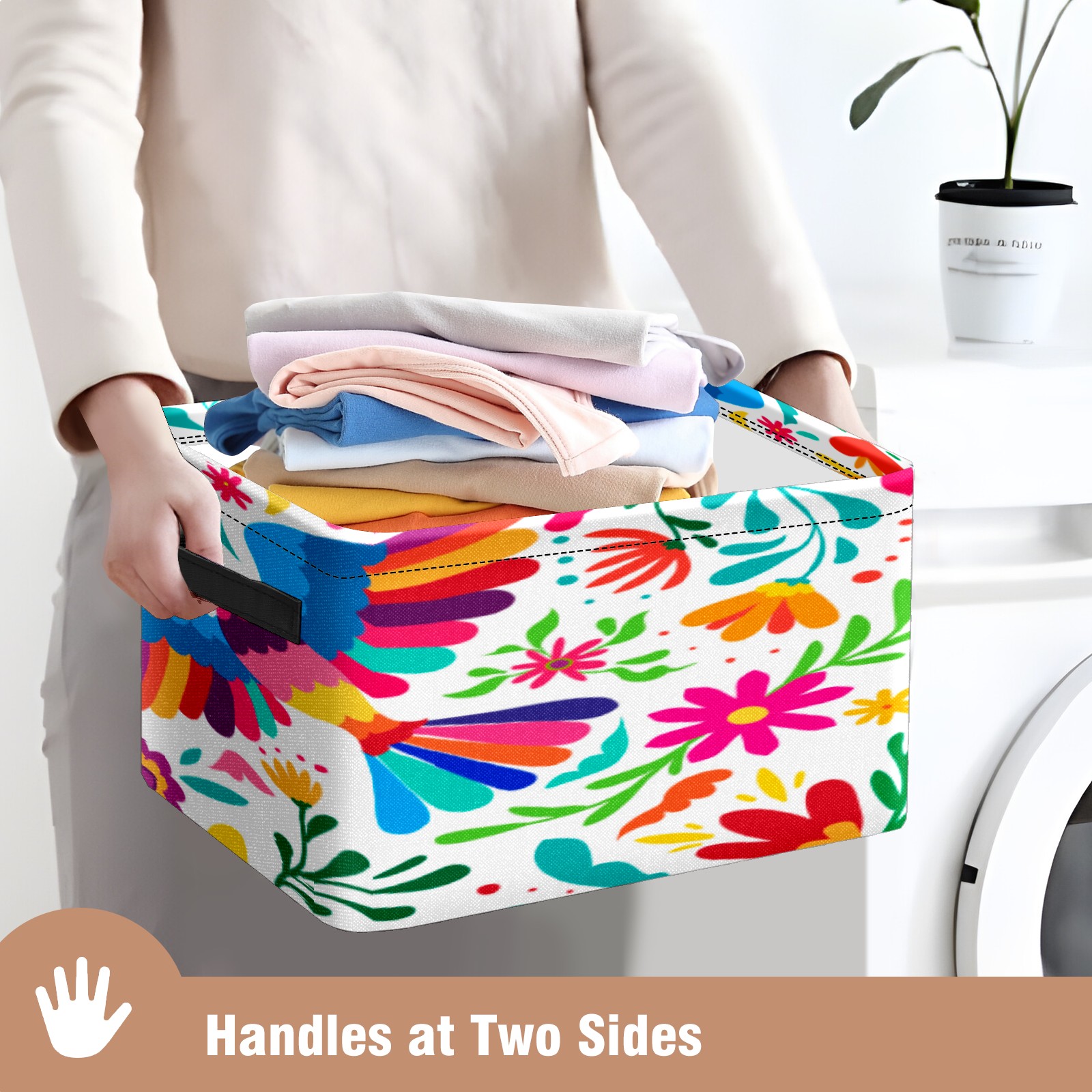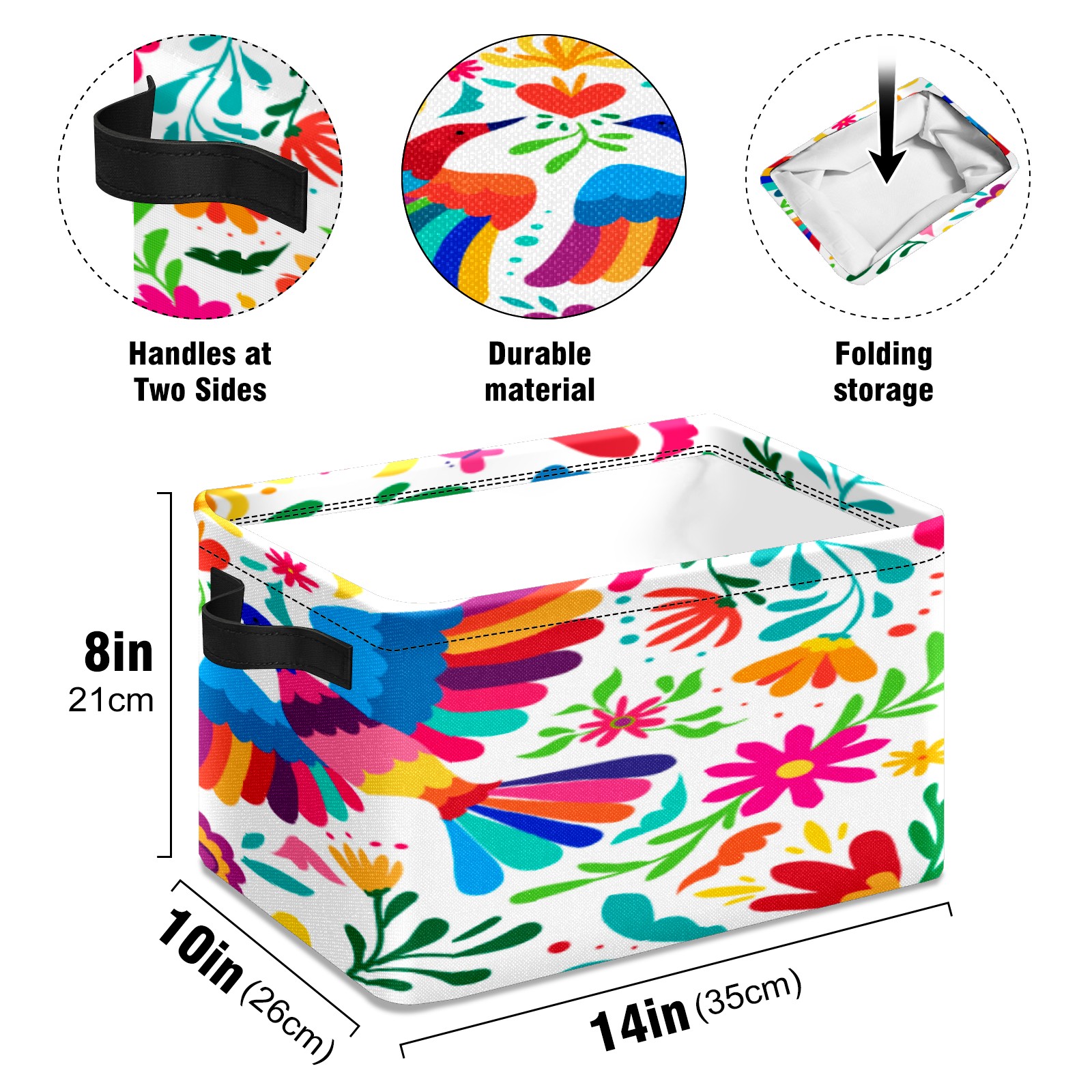 Collapsible 600D Oxford Storage Basket with Mexican Embroidery Birds - Metal Frame 10"x14"x8" Reinforced Handles, Multi-Purpose Organizer