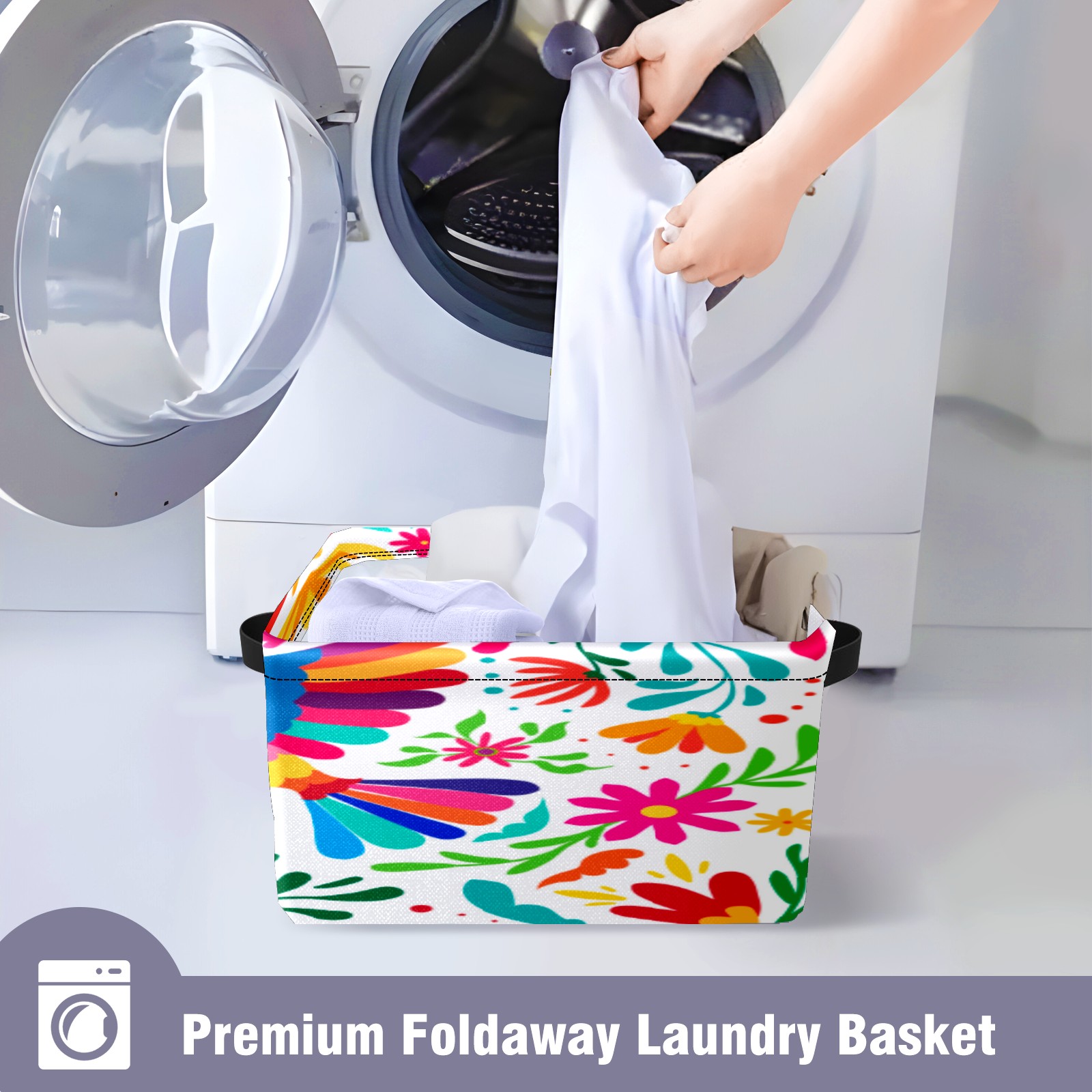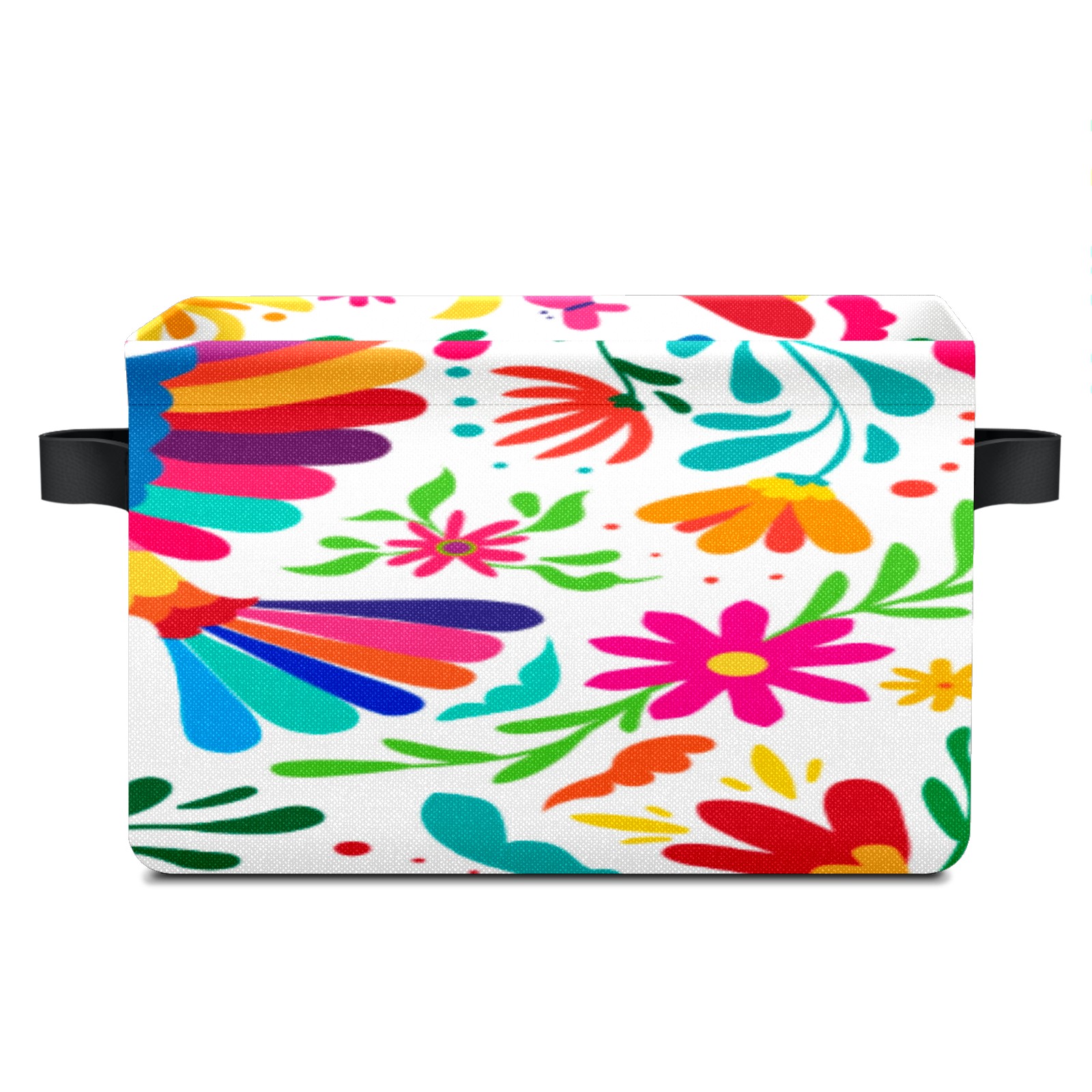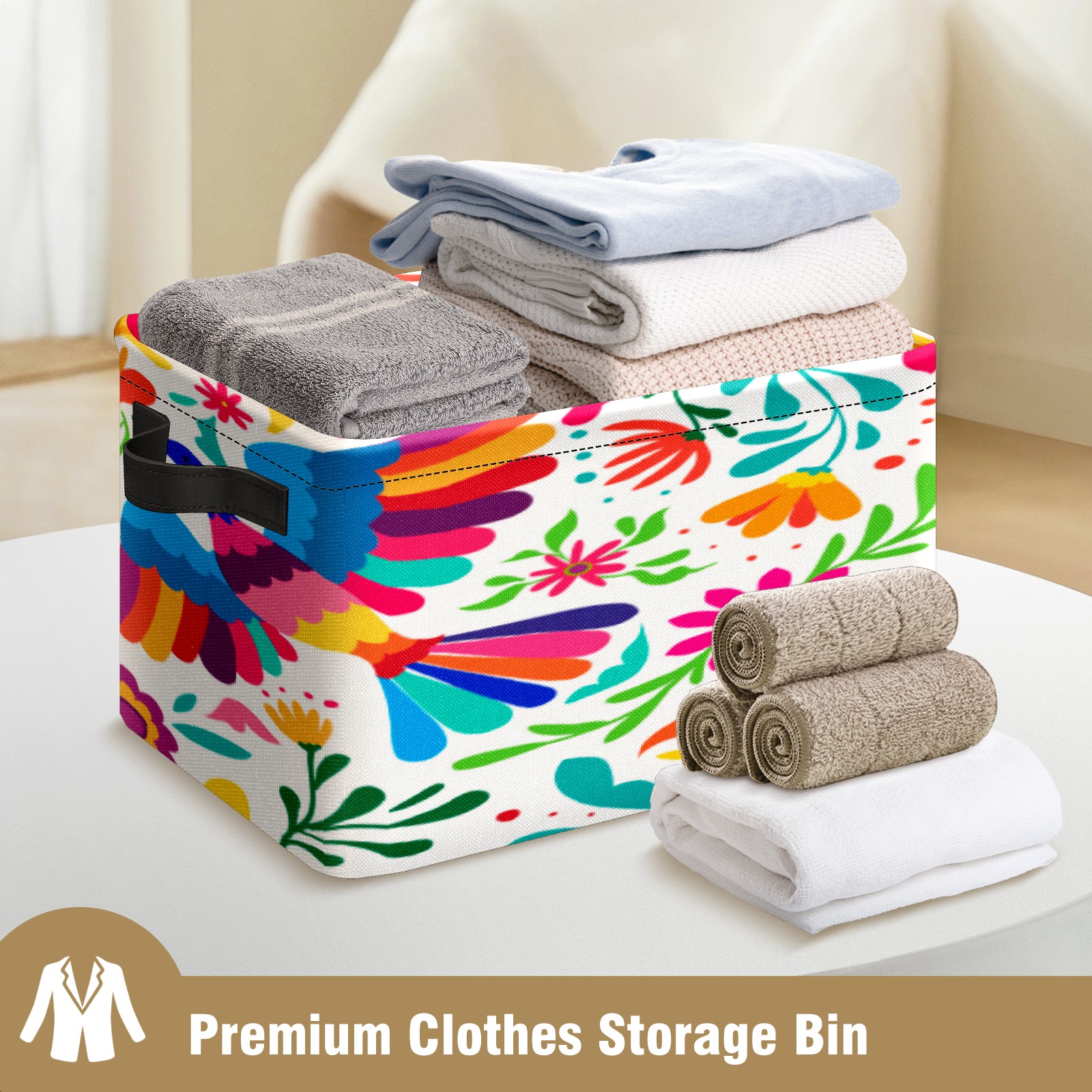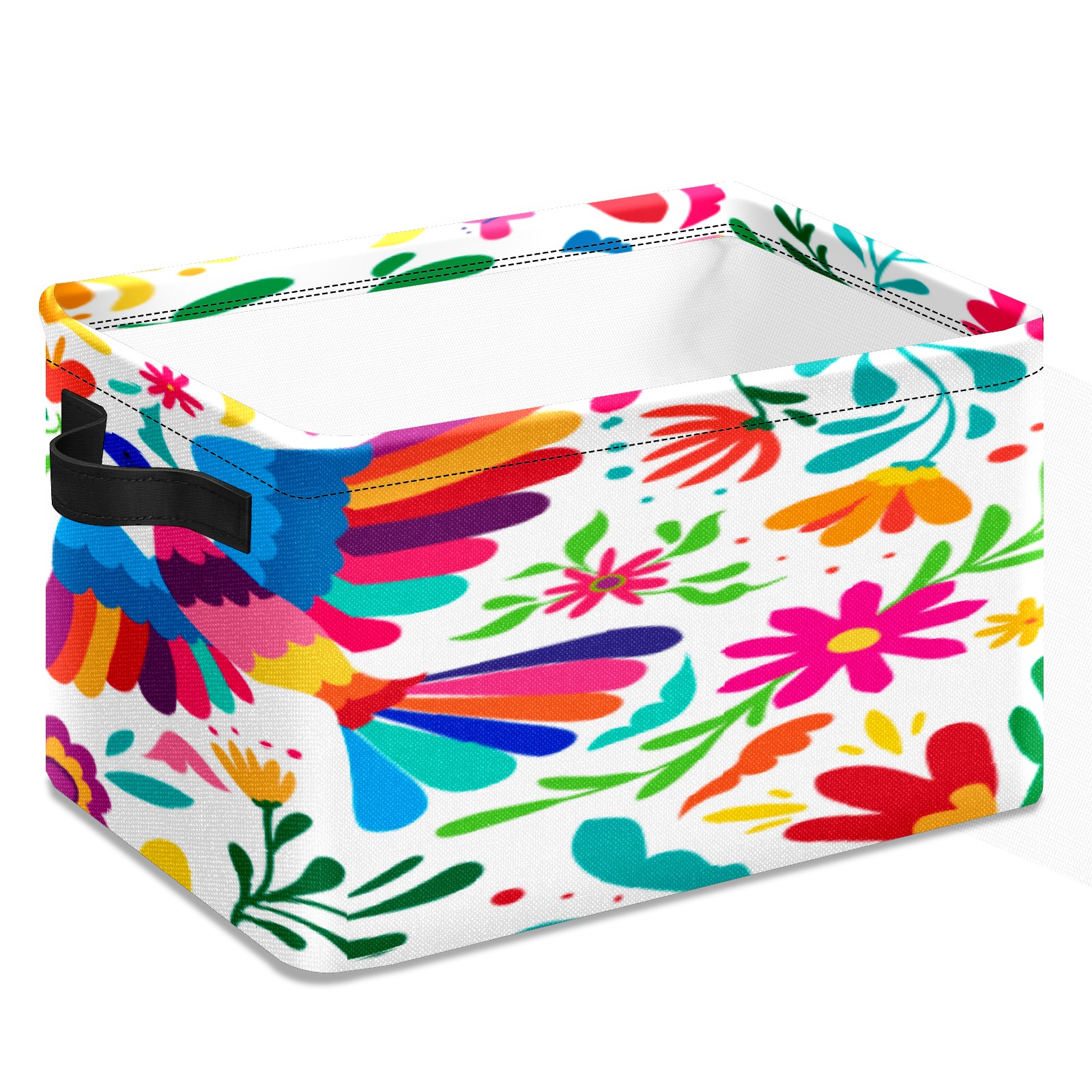 Collapsible 600D Oxford Storage Basket with Mexican Embroidery Birds - Metal Frame 10"x14"x8" Reinforced Handles, Multi-Purpose Organizer