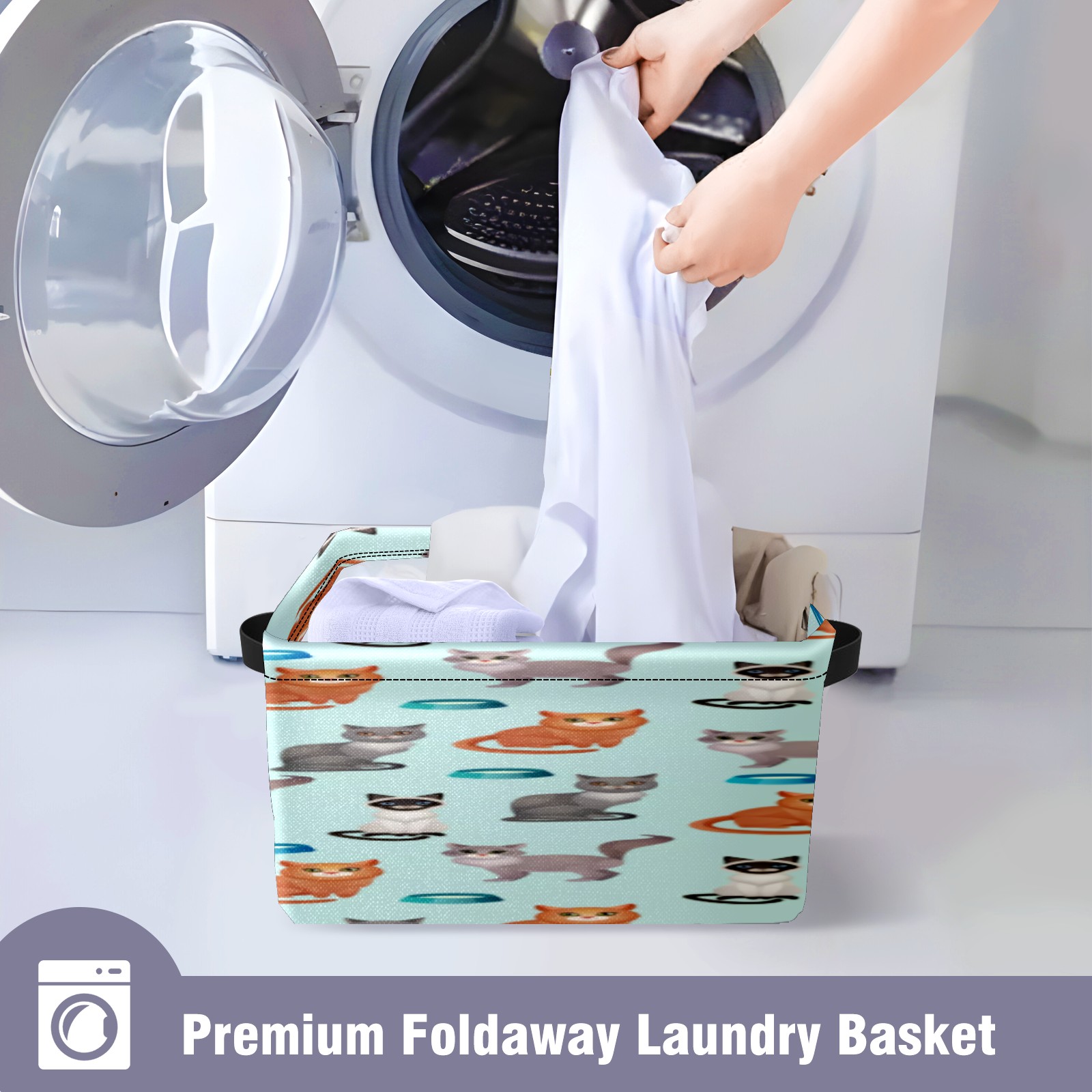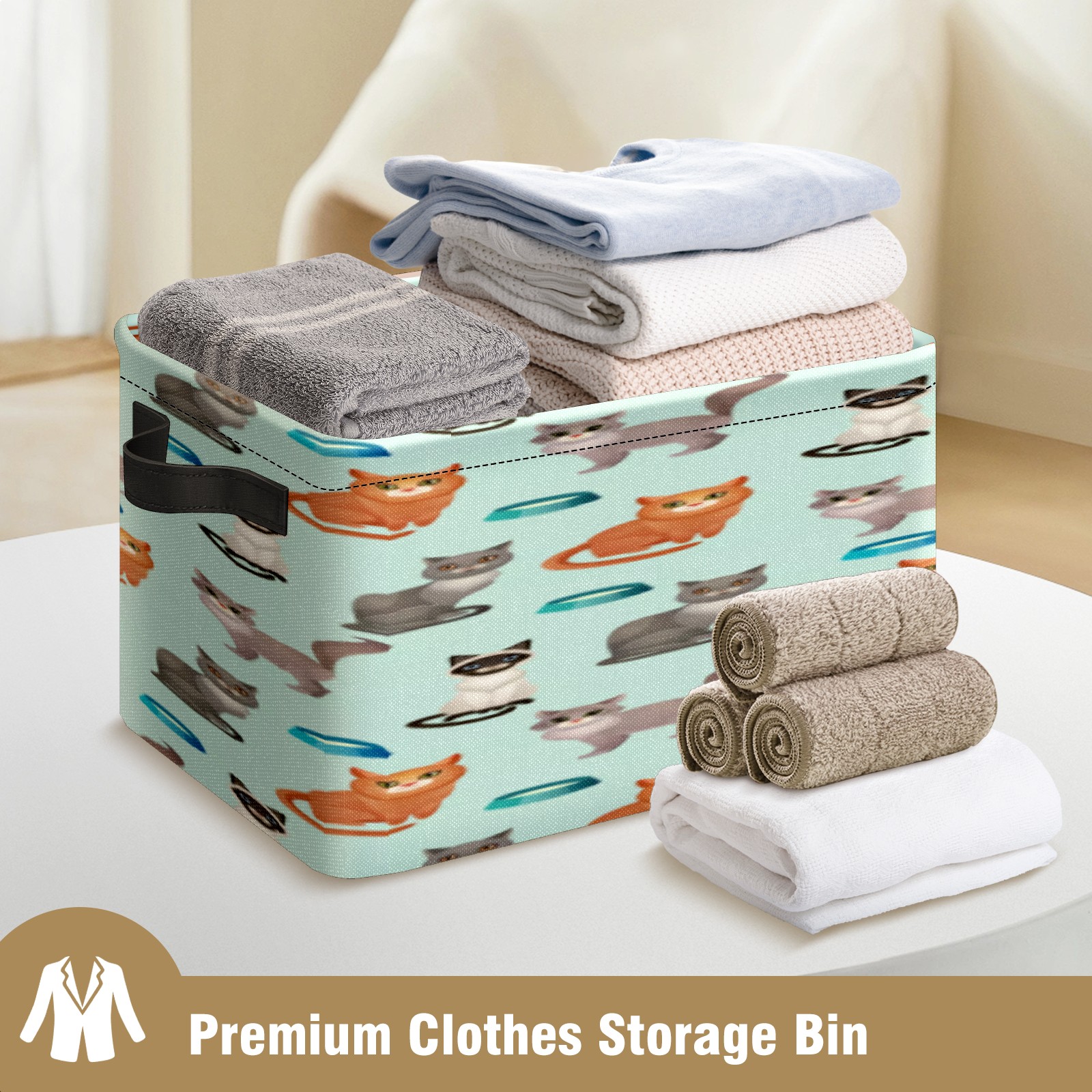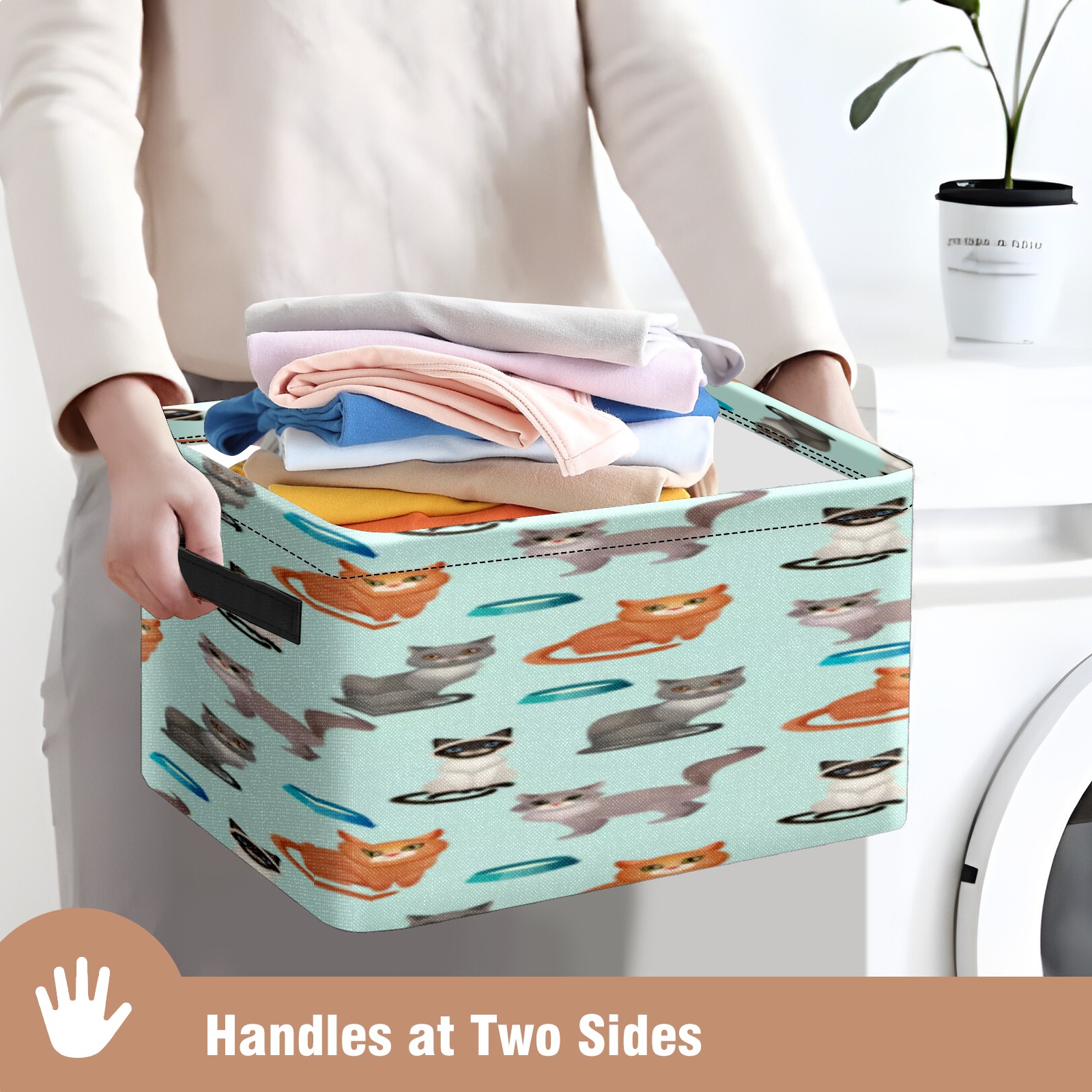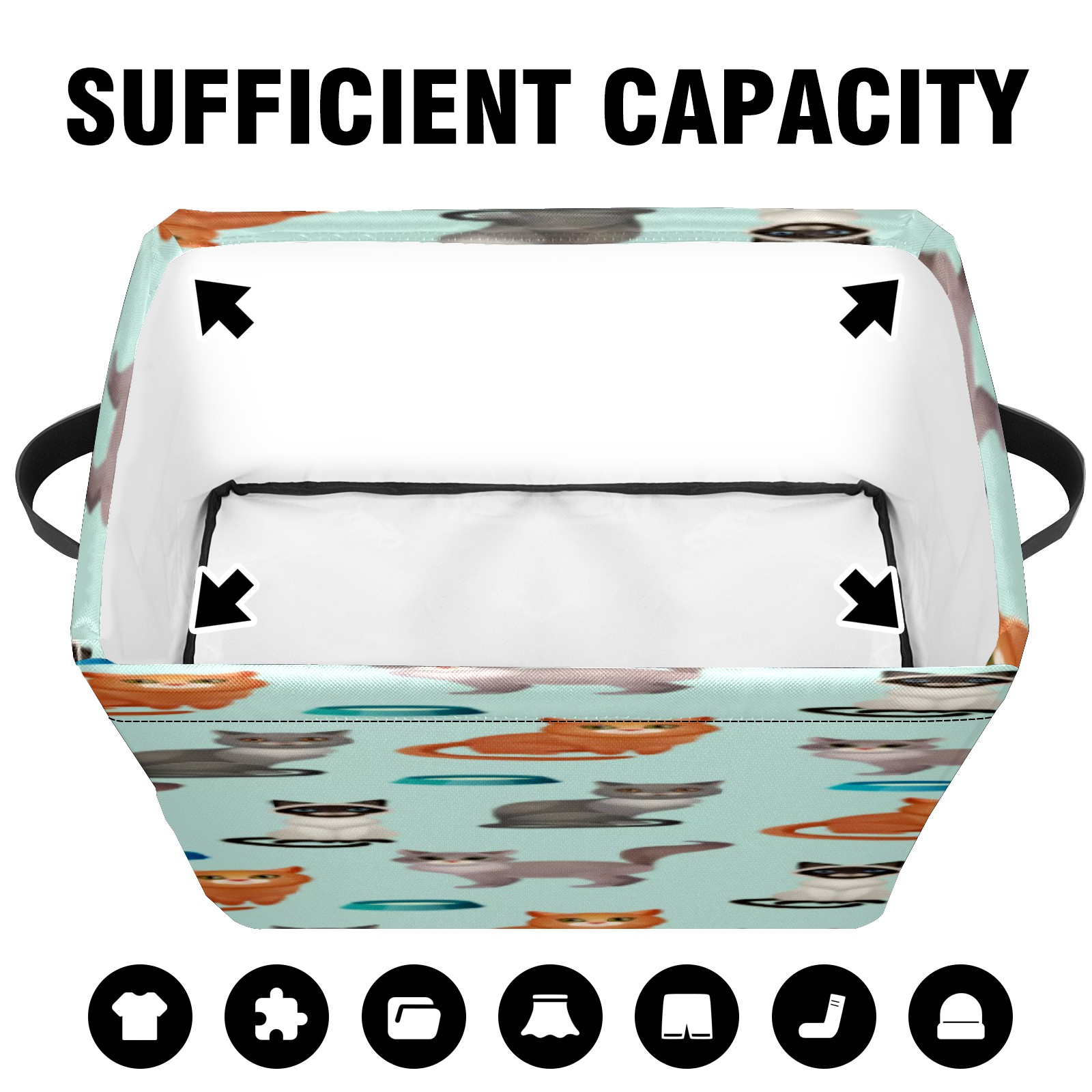 Collapsible 600D Oxford Storage Basket with Cartoon Cats - Metal Frame 10"x14"x8" Reinforced Handles, Multi-Purpose Organizer