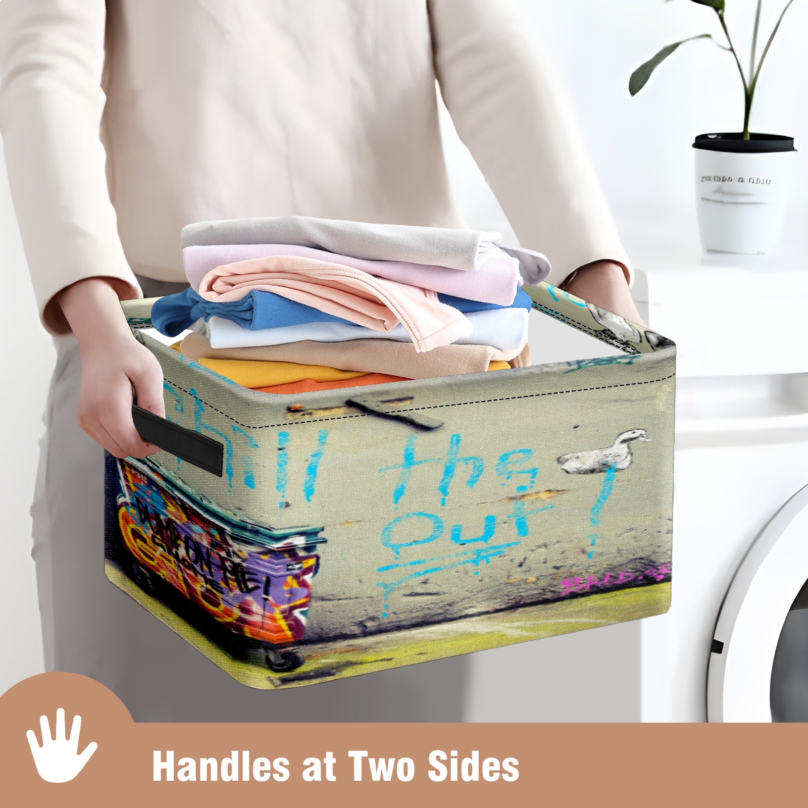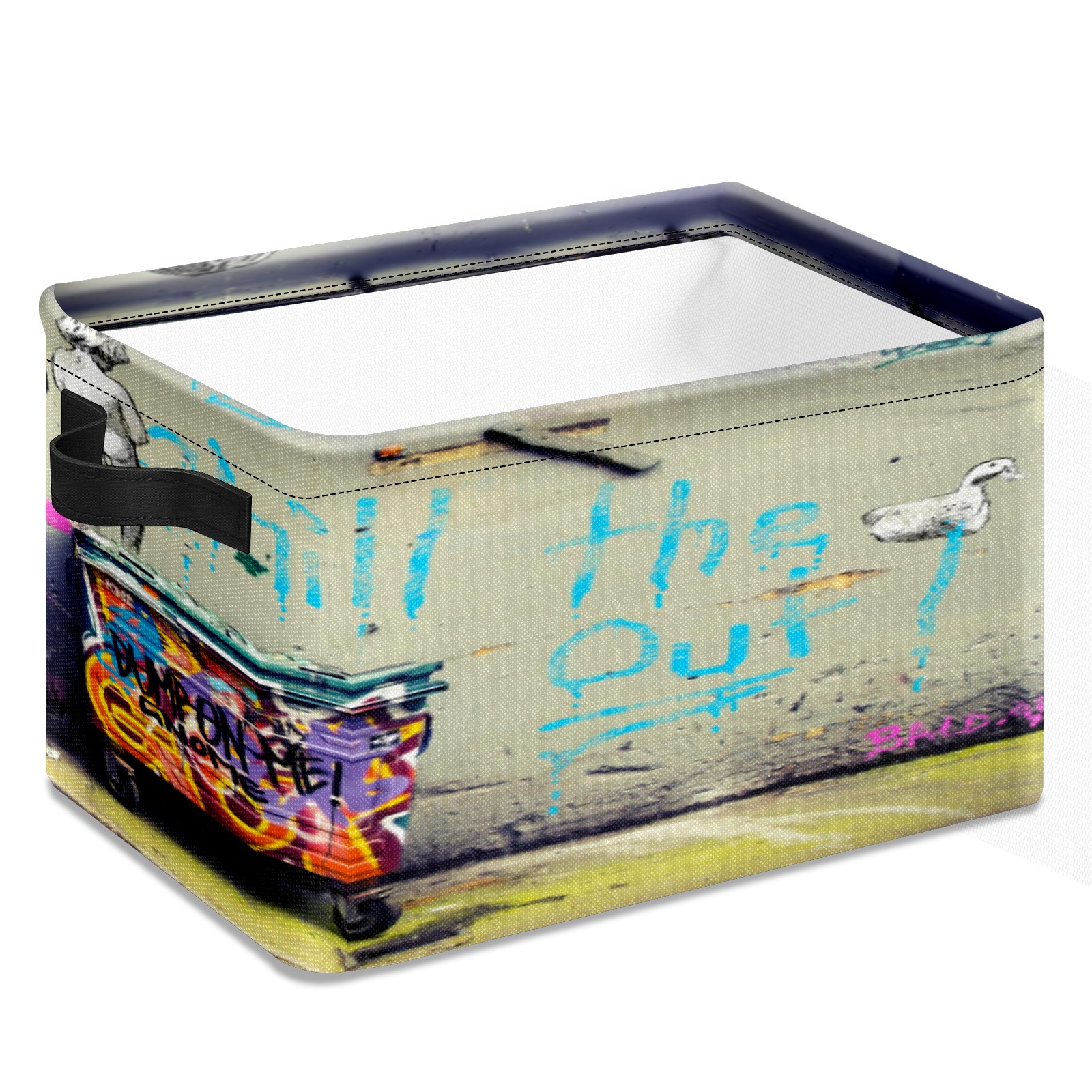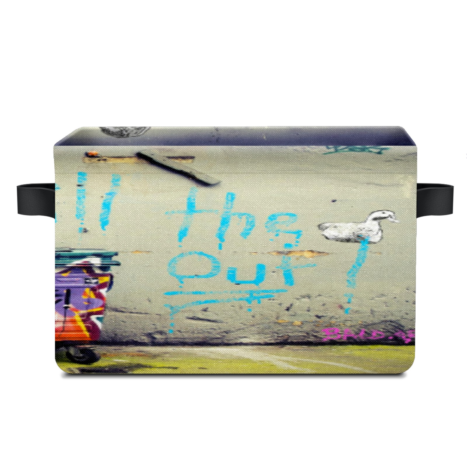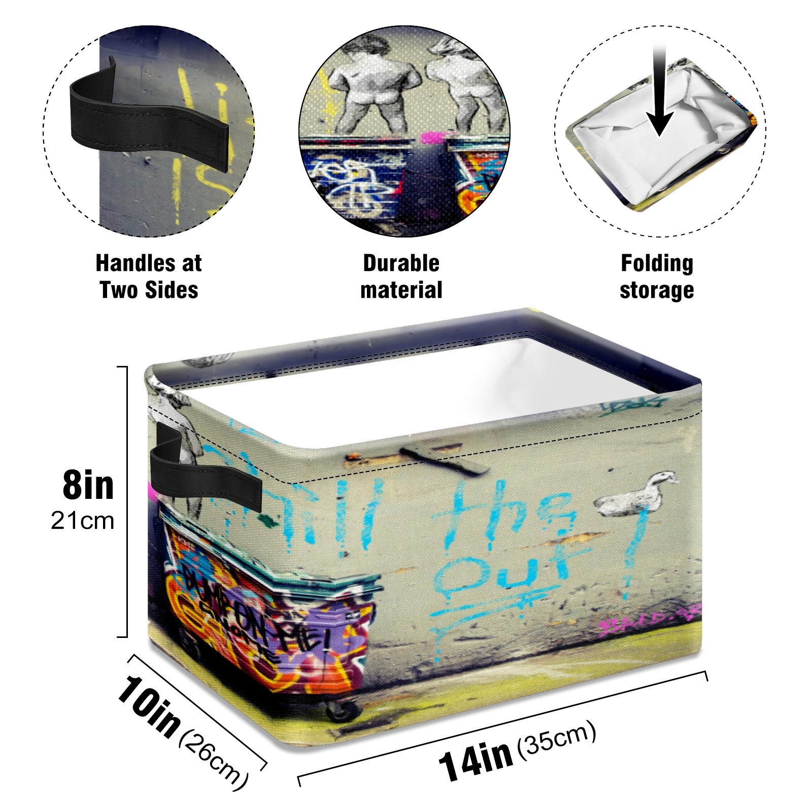 Collapsible 600D Oxford Storage Basket with Banksy Stree Art - Metal Frame 10"x14"x8" Reinforced Handles, Multi-Purpose Organizer