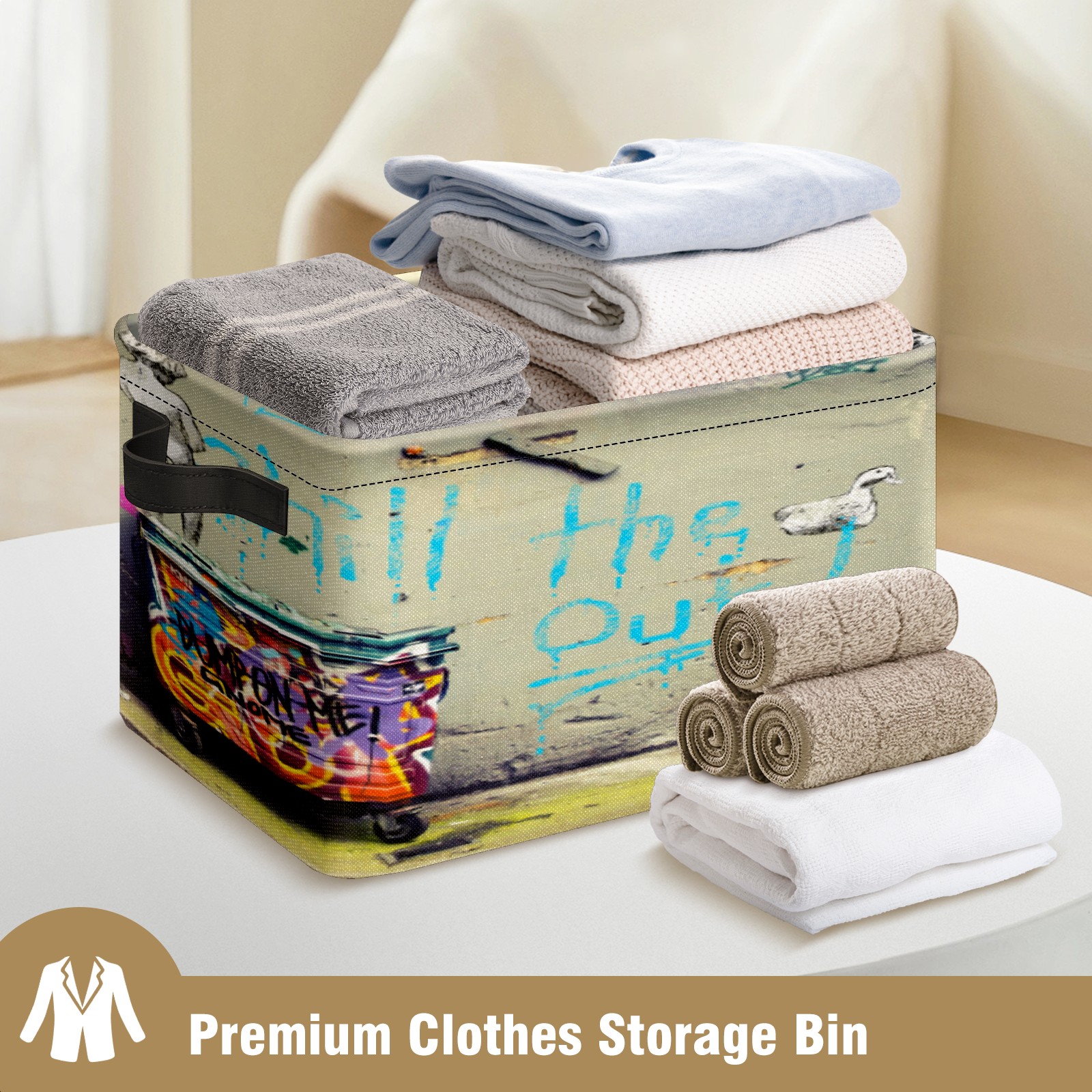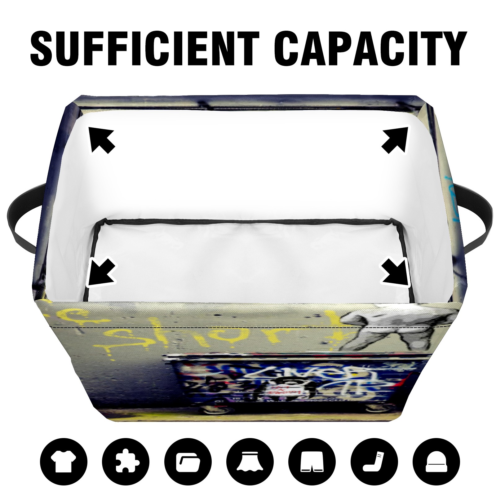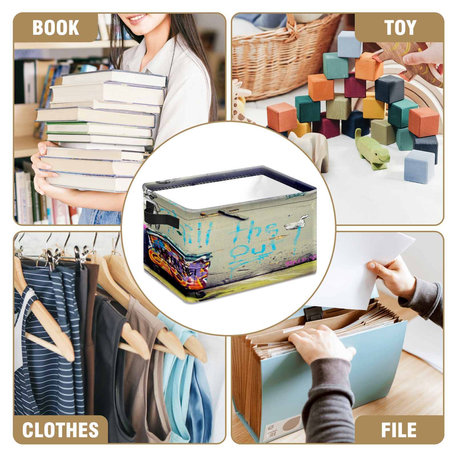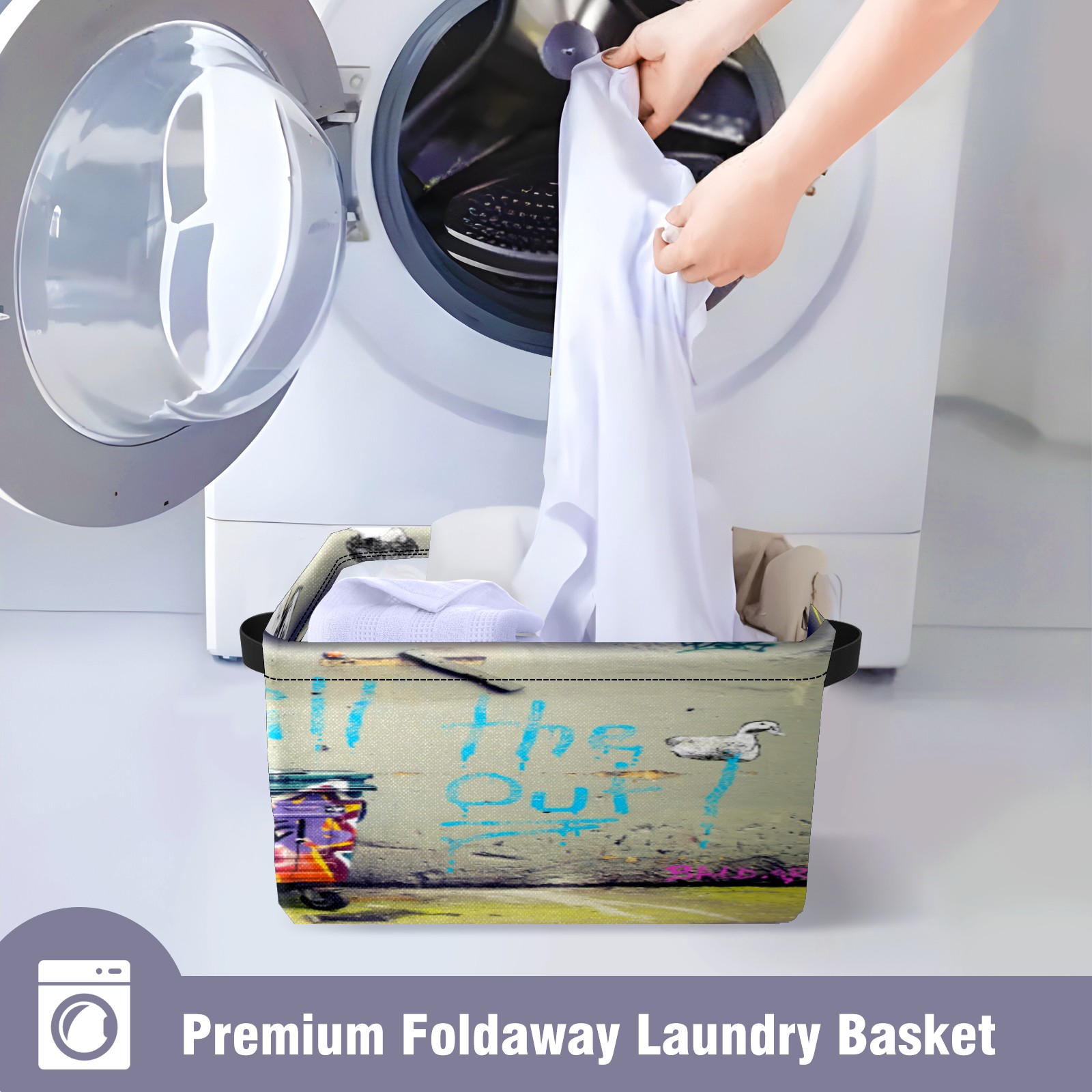 Collapsible 600D Oxford Storage Basket with Banksy Stree Art - Metal Frame 10"x14"x8" Reinforced Handles, Multi-Purpose Organizer