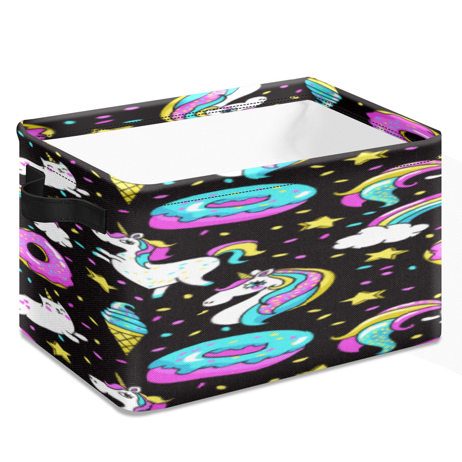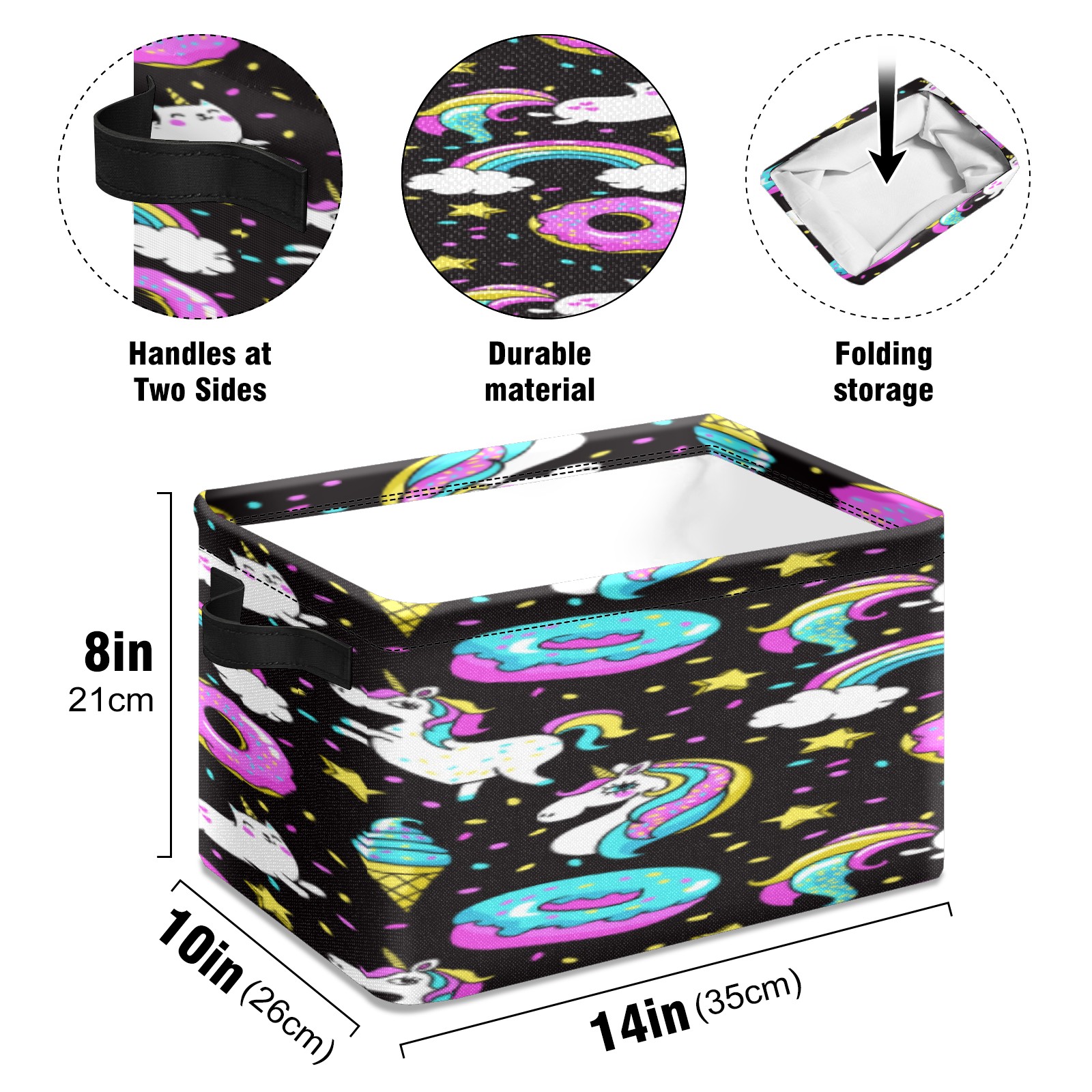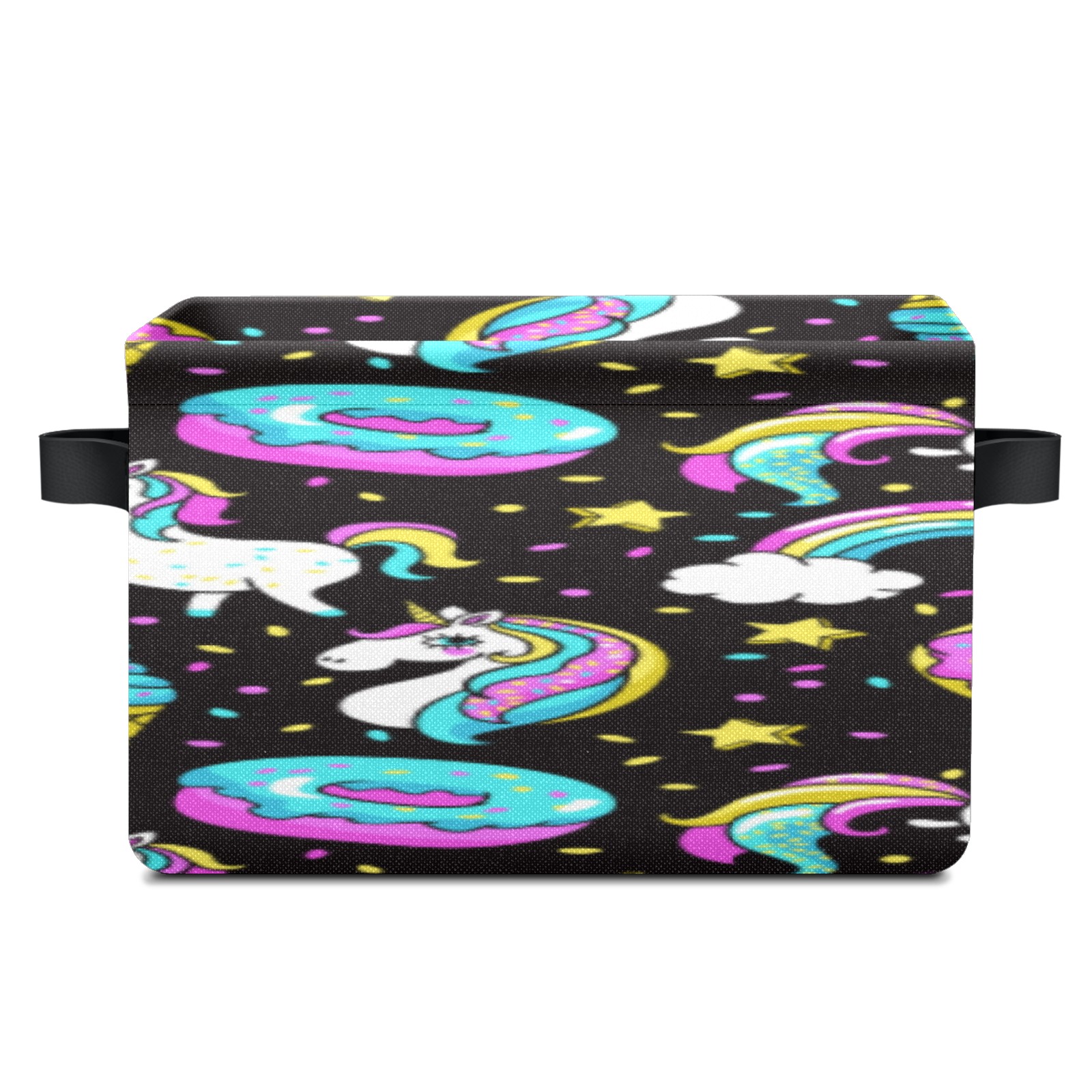 Collapsible 600D Oxford Storage Basket with Cartoon Unicorn Donut Rainbow Star Black - Metal Frame 10"x14"x8" Reinforced Handles, Multi-Purpose Organizer