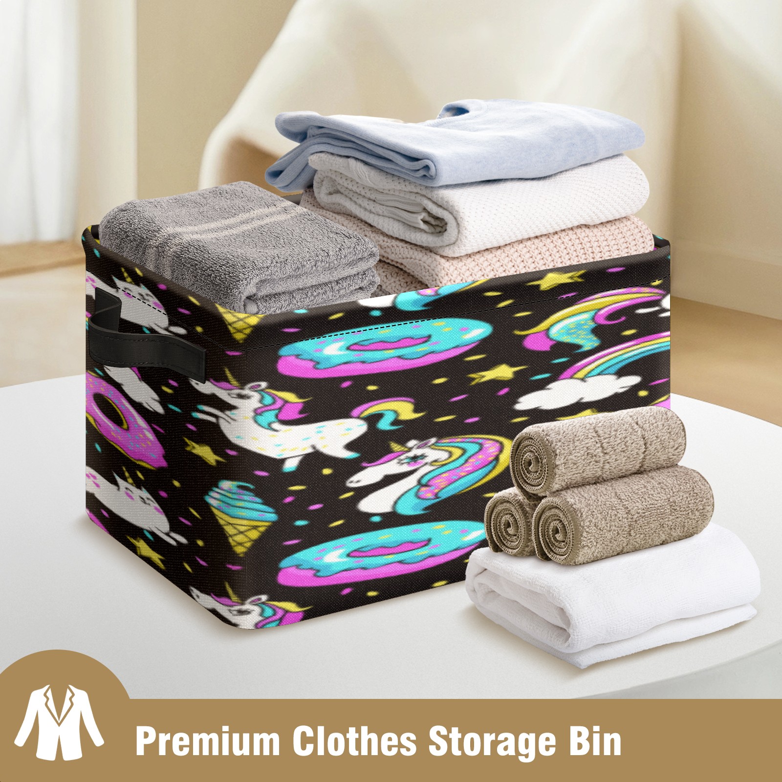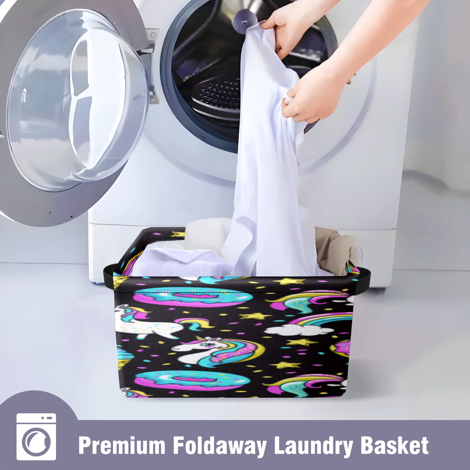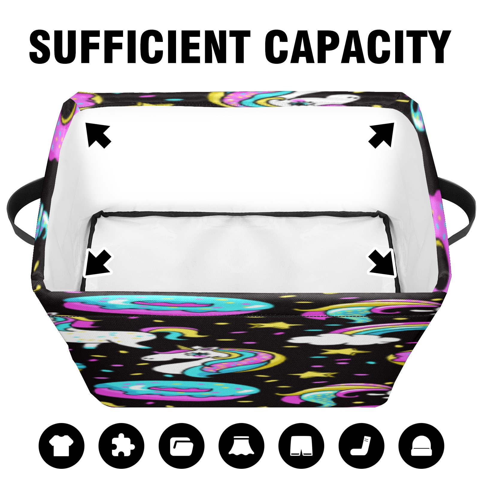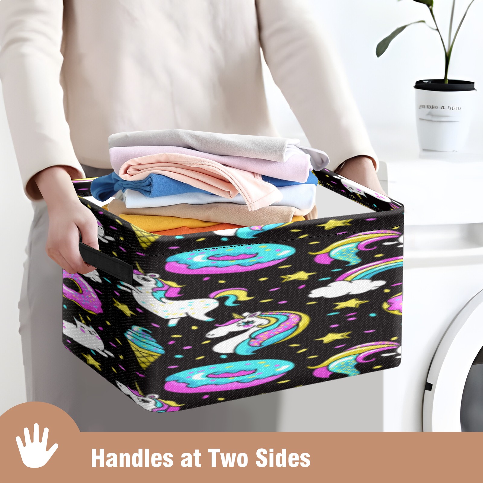 Collapsible 600D Oxford Storage Basket with Cartoon Unicorn Donut Rainbow Star Black - Metal Frame 10"x14"x8" Reinforced Handles, Multi-Purpose Organizer