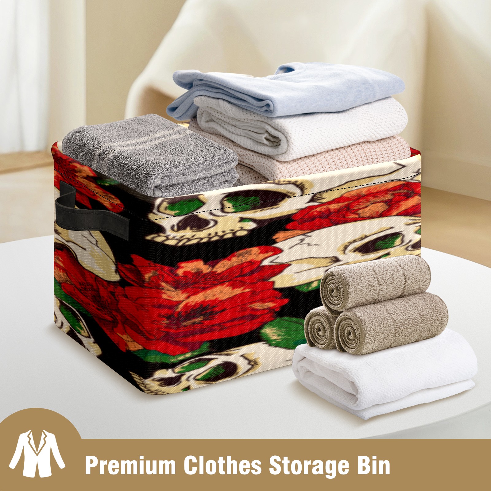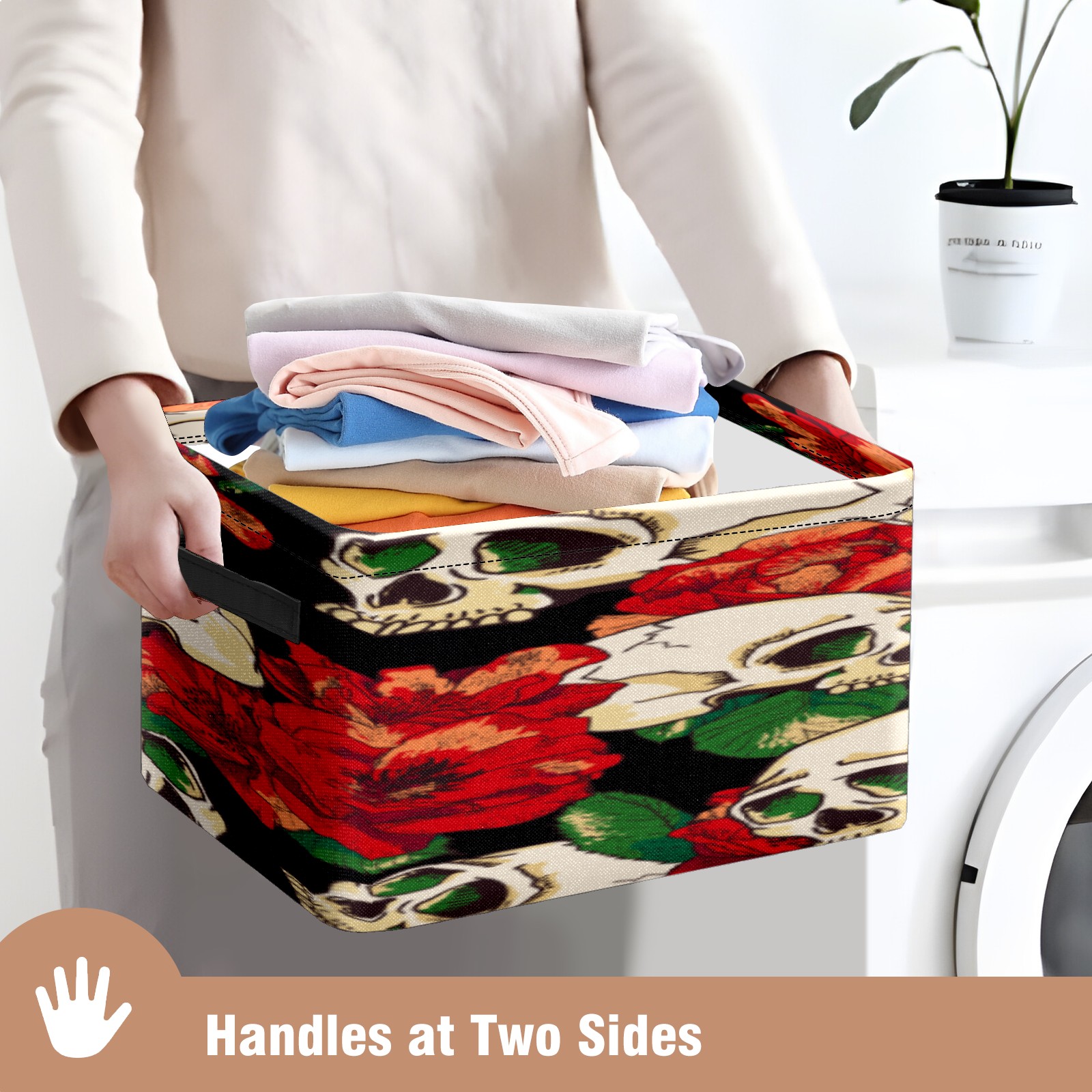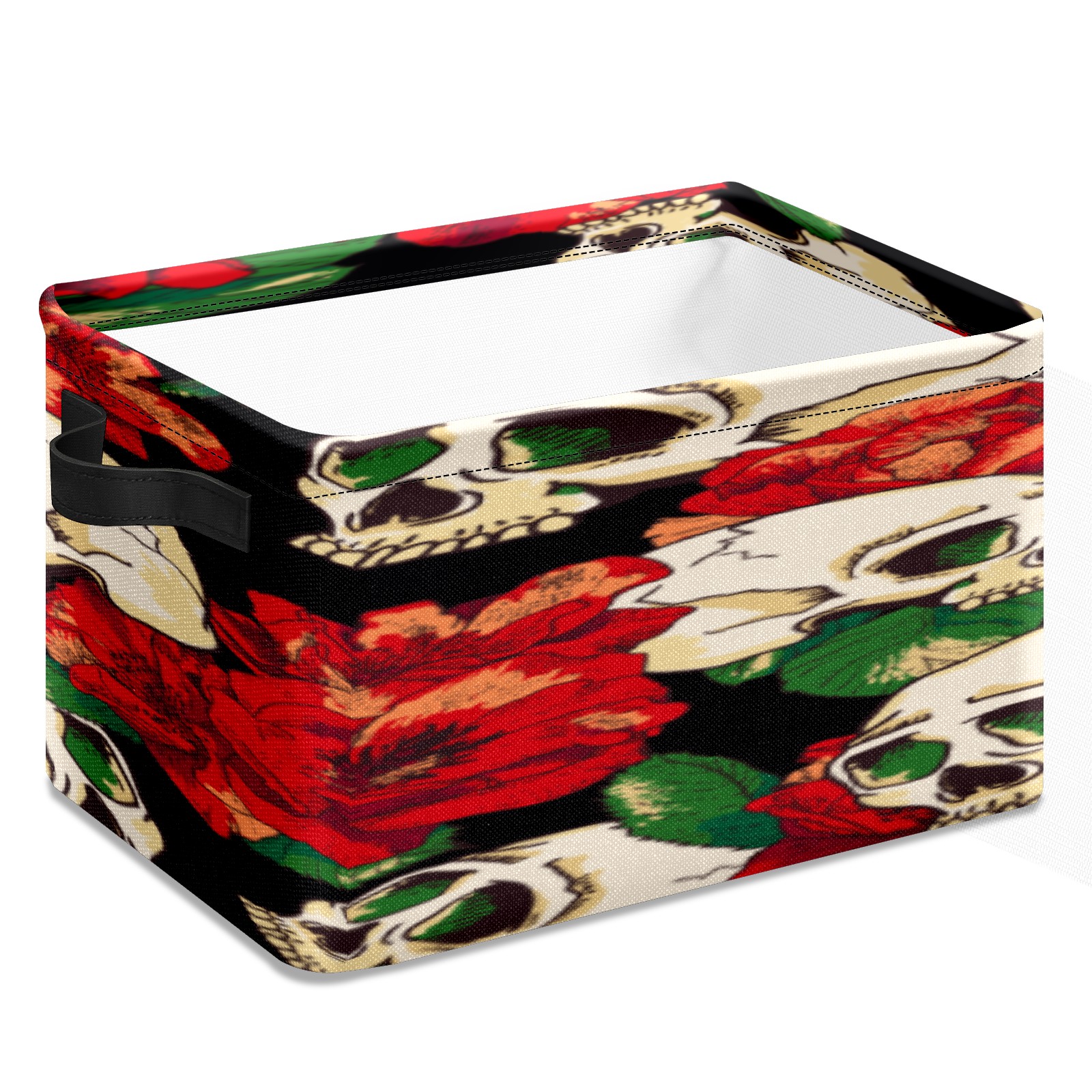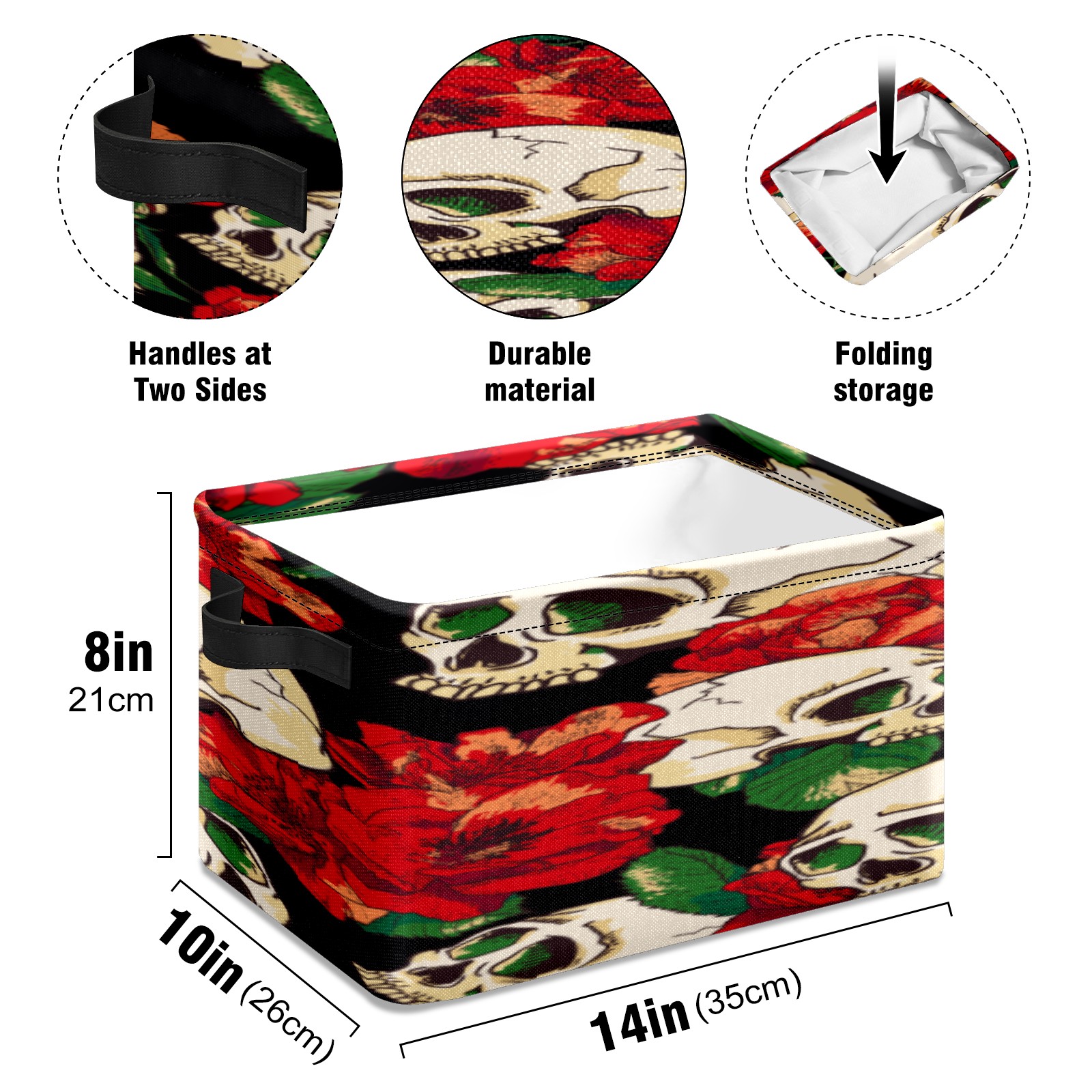 Collapsible 600D Oxford Storage Basket with Halloween Skeleton Rose - Metal Frame 10"x14"x8" Reinforced Handles, Multi-Purpose Organizer