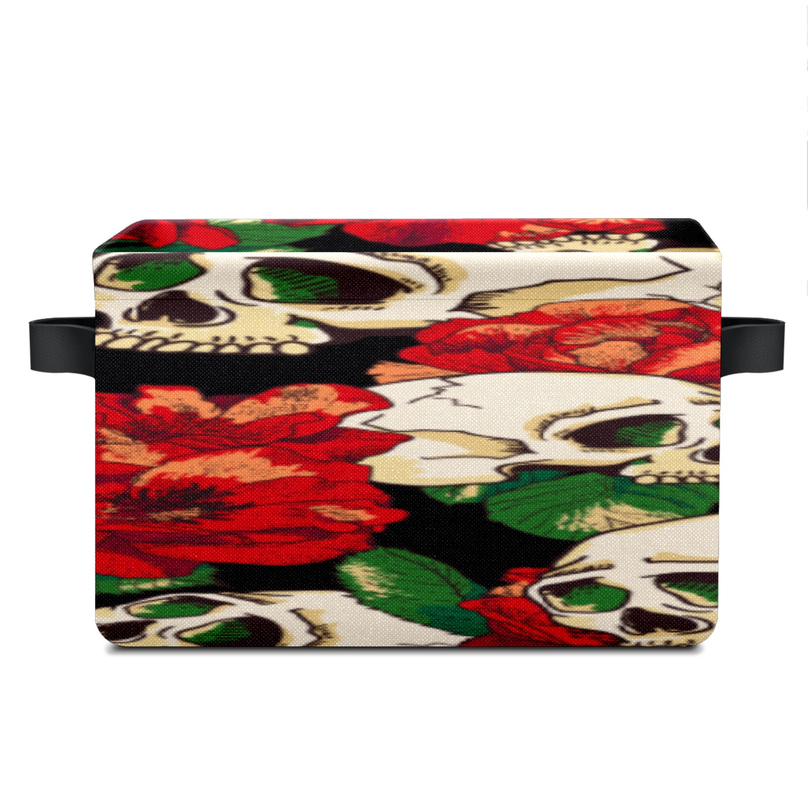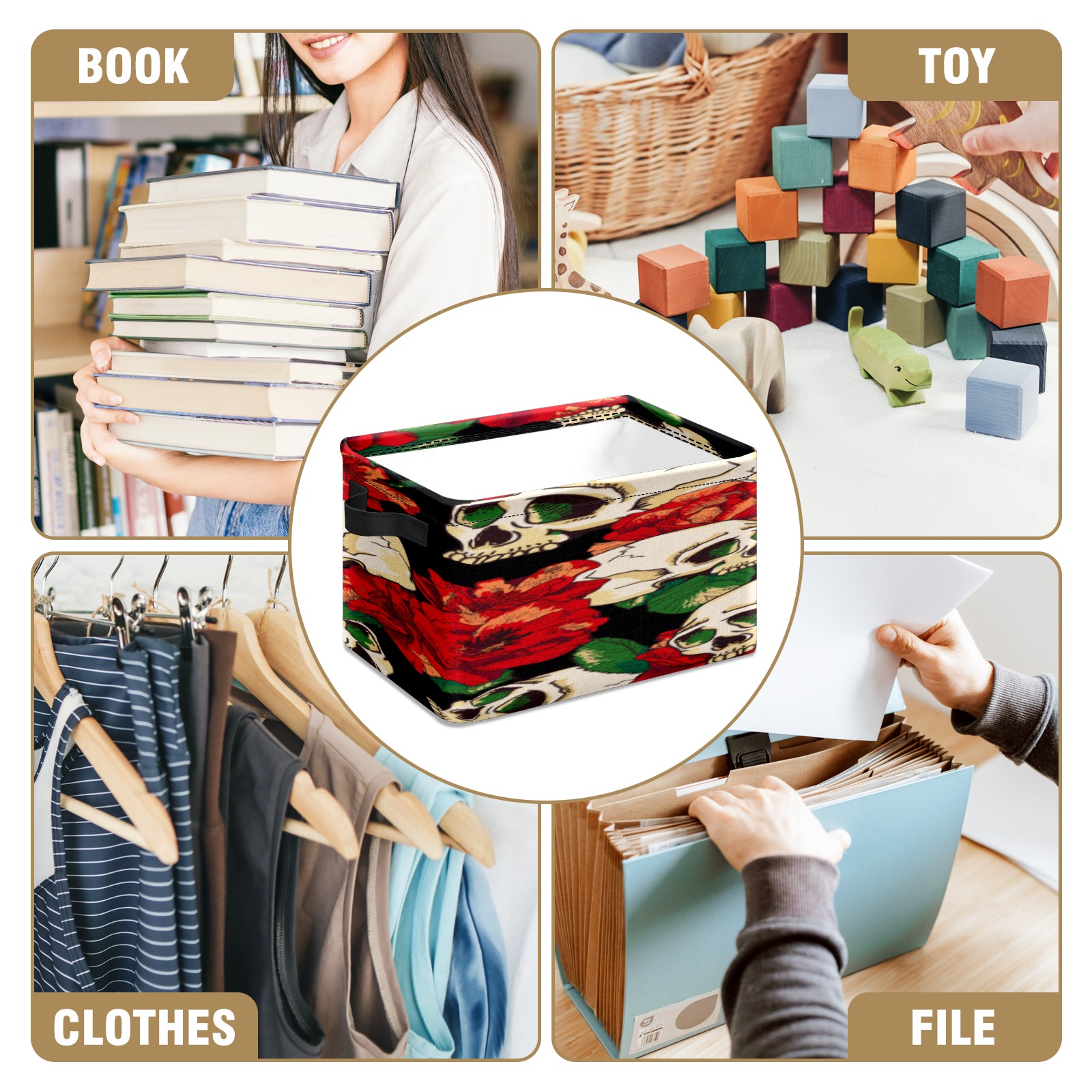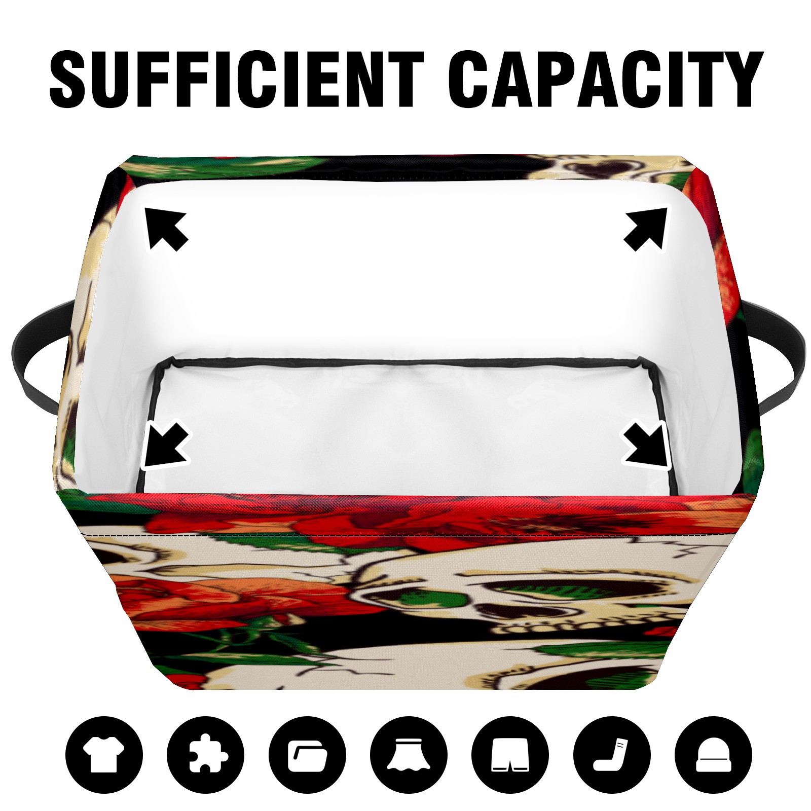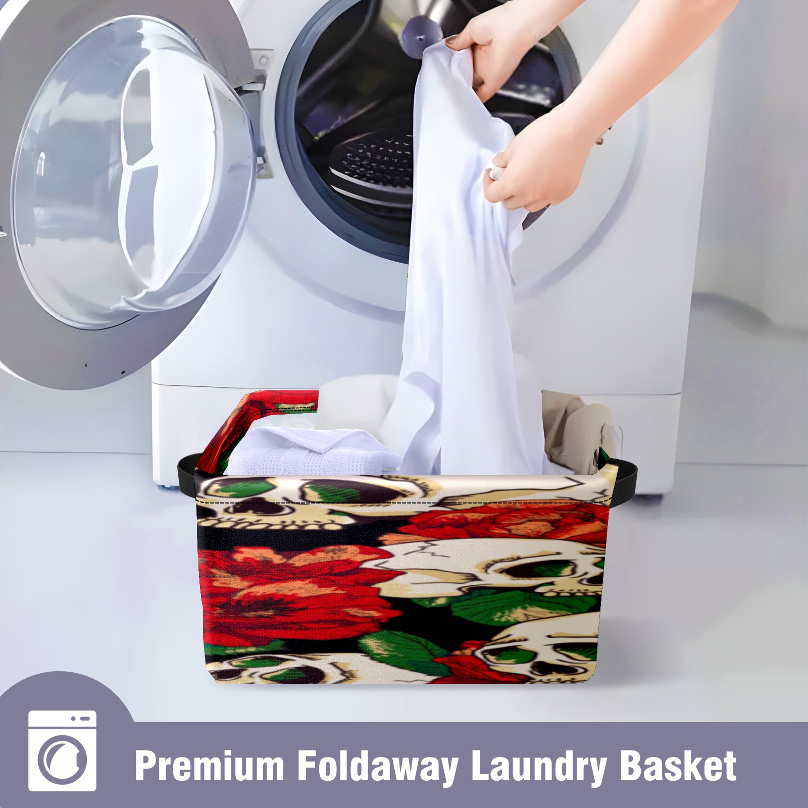 Collapsible 600D Oxford Storage Basket with Halloween Skeleton Rose - Metal Frame 10"x14"x8" Reinforced Handles, Multi-Purpose Organizer