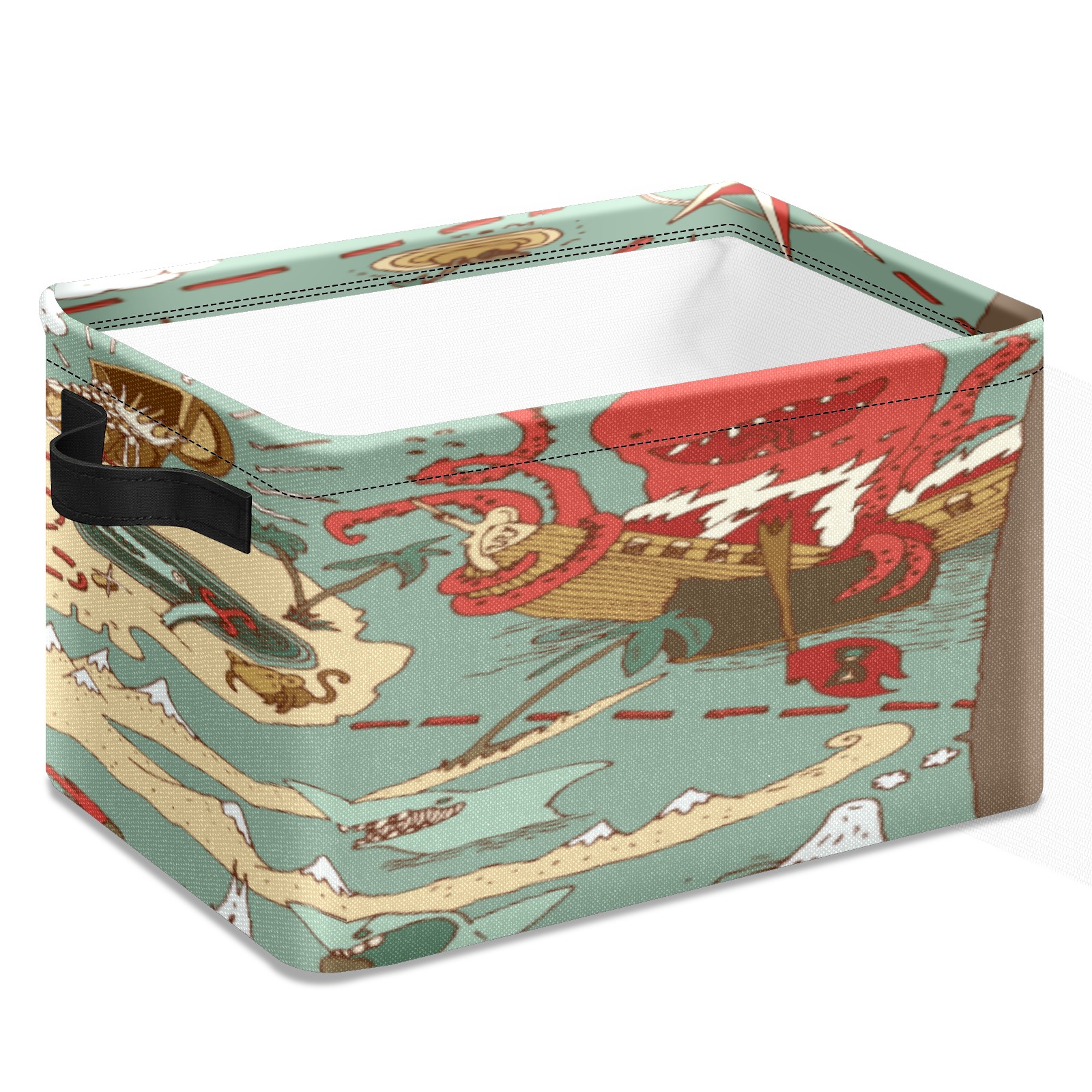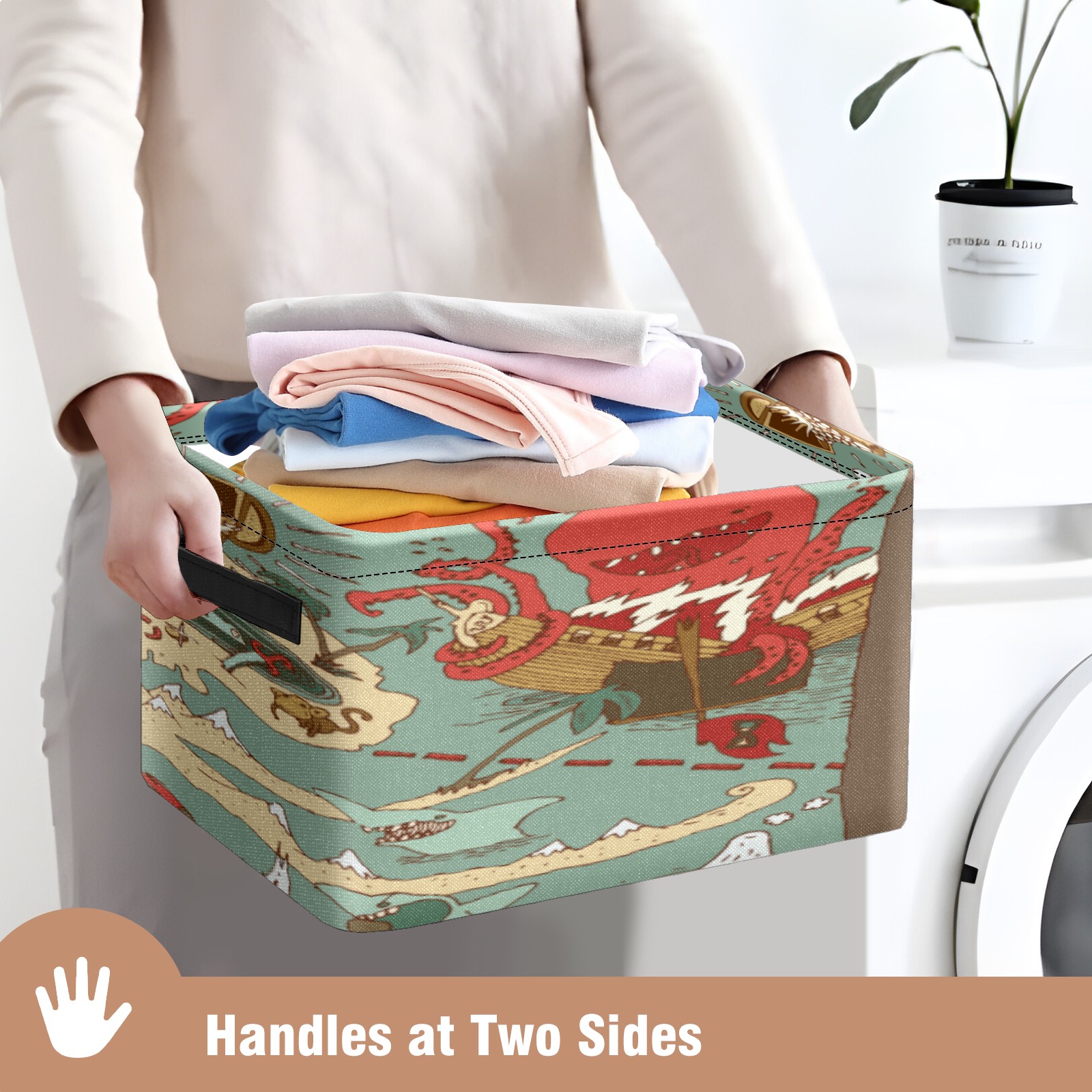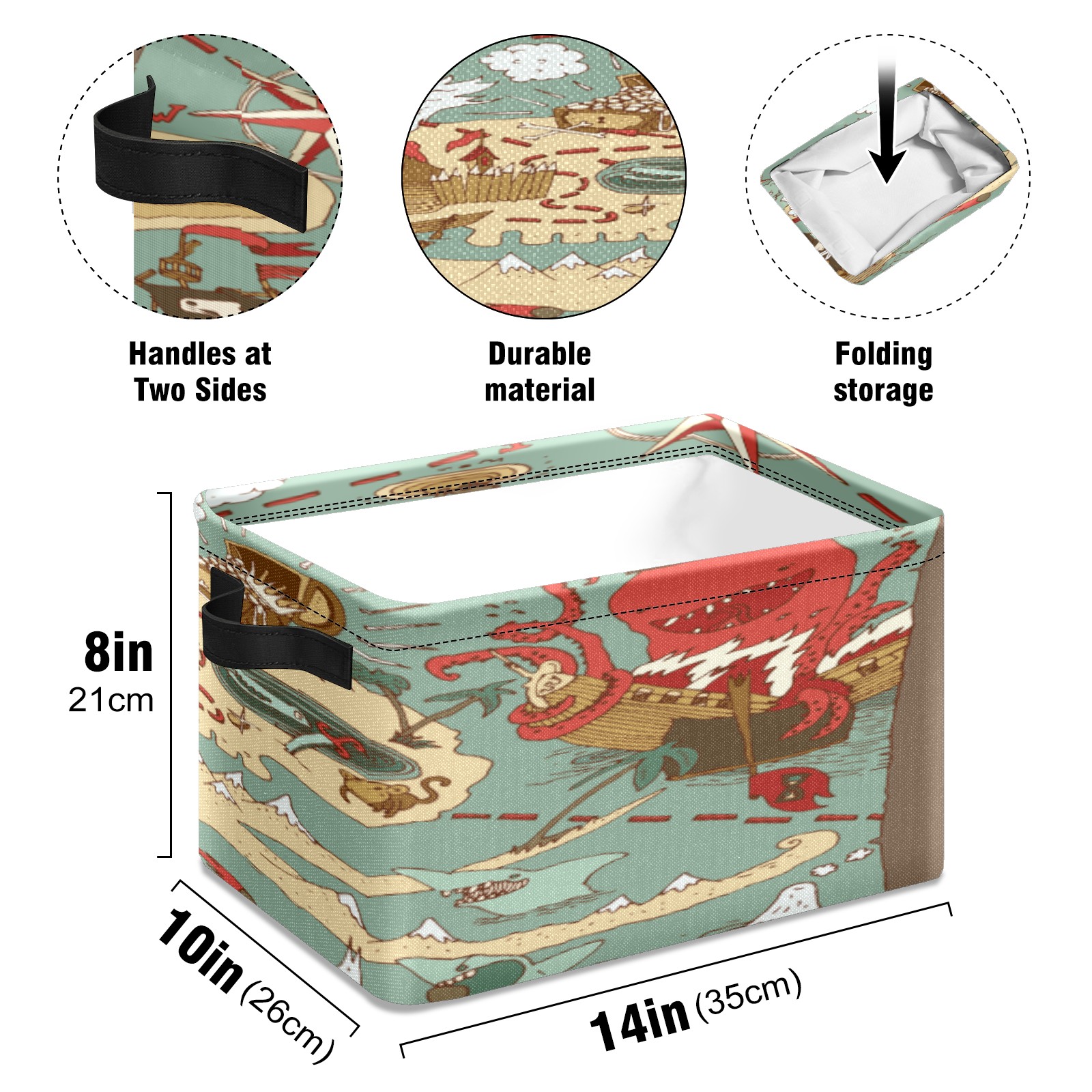 Collapsible 600D Oxford Storage Basket with Nautical Cute Pirate Map - Metal Frame 10"x14"x8" Reinforced Handles, Multi-Purpose Organizer