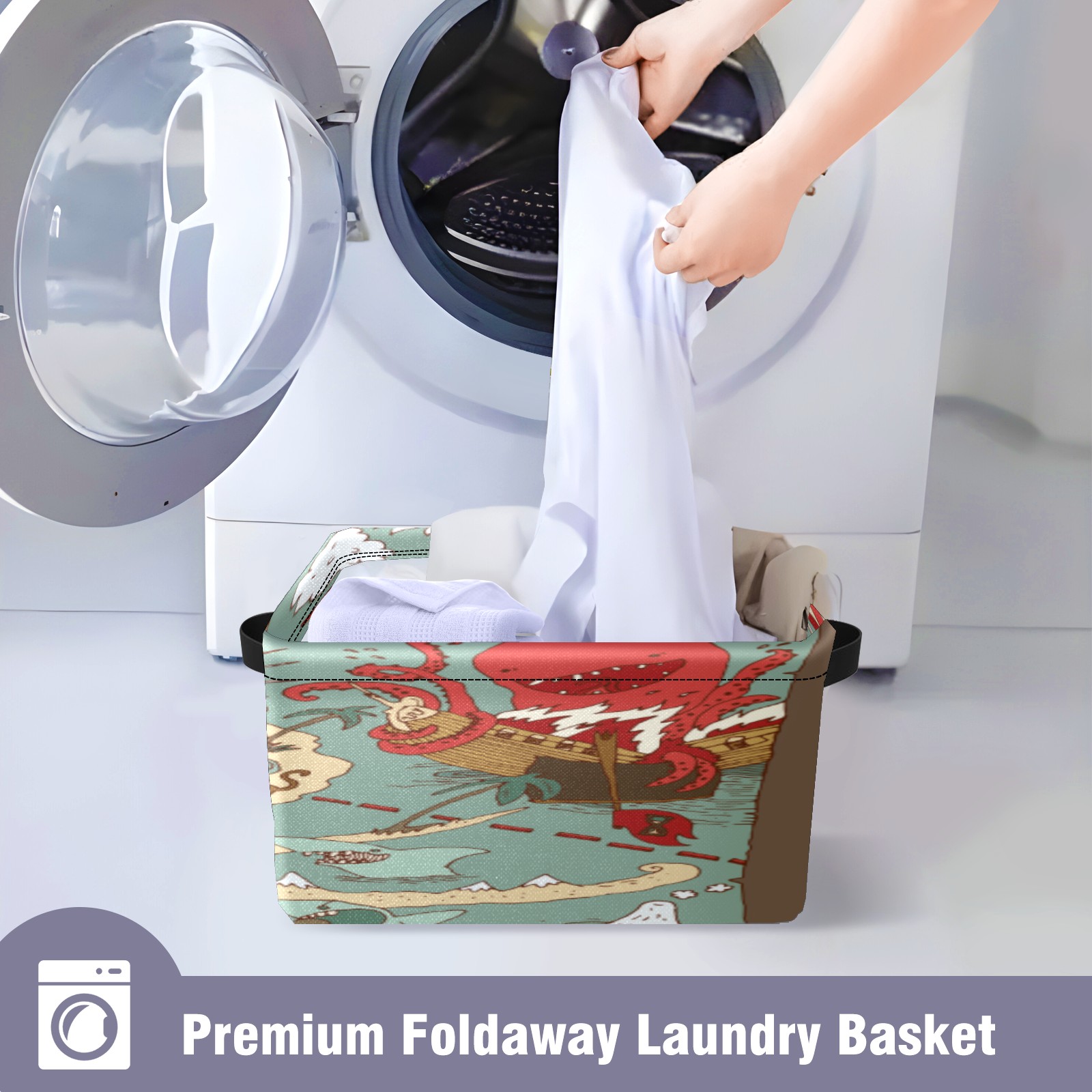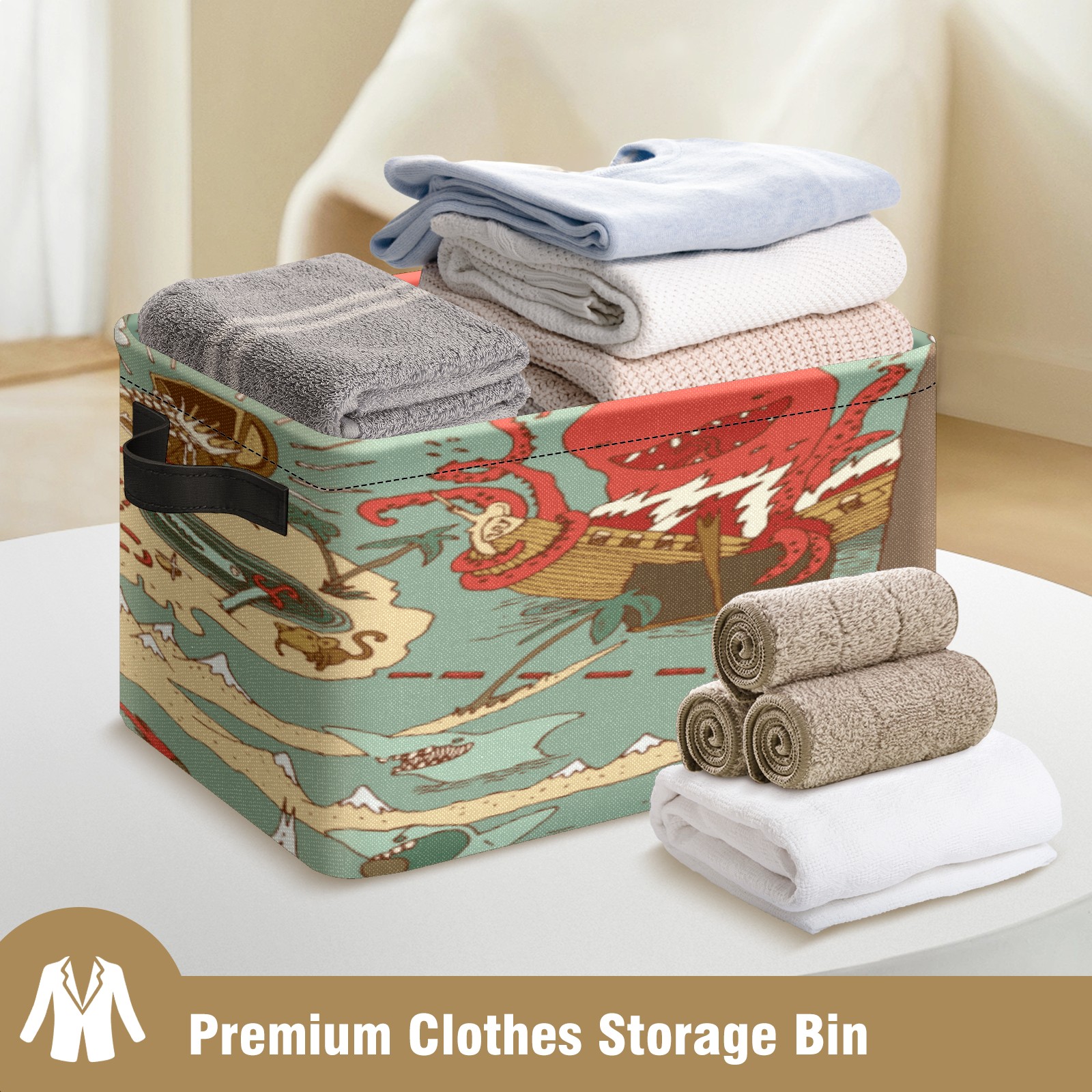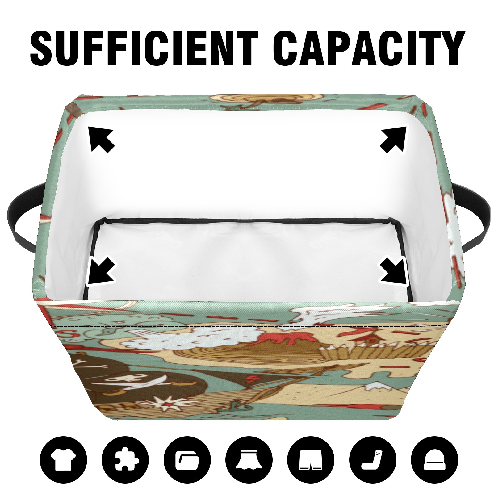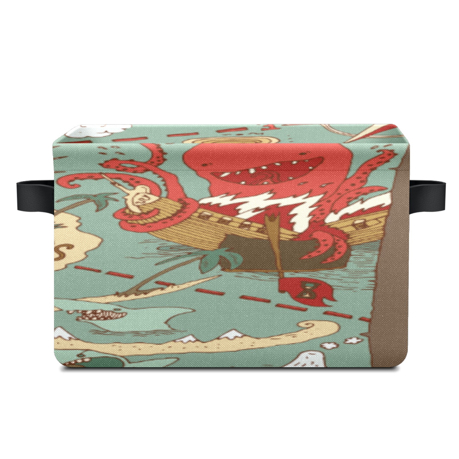 Collapsible 600D Oxford Storage Basket with Nautical Cute Pirate Map - Metal Frame 10"x14"x8" Reinforced Handles, Multi-Purpose Organizer
