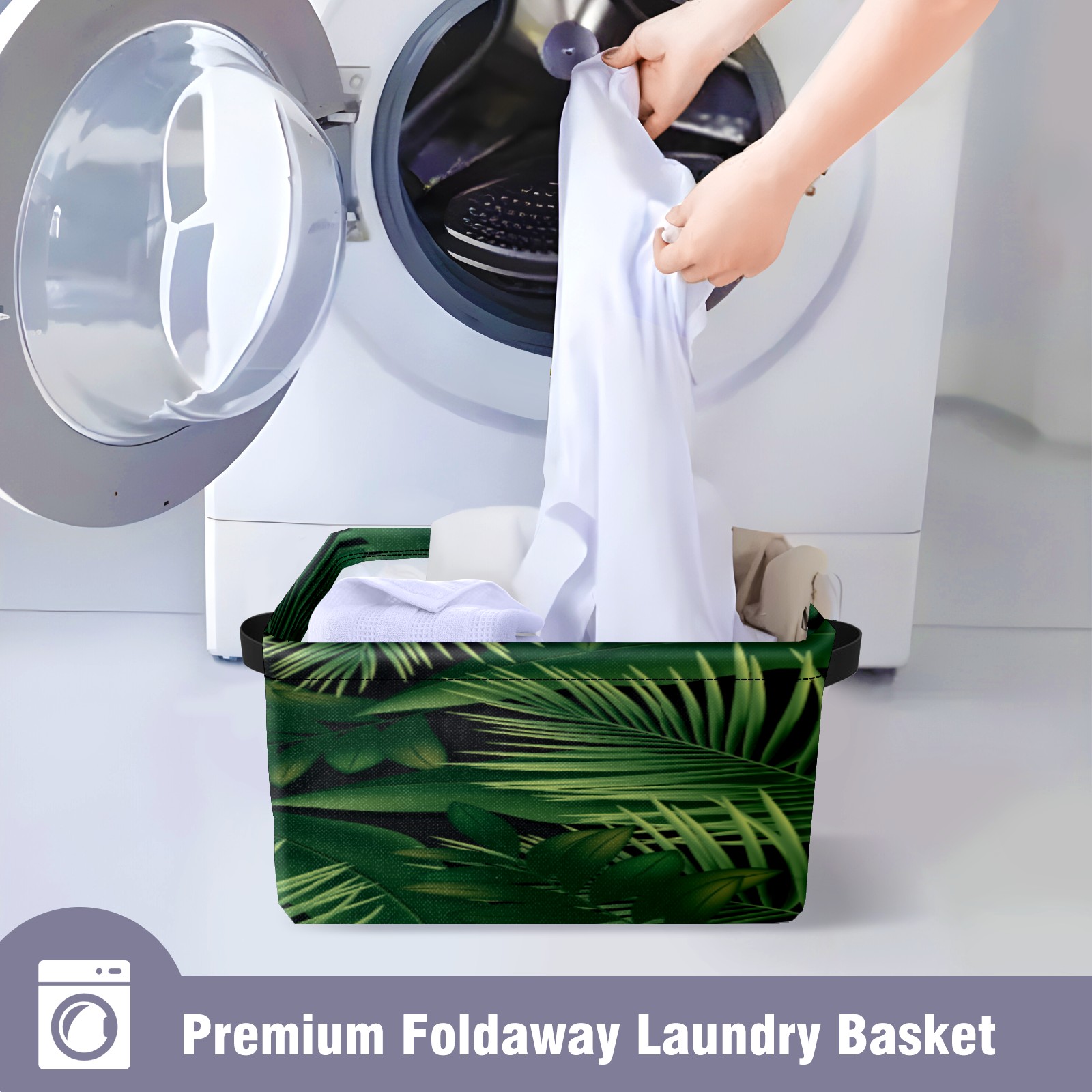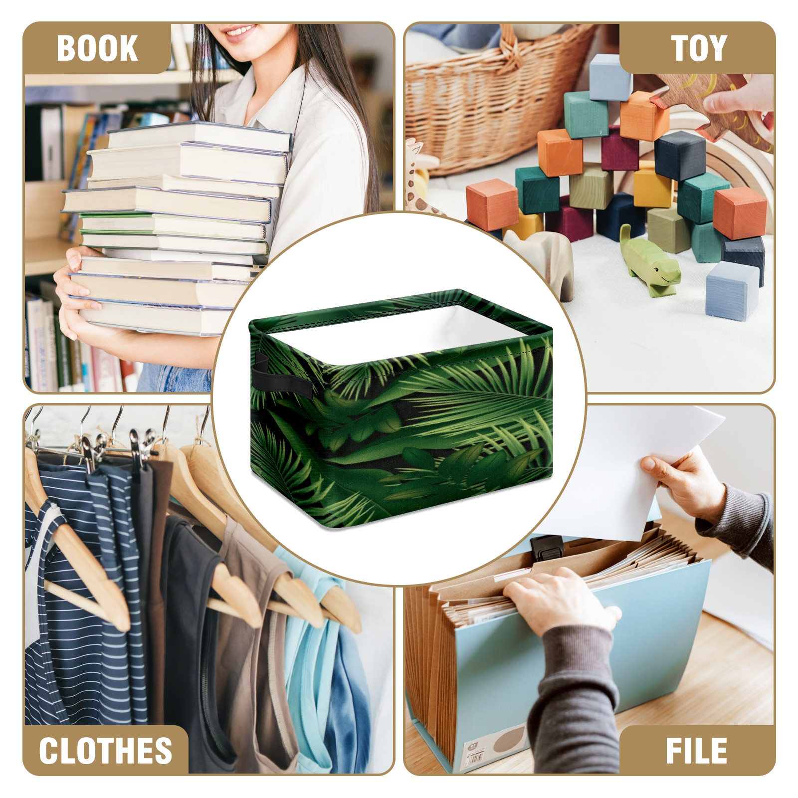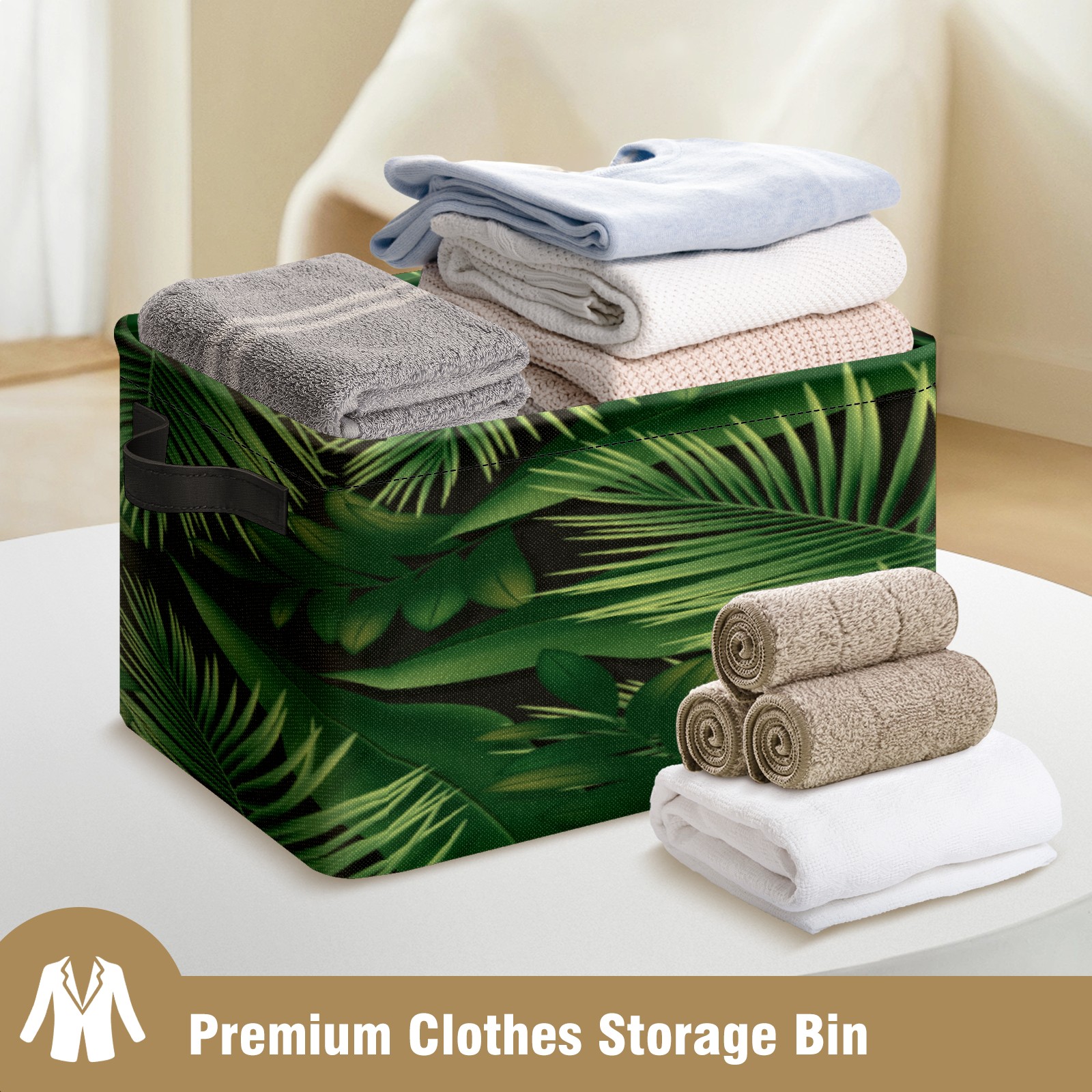 Collapsible 600D Oxford Storage Basket with Green Leaves Foliage Plant - Metal Frame 10"x14"x8" Reinforced Handles, Multi-Purpose Organizer