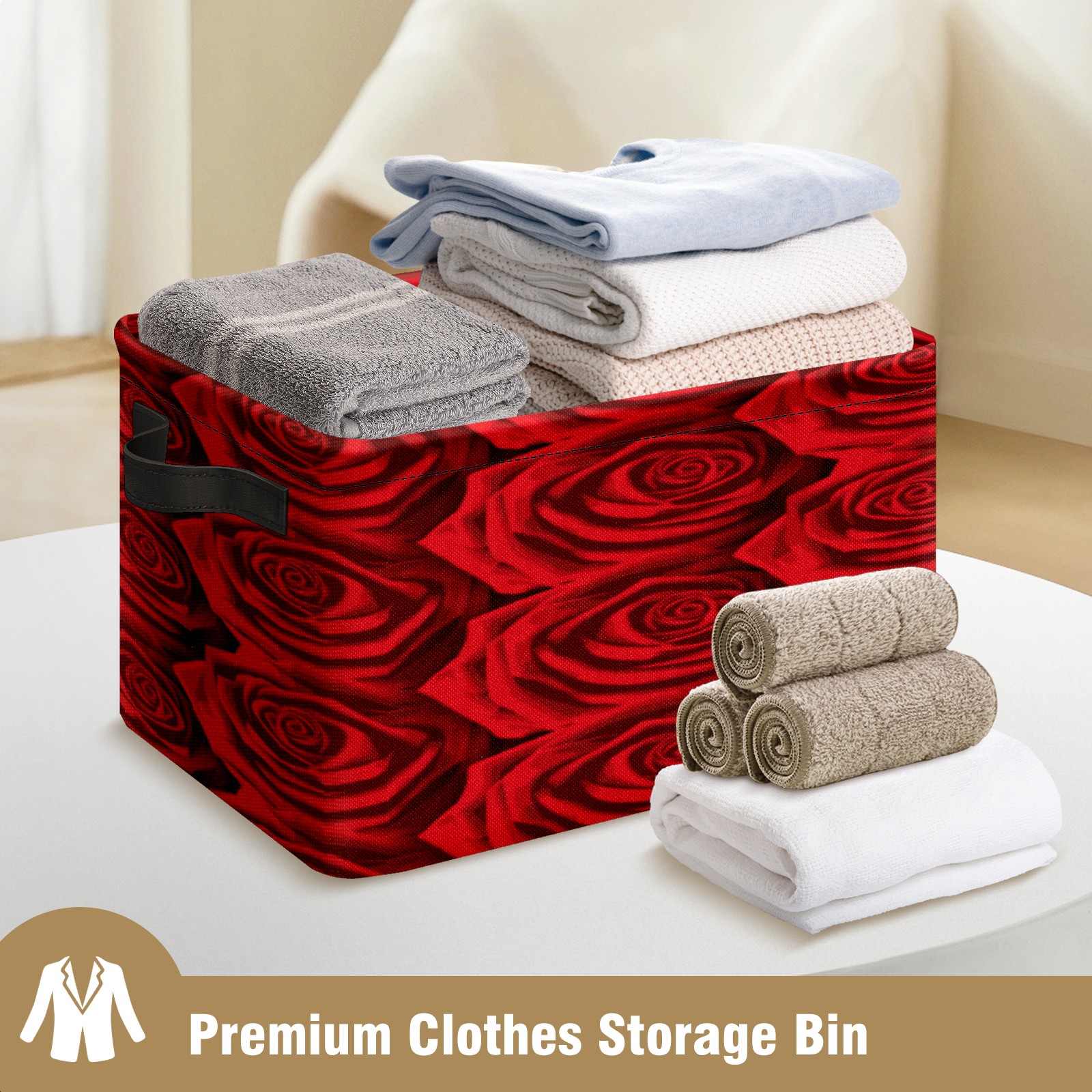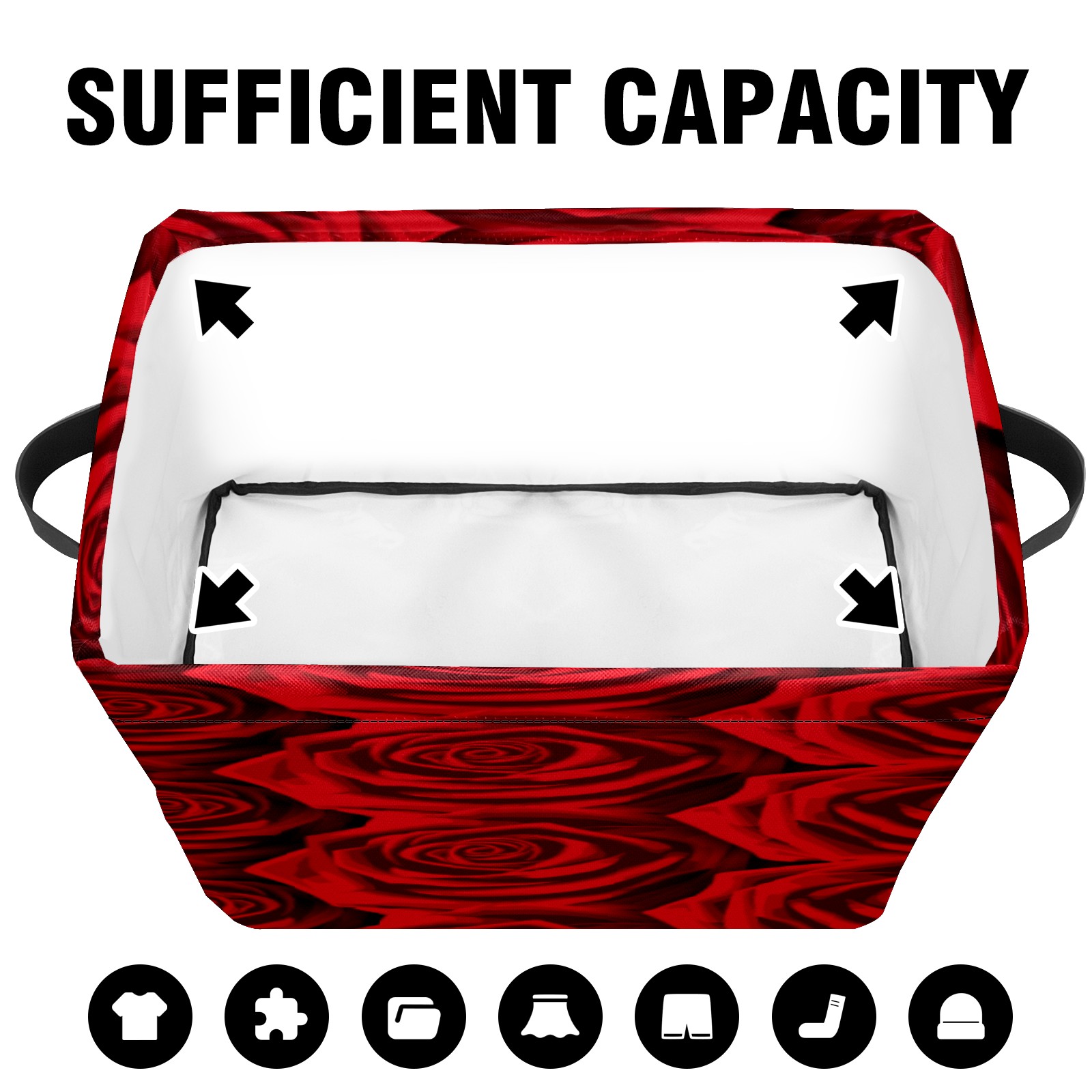 Collapsible 600D Oxford Storage Basket with Red Rose Pattern - Metal Frame 10"x14"x8" Reinforced Handles, Multi-Purpose Organizer