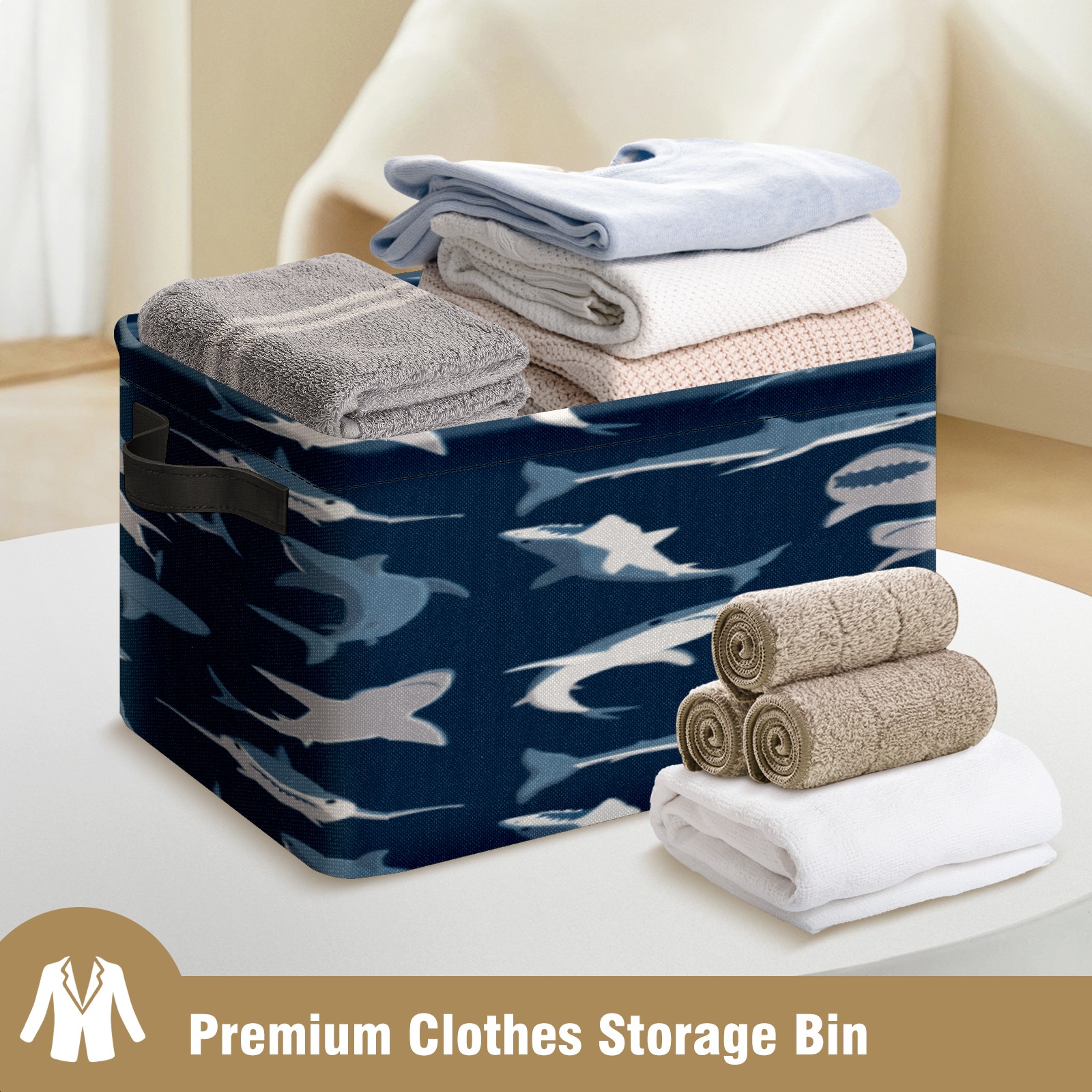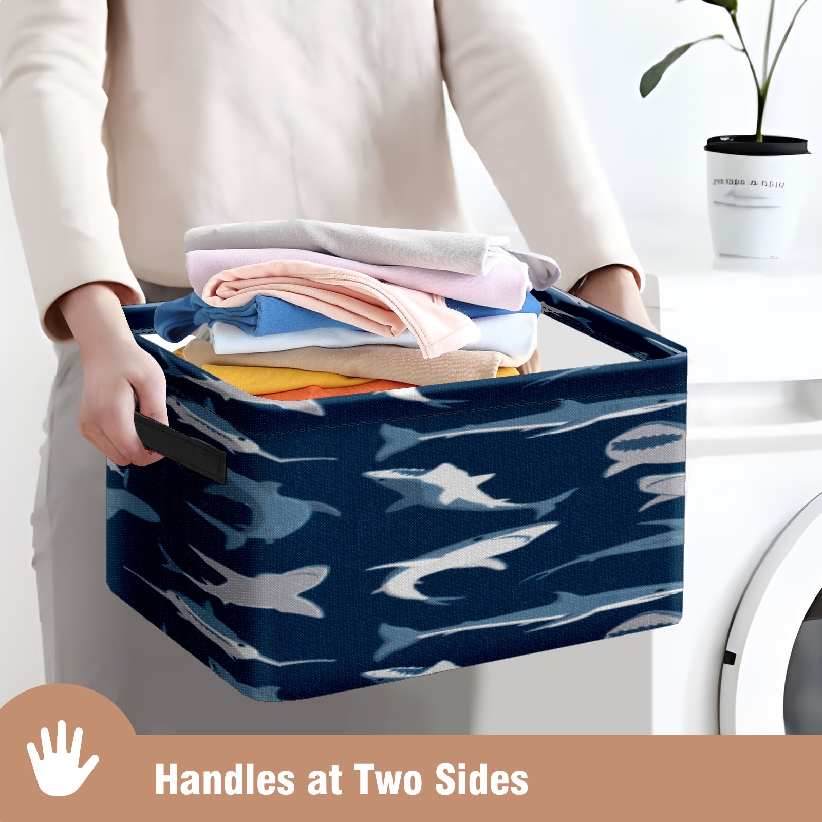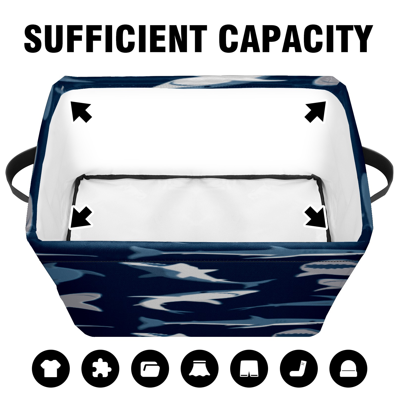 Collapsible 600D Oxford Storage Basket with Shark Dark Pattern - Metal Frame 10"x14"x8" Reinforced Handles, Multi-Purpose Organizer