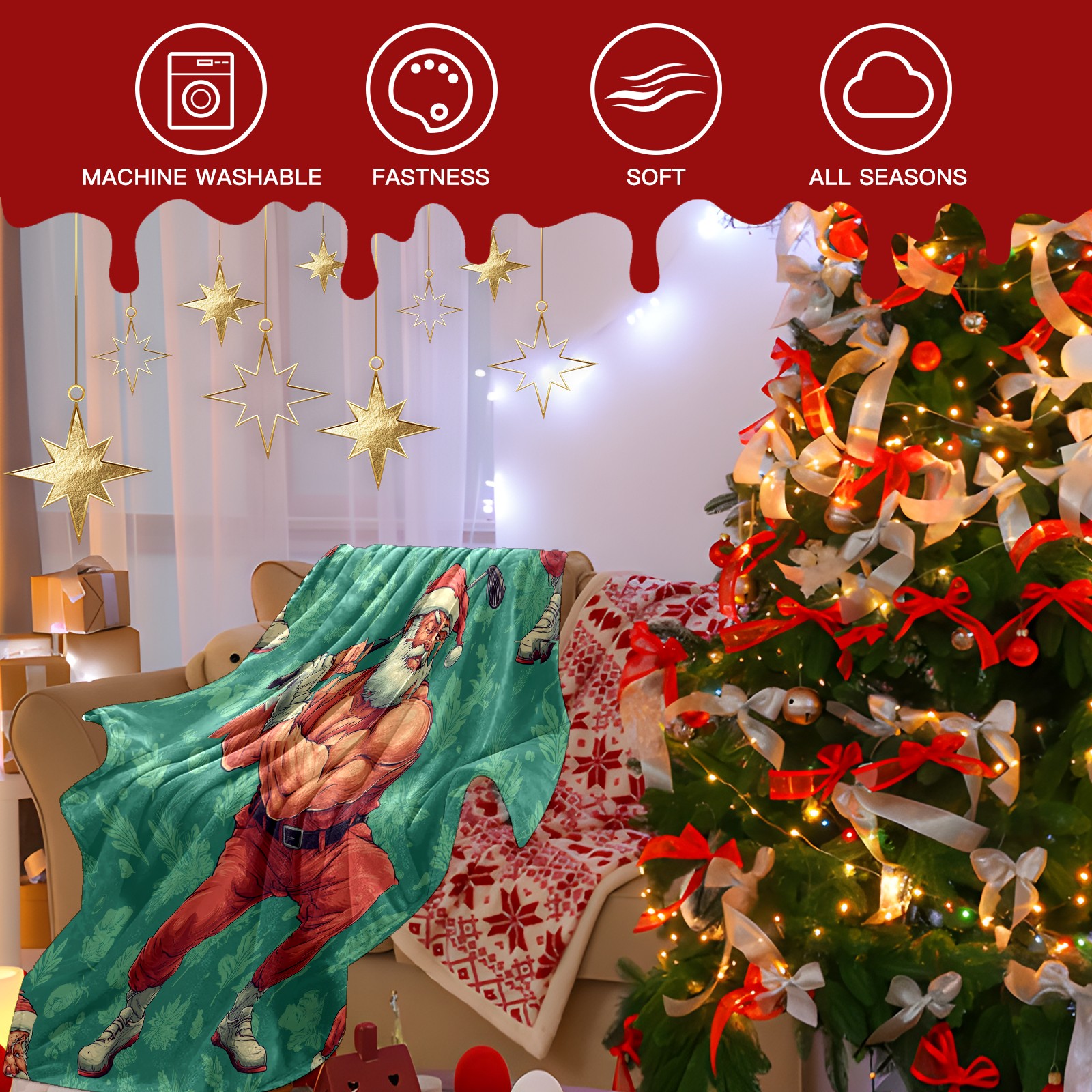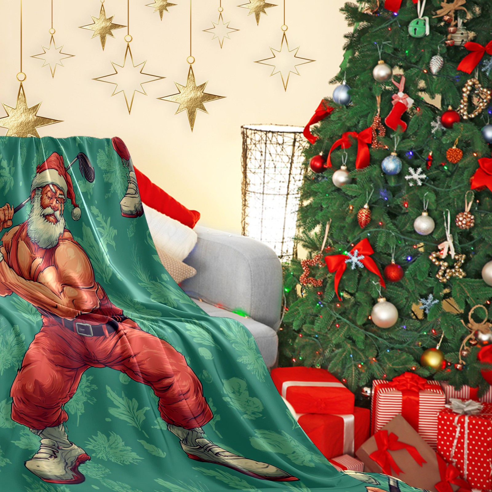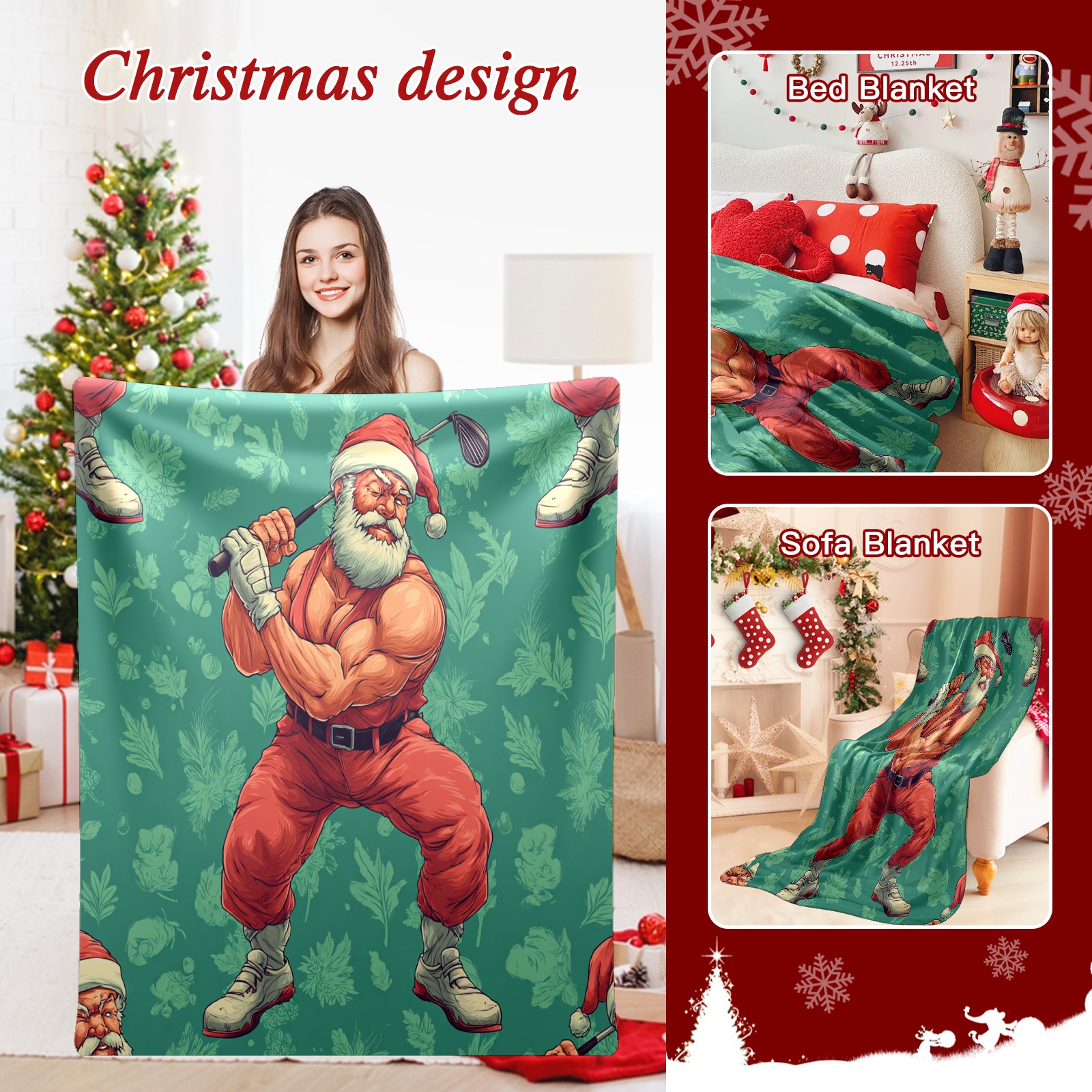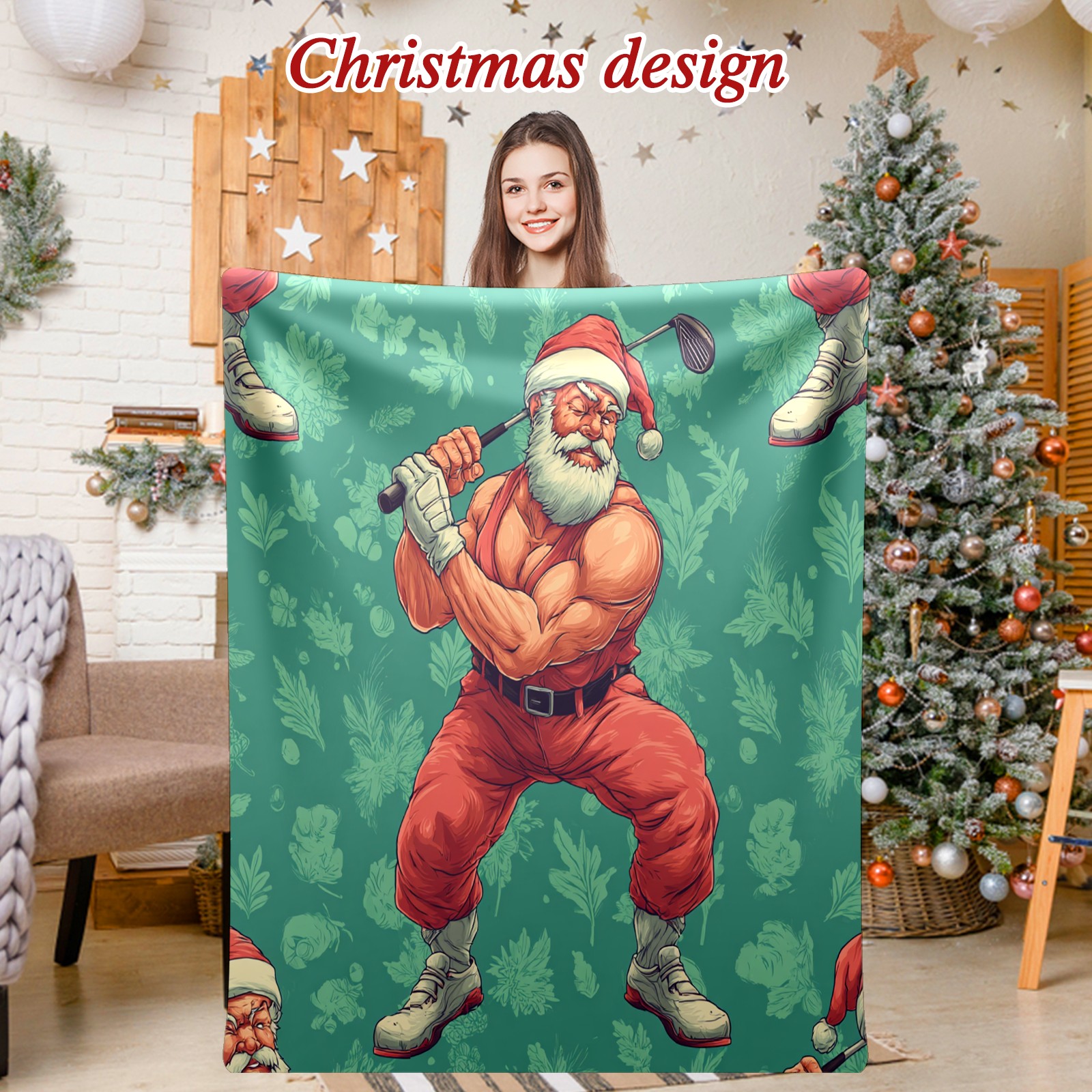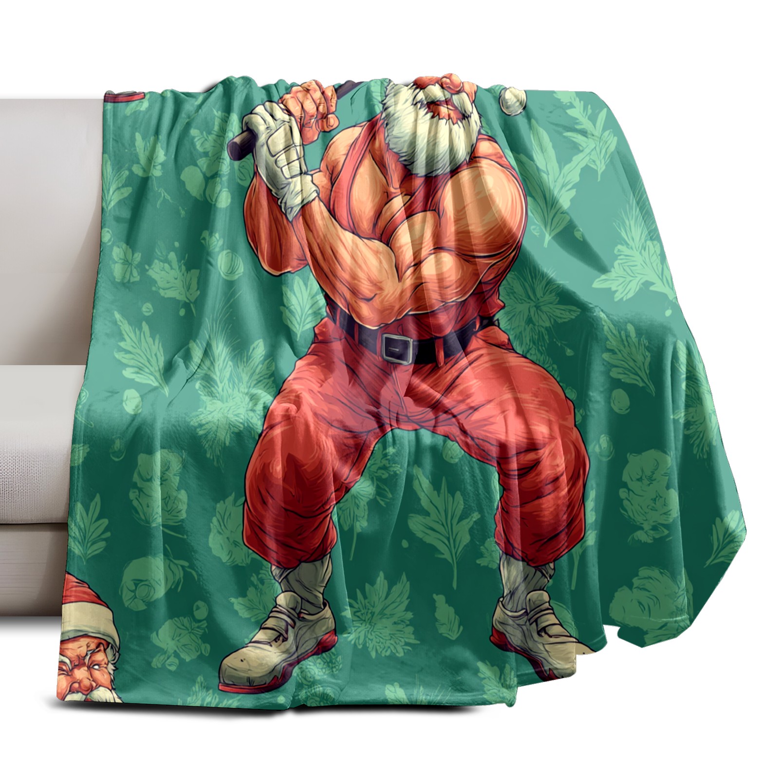 Премиальная фланелевая одеяло Funny Santa Green