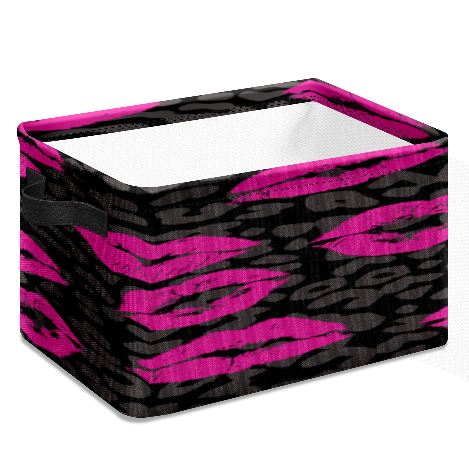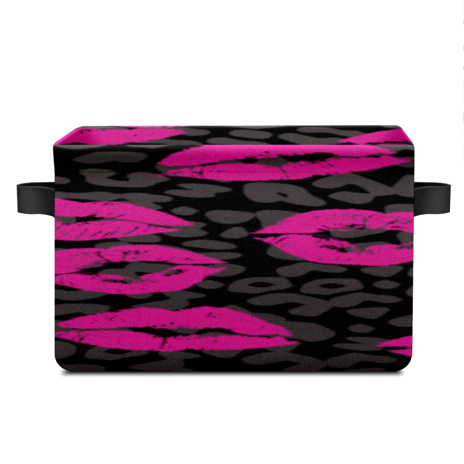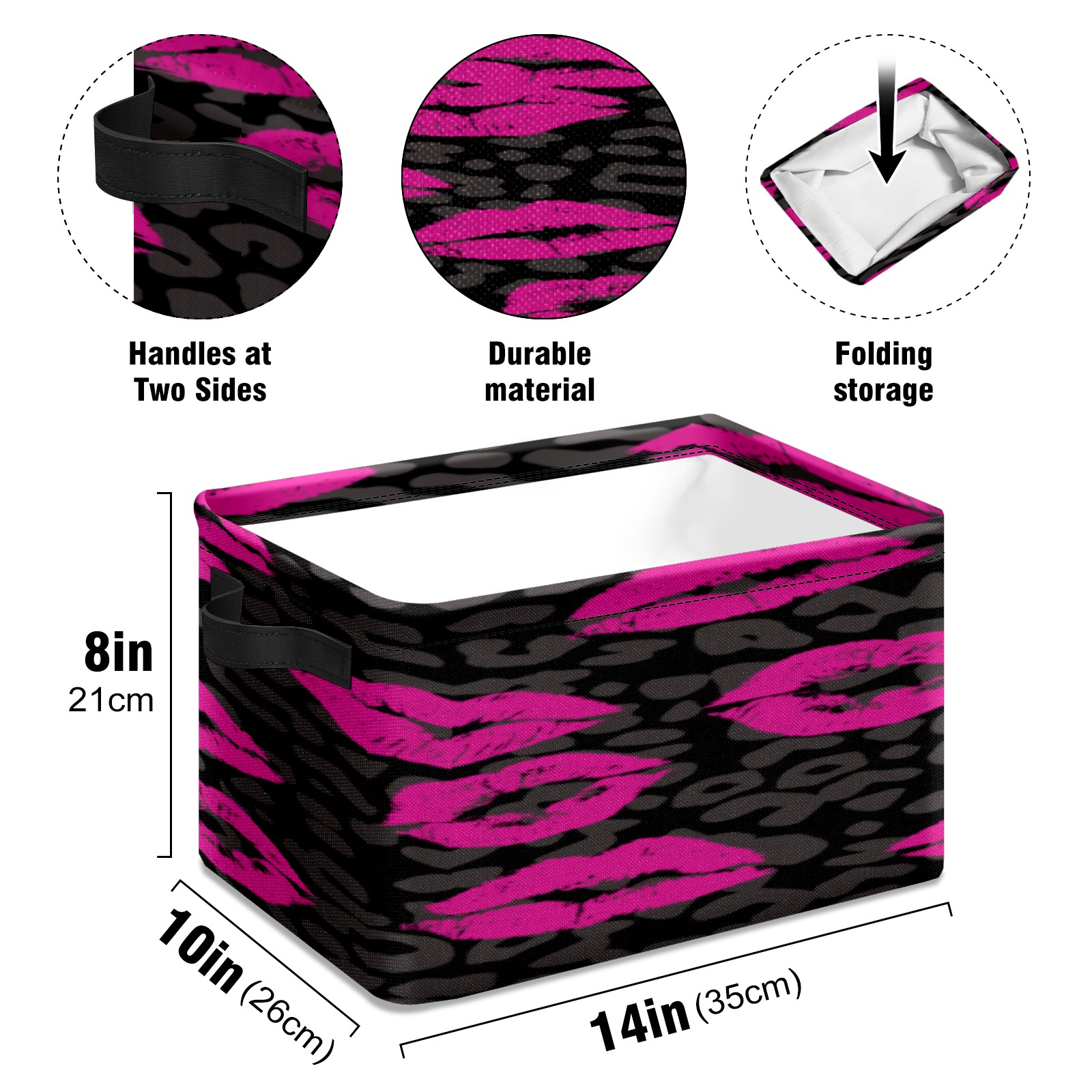 Collapsible 600D Oxford Storage Basket with Pink Lips Pattern Leopard Grain - Metal Frame 10"x14"x8" Reinforced Handles, Multi-Purpose Organizer