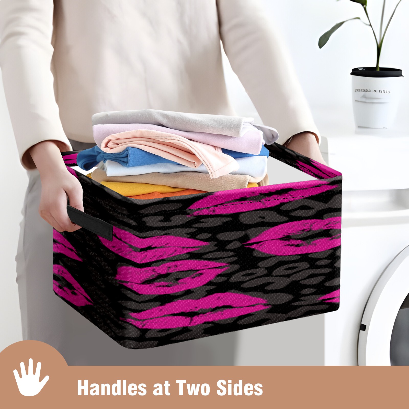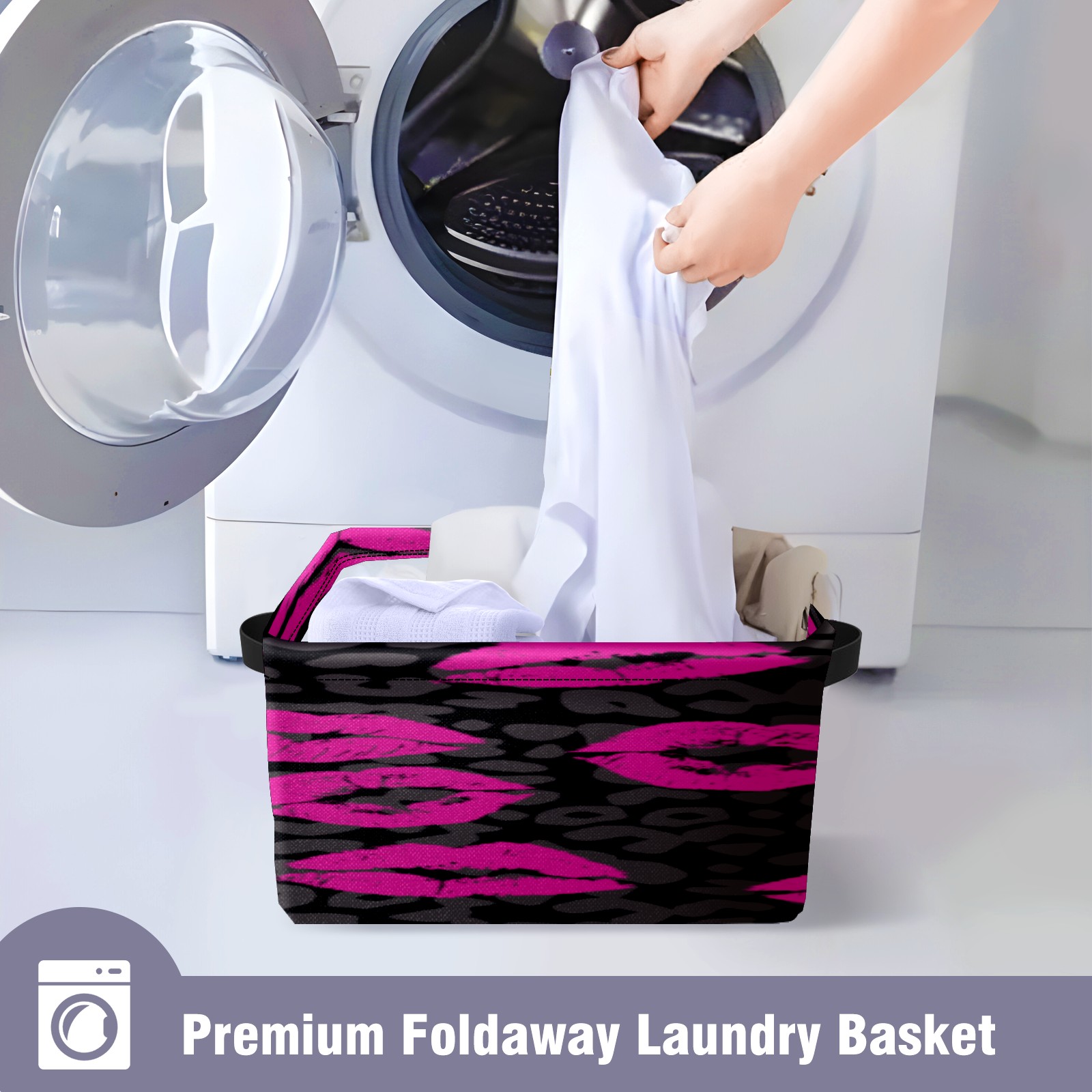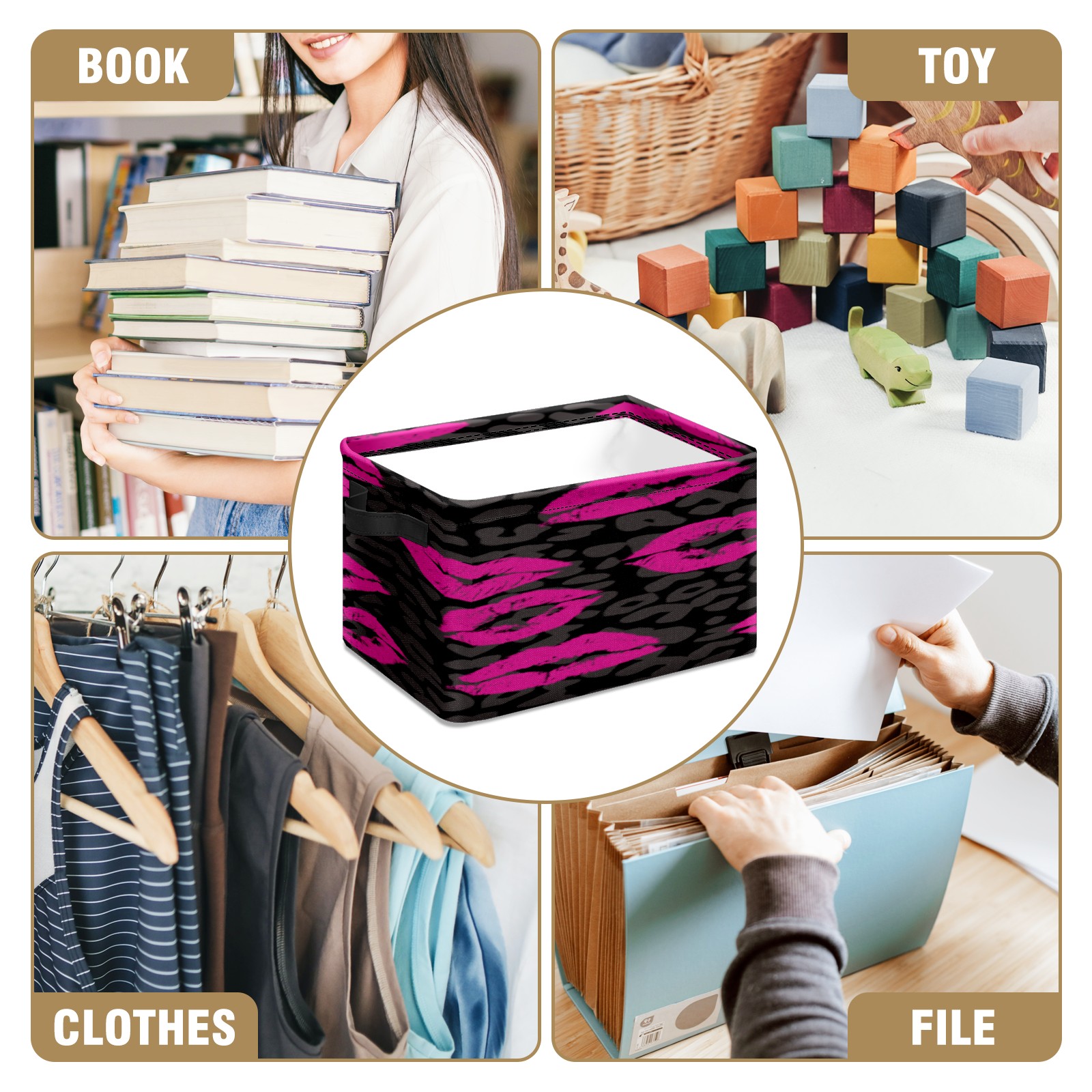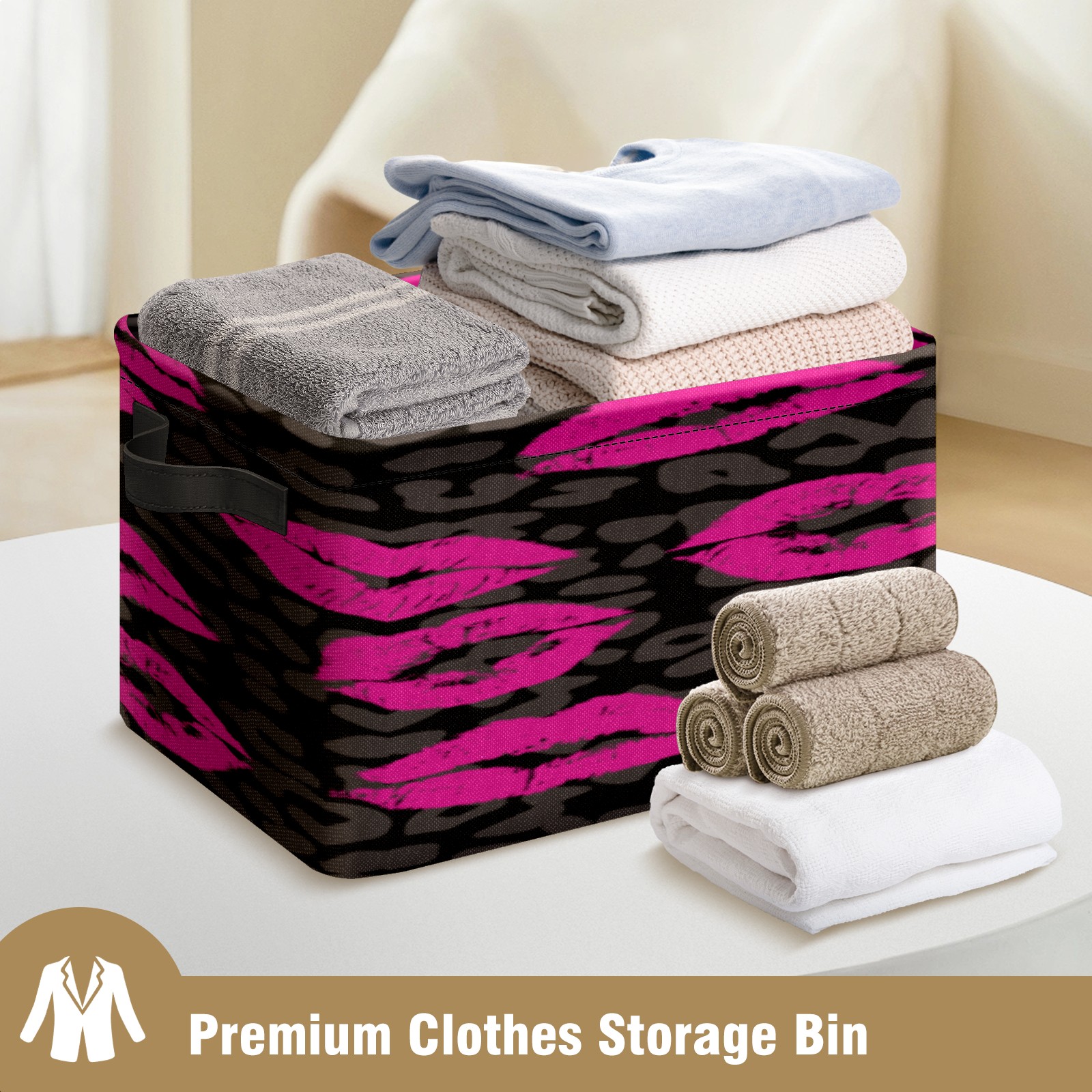Collapsible 600D Oxford Storage Basket with Pink Lips Pattern Leopard Grain - Metal Frame 10"x14"x8" Reinforced Handles, Multi-Purpose Organizer