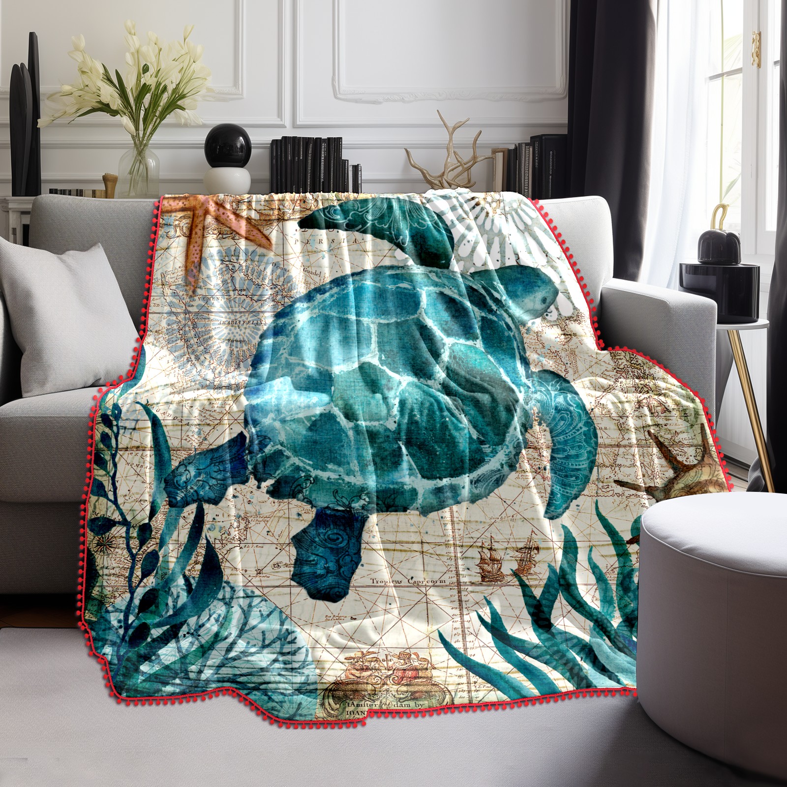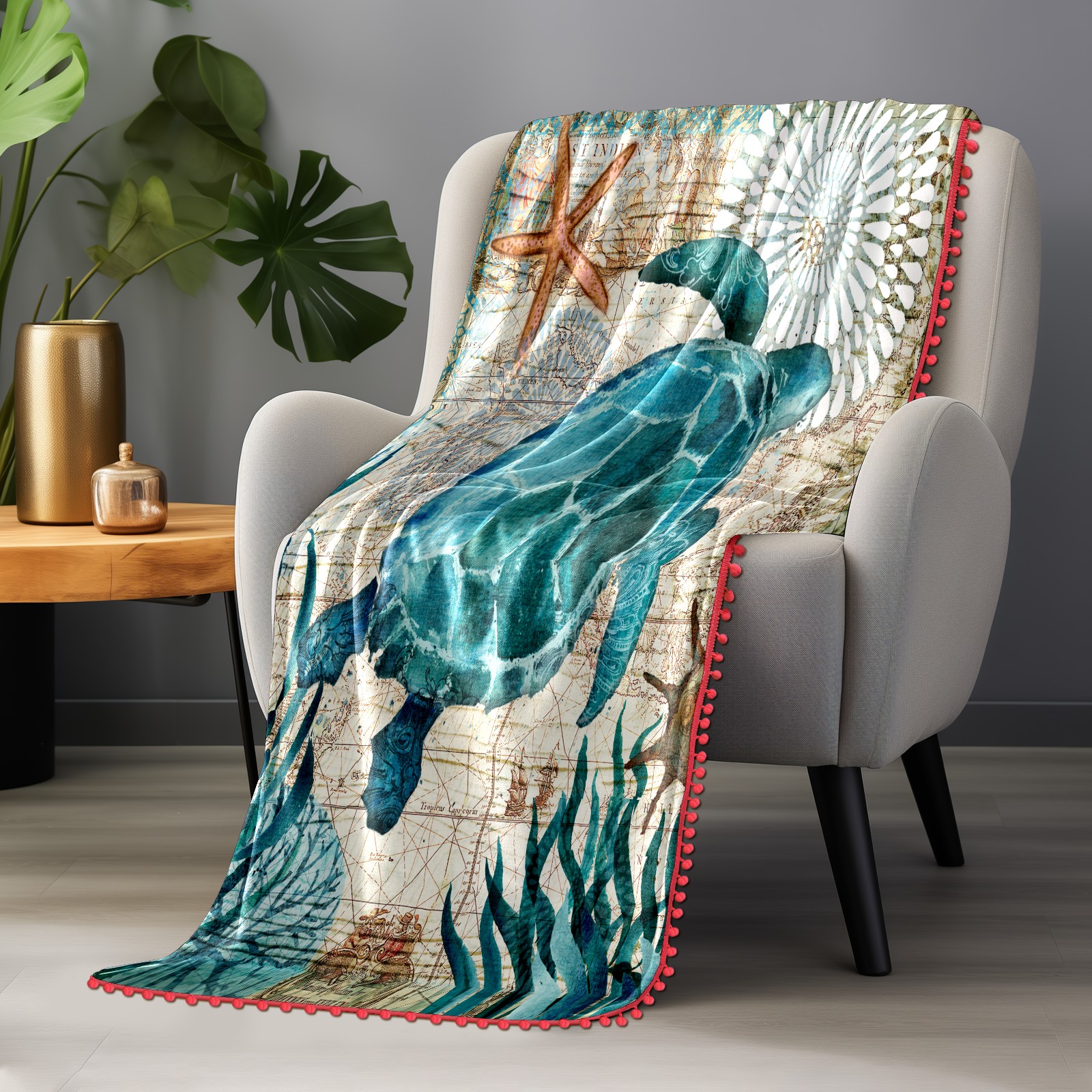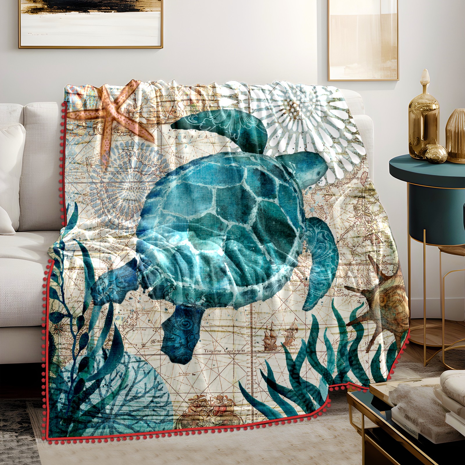 流苏毛毯 Blue Sea Turtle Nautical Map