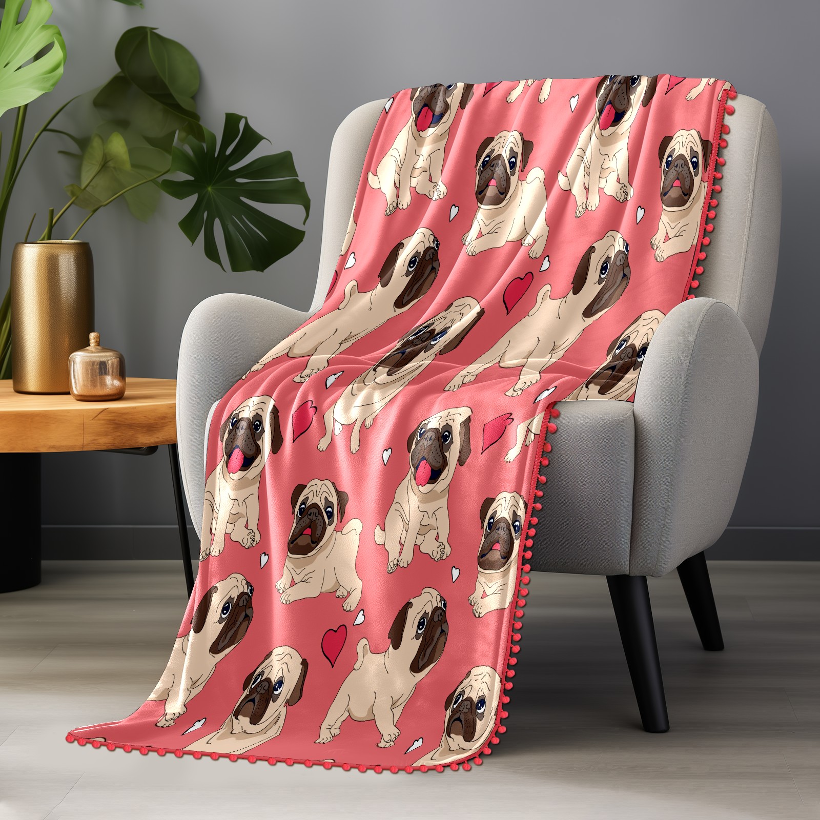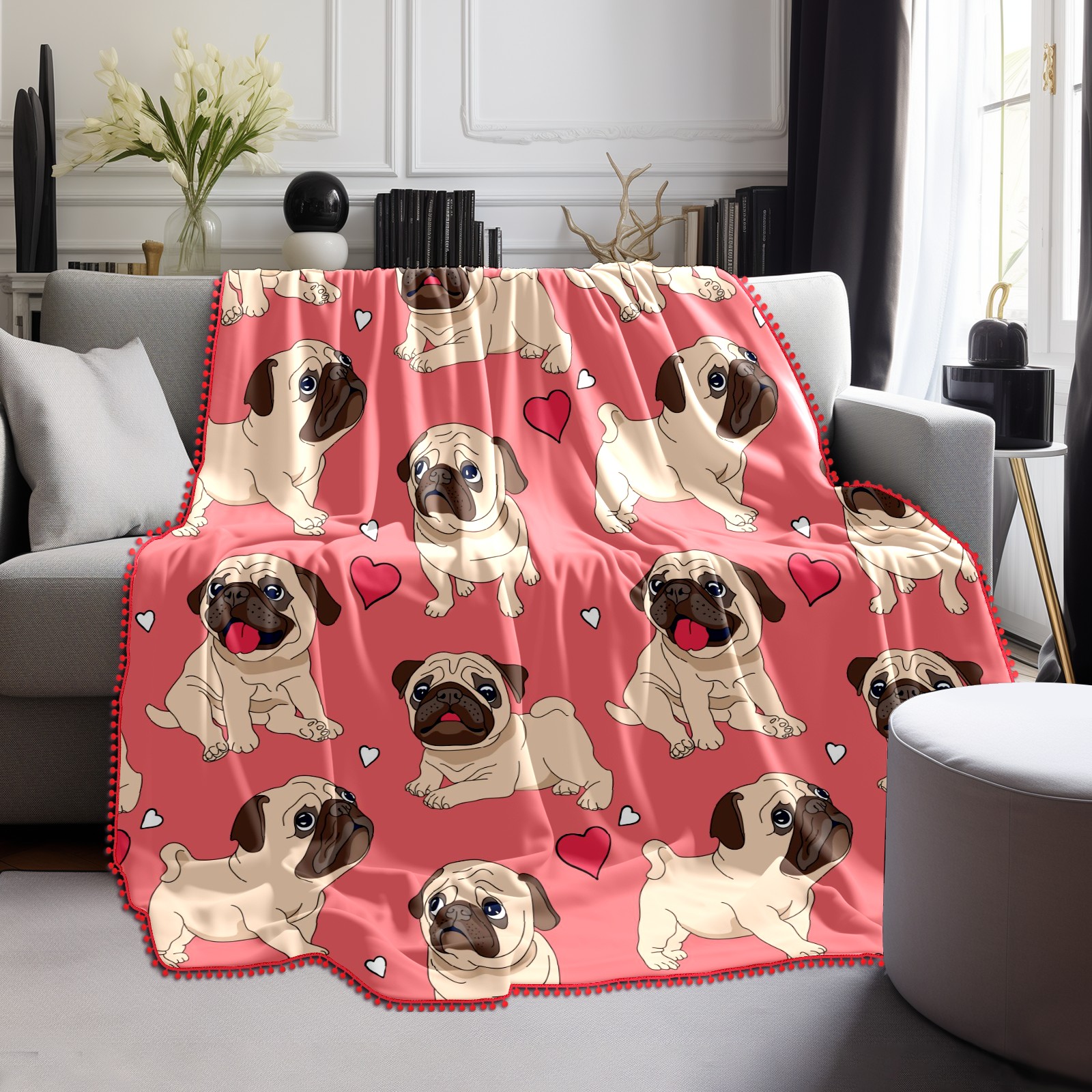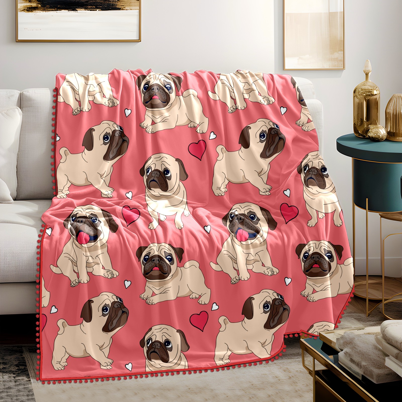 流苏毛毯 Pink Pug Puppy Dog Heart Love Pattern