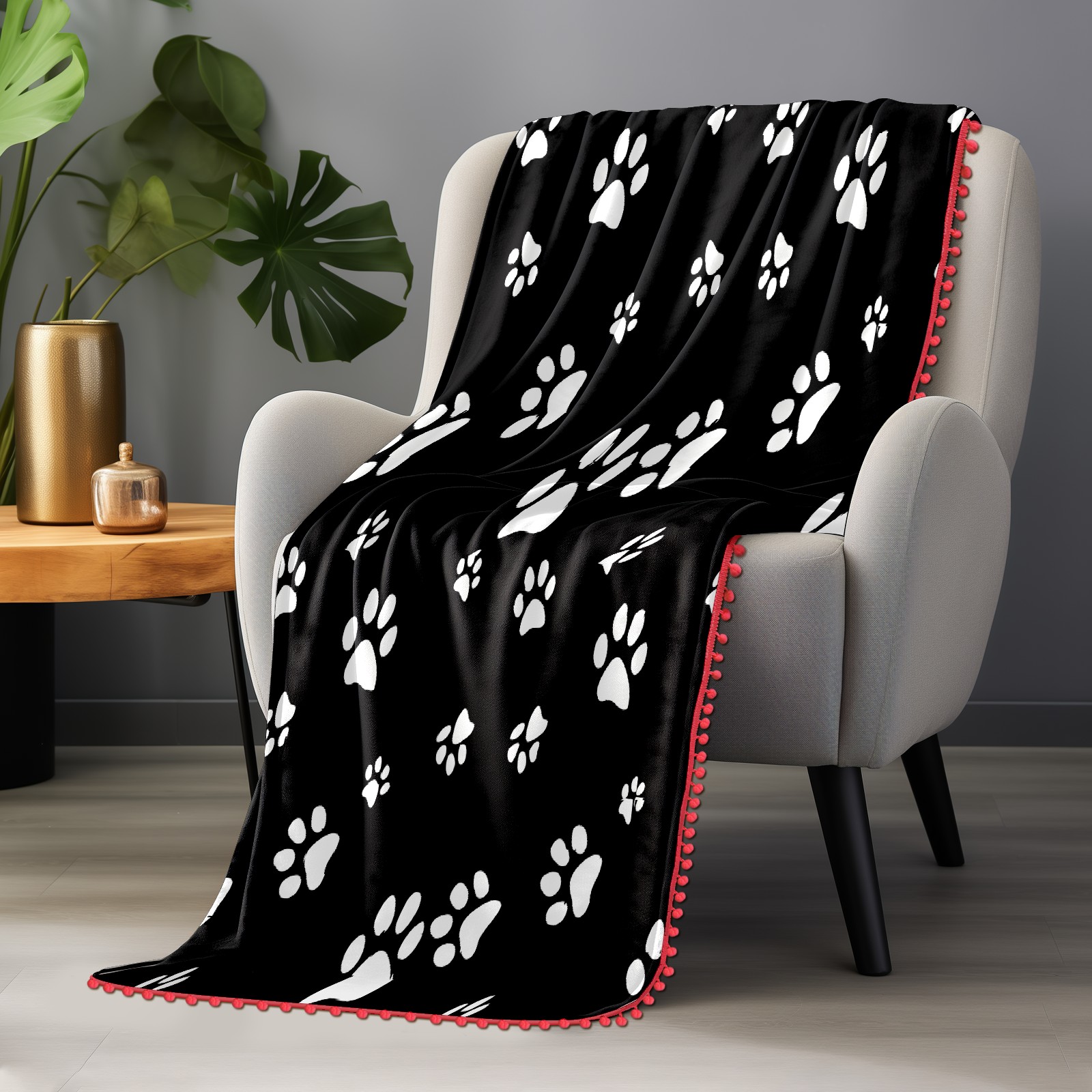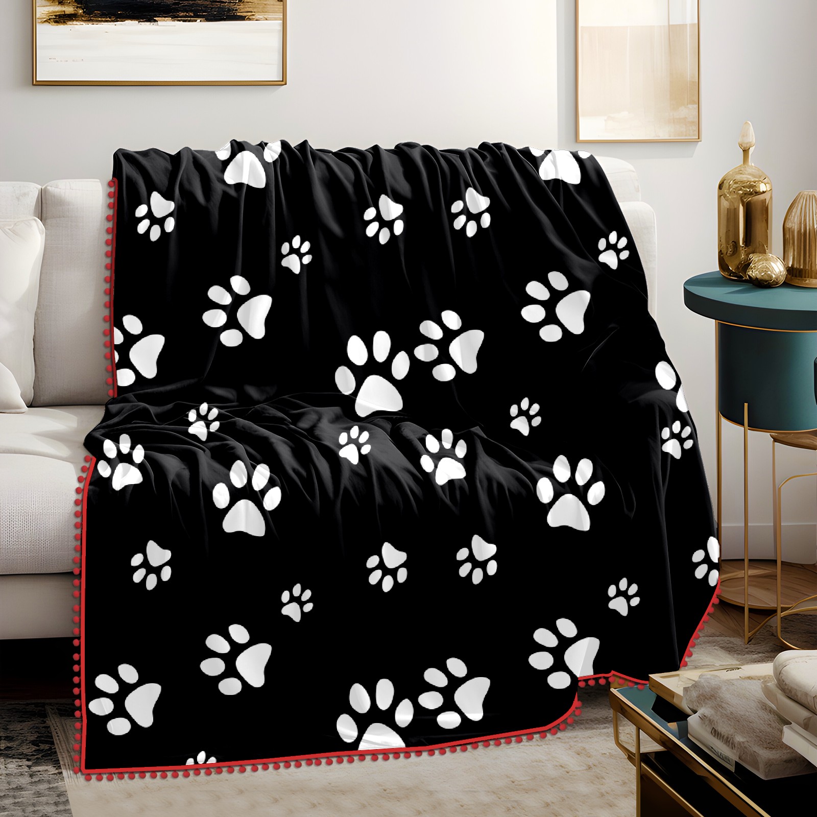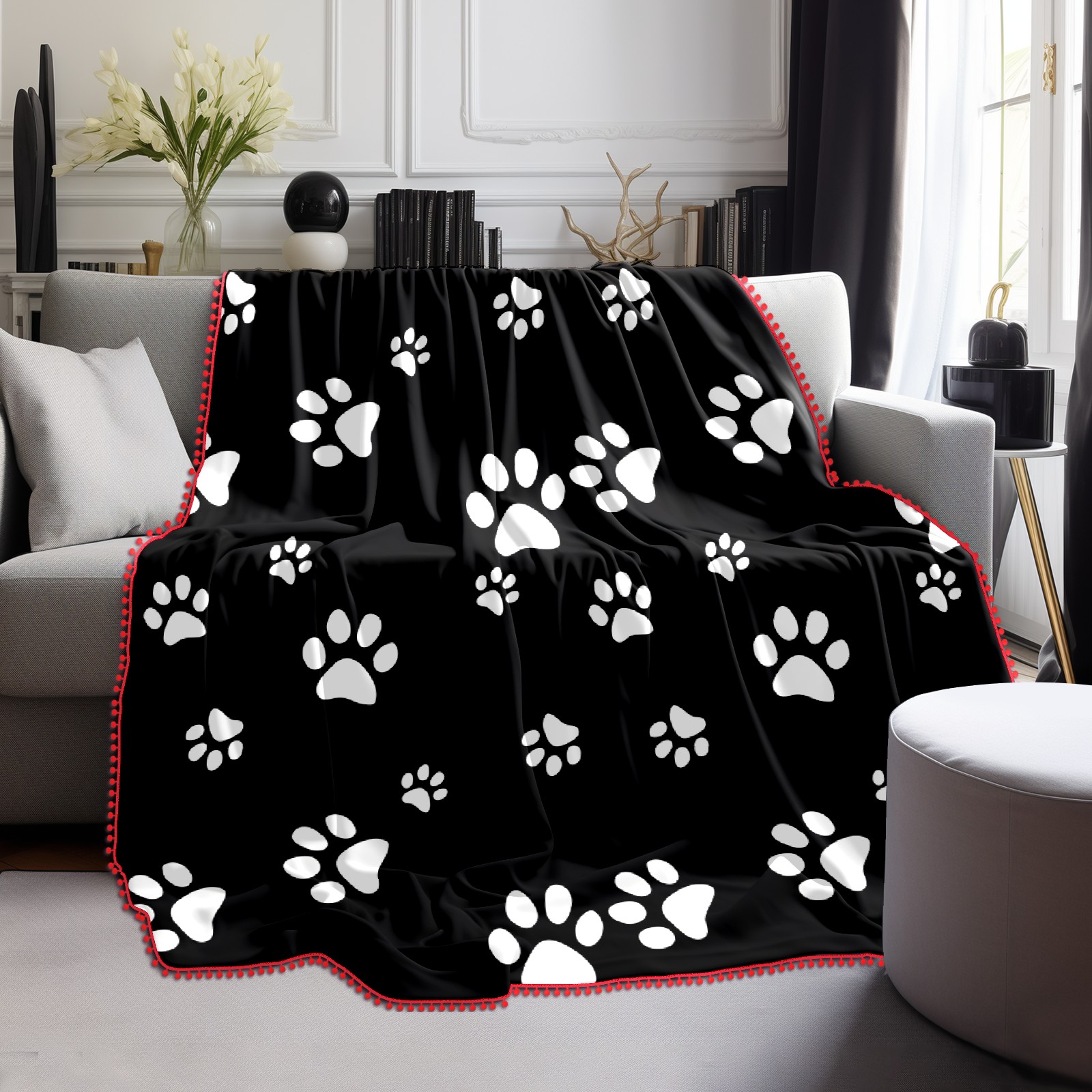 流苏毛毯 Black White Paw Pattern