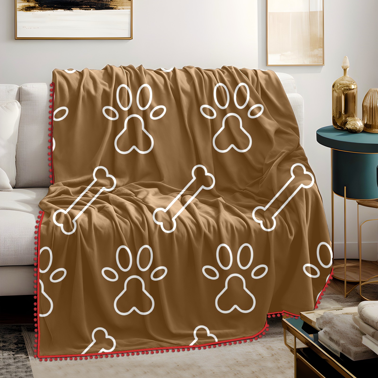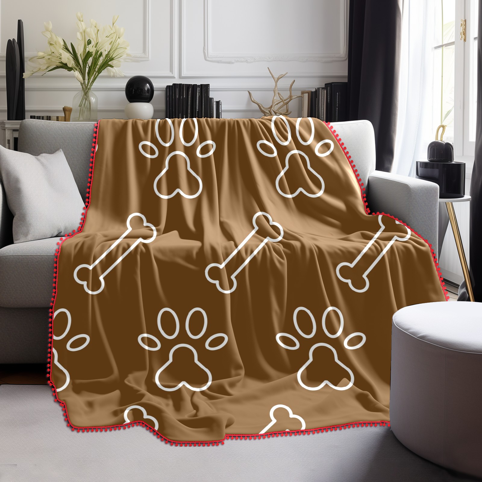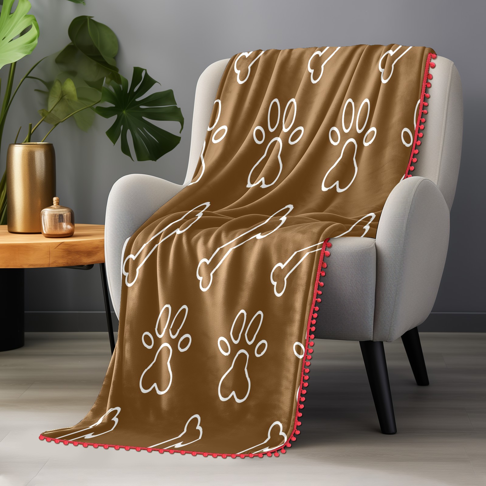 流苏毛毯 Dog Paw Bine Print Brown