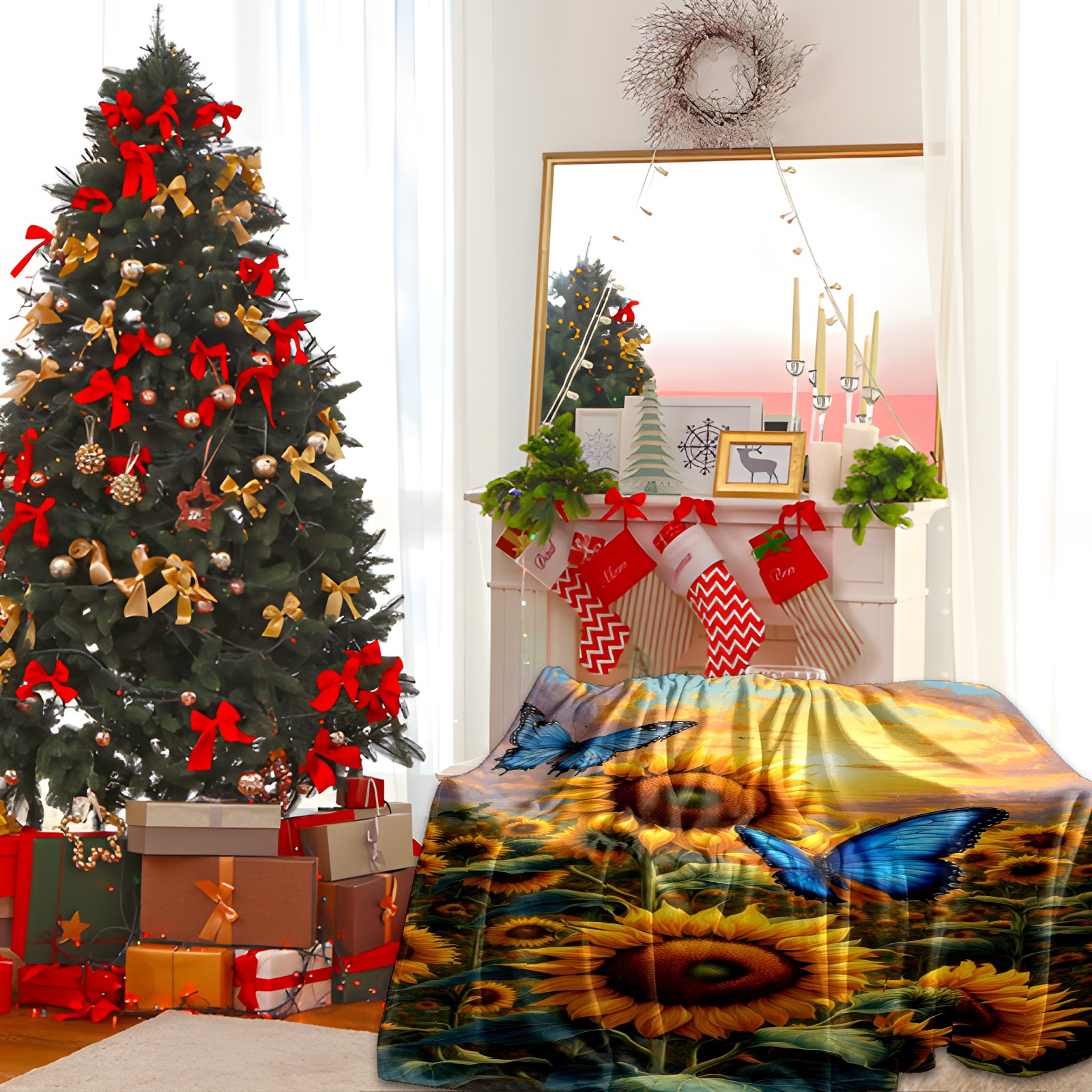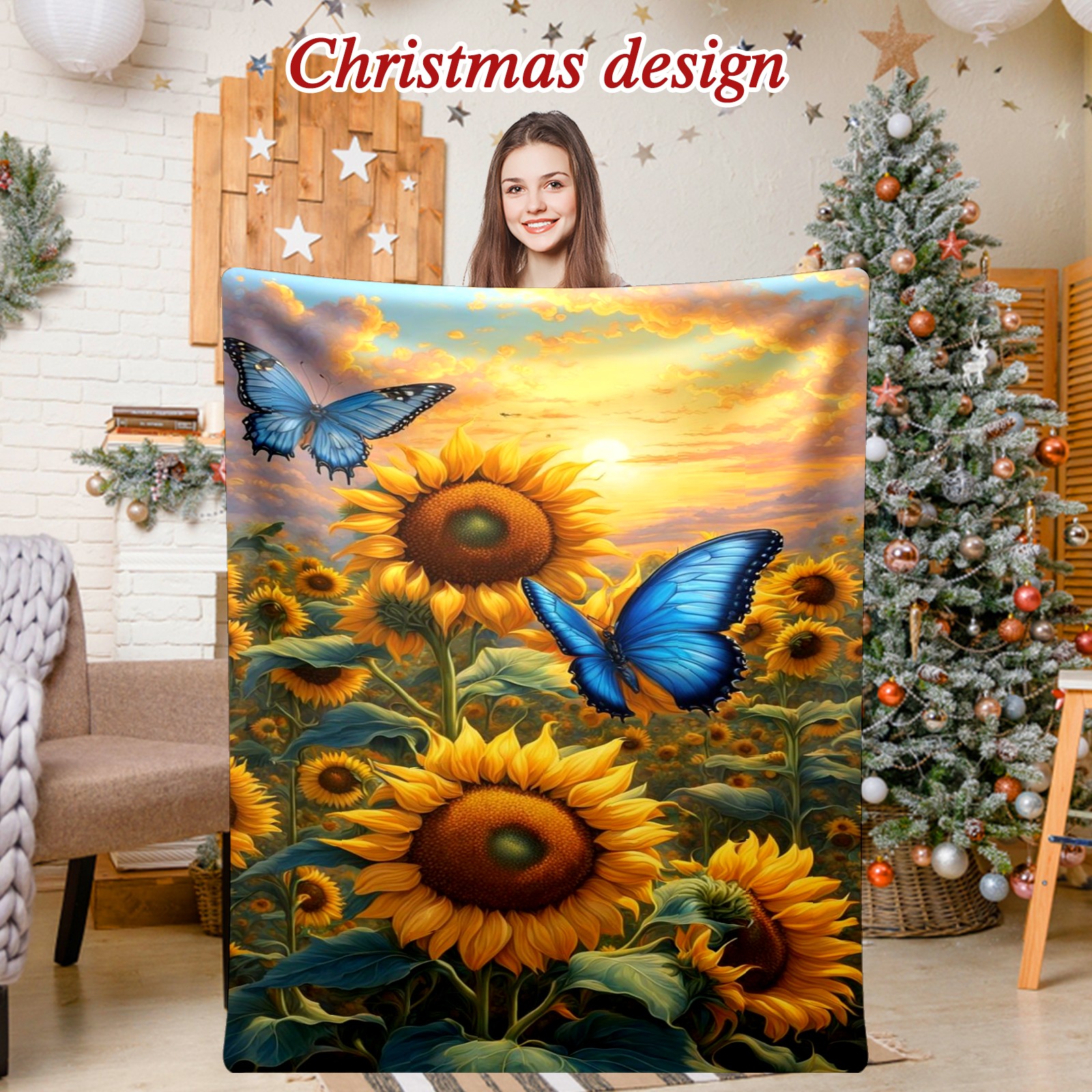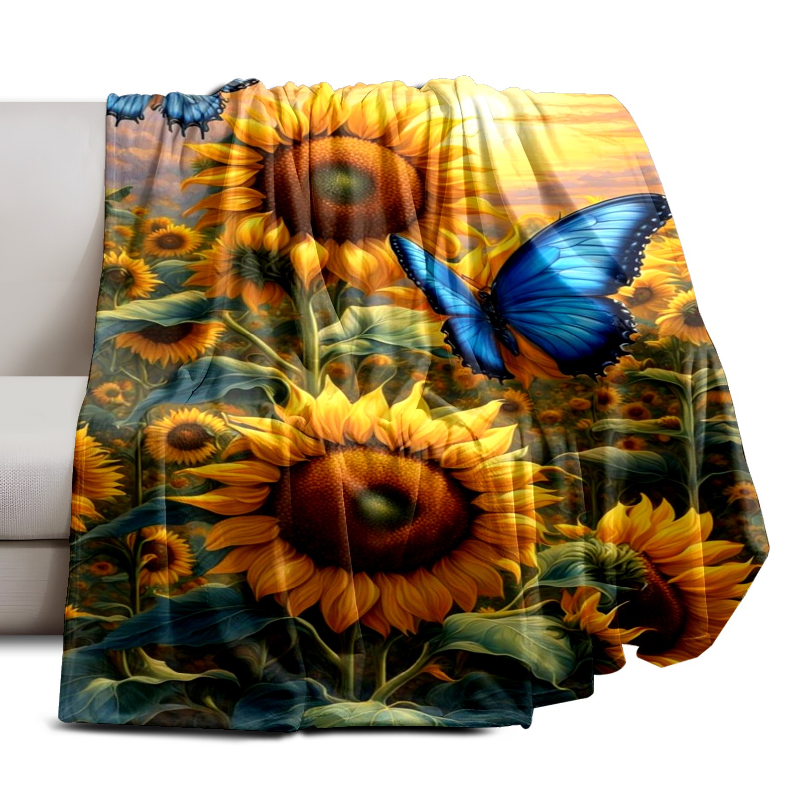 Премиальная фланелевая одеяло Yellow Sunflowers Butterflies